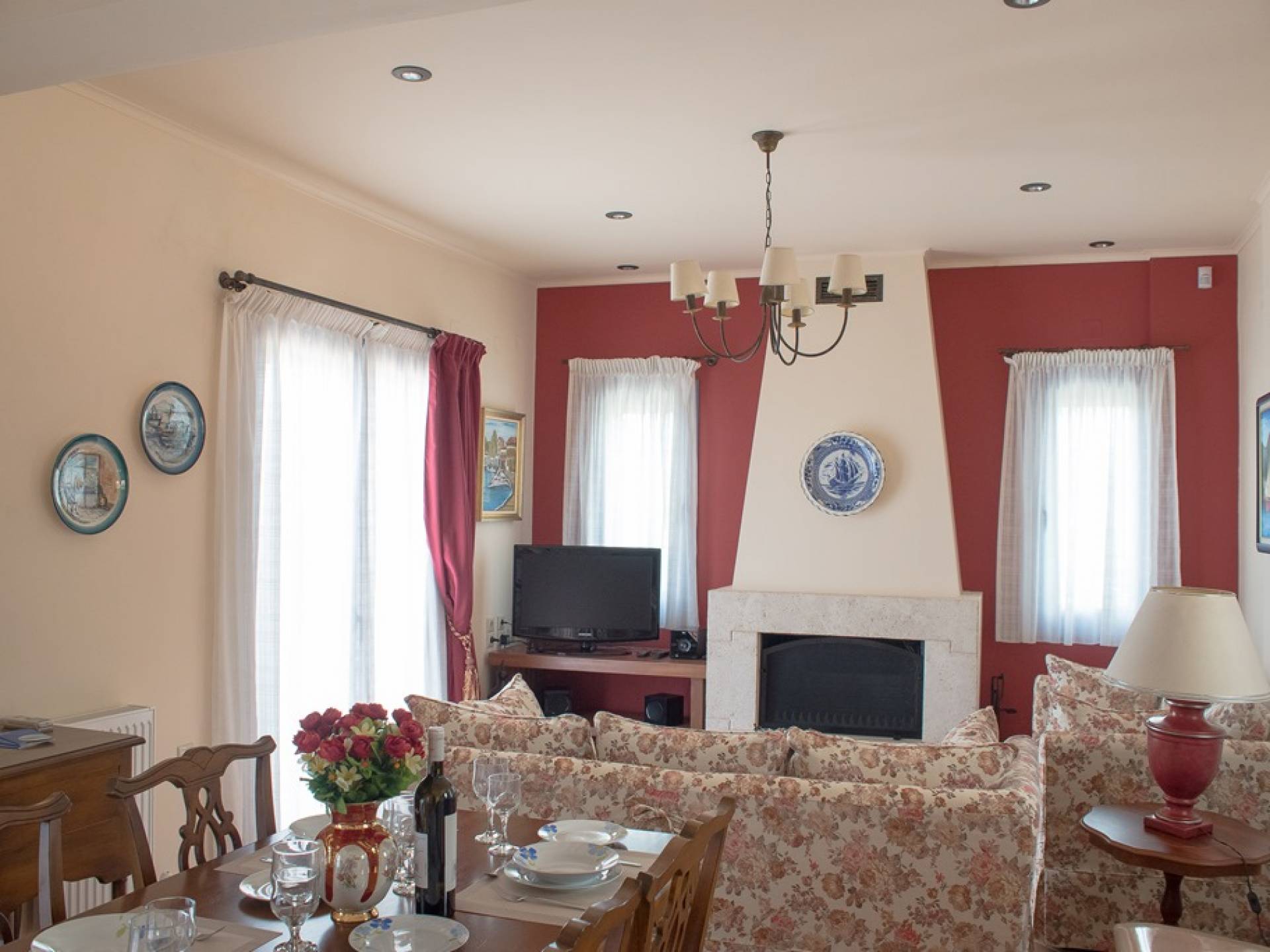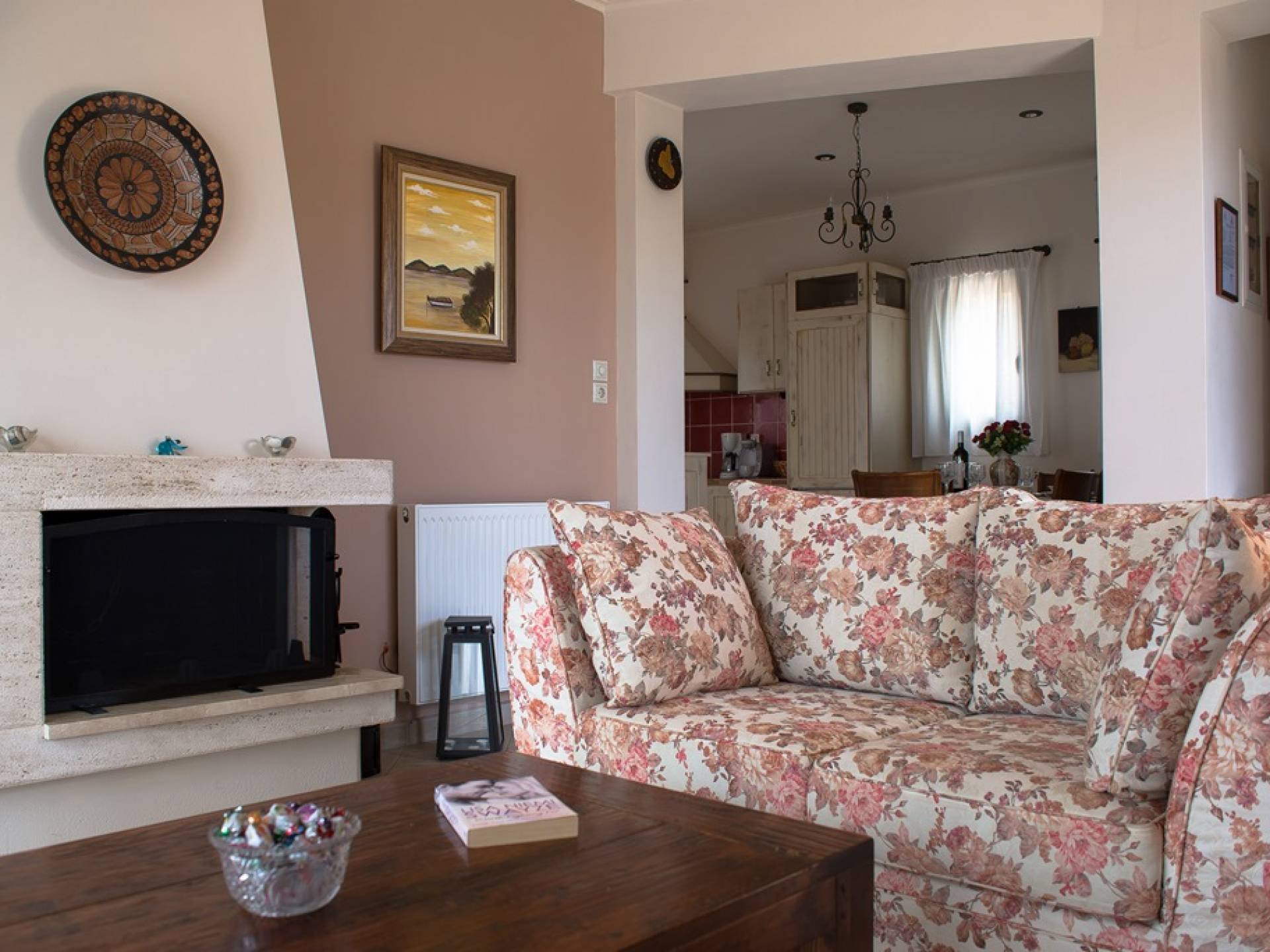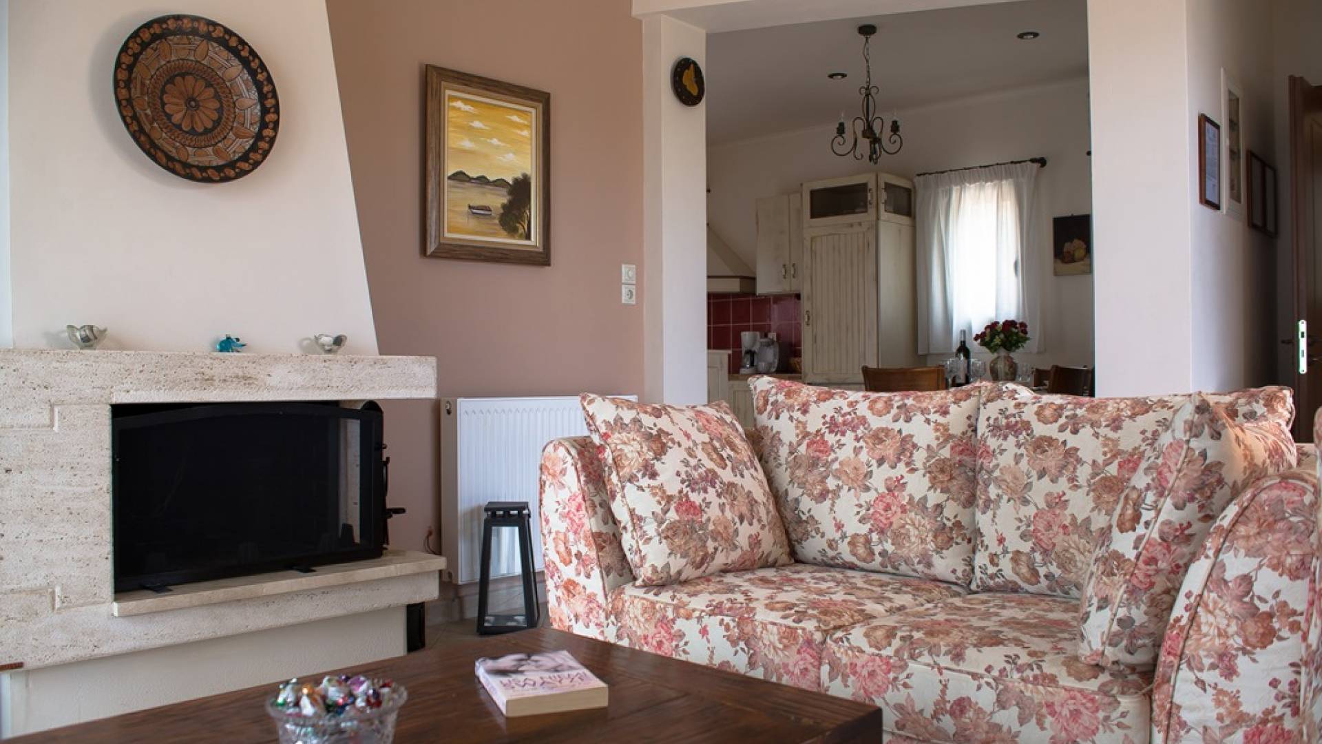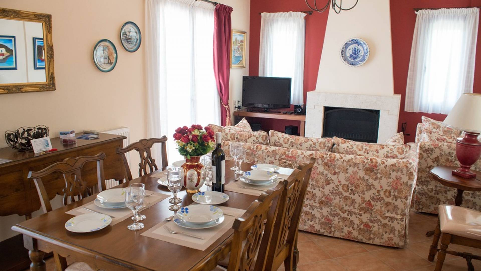 Villa Odysseus es la villa de la parte derecha del complejo, mientras miras al mar y la villa Penélope es la de la izquierda. Cada villa es 100sm. La planta baja incluye la sala de estar y frente a la chimenea, hay dos sofás, uno de los cuales se puede usar como cama en caso de alojamiento de un quinto visitante, así como una cocina y un comedor con decoración tradicional. Además, hay un WC y una lavadora. La terraza con el enrejado proporciona una mesa y asientos y el área de la piscina, sombrillas y tumbonas para tomar el sol.