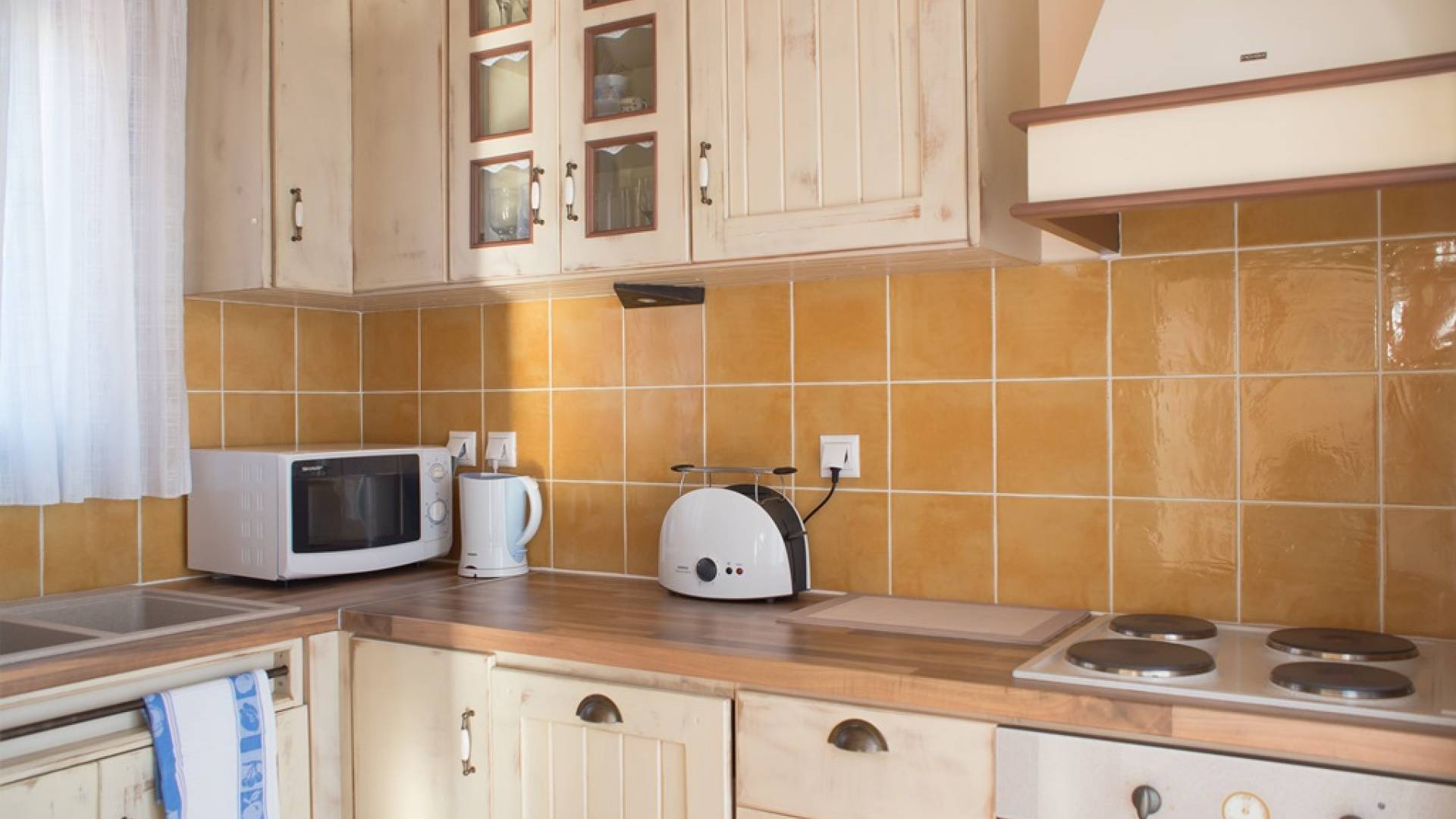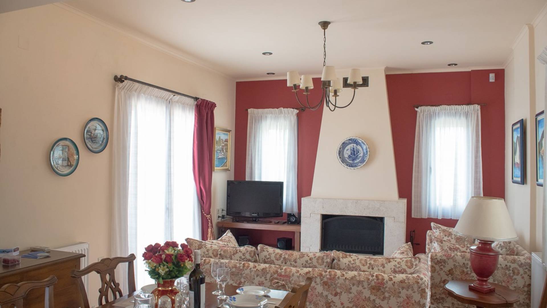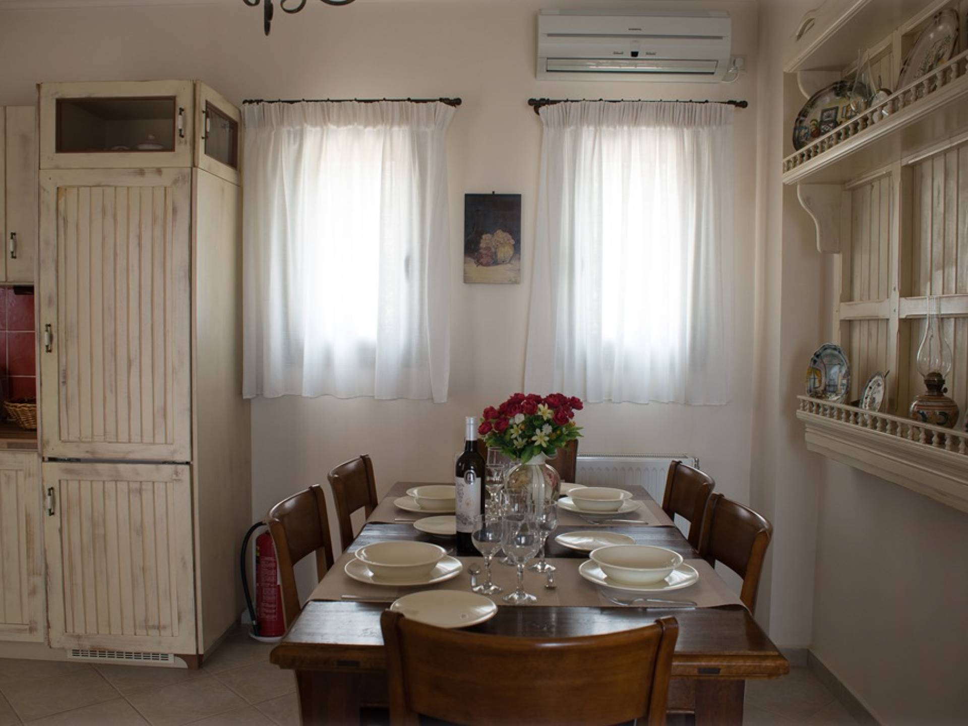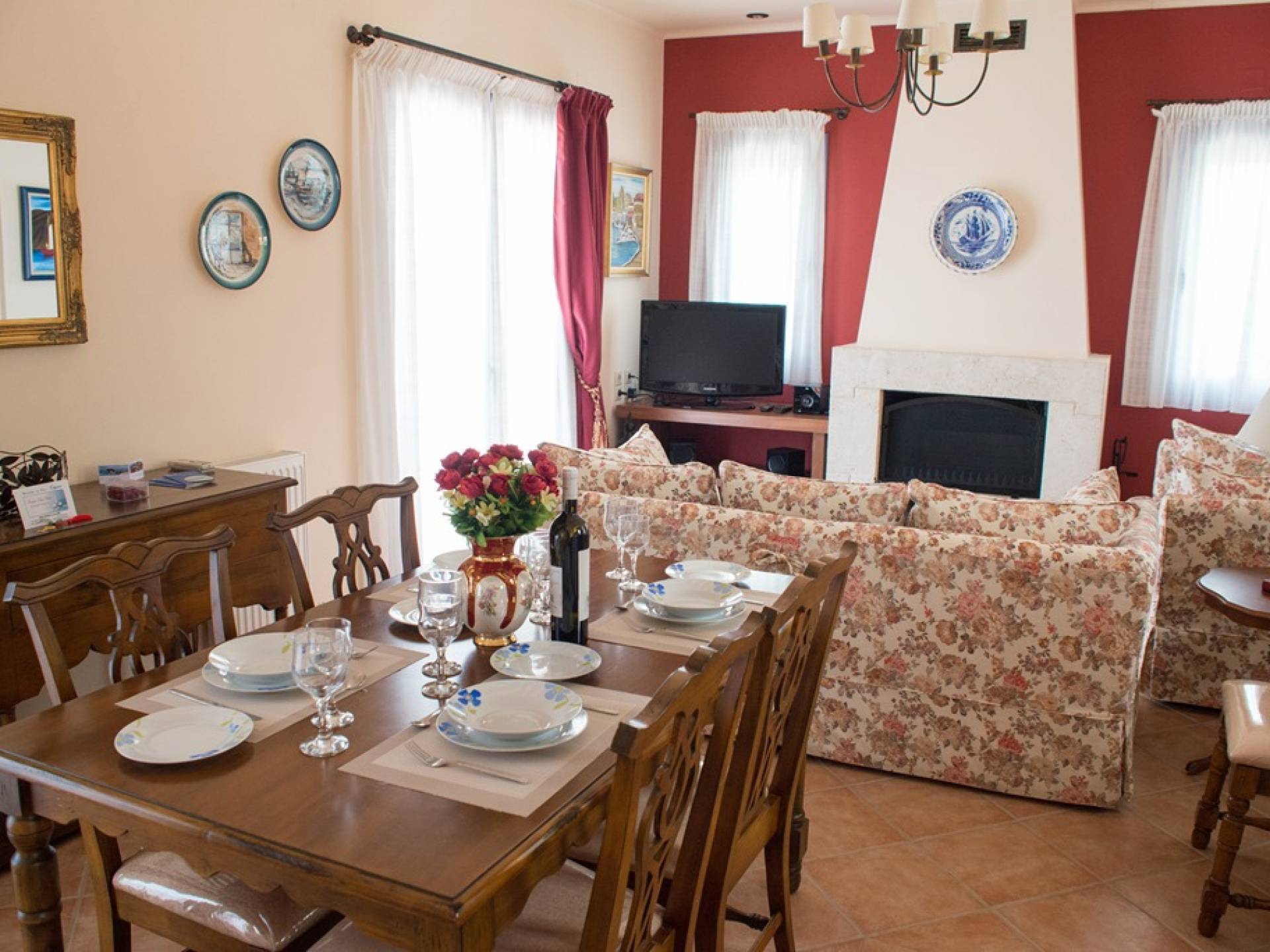 Villa Odysseus es la villa de la parte derecha del complejo, mientras miras al mar y la villa Penélope es la de la izquierda. Cada villa es 100sm. La planta baja incluye la sala de estar y frente a la chimenea, hay dos sofás, uno de los cuales se puede usar como cama en caso de alojamiento de un quinto visitante, así como una cocina y un comedor con decoración tradicional. Además, hay un WC y una lavadora. La terraza con el enrejado proporciona una mesa y asientos y el área de la piscina, sombrillas y tumbonas para tomar el sol.