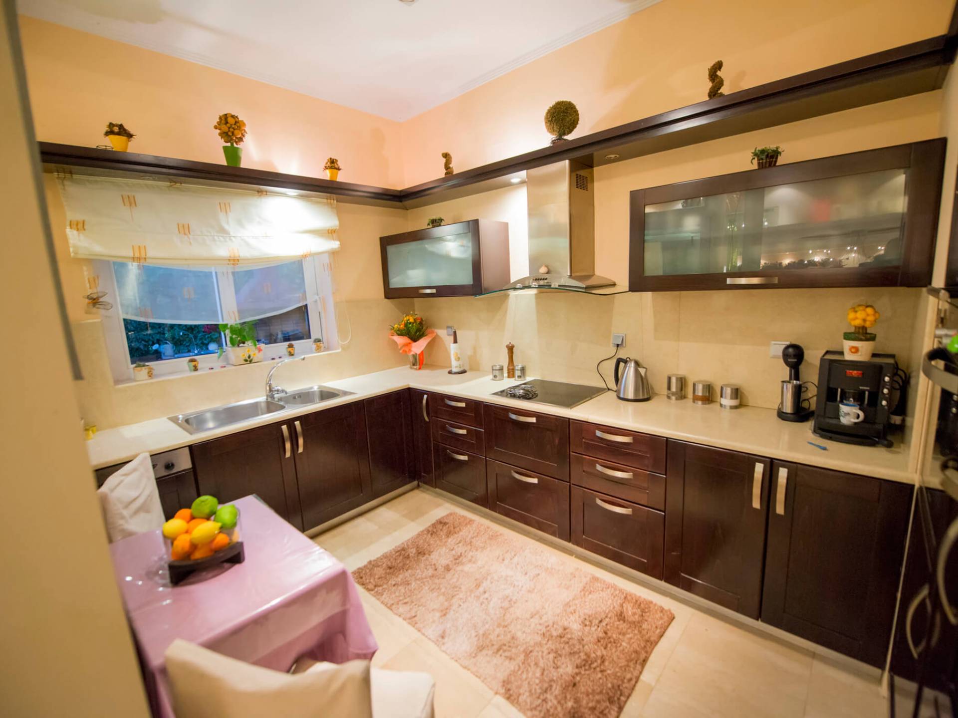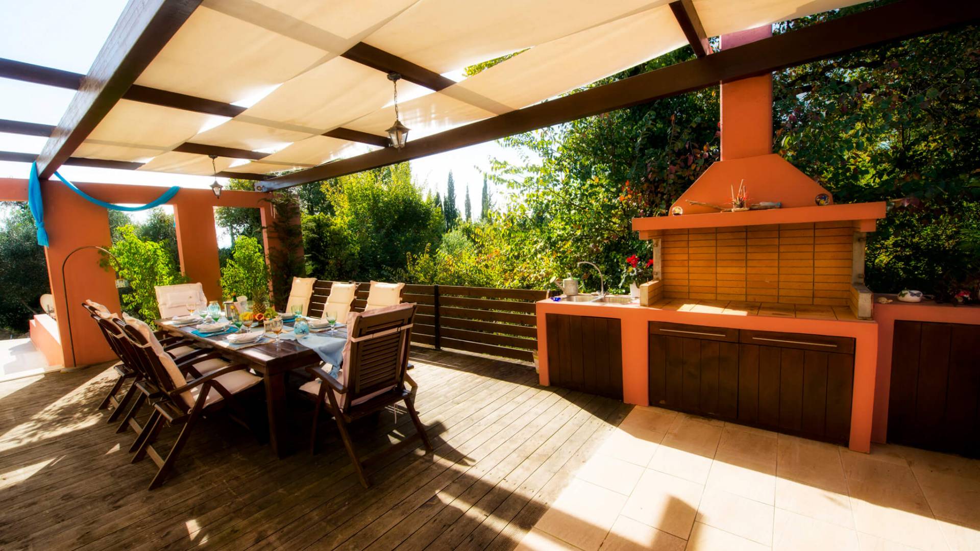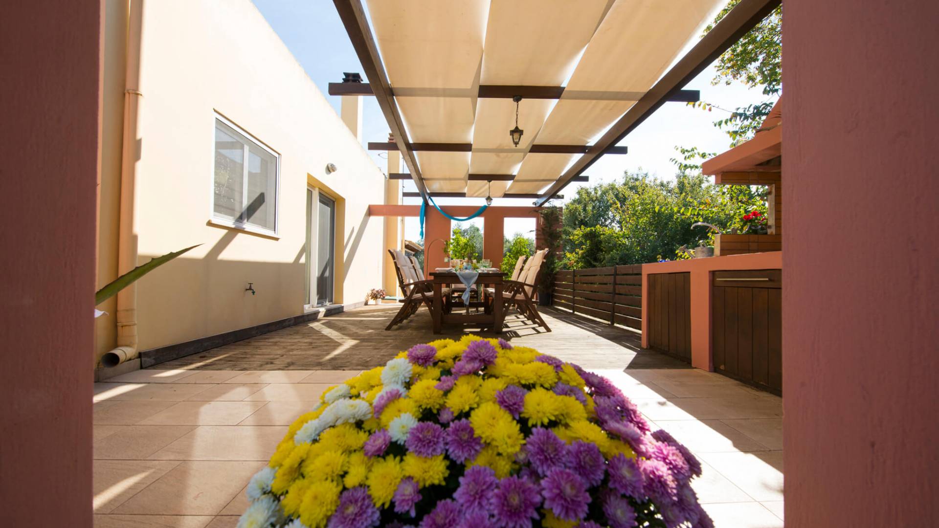 El salón está equipado con 2 grandes sofás que también se pueden utilizar como camas. Relájese en los sofás y sillones y disfrute de su programa de televisión favorito en el televisor de plasma de pantalla de 42 pulgadas o navegue por la red con la conexión Wi-Fi gratuita con vista al jardín y la piscina. El comedor se combina con el área de la cocina y la sala de estar. Puede disfrutar de su cena en el gran comedor interior que está en contacto directo con el comedor al aire libre y la barbacoa. El primer dormitorio tiene un baño en suite que contiene una bañera con funciones de masaje y un gran armario. Se conecta a la terraza que conduce a la piscina al aire libre. El segundo dormitorio consta de 2 cómodas camas individuales. También encontrará un gran armario y directamente al lado se encuentra el segundo baño.