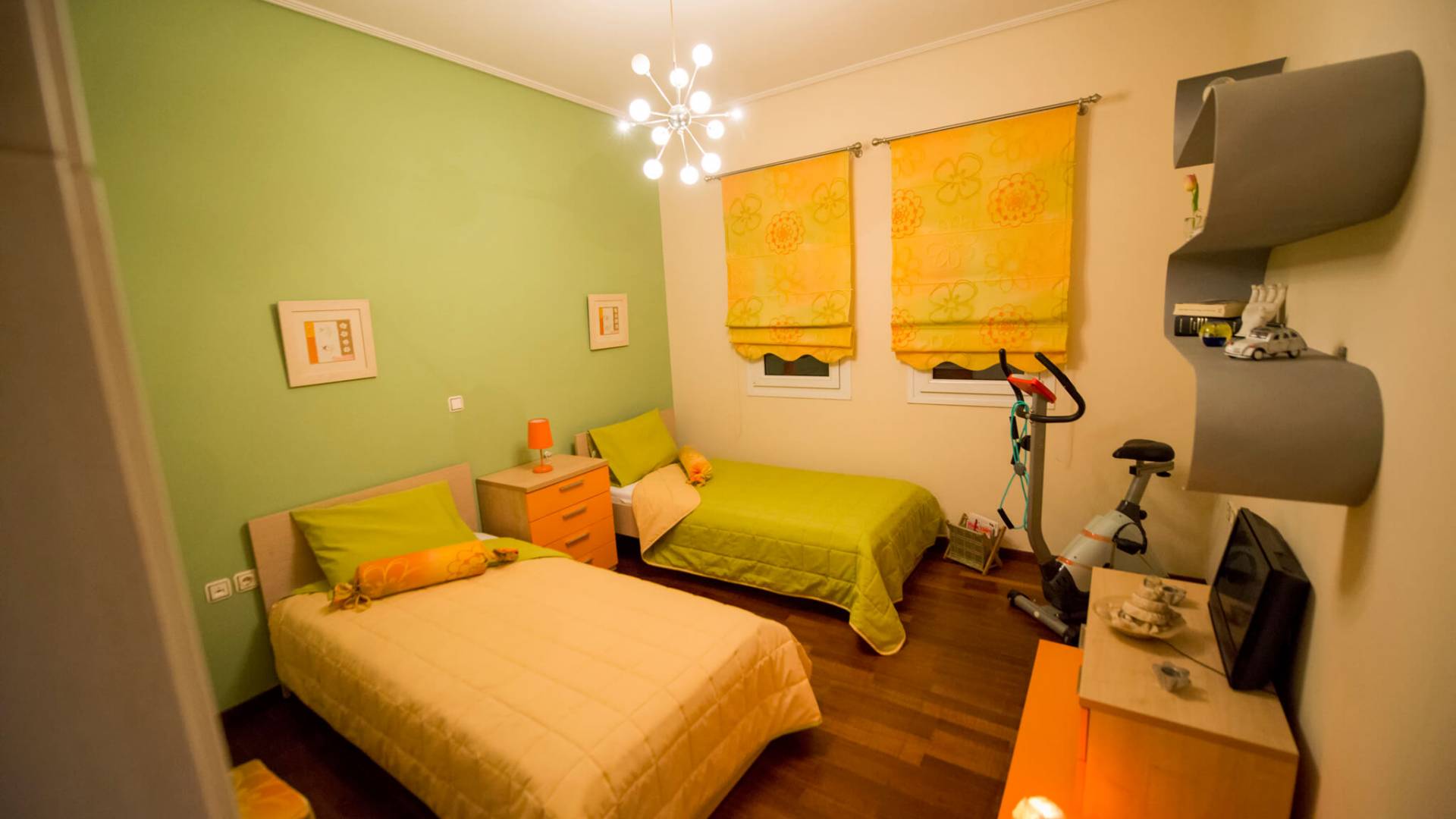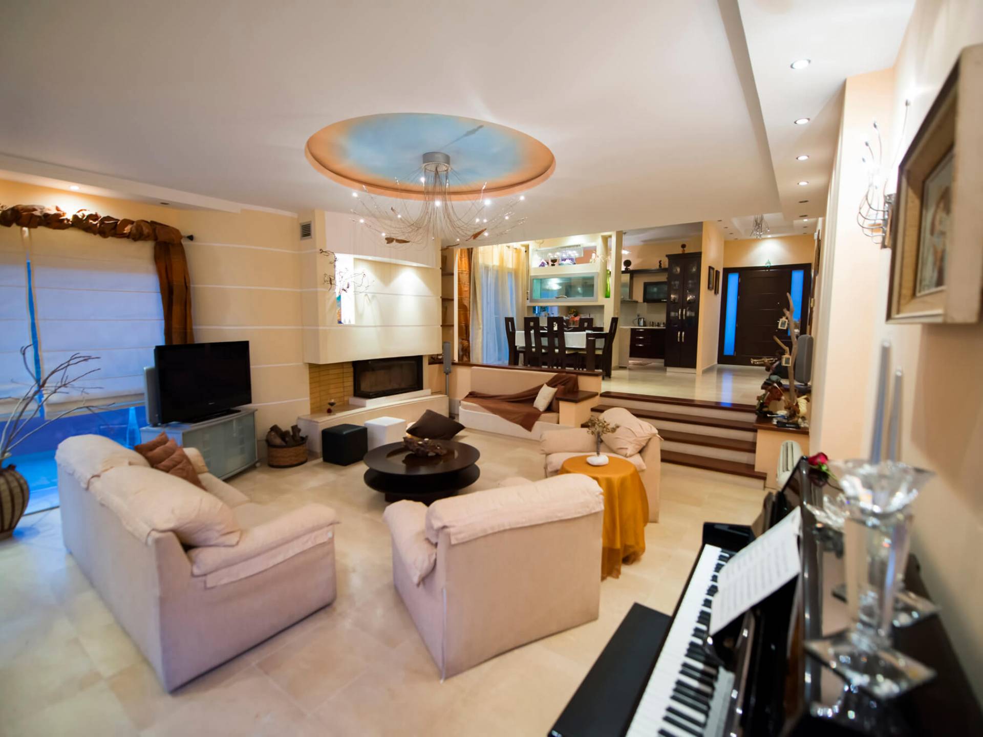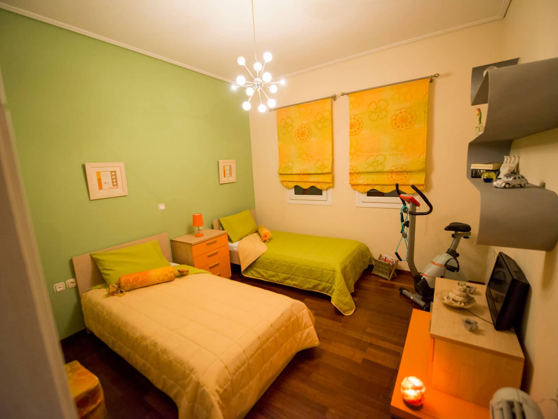 El salón está equipado con 2 grandes sofás que también se pueden utilizar como camas. Relájese en los sofás y sillones y disfrute de su programa de televisión favorito en el televisor de plasma de pantalla de 42 pulgadas o navegue por la red con la conexión Wi-Fi gratuita con vista al jardín y la piscina. El comedor se combina con el área de la cocina y la sala de estar. Puede disfrutar de su cena en el gran comedor interior que está en contacto directo con el comedor al aire libre y la barbacoa. El primer dormitorio tiene un baño en suite que contiene una bañera con funciones de masaje y un gran armario. Se conecta a la terraza que conduce a la piscina al aire libre. El segundo dormitorio consta de 2 cómodas camas individuales. También encontrará un gran armario y directamente al lado se encuentra el segundo baño.