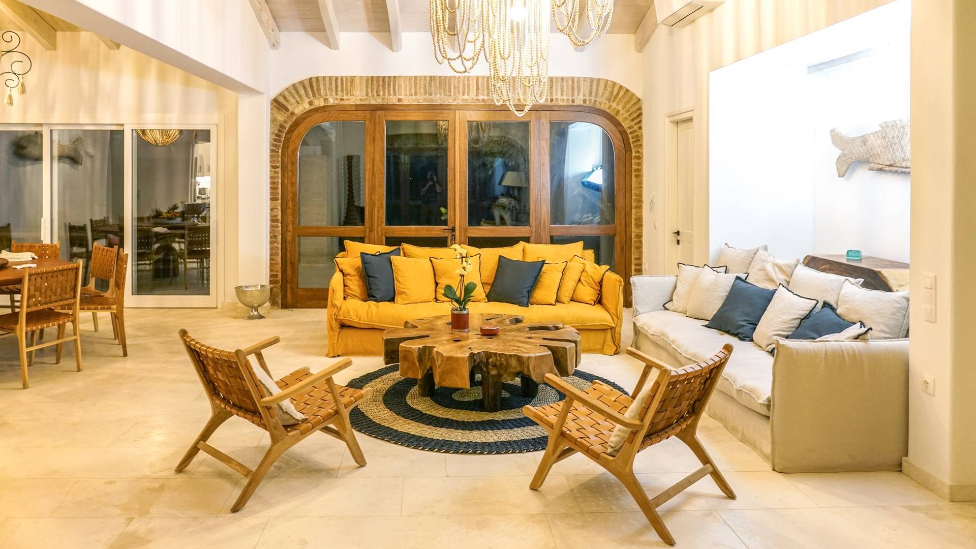 Estética tropical, electrodomésticos modernos y amplios espacios. Corfú Villa Natura Mare garantiza momentos inolvidables de confort y relajación para el momento culminante de su año. La villa tiene capacidad para doce personas y consta de seis habitaciones y siete baños, piso de madera de teca y muebles en todas las habitaciones, fino mármol griego y decoración de diseño con tonos tierra.
