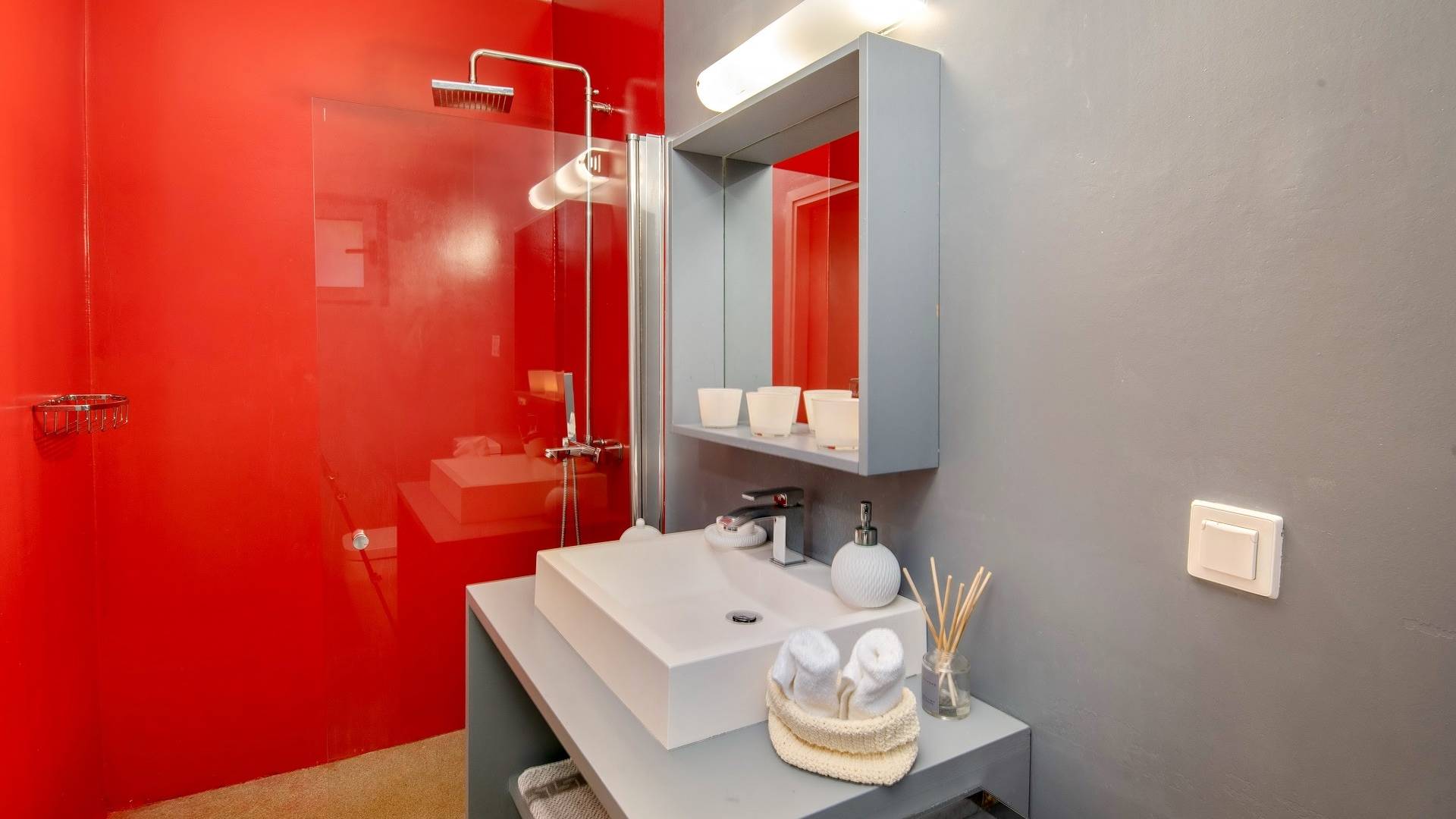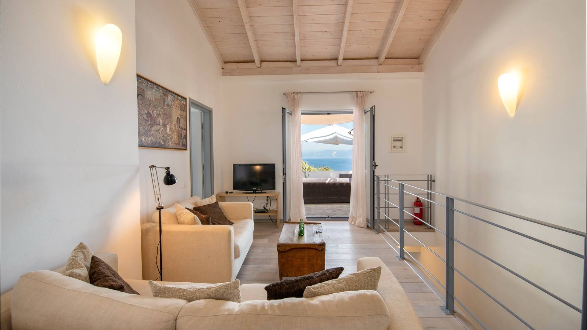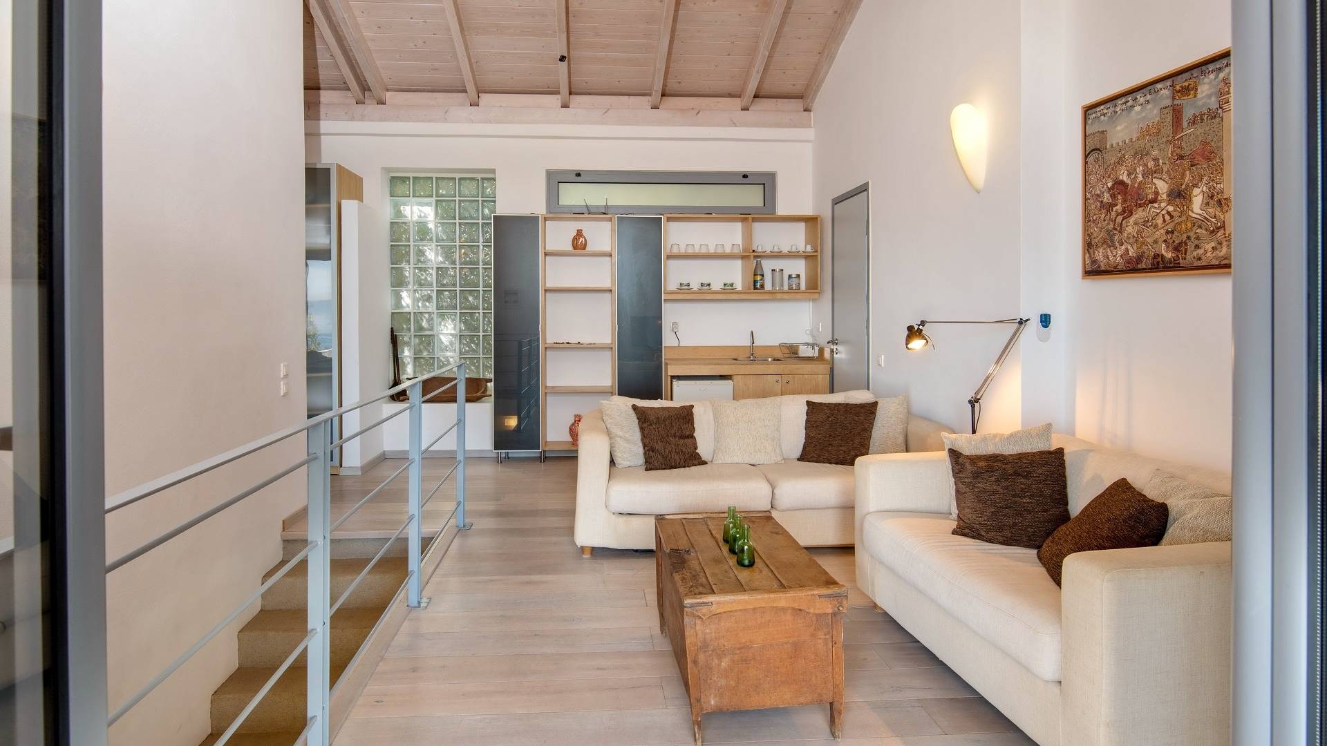 En el primer piso, hay una sala de estar, un dormitorio con una cama doble y un dormitorio con dos camas individuales. Ambos dormitorios tienen baños en suite con ducha. Todas las habitaciones tienen salida a una gran terraza con tumbonas y fantásticas vistas al mar.