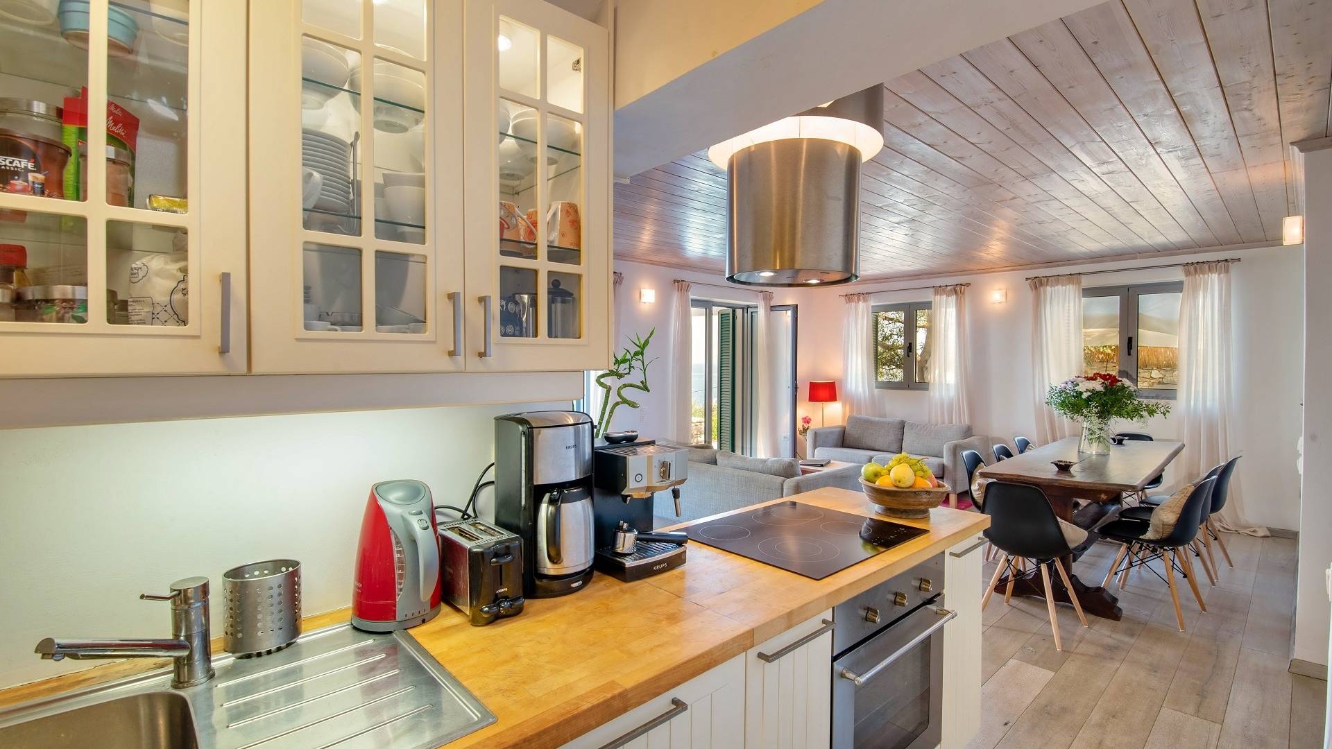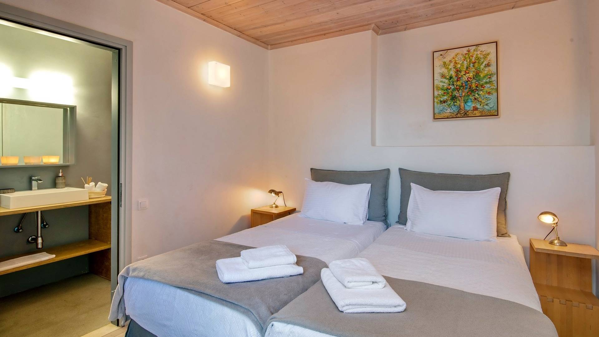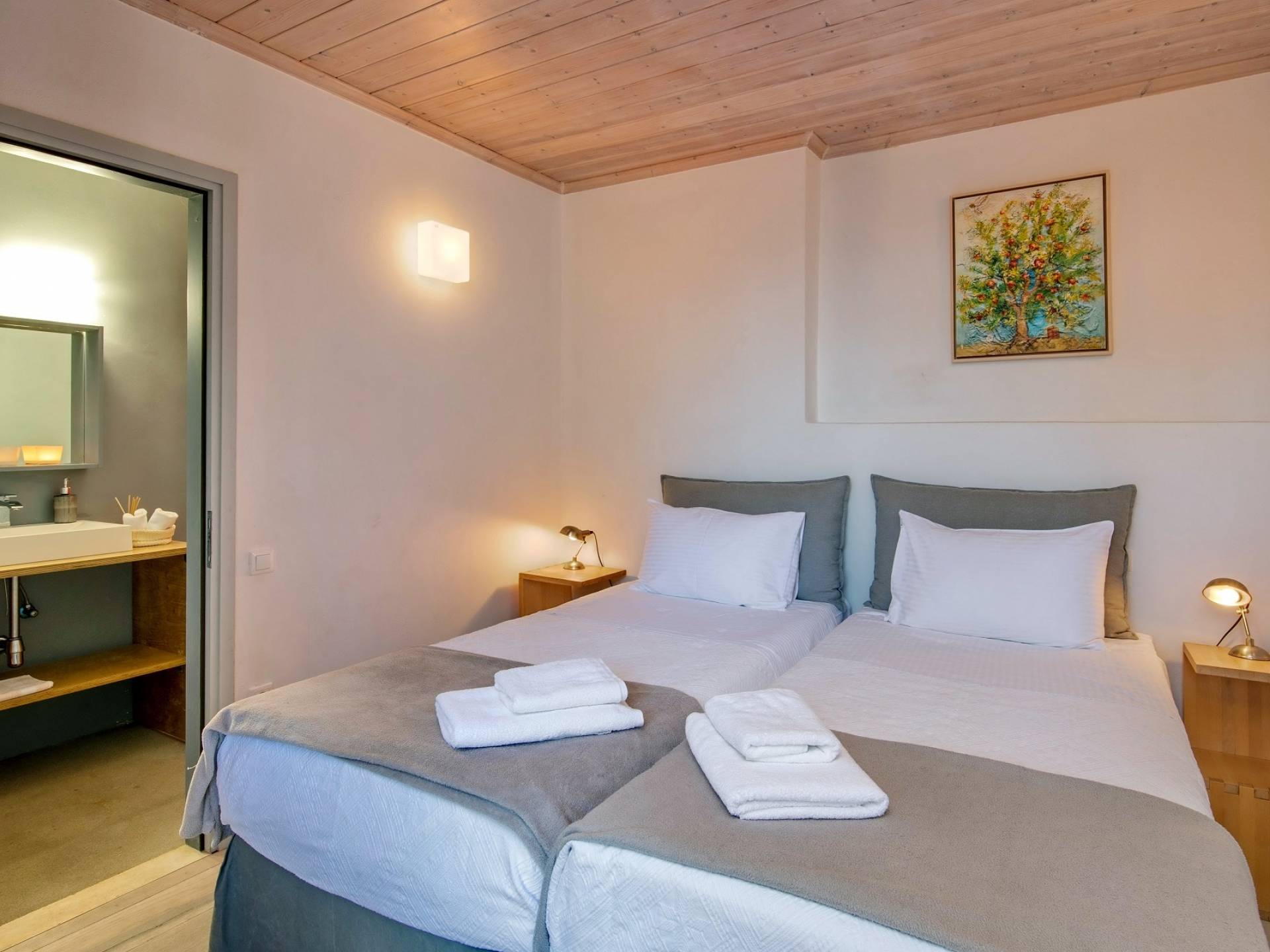 En la planta baja, hay una sala de estar de planta abierta con un salón, comedor, una cocina totalmente equipada y un aseo para invitados. También hay un dormitorio grande con una cama doble y un baño en suite con ducha. En el mismo piso, hay una habitación de invitados adyacente con dos camas individuales de entrada independiente y un baño en suite con ducha. La habitación sale al área de la piscina privada.