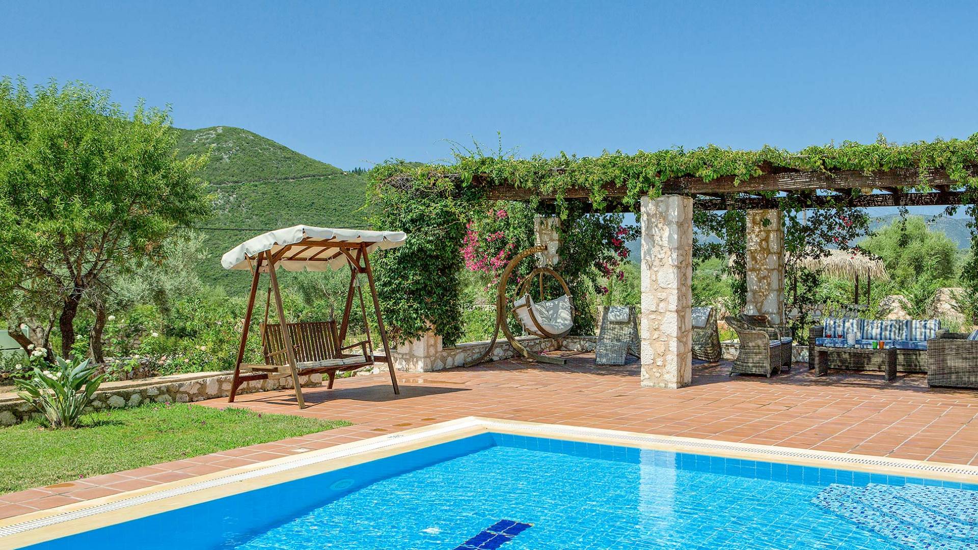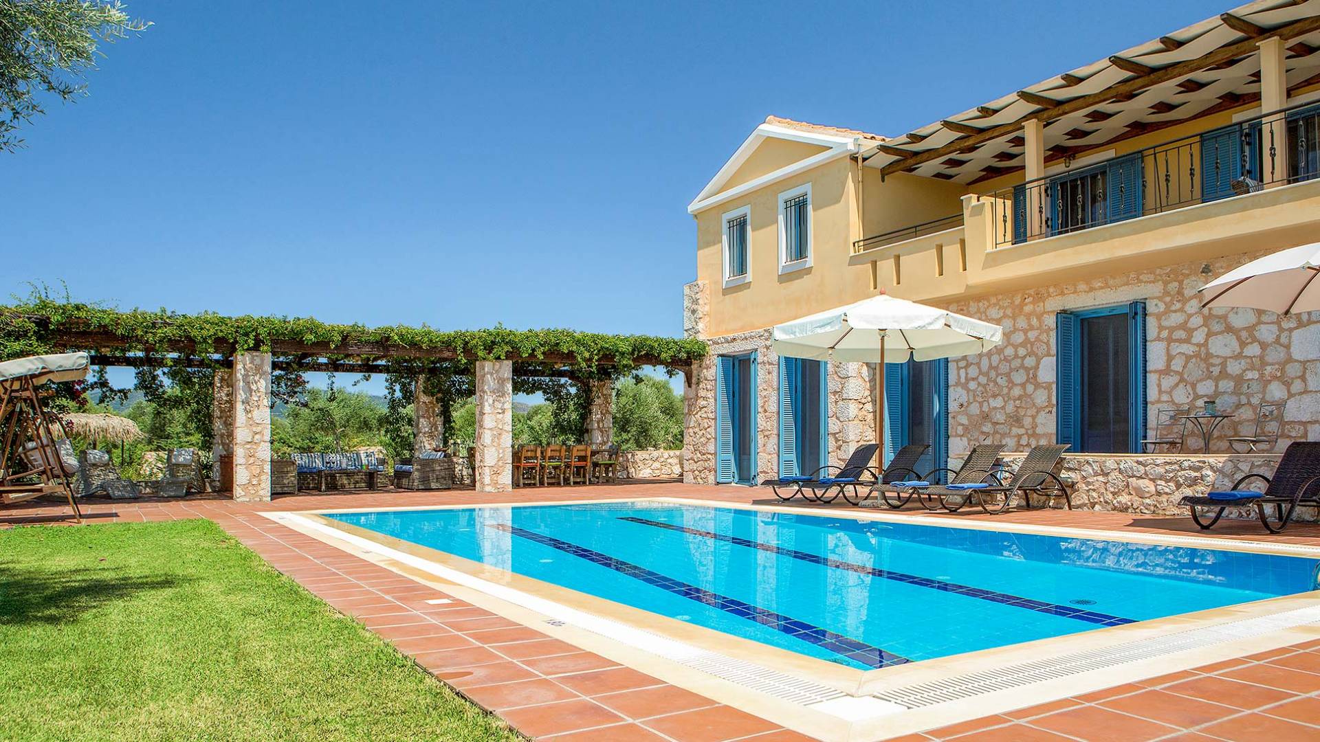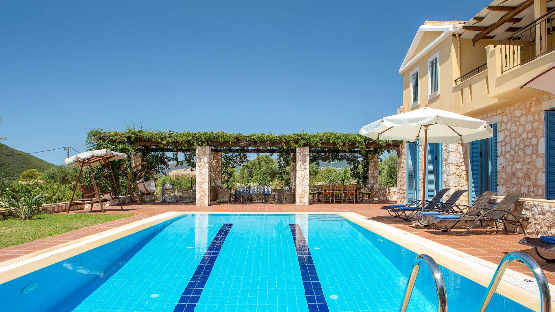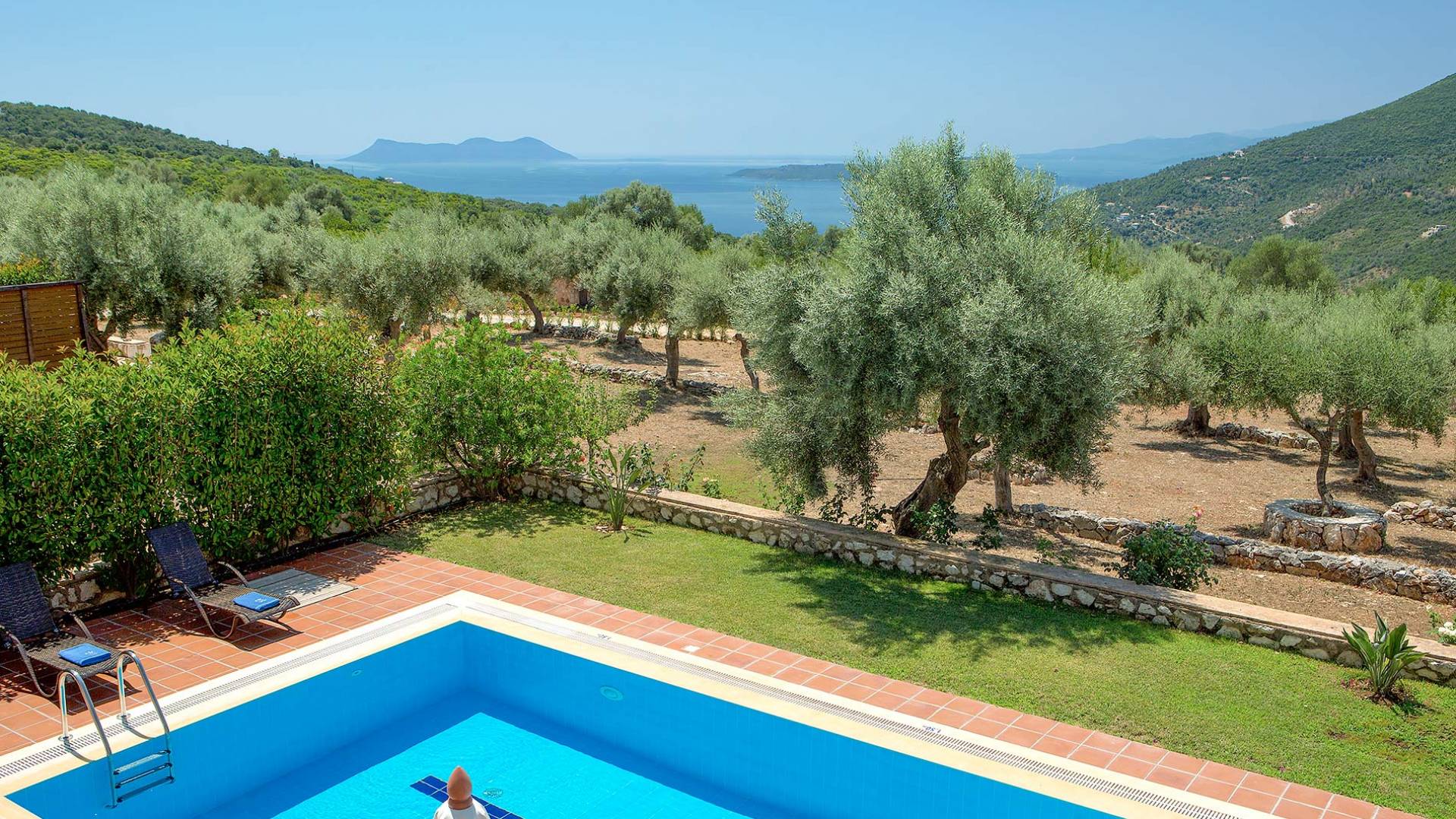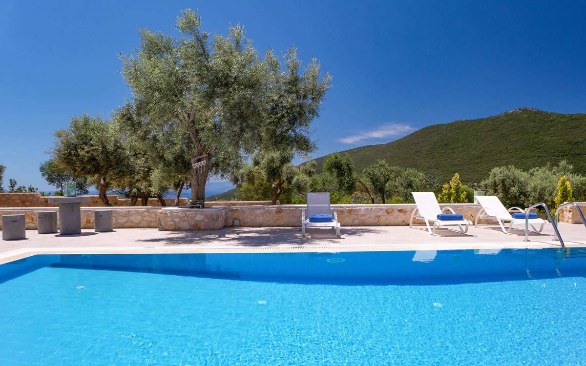 Villa Sappho Lefkada es una villa de lujo en alquiler con 3 dormitorios y piscina privada. En un exuberante 2000 metros cuadrados. finca con olivos, almendros y muchos árboles frutales, con una magnífica vista panorámica del Mar Jónico, se encuentran los 130 metros cuadrados. Villa Sappho Lefkada. Este espacioso alquiler de vacaciones es ideal para familias o grupos de amigos y ofrece una magnífica piscina privada y todas las comodidades que necesita para que su estadía sea memorable.