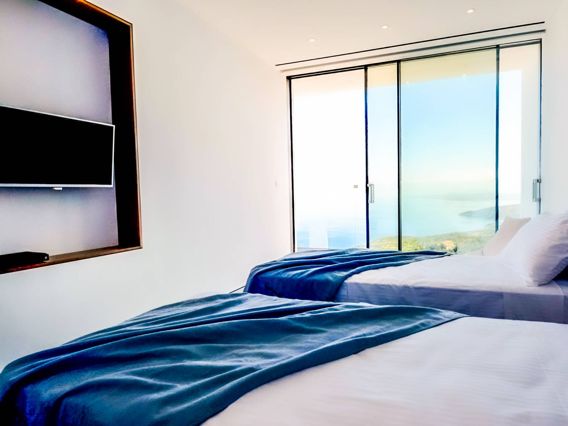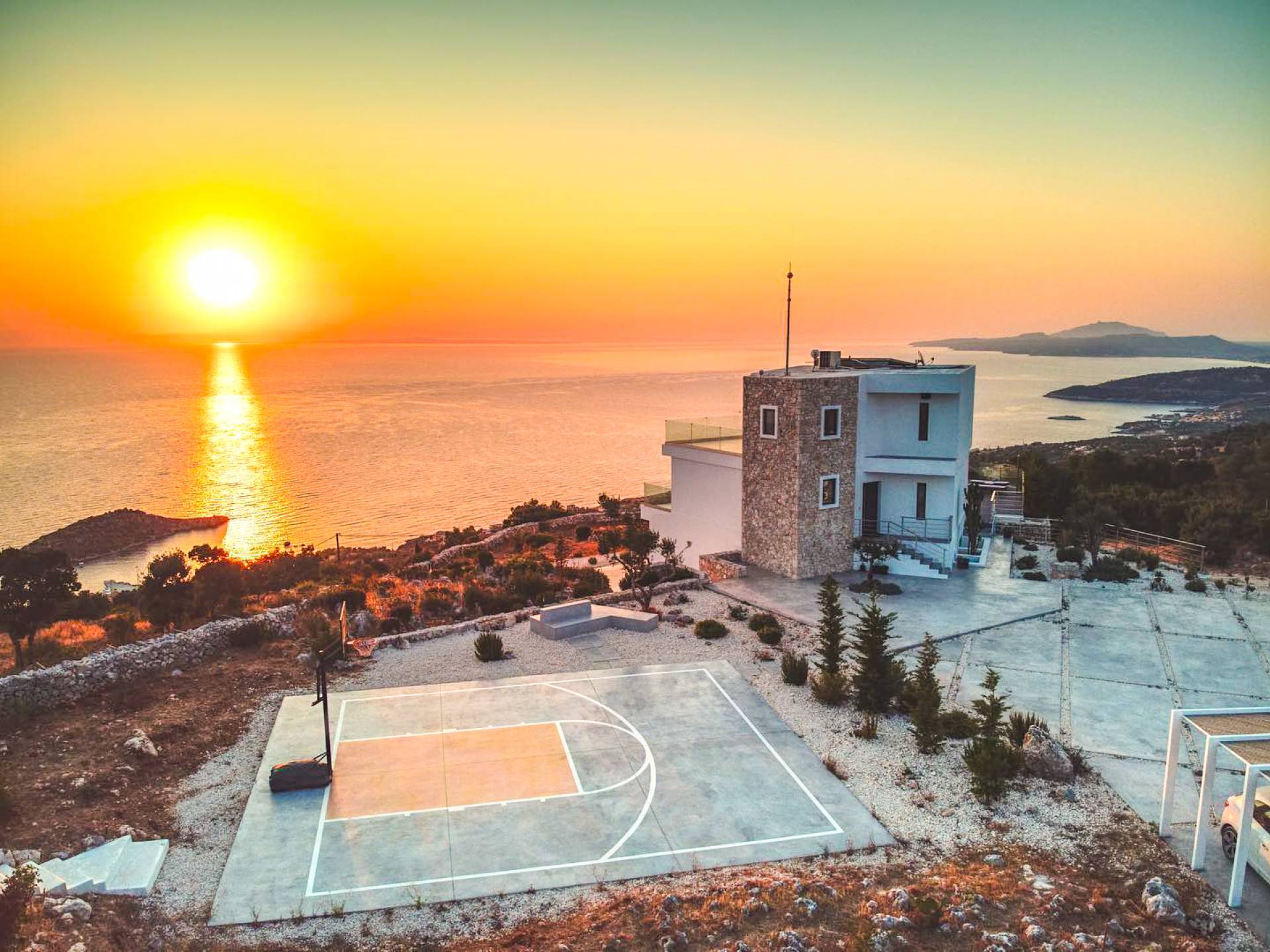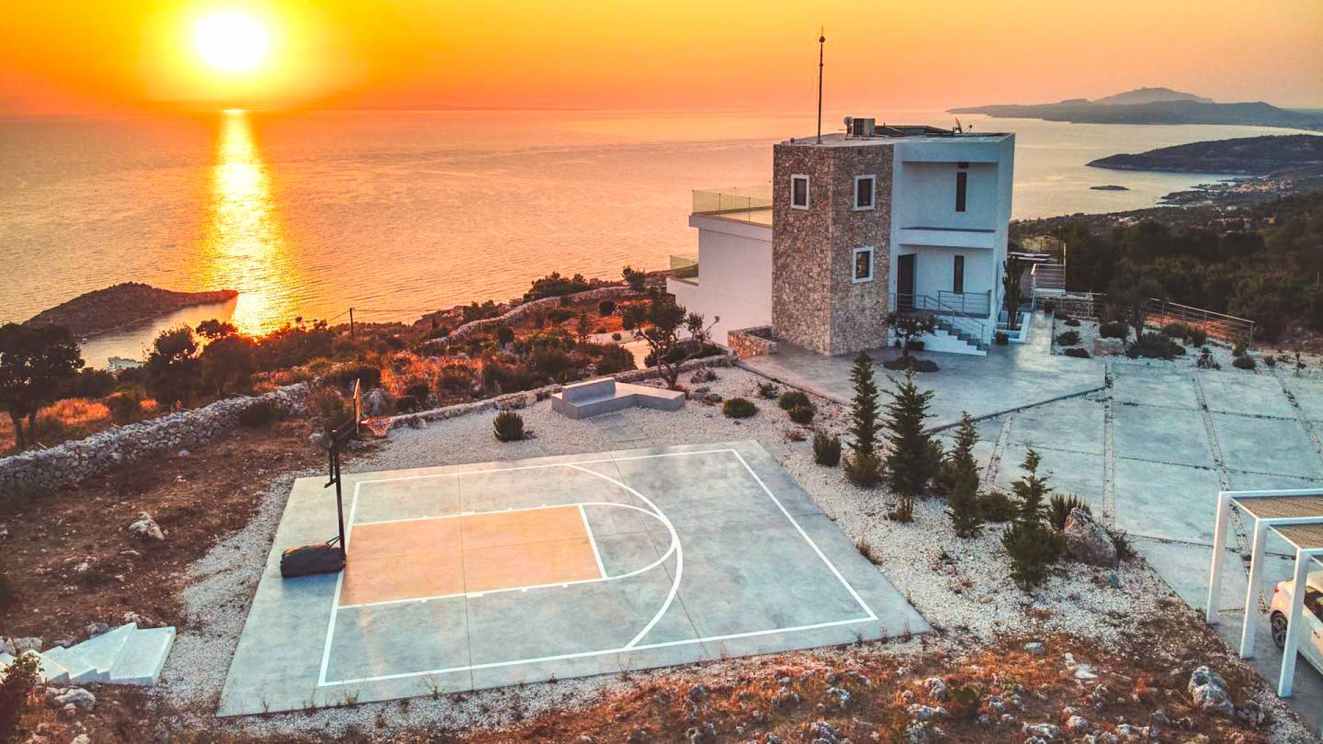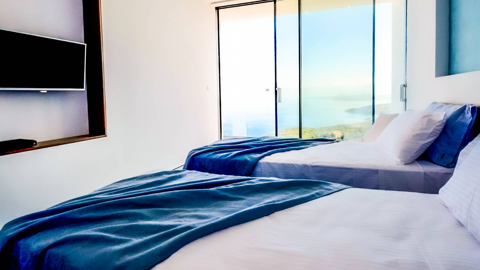 Cada una de las cuatro habitaciones cuenta con vista al mar, baño privado y una cama king-size, mientras que dos de ellas se pueden dividir en individuales. Las grandes ventanas de vidrio fusionan su espacio privado con el vasto cosmos, imbuyendo su tiempo libre privado con los ritmos ancestrales del mar. Se ha prestado atención y cuidado a esta casa para asegurarnos de que todo sea elegante y lujoso sin ser exigente. Ofrece una comodidad inmejorable y una elegancia natural para lo que es verdaderamente una villa de lujo única en su tipo. La Luminous Villa Zante cuenta con un generoso espacio al aire libre: una impresionante piscina infinita de tres lados, una media cancha de baloncesto, un salón exterior con sombra lejos de la casa y un helipuerto. Todo lo que esperaría en términos de tecnología está en Luminous Villa, incluidos televisores satelitales, grandes parlantes de alta fidelidad y parasoles enrollables automáticos.