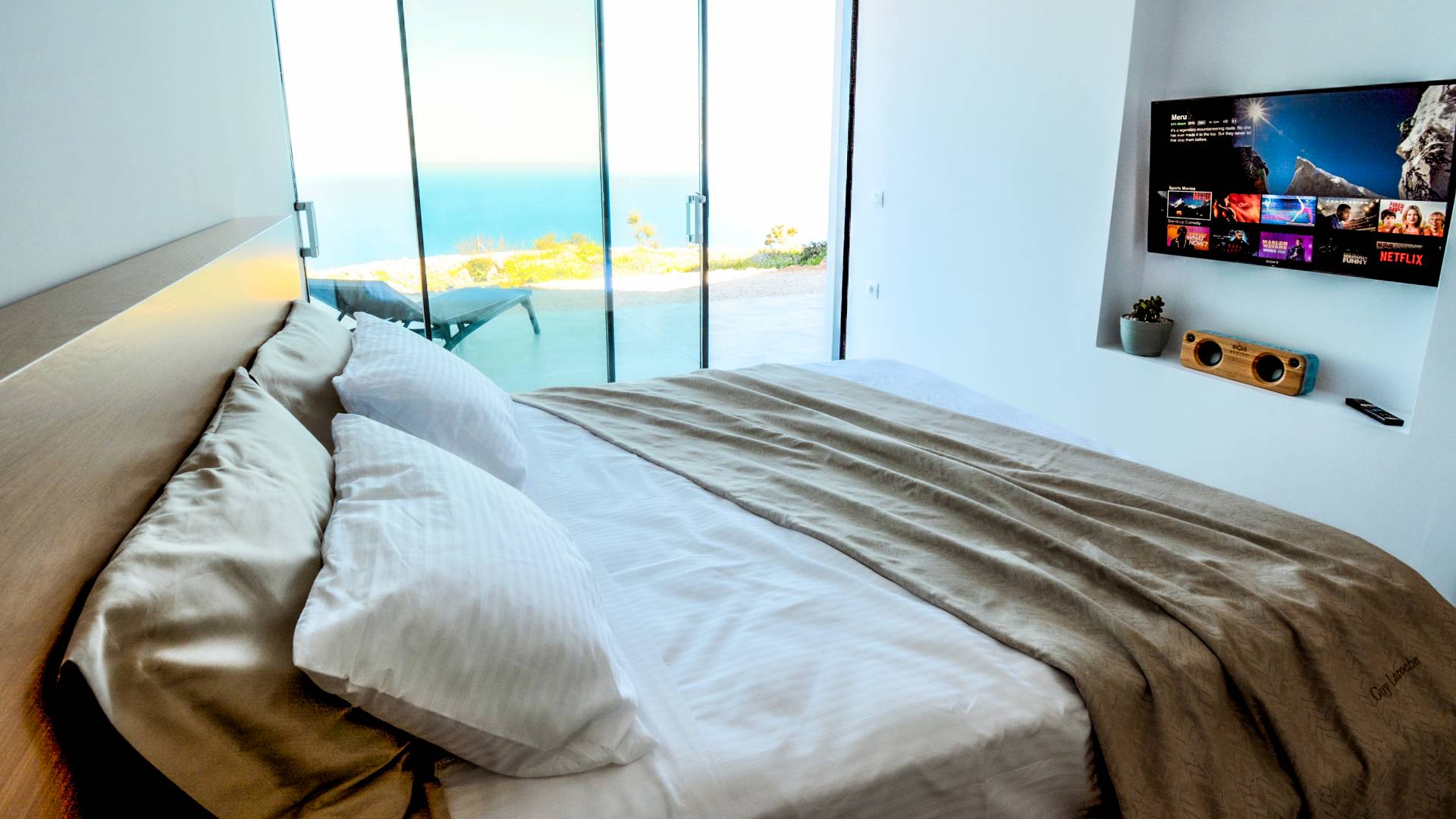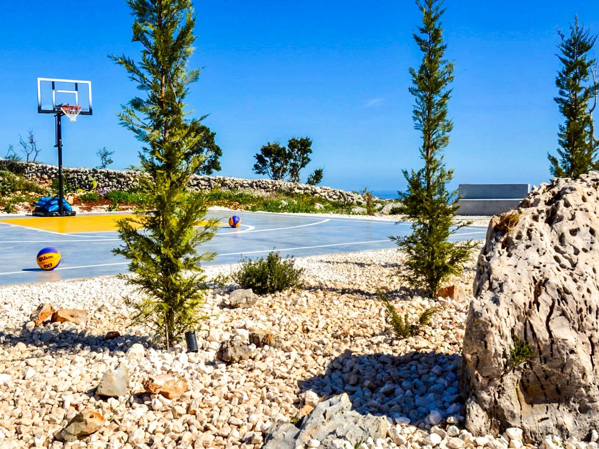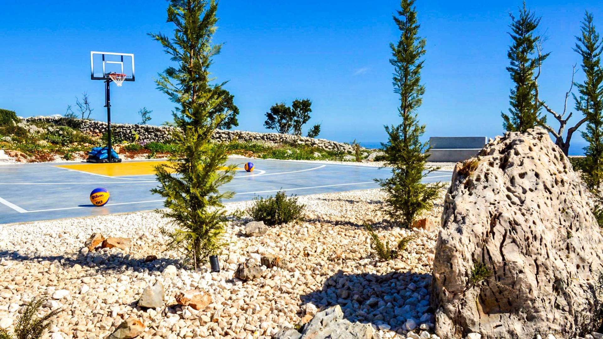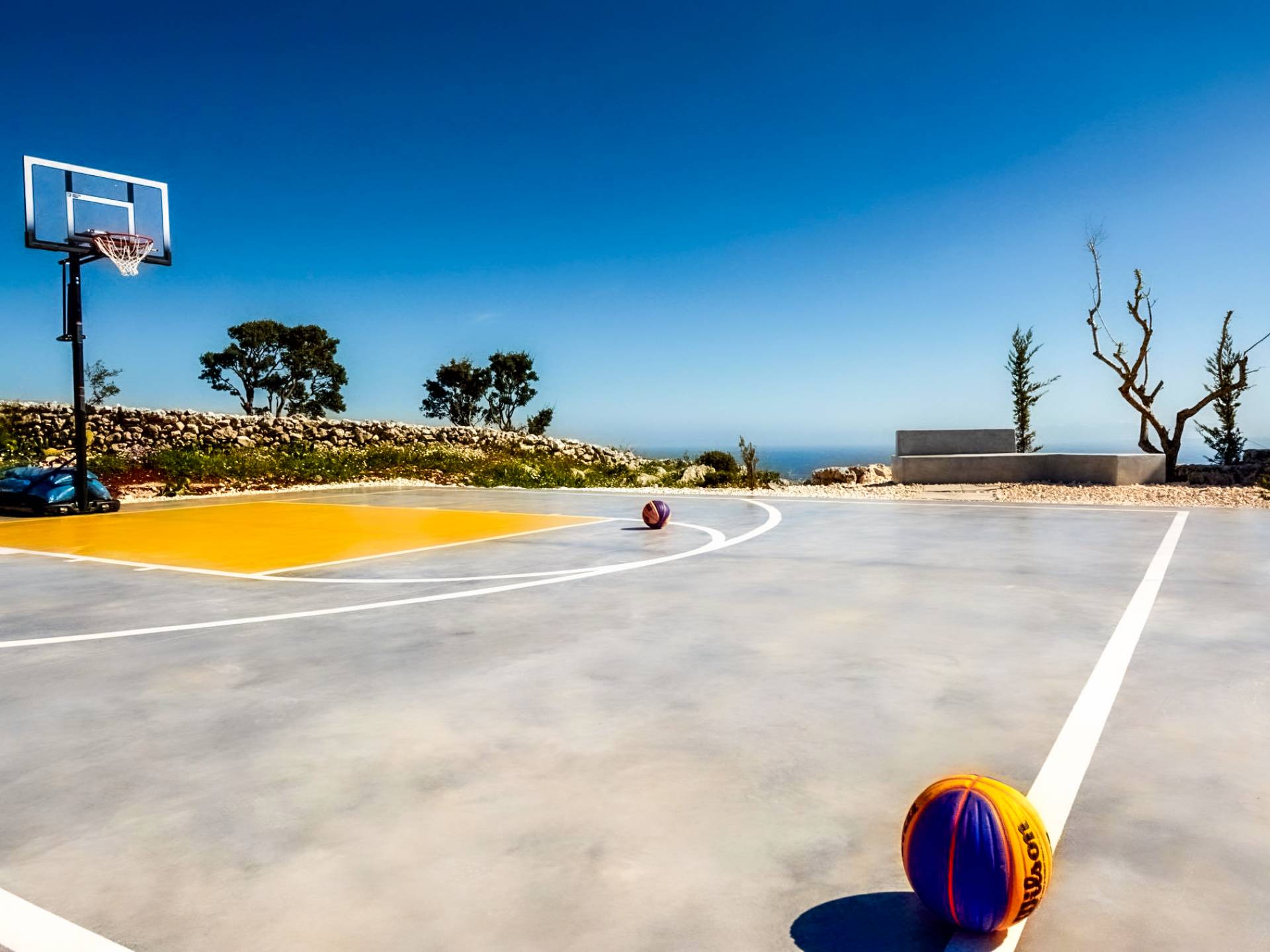 Cada una de las cuatro habitaciones cuenta con vista al mar, baño privado y una cama king-size, mientras que dos de ellas se pueden dividir en individuales. Las grandes ventanas de vidrio fusionan su espacio privado con el vasto cosmos, imbuyendo su tiempo libre privado con los ritmos ancestrales del mar. Se ha prestado atención y cuidado a esta casa para asegurarnos de que todo sea elegante y lujoso sin ser exigente. Ofrece una comodidad inmejorable y una elegancia natural para lo que es verdaderamente una villa de lujo única en su tipo. La Luminous Villa Zante cuenta con un generoso espacio al aire libre: una impresionante piscina infinita de tres lados, una media cancha de baloncesto, un salón exterior con sombra lejos de la casa y un helipuerto. Todo lo que esperaría en términos de tecnología está en Luminous Villa, incluidos televisores satelitales, grandes parlantes de alta fidelidad y parasoles enrollables automáticos.