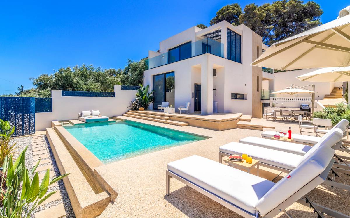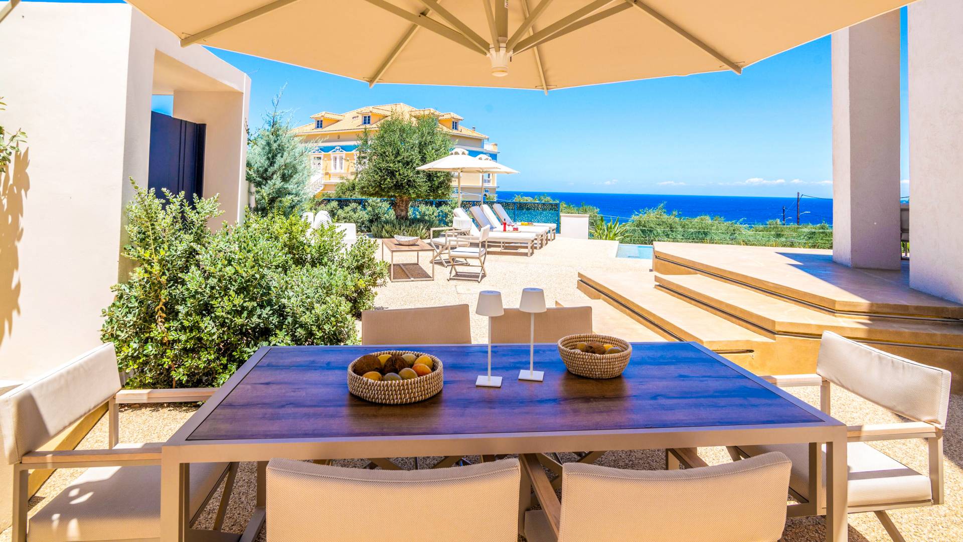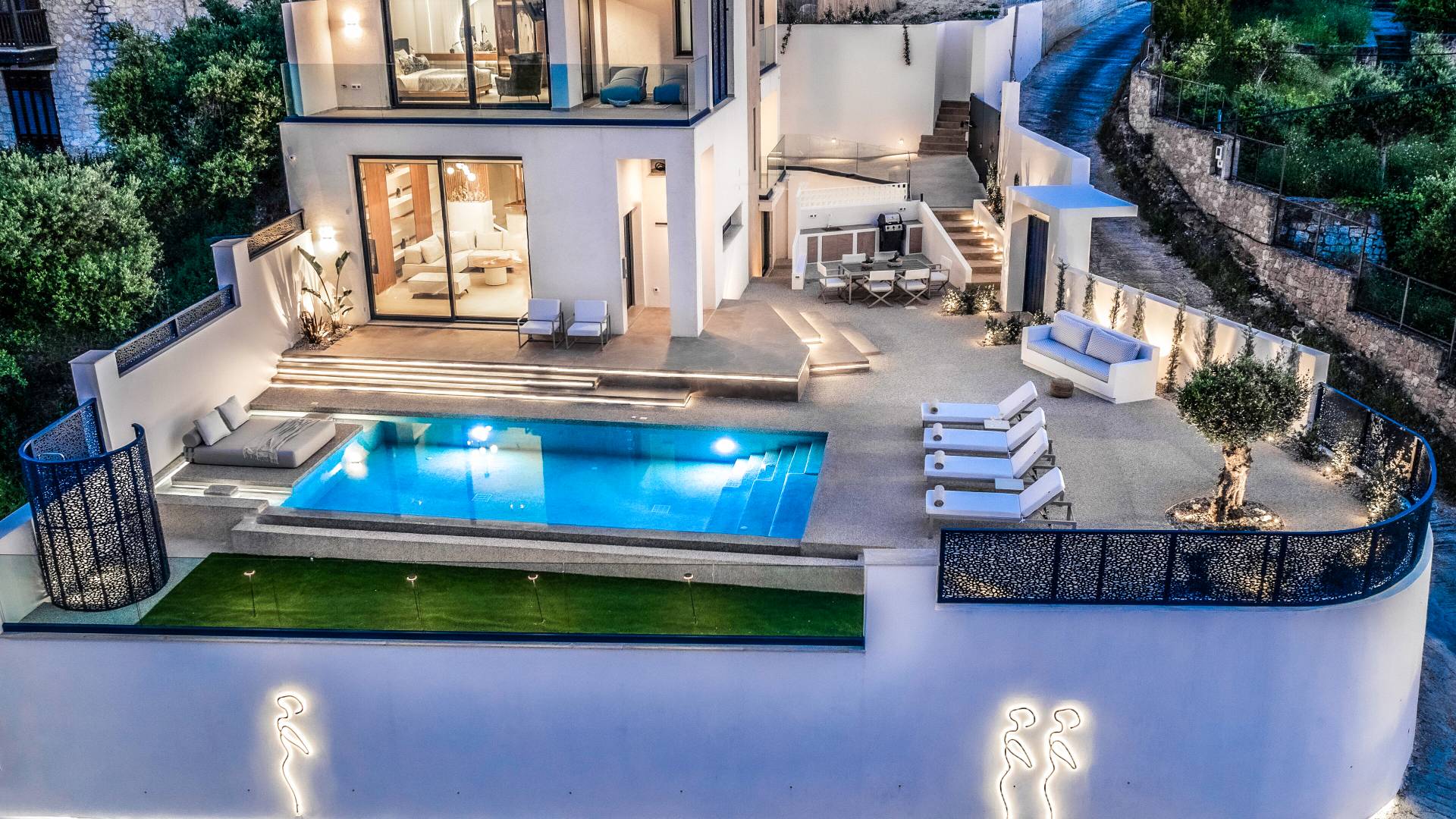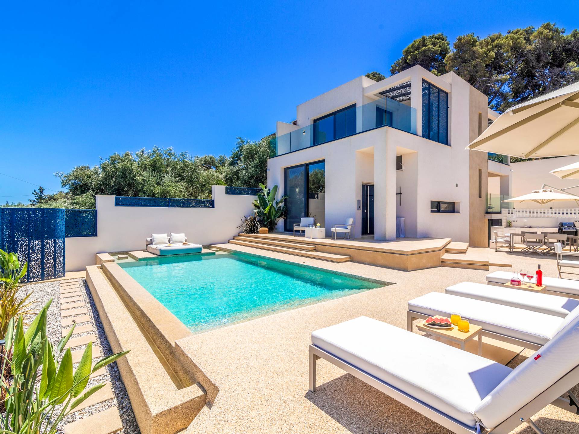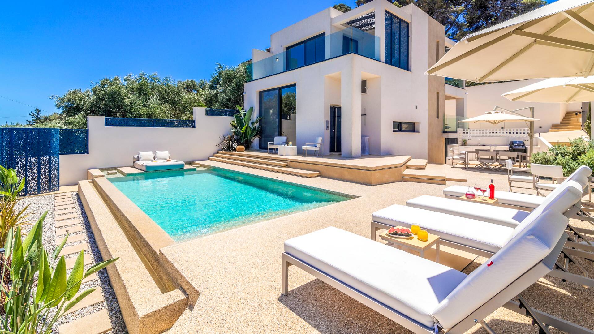 Bask in the Mediterranean sun from your private swimming pool. Designed for entertainment and relaxation, the outdoor area features:
