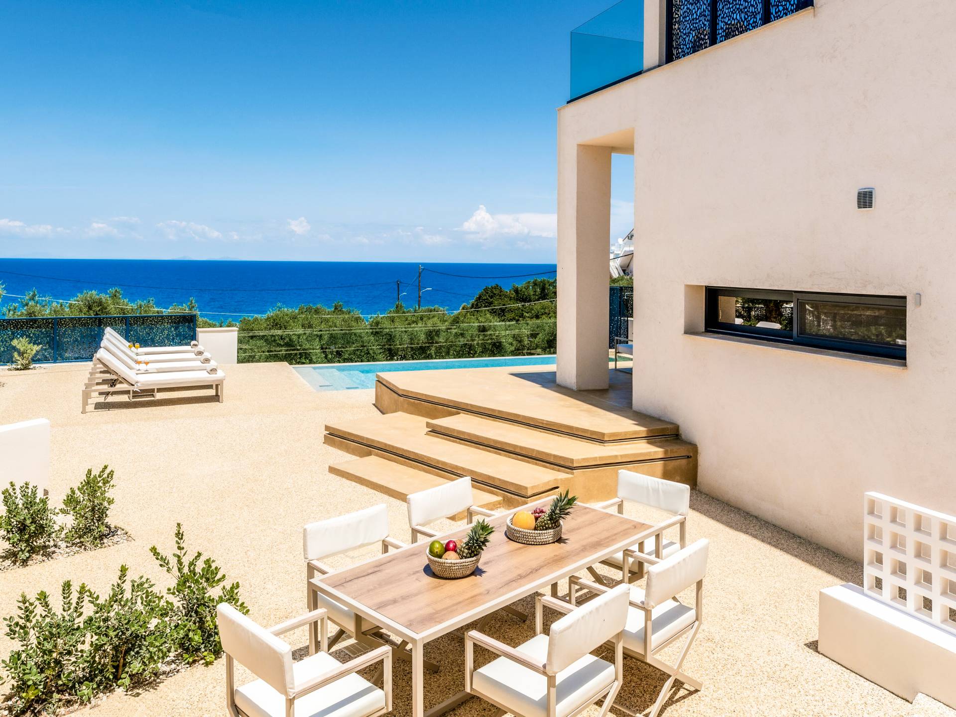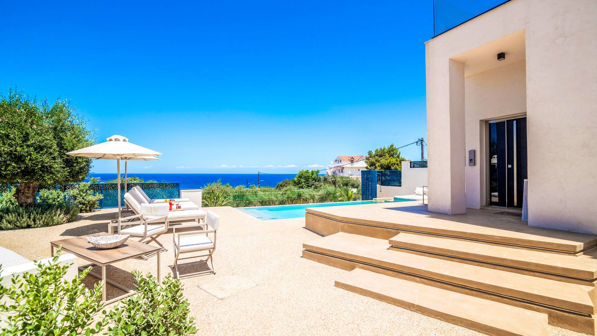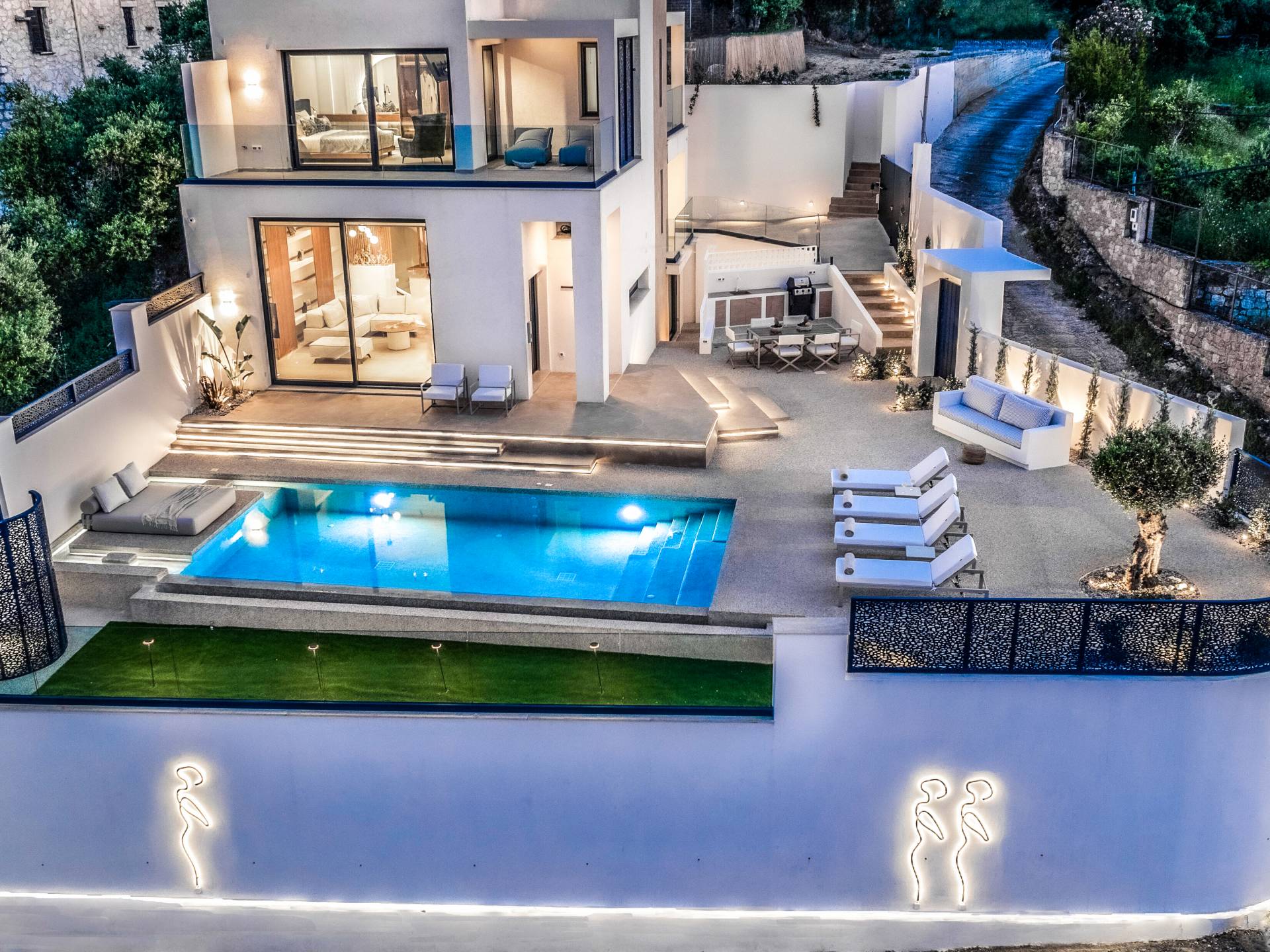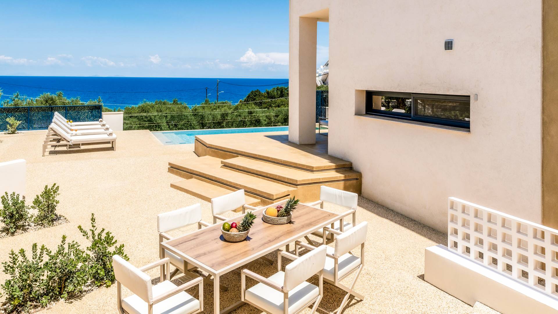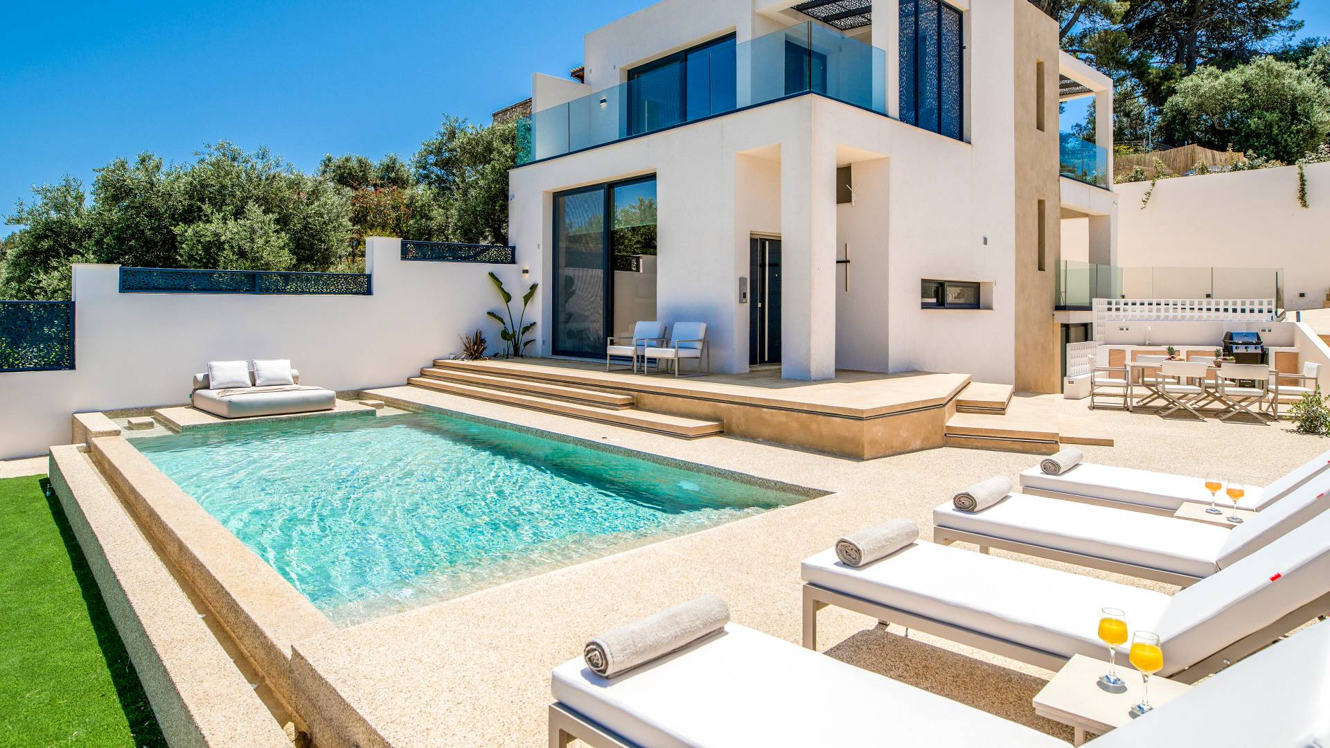 Bask in the Mediterranean sun from your private swimming pool. Designed for entertainment and relaxation, the outdoor area features: