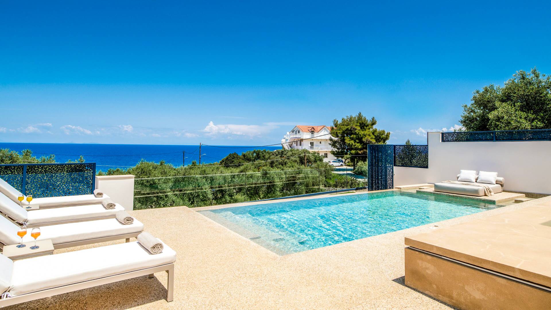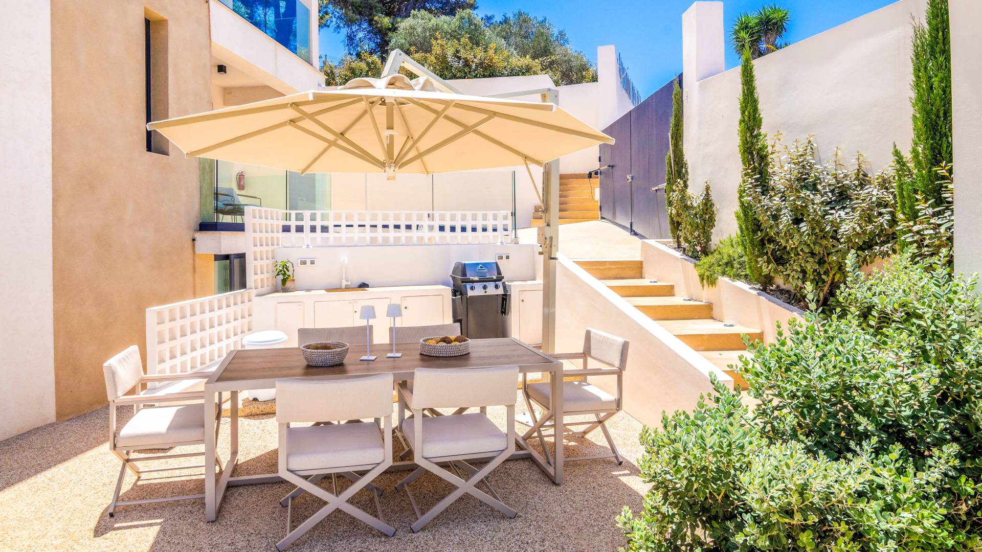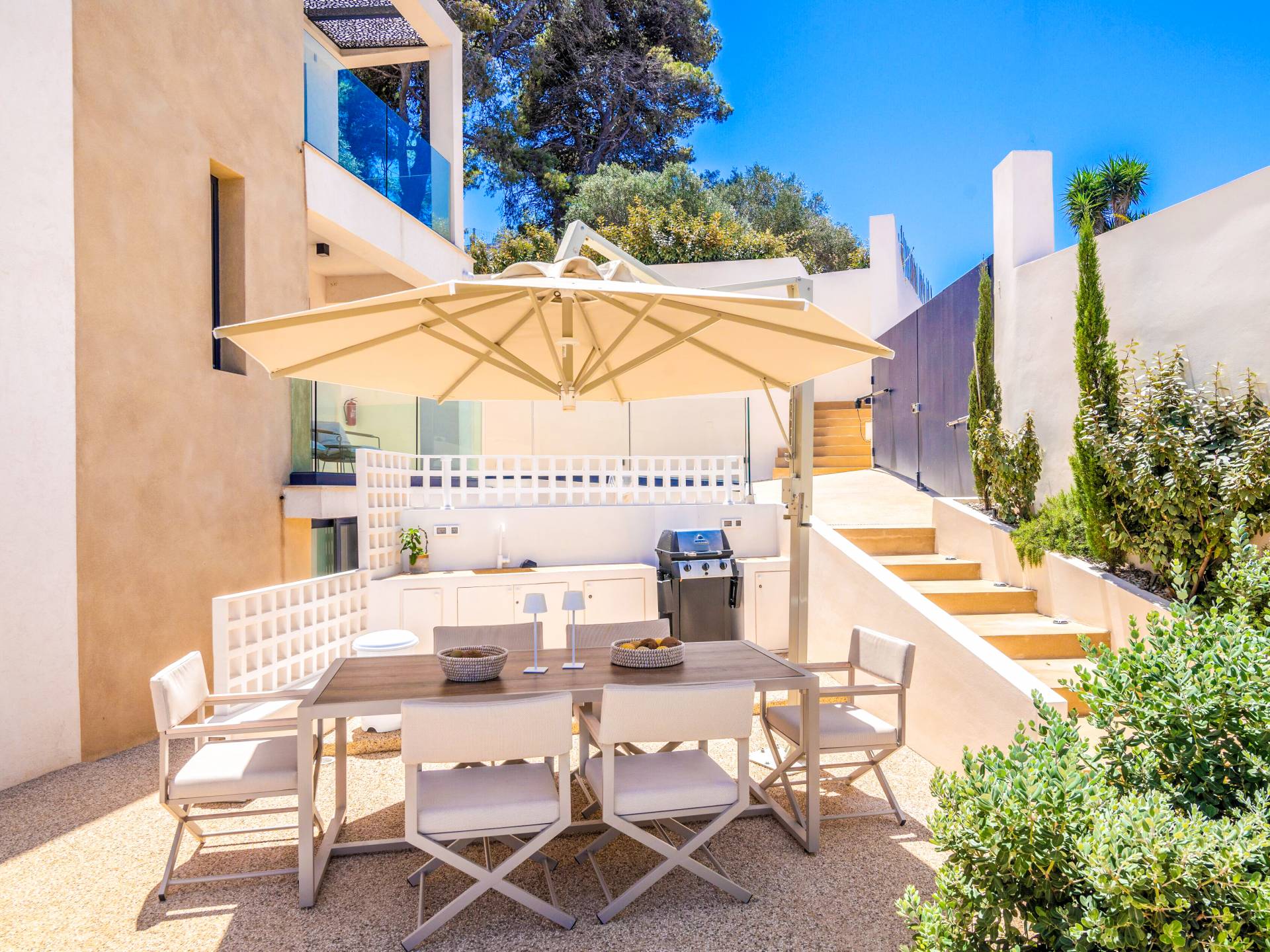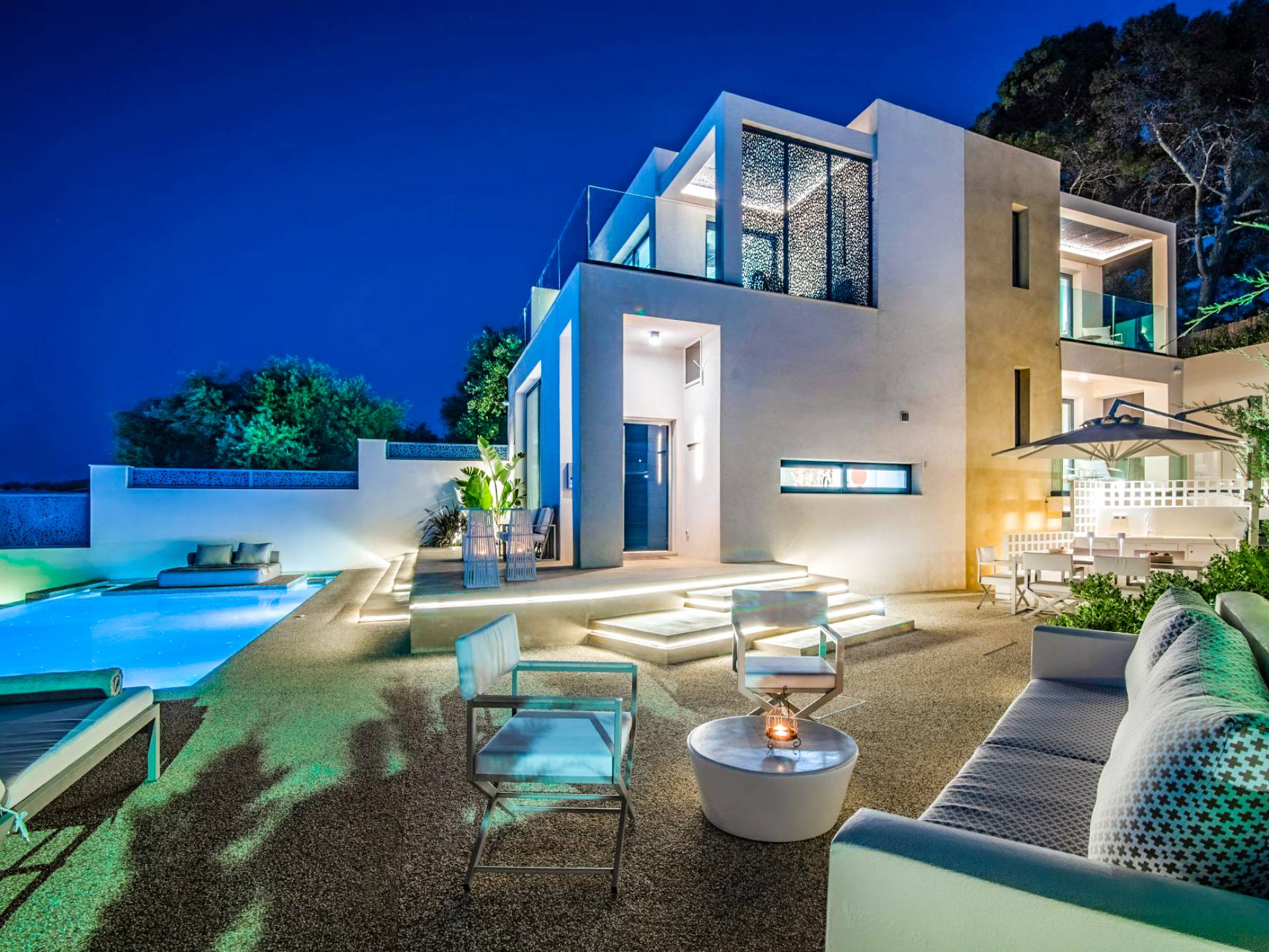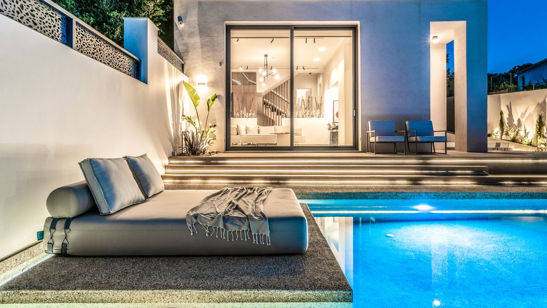 Bask in the Mediterranean sun from your private swimming pool. Designed for entertainment and relaxation, the outdoor area features: