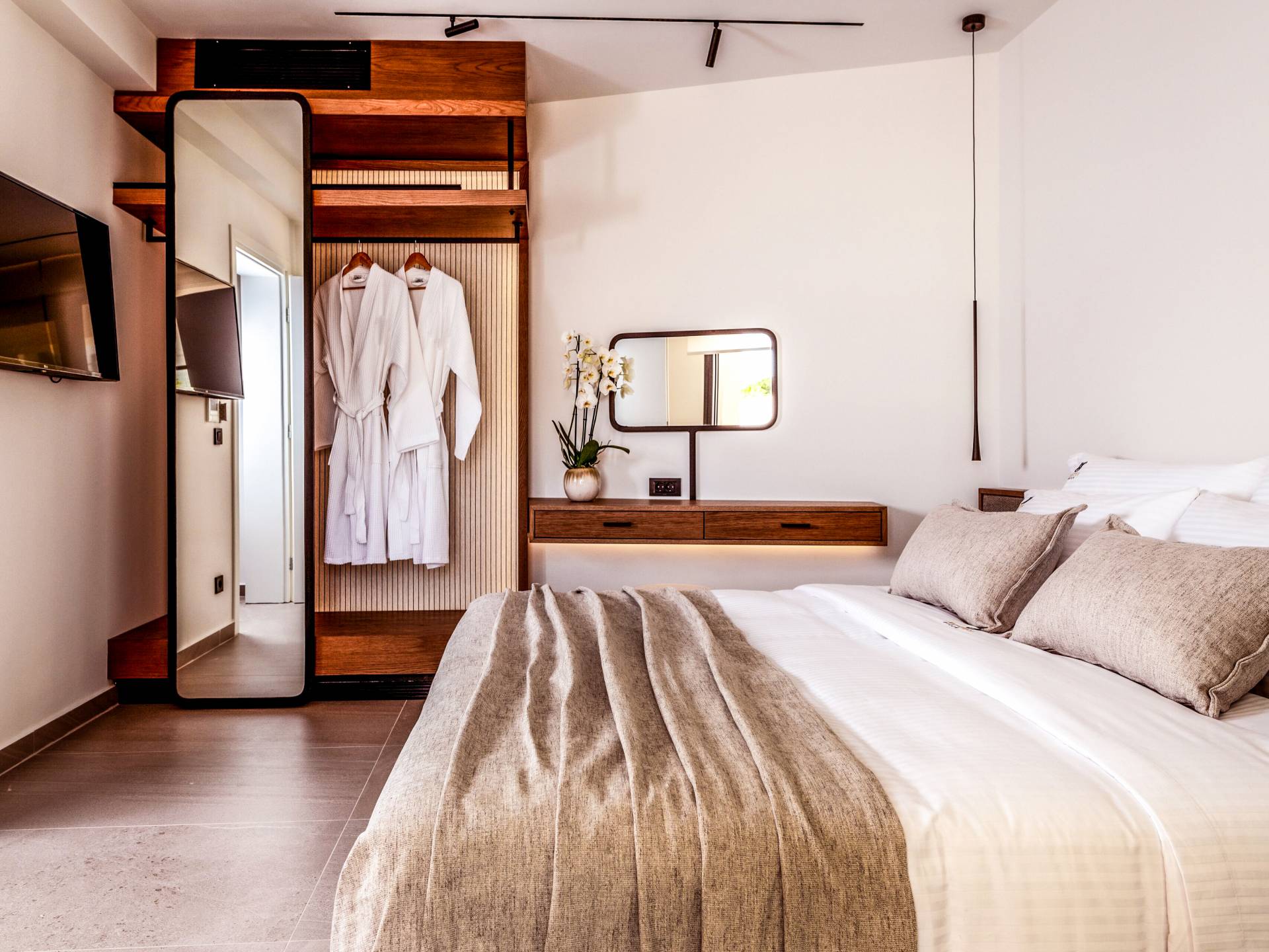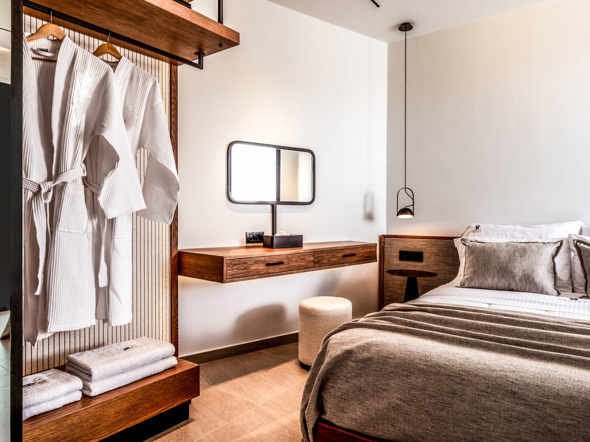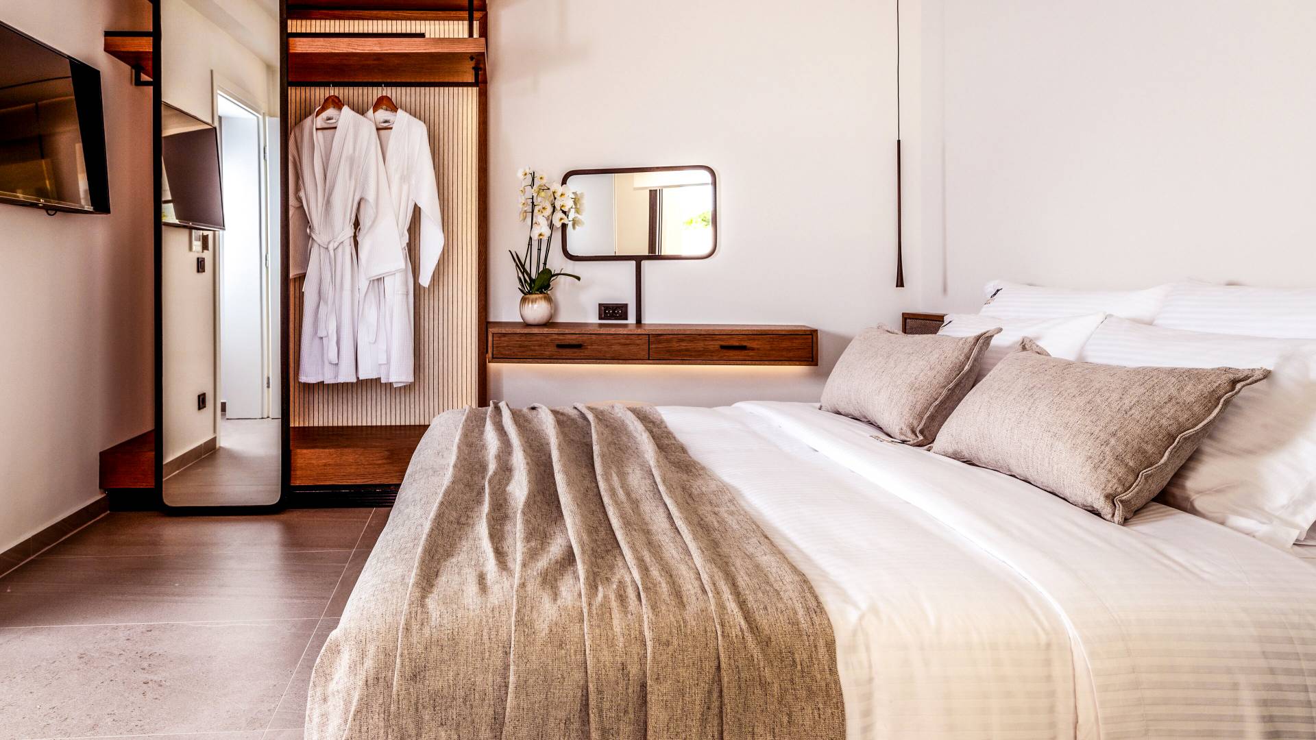 - Bedroom 1 with queen bed, ensuite bathroom and terrace access