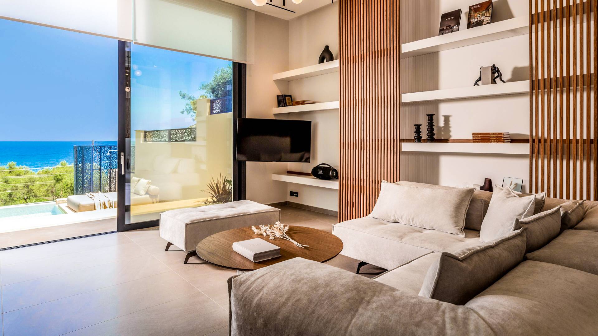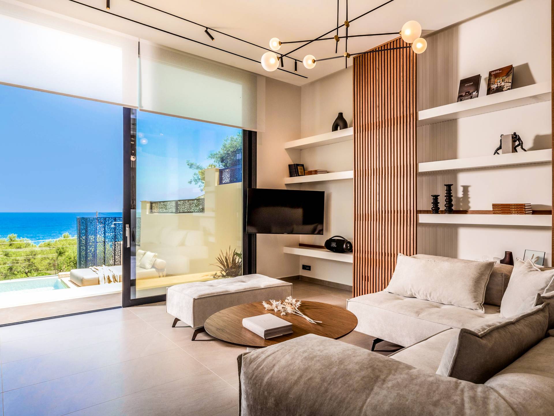 - Elegant open plan comfortable living area with pool access
