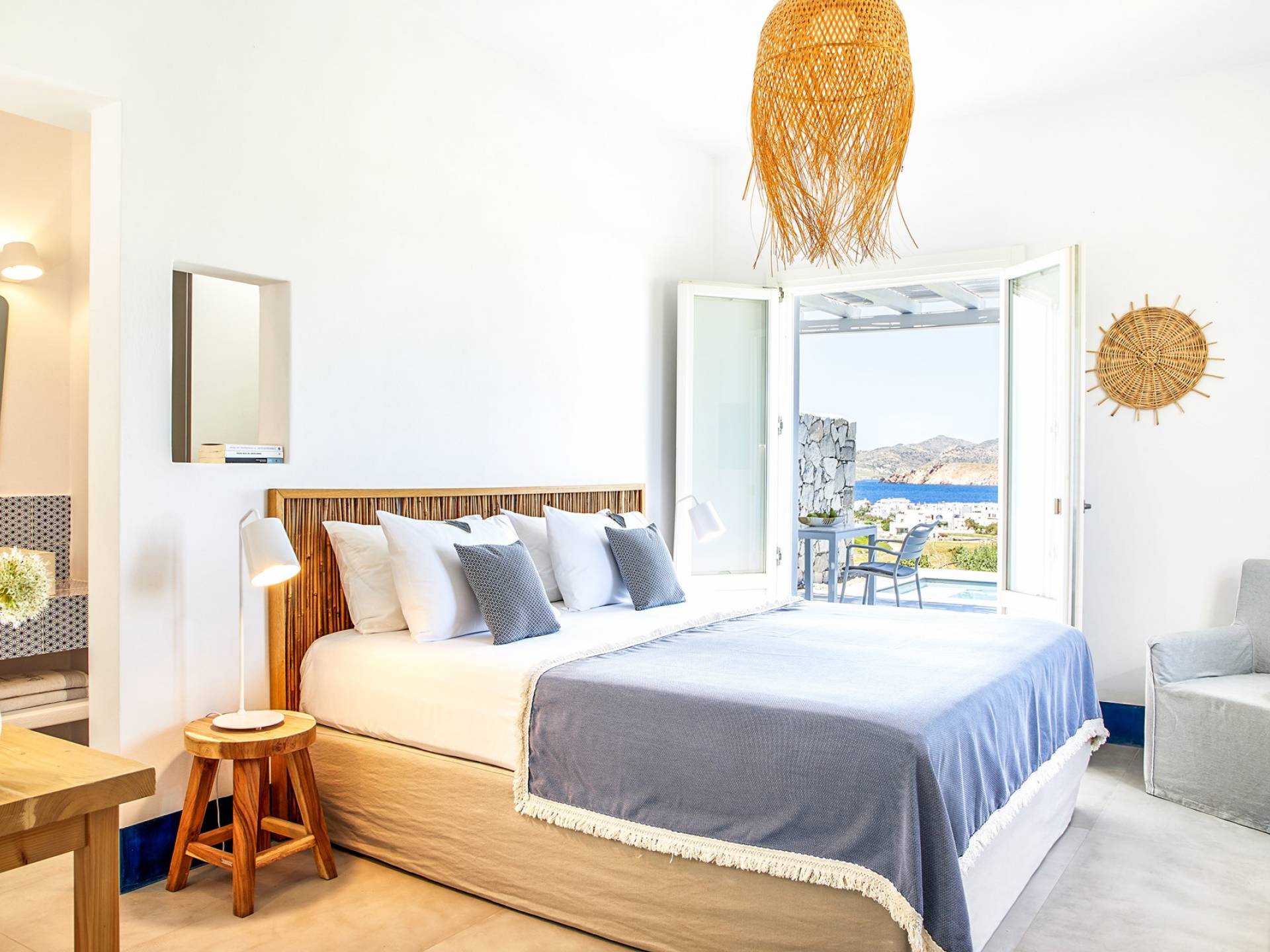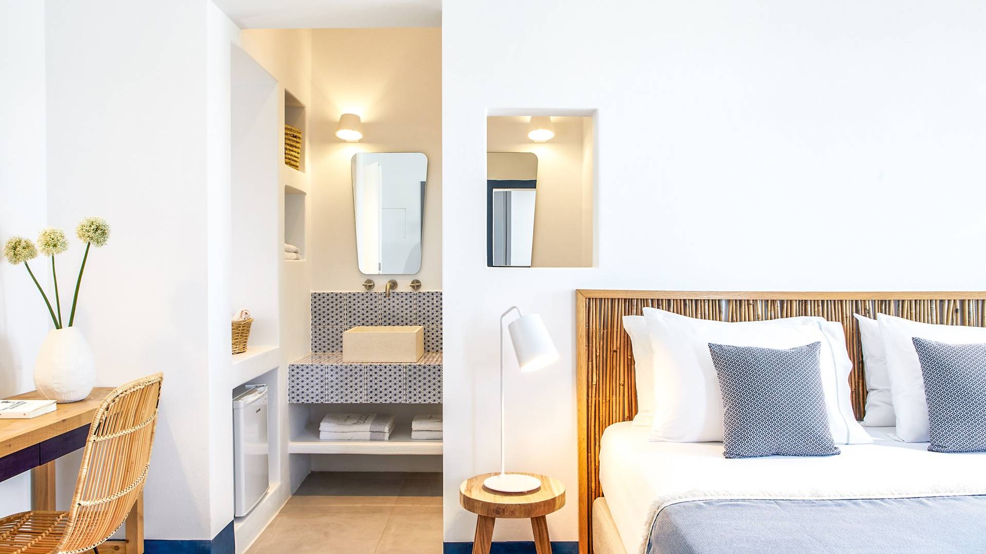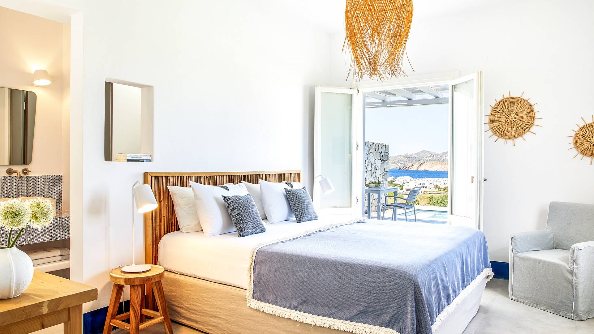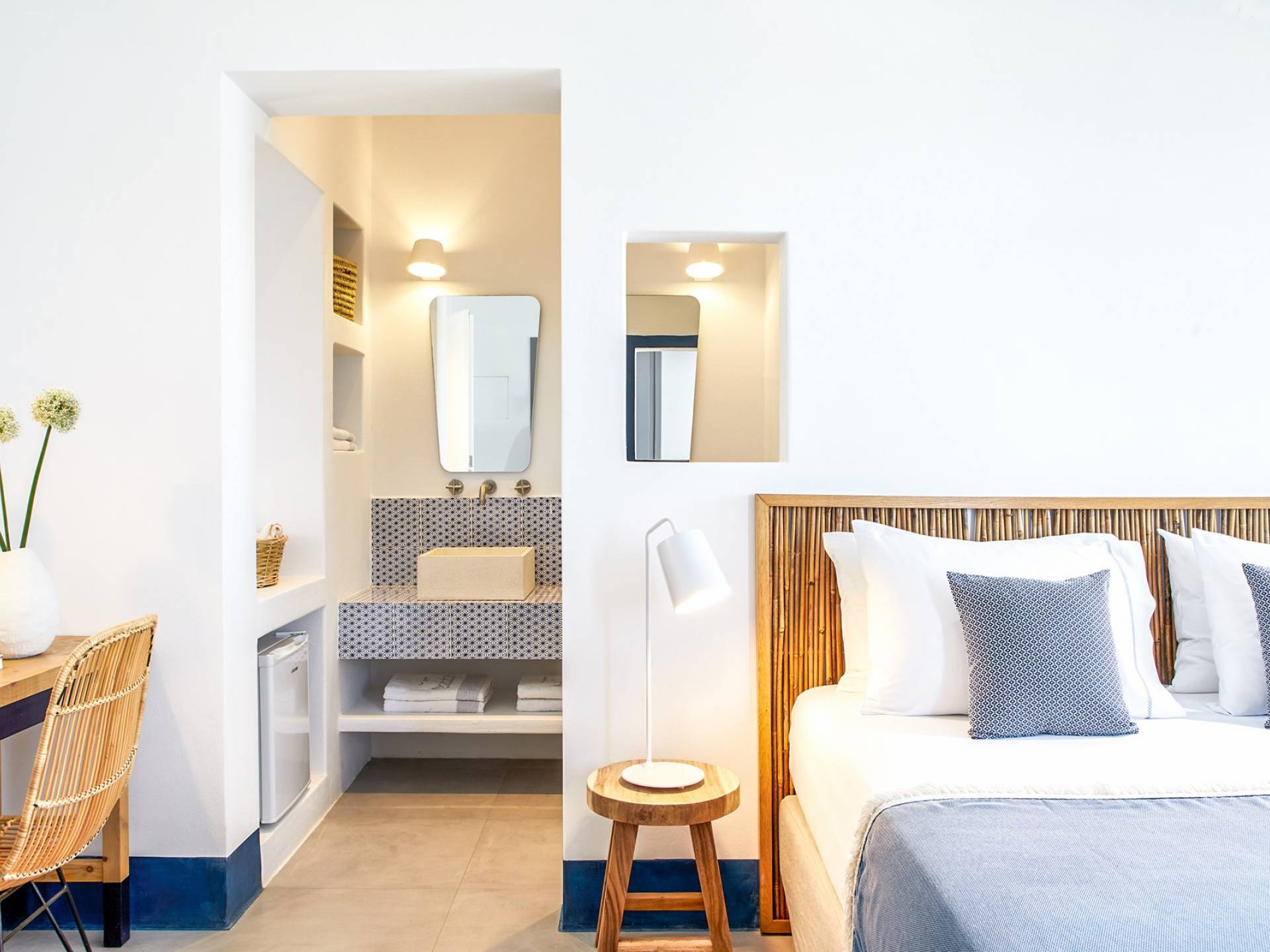 La suite exclusiva en Milos Breeze Boutique es una excelente opción para reforzar su bienestar. La bañera de hidromasaje complementa el lujoso baño de la habitación, ofreciendo interminables horas de profunda relajación a sus huéspedes. Desde su balcón, los huéspedes pueden calmar sus sentidos contemplando el azul profundo del mar Egeo y la pintoresca belleza de Pollonia, durante horas. La decoración minimalista y los tonos claros de los interiores realzan aún más la sensación de calma que prevalece. Tiene un tamaño de 25 m2 y puede alojar hasta dos personas en una cama doble grande.