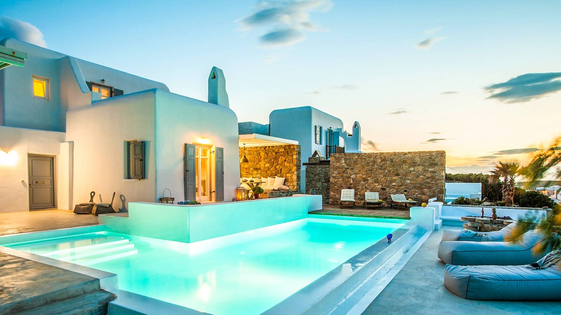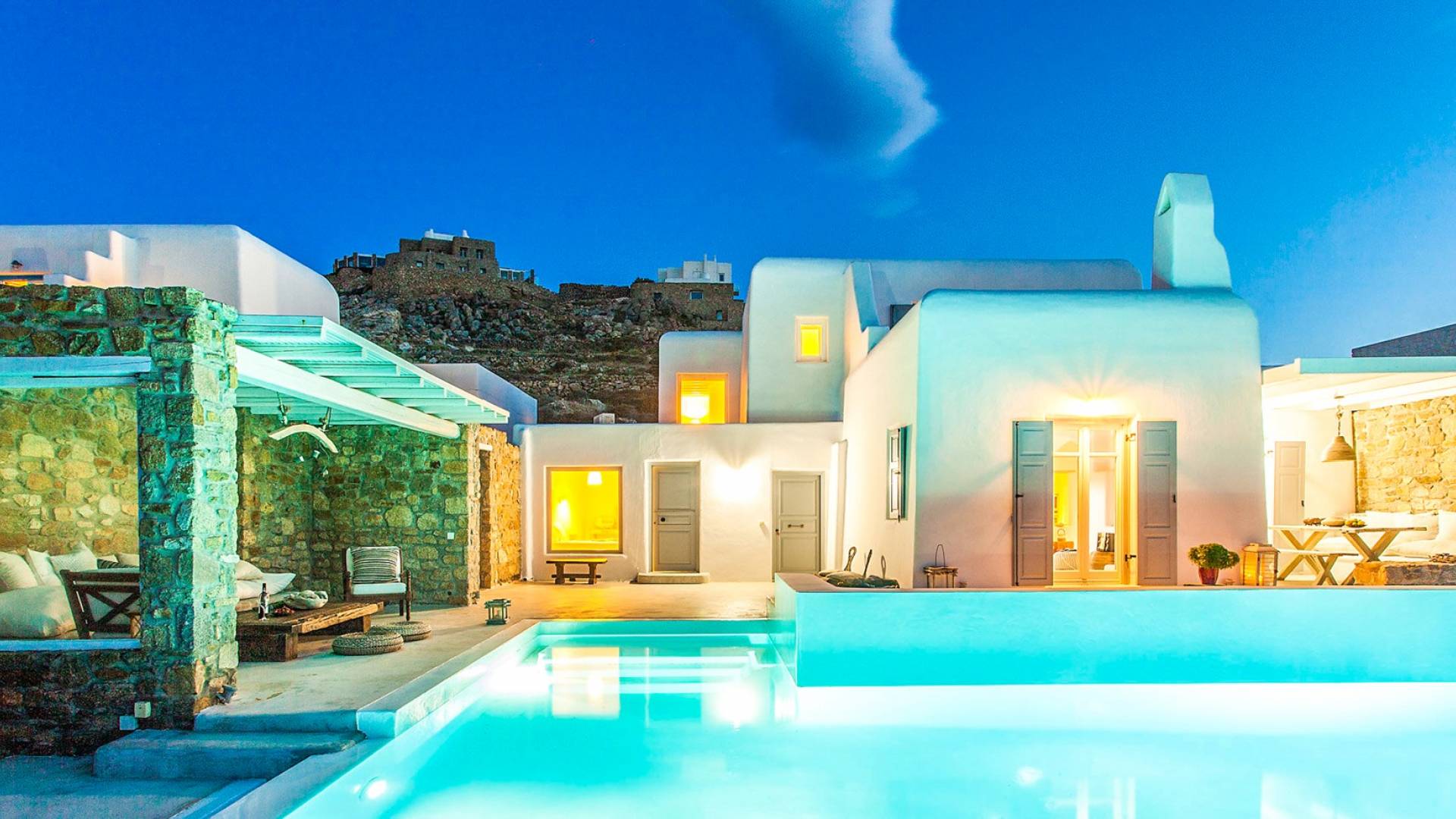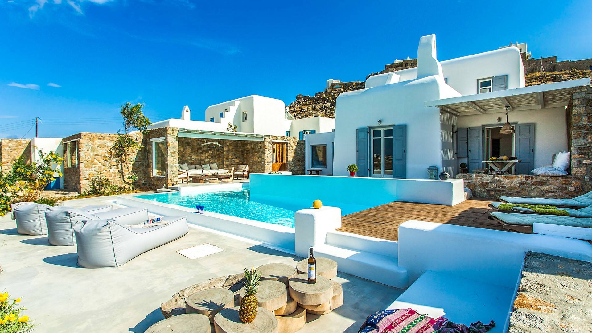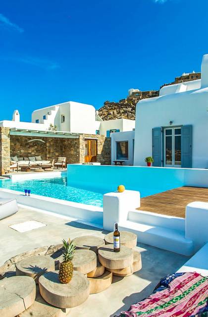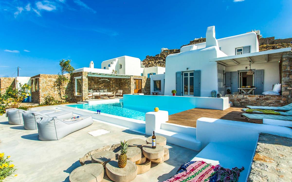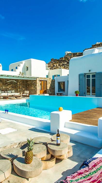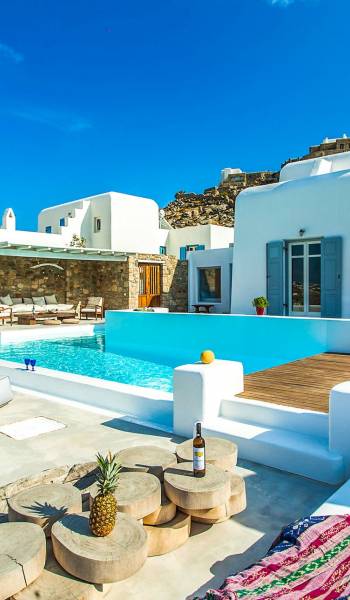 Villa Jasper Mykonos, una exclusiva villa de cinco dormitorios que ejemplifica el verdadero espíritu de la vida veraniega de Mykonos, donde puede disfrutar de una noche de vino tinto en la playa de Ornos mientras ofrece libaciones junto a la piscina a la diosa local Artemisa.