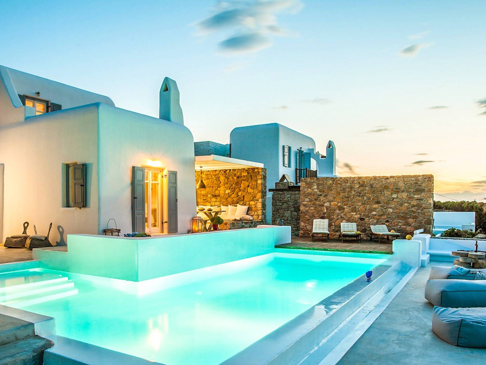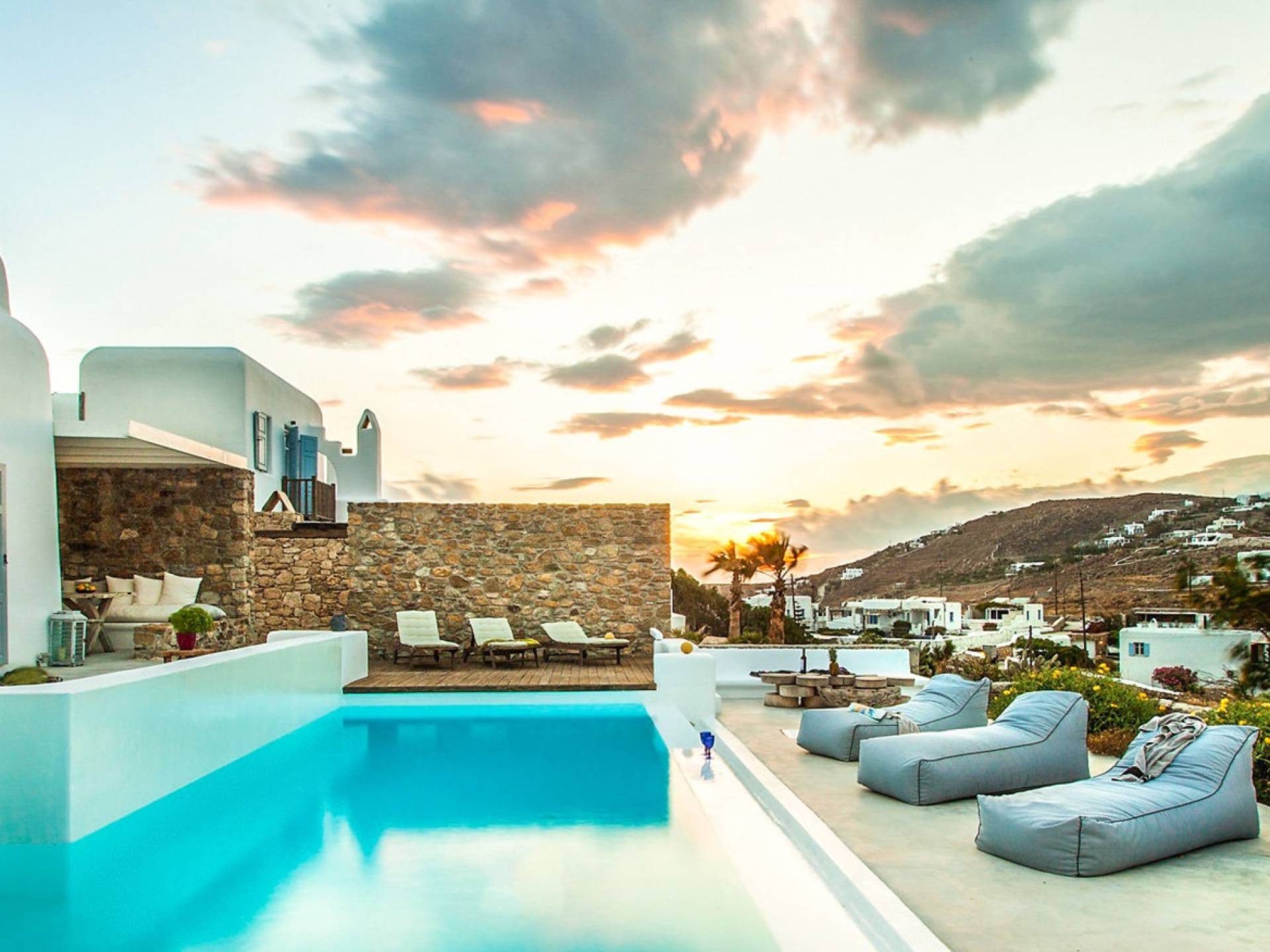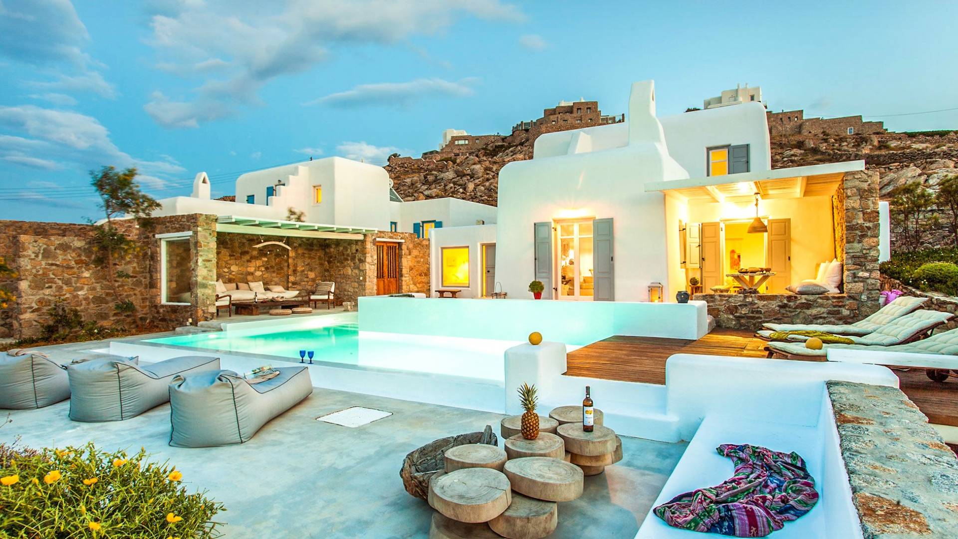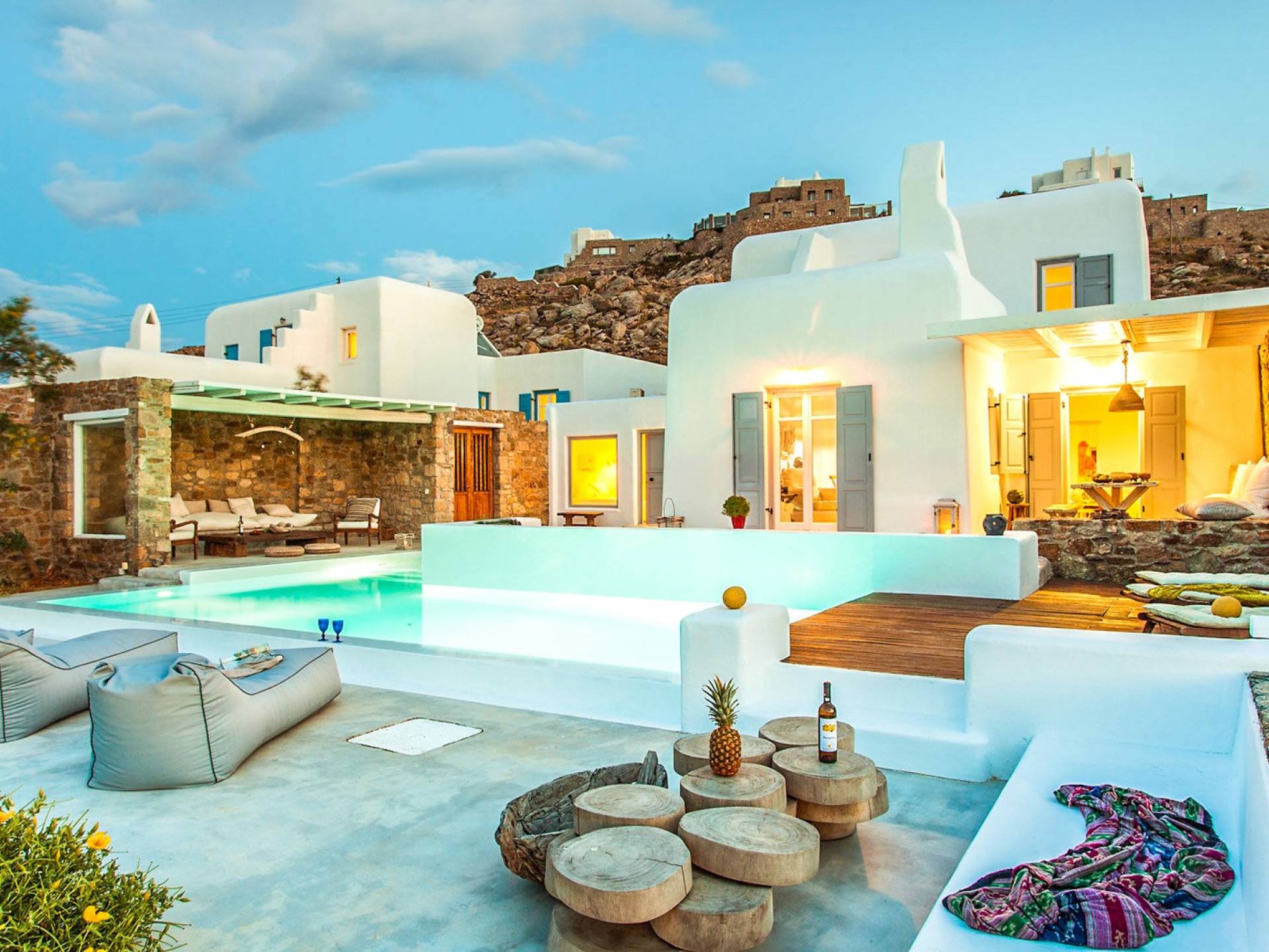 Villa Jasper Mykonos, una exclusiva villa de cinco dormitorios que ejemplifica el verdadero espíritu de la vida veraniega de Mykonos, donde puede disfrutar de una noche de vino tinto en la playa de Ornos mientras ofrece libaciones junto a la piscina a la diosa local Artemisa.