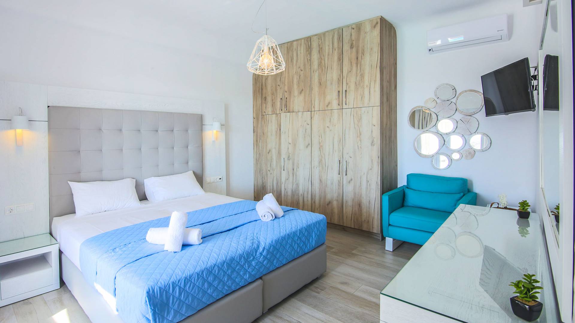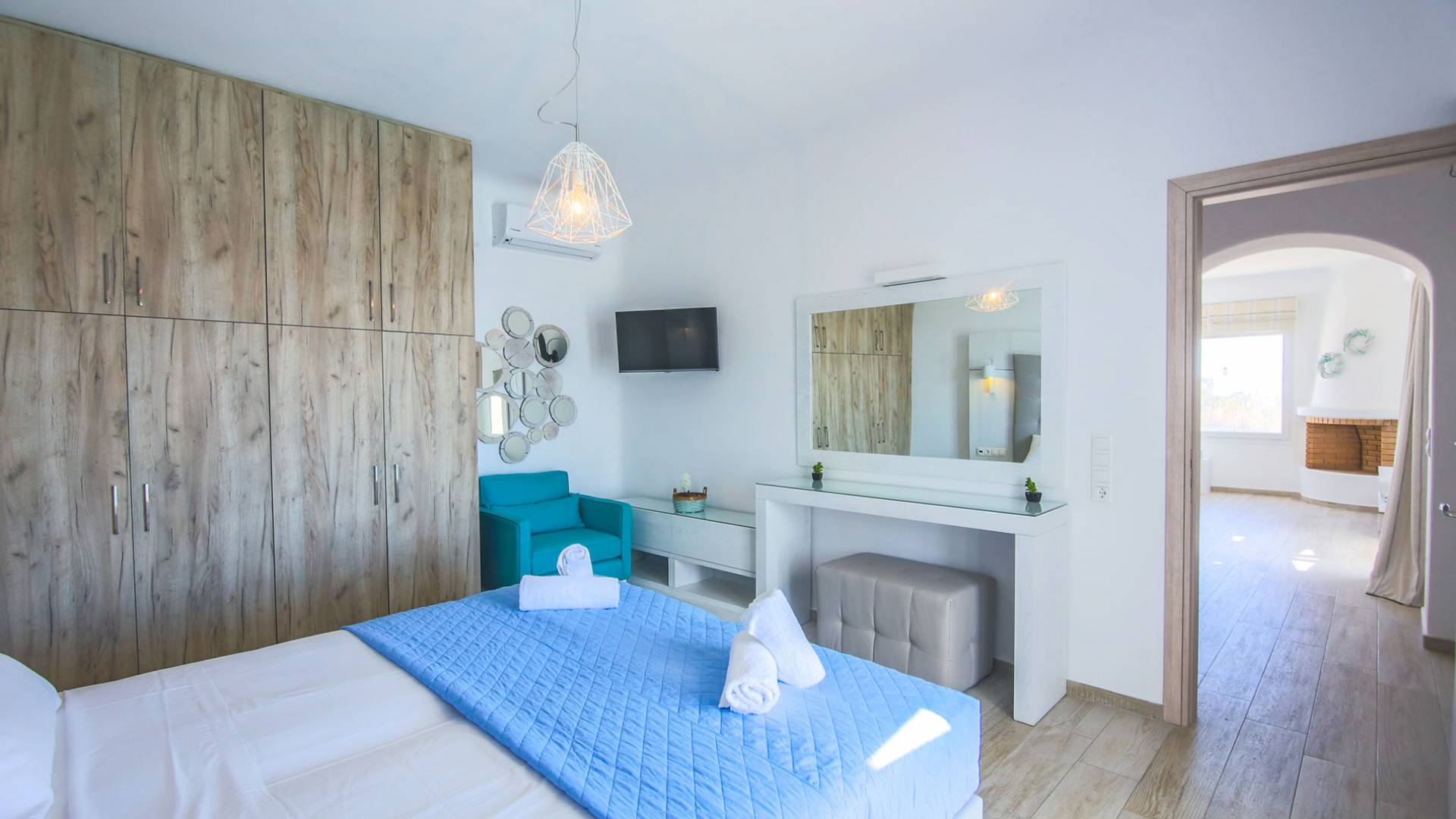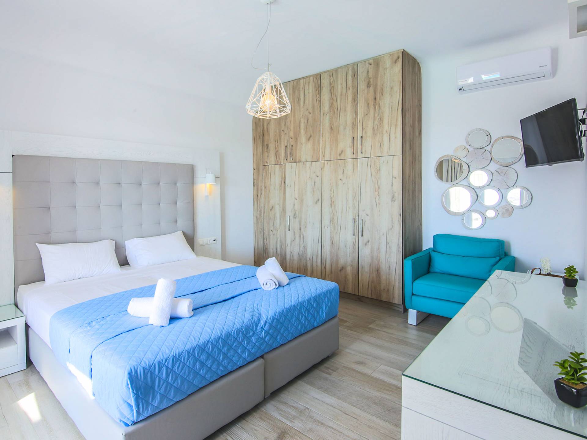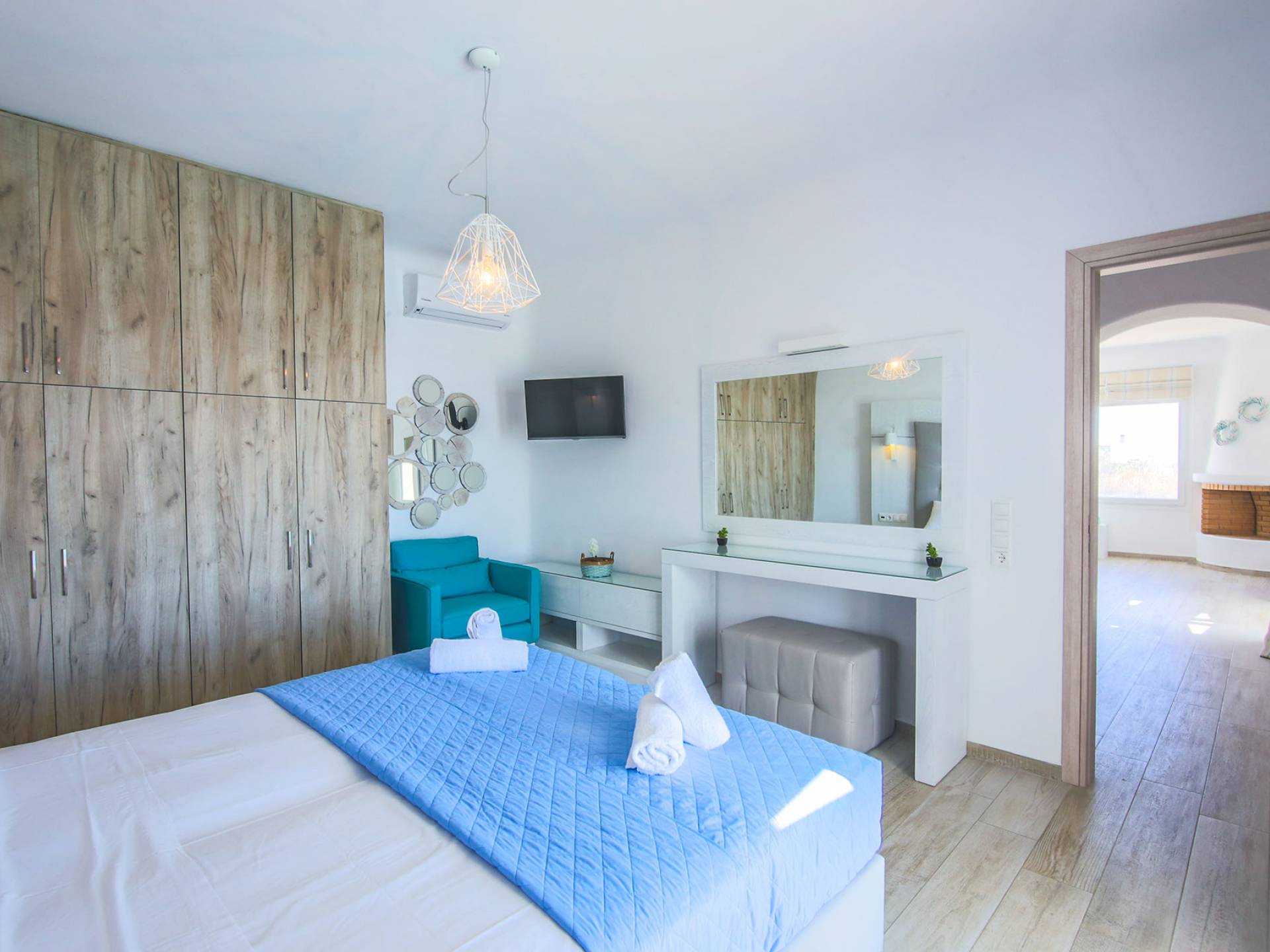 La villa de lujo de 1 dormitorio en Evi Luxury Residences Mykonos es una villa de lujo en alquiler con piscina privada. Una combinación única del cielo azul, el mar Egeo y las aguas cristalinas de la piscina privada aportan un toque de encanto. Las tonalidades de azul que te rodean te llevan a caminos de relajación y rejuvenecimiento. Paseando por los 700sq. ft. Villa Deluxe de 1 dormitorio, puede ver todas las comodidades que garantizan convertir las vacaciones más relajantes y lujosas en Mykonos en la experiencia de su vida.