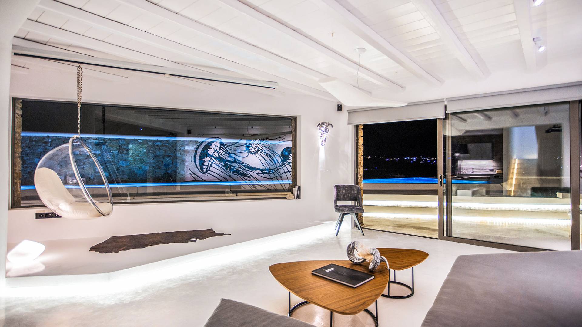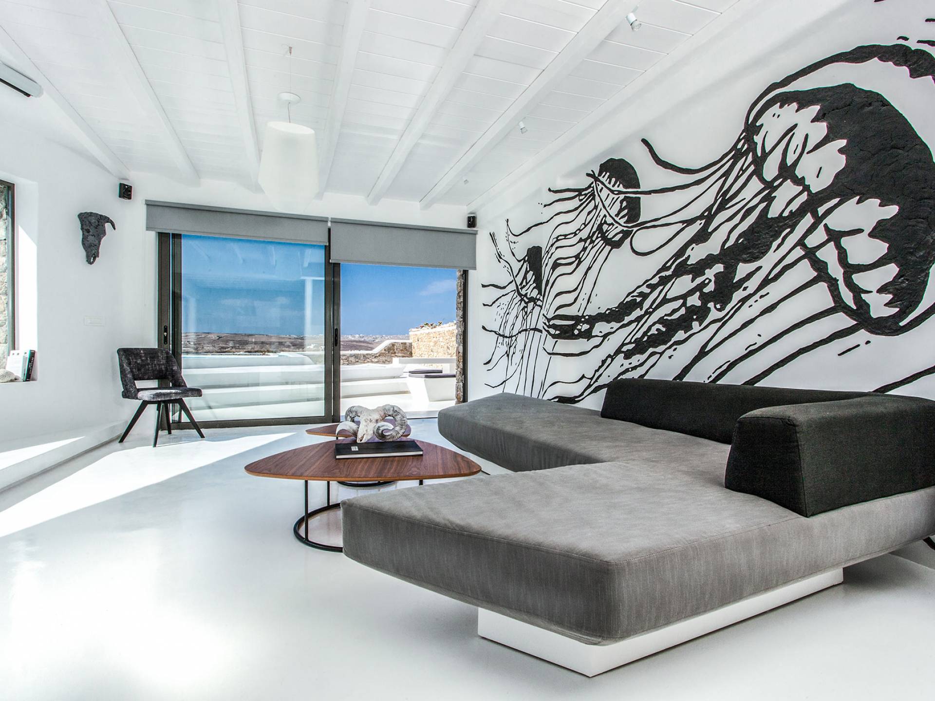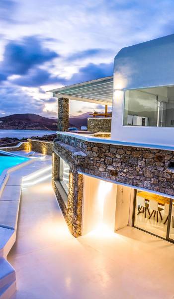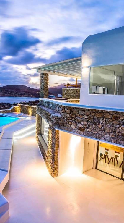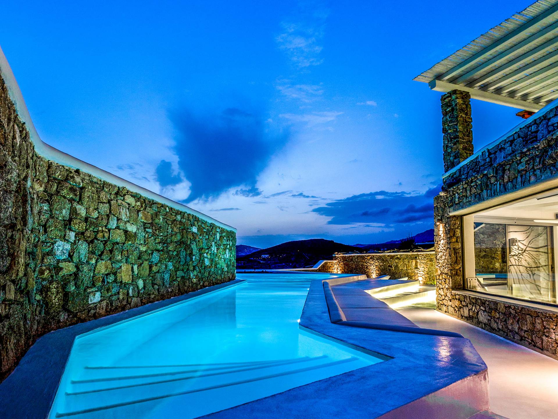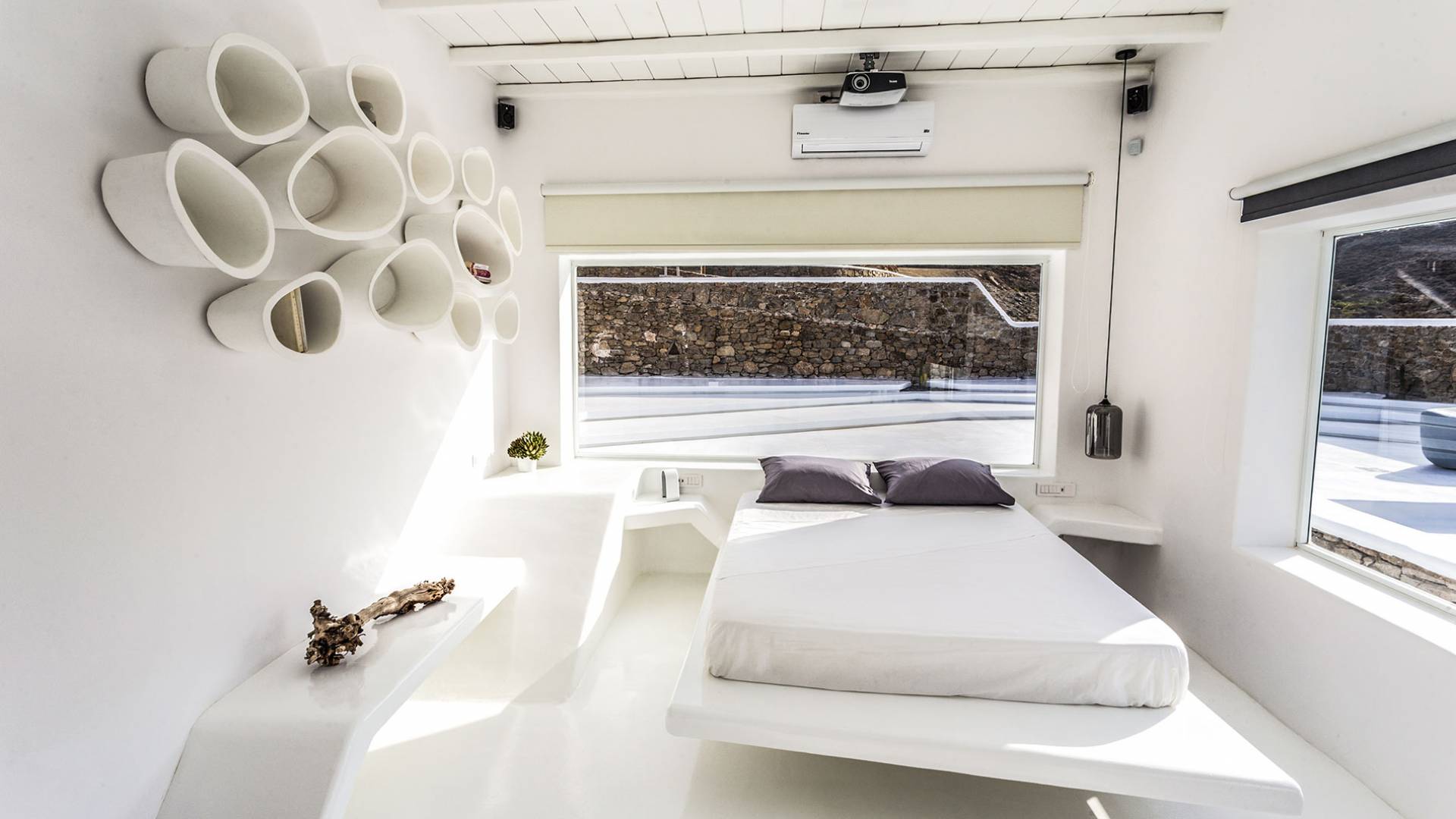 La tecnología fluye sutilmente a través de la villa. La sala de estar cuenta con un impresionante cine en casa con un proyector de alta definición, reproductor multimedia Bluetooth Blueray y Apple TV que le permite transmitir contenido sin problemas desde cualquier dispositivo. La misma potencia se puede encontrar en el dormitorio principal del nivel superior. Los 4 dormitorios tienen aire acondicionado, ofrecen vistas panorámicas sin obstáculos al mar oa la montaña, y tienen acceso directo a la piscina y a las terrazas y el patio del nivel superior. Un dormitorio principal cuenta con un baño en suite accesible para sillas de ruedas con rieles de apoyo para inodoro y ducha, mientras que el otro cuenta con una bañera junto a las ventanas panorámicas del piso al techo, ideal para olvidarse de sus problemas. Pase las tardes relajándose en los salones de la terraza y contemple el horizonte con asombro mientras se desarrolla la majestuosa puesta de sol de Myconian. Por la noche, las numerosas opciones de iluminación, incluida la iluminación arquitectónica LED, lo ayudan a crear el ambiente adecuado. Shhhh. Deje que el sonido de las olas lo calme mientras se aleja lentamente en la comodidad de su cama y sueña con los días sin preocupaciones por venir.