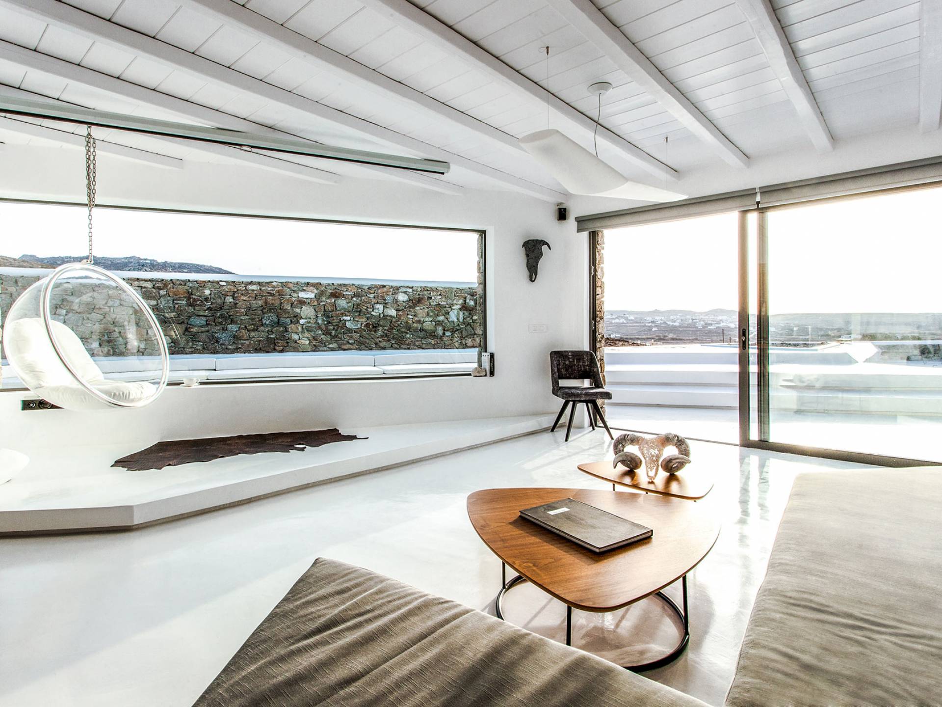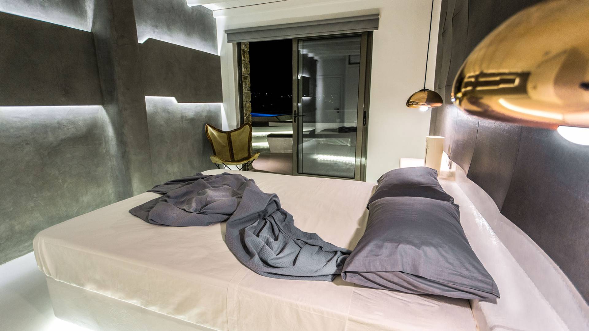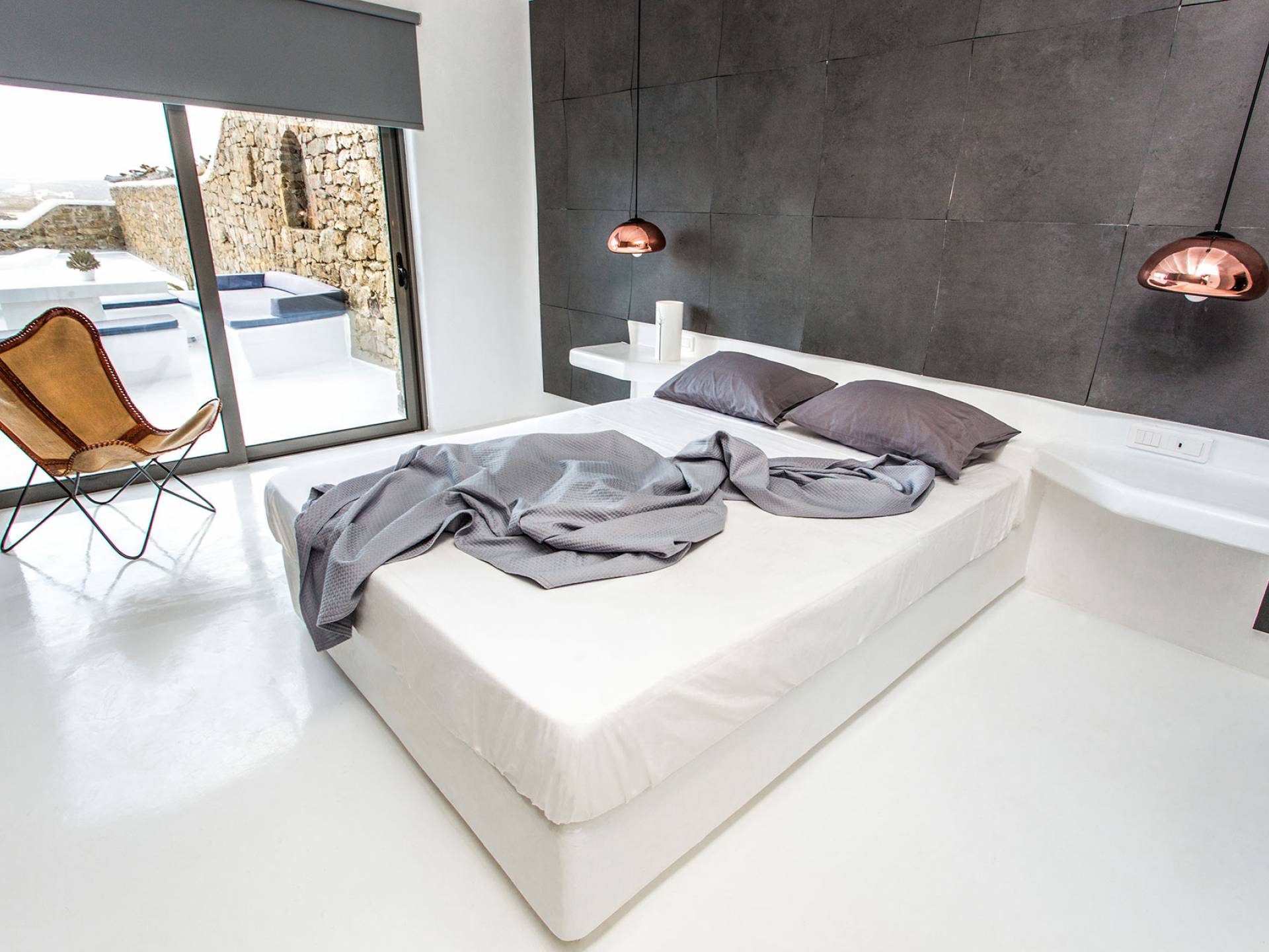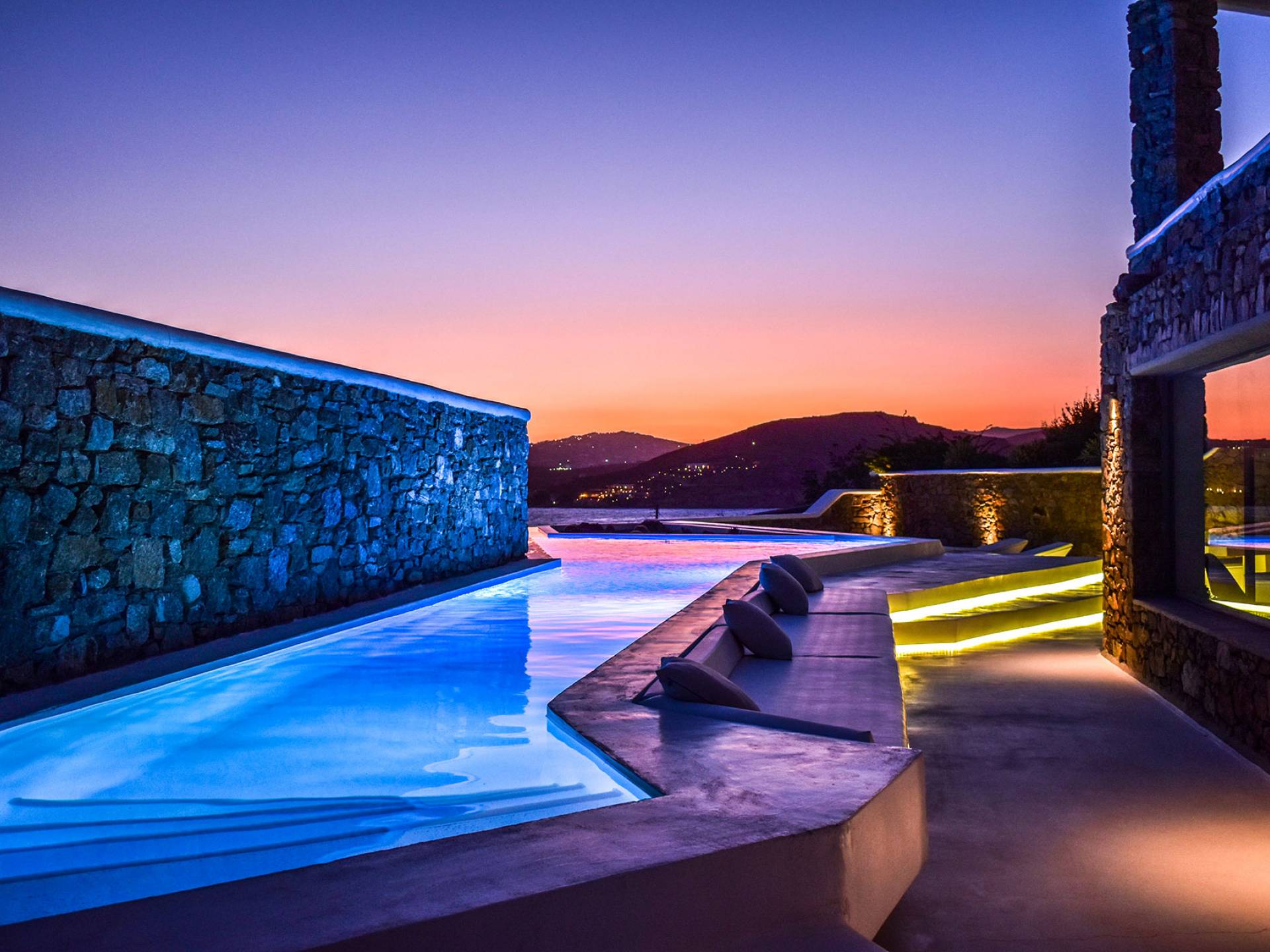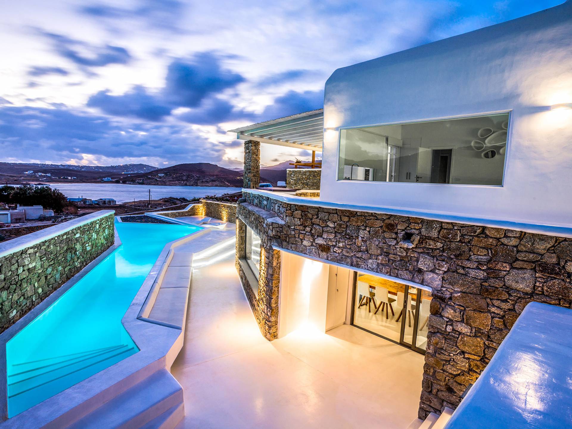 La tecnología fluye sutilmente a través de la villa. La sala de estar cuenta con un impresionante cine en casa con un proyector de alta definición, reproductor multimedia Bluetooth Blueray y Apple TV que le permite transmitir contenido sin problemas desde cualquier dispositivo. La misma potencia se puede encontrar en el dormitorio principal del nivel superior. Los 4 dormitorios tienen aire acondicionado, ofrecen vistas panorámicas sin obstáculos al mar oa la montaña, y tienen acceso directo a la piscina y a las terrazas y el patio del nivel superior. Un dormitorio principal cuenta con un baño en suite accesible para sillas de ruedas con rieles de apoyo para inodoro y ducha, mientras que el otro cuenta con una bañera junto a las ventanas panorámicas del piso al techo, ideal para olvidarse de sus problemas. Pase las tardes relajándose en los salones de la terraza y contemple el horizonte con asombro mientras se desarrolla la majestuosa puesta de sol de Myconian. Por la noche, las numerosas opciones de iluminación, incluida la iluminación arquitectónica LED, lo ayudan a crear el ambiente adecuado. Shhhh. Deje que el sonido de las olas lo calme mientras se aleja lentamente en la comodidad de su cama y sueña con los días sin preocupaciones por venir.