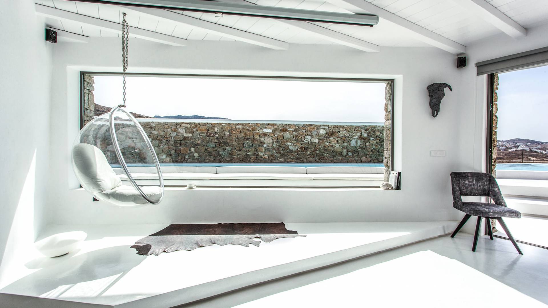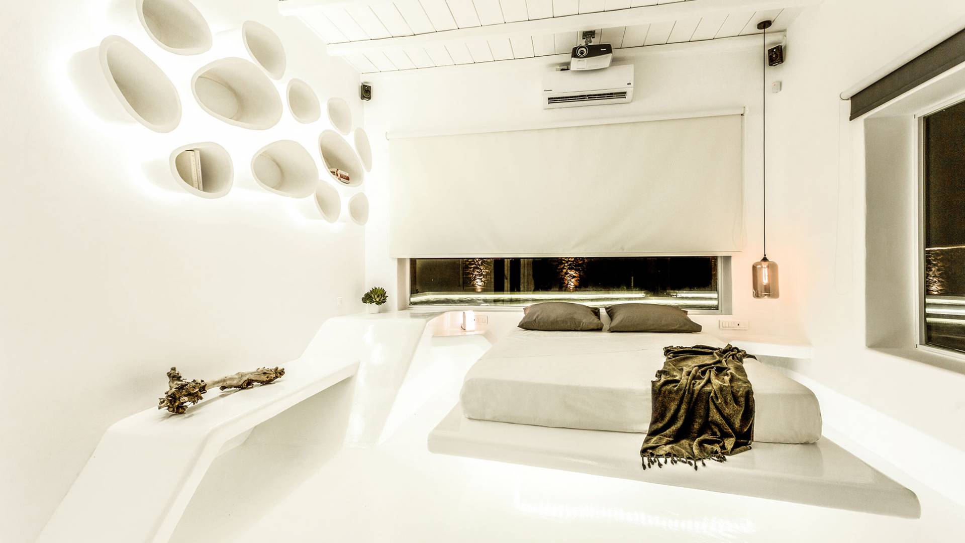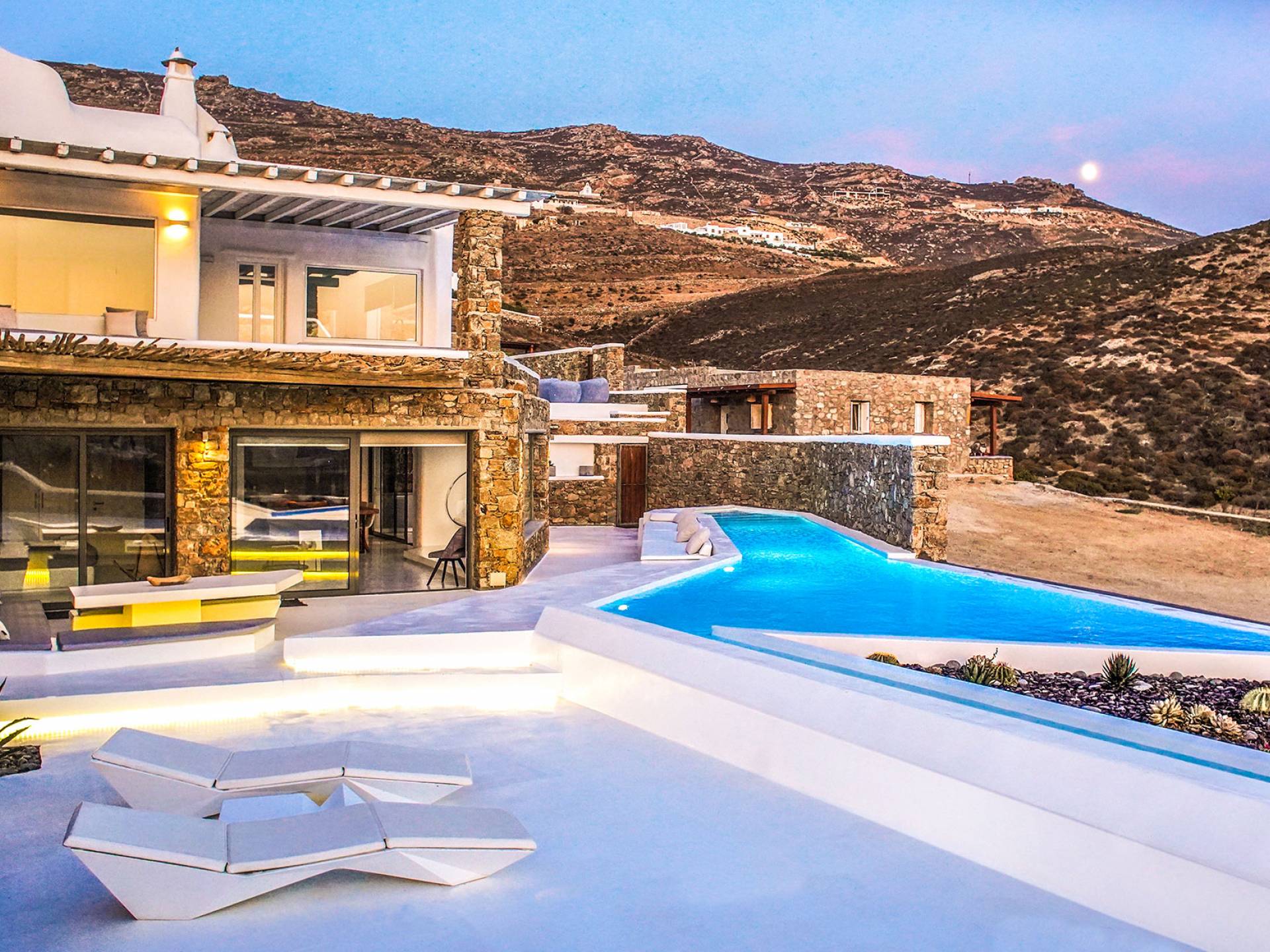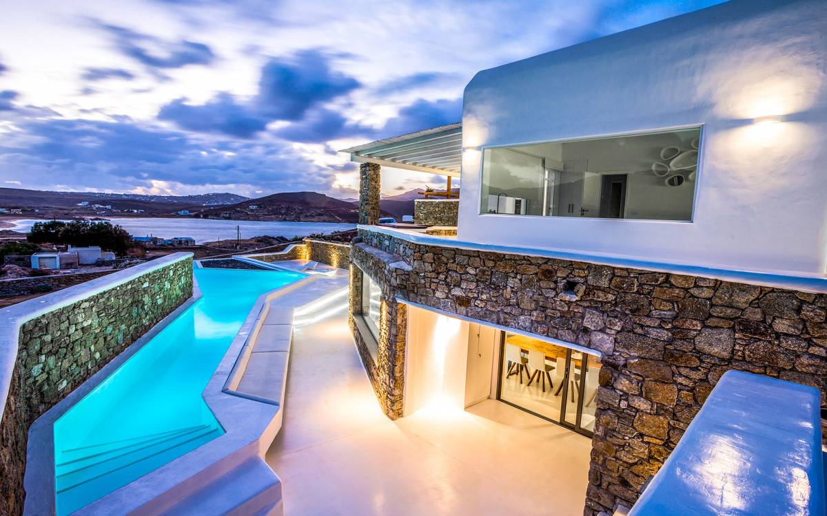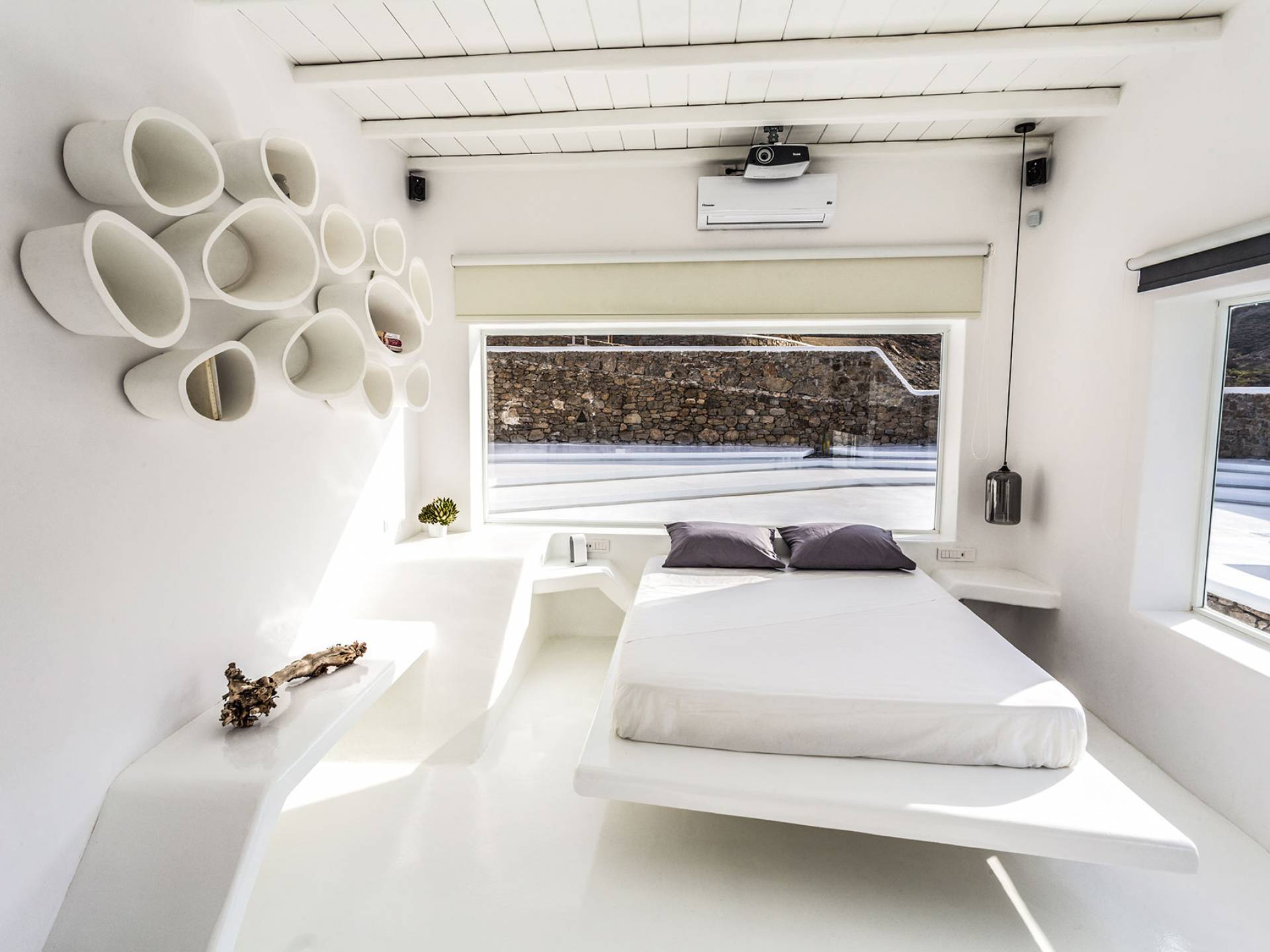 La tecnología fluye sutilmente a través de la villa. La sala de estar cuenta con un impresionante cine en casa con un proyector de alta definición, reproductor multimedia Bluetooth Blueray y Apple TV que le permite transmitir contenido sin problemas desde cualquier dispositivo. La misma potencia se puede encontrar en el dormitorio principal del nivel superior. Los 4 dormitorios tienen aire acondicionado, ofrecen vistas panorámicas sin obstáculos al mar oa la montaña, y tienen acceso directo a la piscina y a las terrazas y el patio del nivel superior. Un dormitorio principal cuenta con un baño en suite accesible para sillas de ruedas con rieles de apoyo para inodoro y ducha, mientras que el otro cuenta con una bañera junto a las ventanas panorámicas del piso al techo, ideal para olvidarse de sus problemas. Pase las tardes relajándose en los salones de la terraza y contemple el horizonte con asombro mientras se desarrolla la majestuosa puesta de sol de Myconian. Por la noche, las numerosas opciones de iluminación, incluida la iluminación arquitectónica LED, lo ayudan a crear el ambiente adecuado. Shhhh. Deje que el sonido de las olas lo calme mientras se aleja lentamente en la comodidad de su cama y sueña con los días sin preocupaciones por venir.