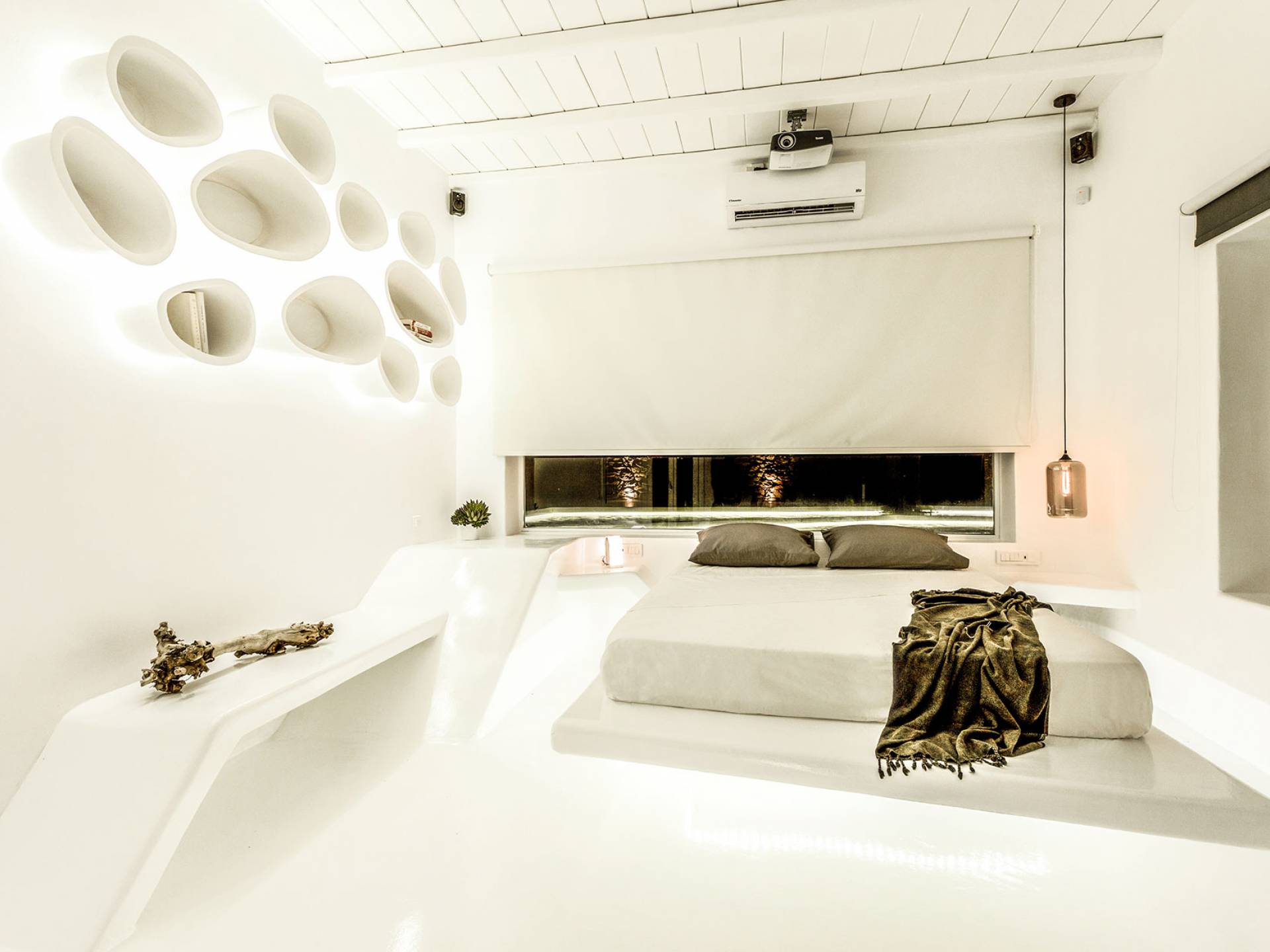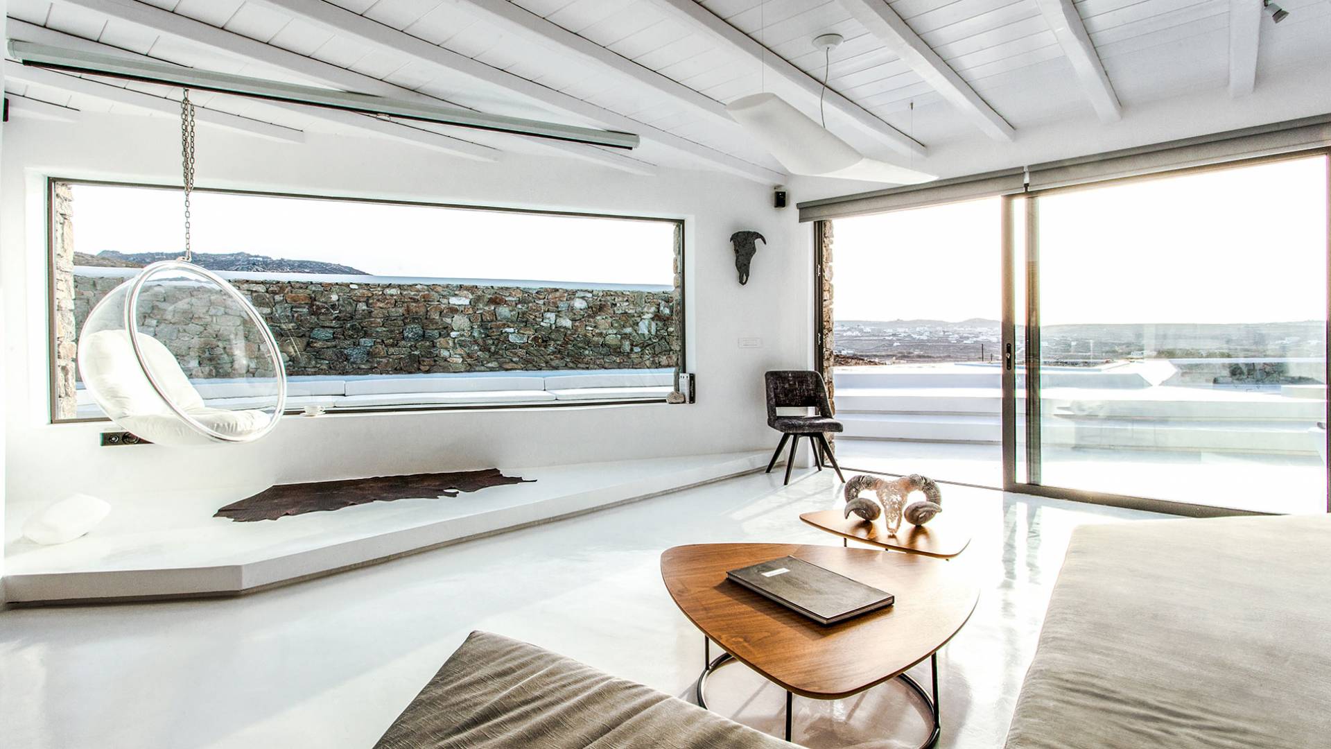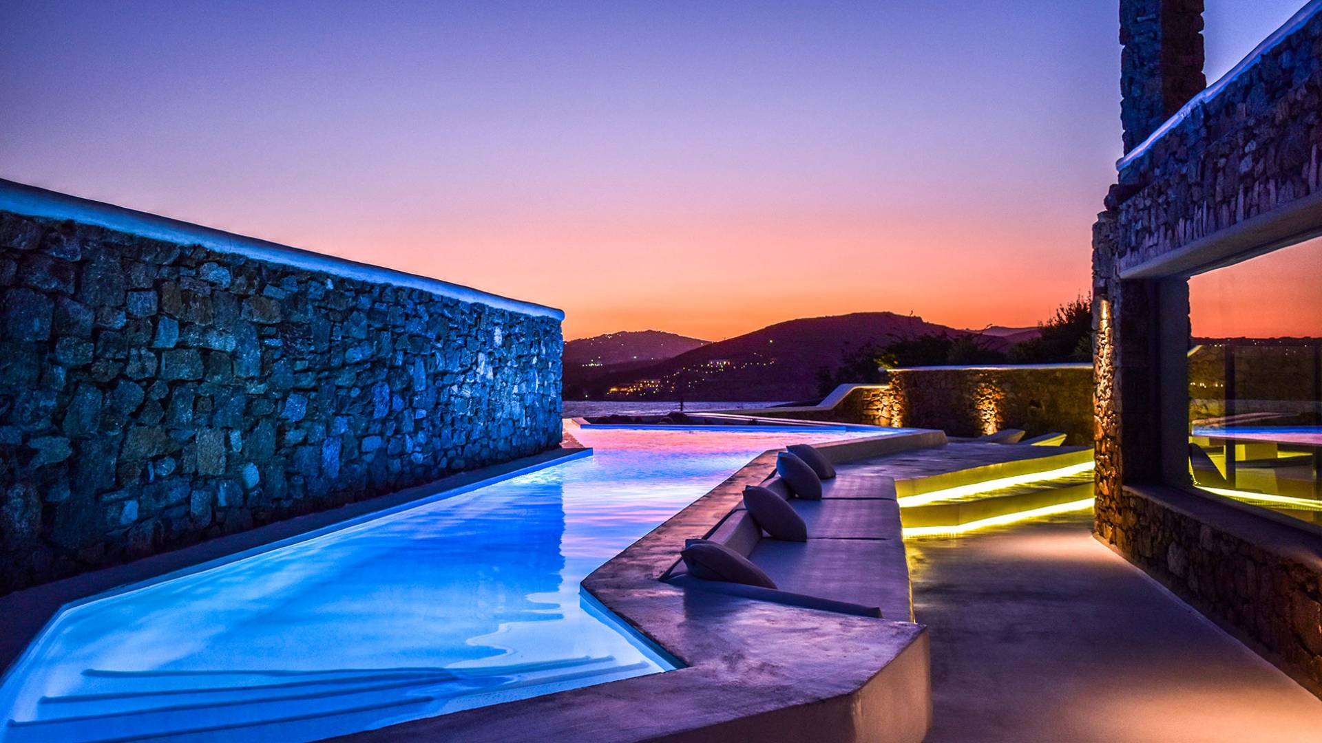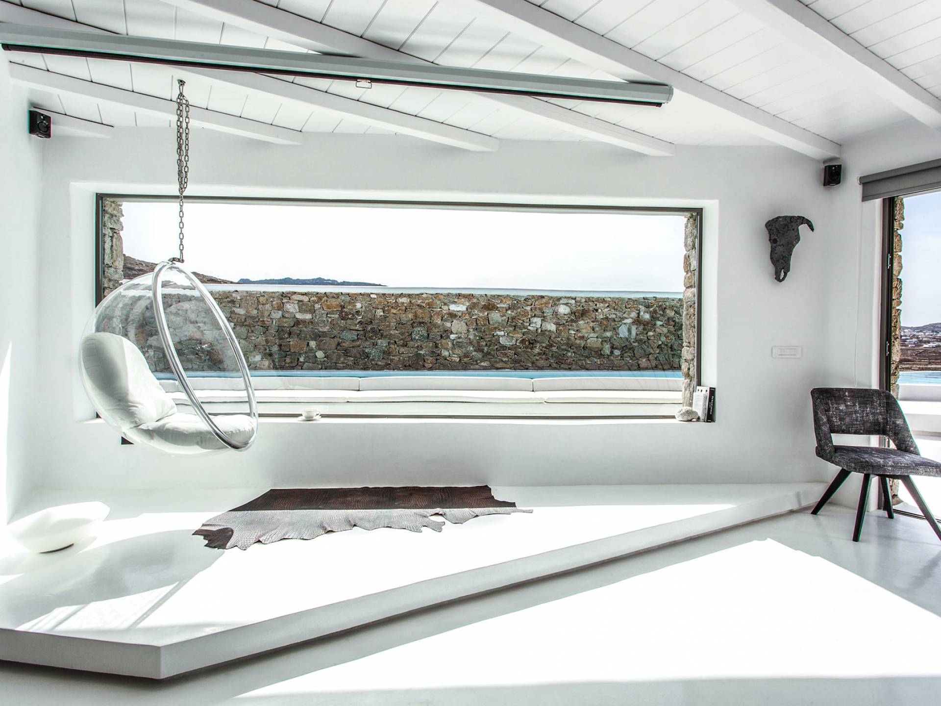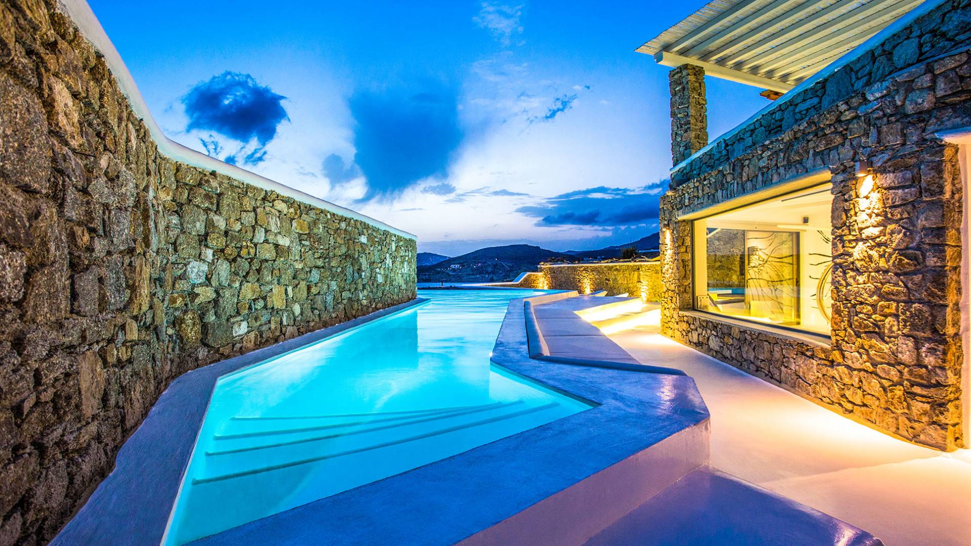 La tecnología fluye sutilmente a través de la villa. La sala de estar cuenta con un impresionante cine en casa con un proyector de alta definición, reproductor multimedia Bluetooth Blueray y Apple TV que le permite transmitir contenido sin problemas desde cualquier dispositivo. La misma potencia se puede encontrar en el dormitorio principal del nivel superior. Los 4 dormitorios tienen aire acondicionado, ofrecen vistas panorámicas sin obstáculos al mar oa la montaña, y tienen acceso directo a la piscina y a las terrazas y el patio del nivel superior. Un dormitorio principal cuenta con un baño en suite accesible para sillas de ruedas con rieles de apoyo para inodoro y ducha, mientras que el otro cuenta con una bañera junto a las ventanas panorámicas del piso al techo, ideal para olvidarse de sus problemas. Pase las tardes relajándose en los salones de la terraza y contemple el horizonte con asombro mientras se desarrolla la majestuosa puesta de sol de Myconian. Por la noche, las numerosas opciones de iluminación, incluida la iluminación arquitectónica LED, lo ayudan a crear el ambiente adecuado. Shhhh. Deje que el sonido de las olas lo calme mientras se aleja lentamente en la comodidad de su cama y sueña con los días sin preocupaciones por venir.