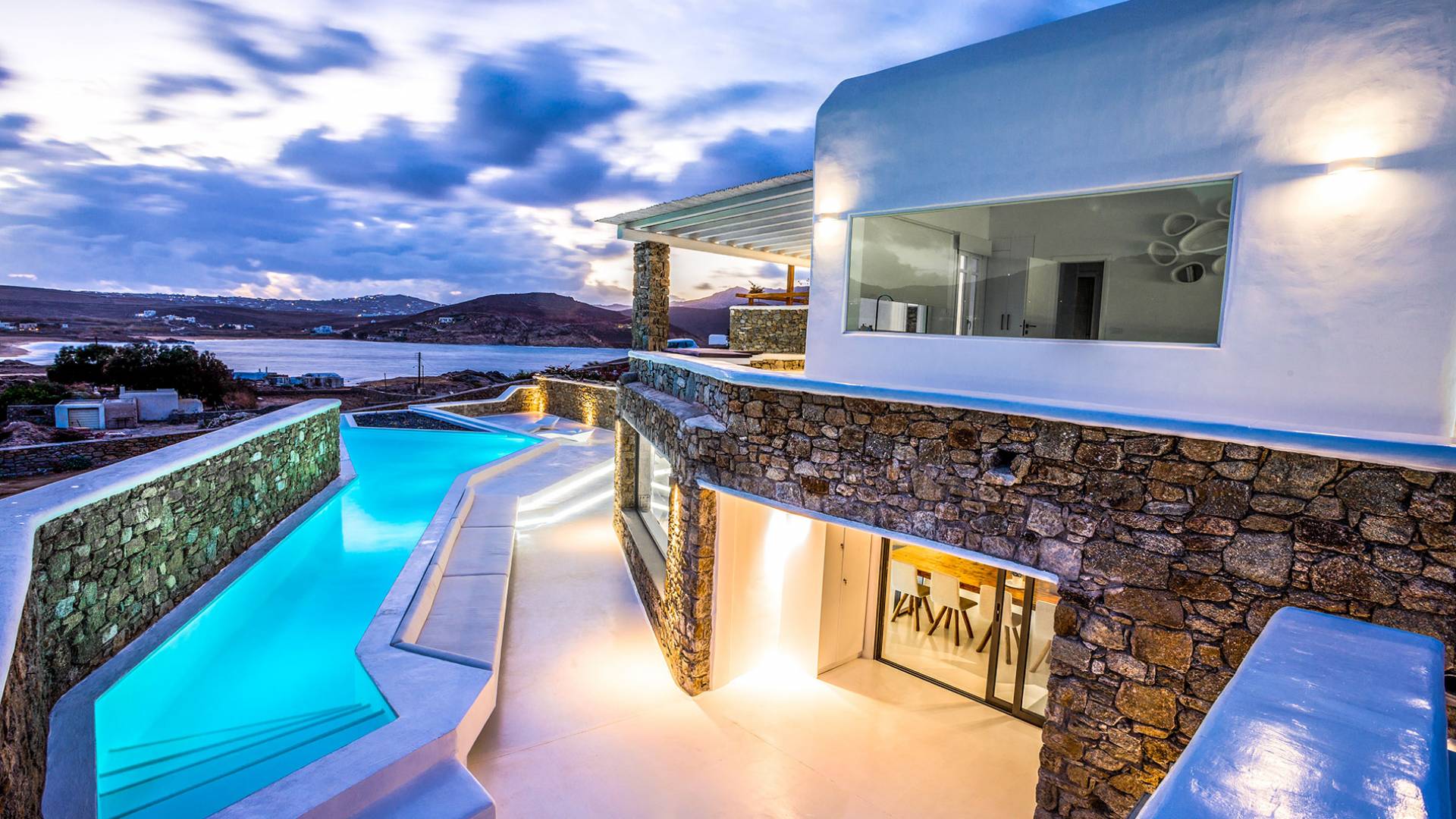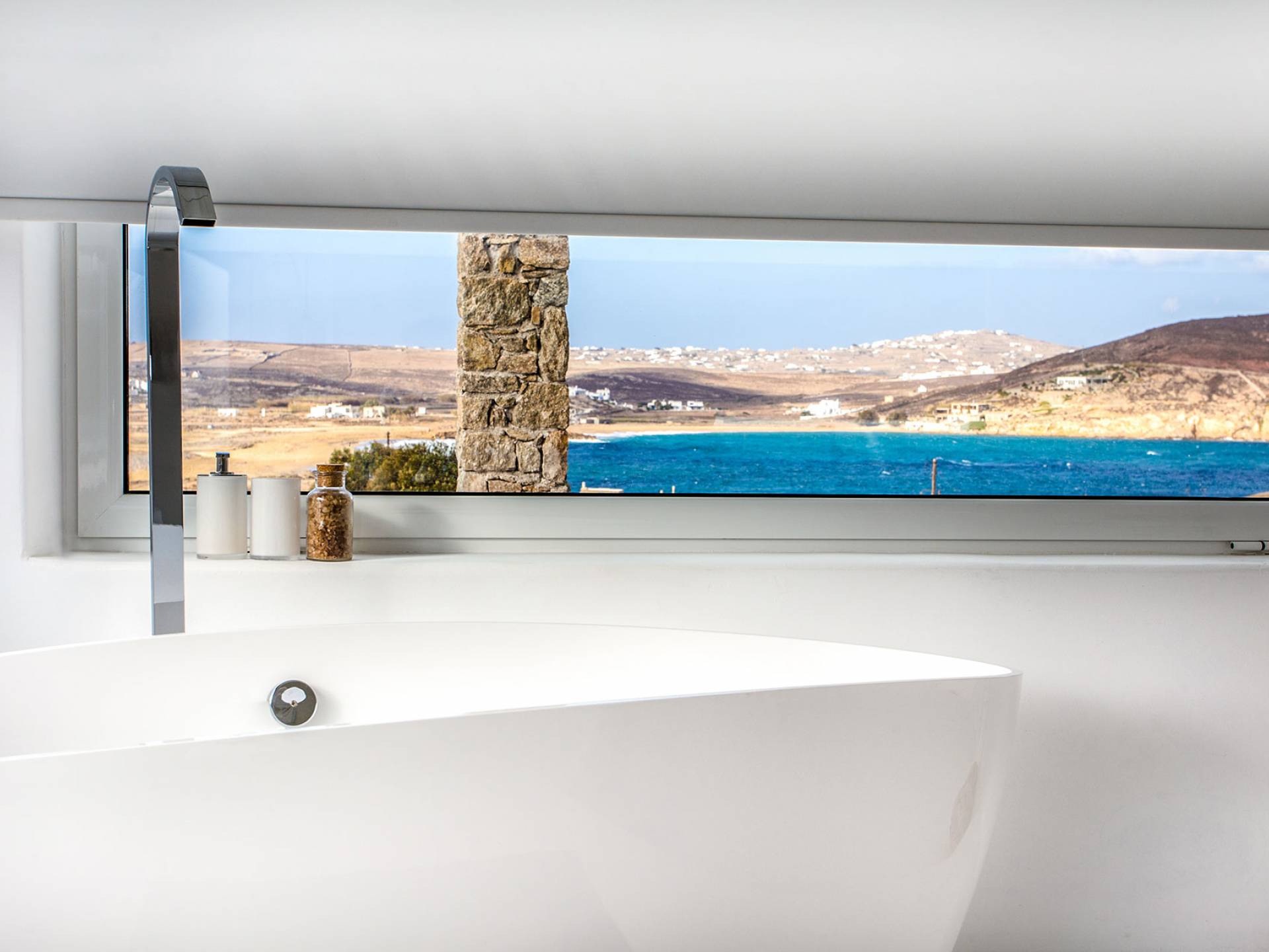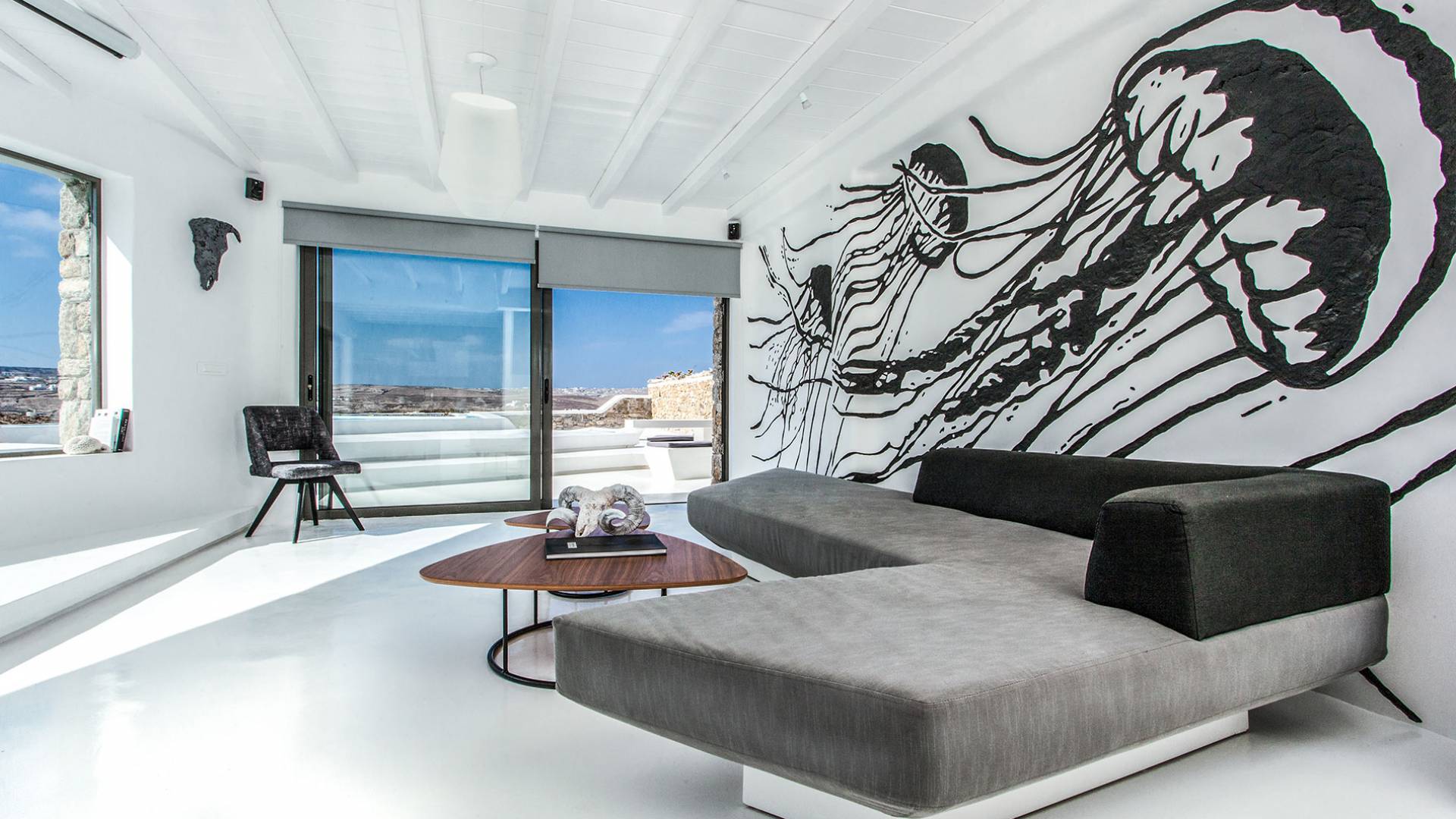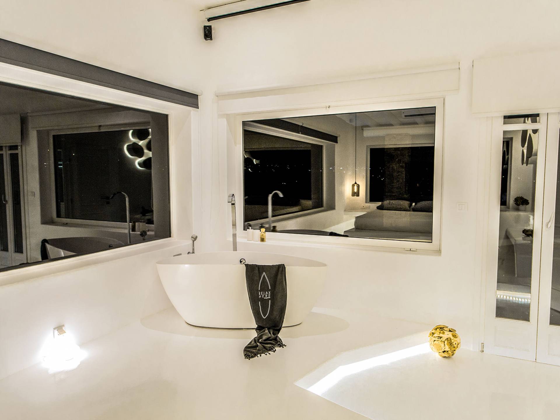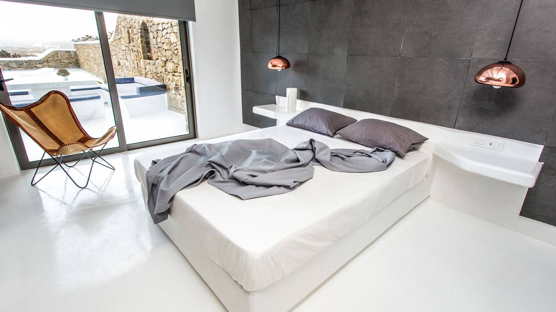 La tecnología fluye sutilmente a través de la villa. La sala de estar cuenta con un impresionante cine en casa con un proyector de alta definición, reproductor multimedia Bluetooth Blueray y Apple TV que le permite transmitir contenido sin problemas desde cualquier dispositivo. La misma potencia se puede encontrar en el dormitorio principal del nivel superior. Los 4 dormitorios tienen aire acondicionado, ofrecen vistas panorámicas sin obstáculos al mar oa la montaña, y tienen acceso directo a la piscina y a las terrazas y el patio del nivel superior. Un dormitorio principal cuenta con un baño en suite accesible para sillas de ruedas con rieles de apoyo para inodoro y ducha, mientras que el otro cuenta con una bañera junto a las ventanas panorámicas del piso al techo, ideal para olvidarse de sus problemas. Pase las tardes relajándose en los salones de la terraza y contemple el horizonte con asombro mientras se desarrolla la majestuosa puesta de sol de Myconian. Por la noche, las numerosas opciones de iluminación, incluida la iluminación arquitectónica LED, lo ayudan a crear el ambiente adecuado. Shhhh. Deje que el sonido de las olas lo calme mientras se aleja lentamente en la comodidad de su cama y sueña con los días sin preocupaciones por venir.