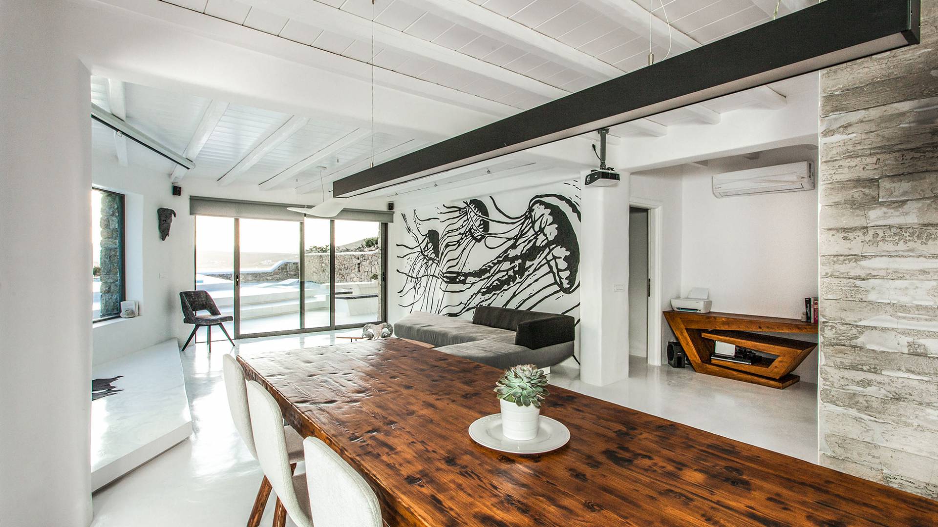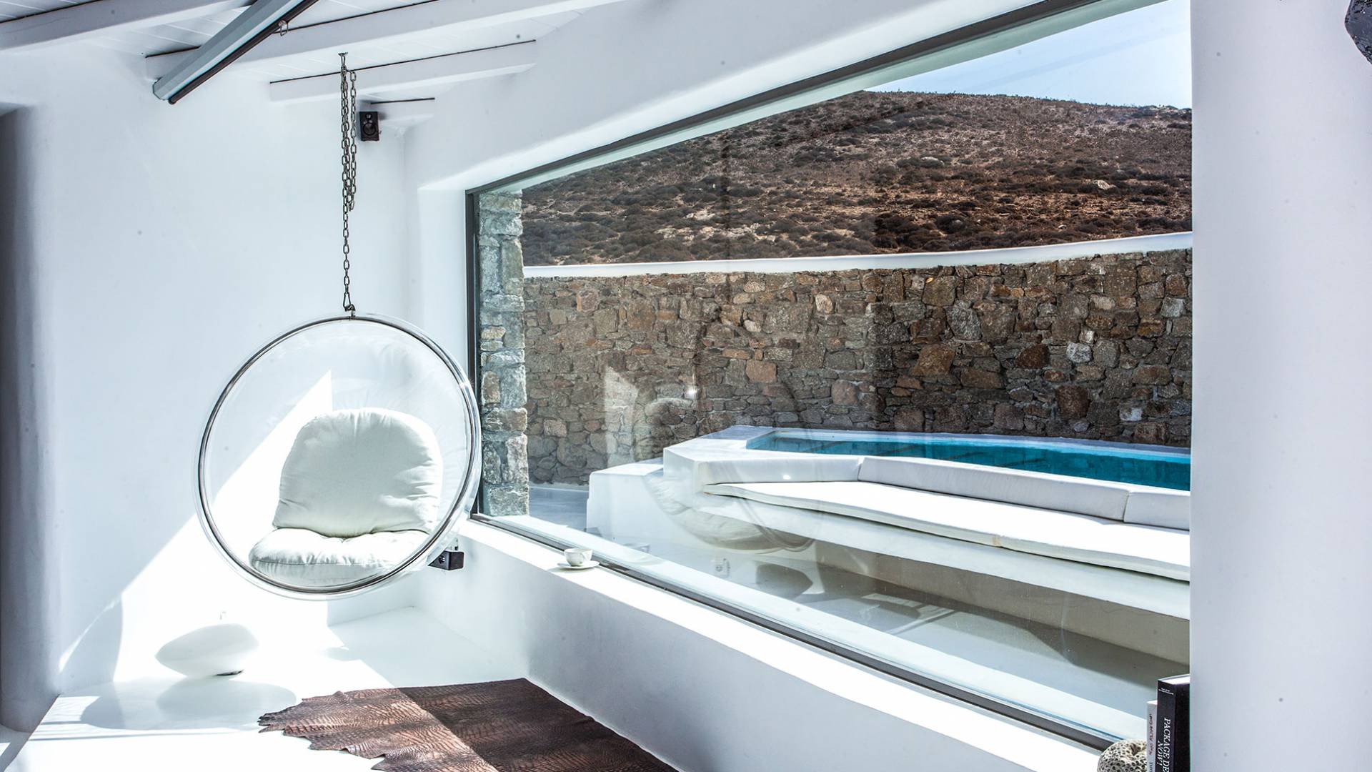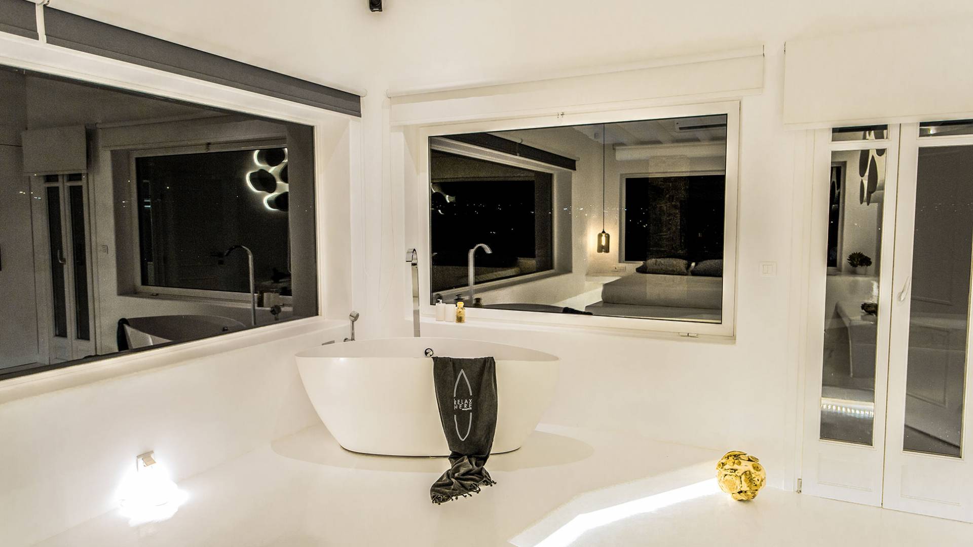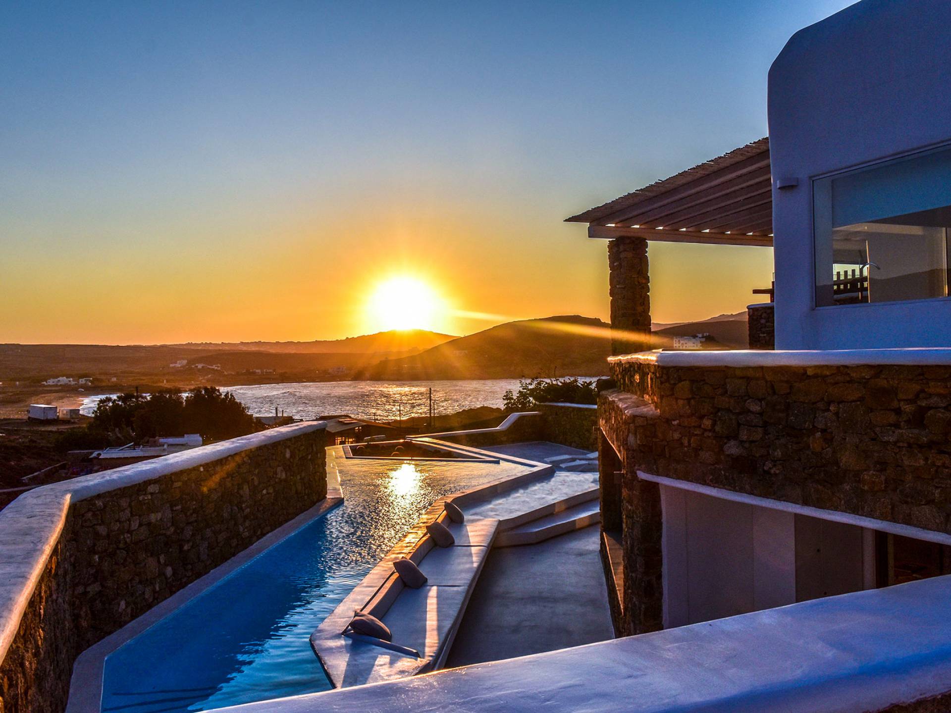 La tecnología fluye sutilmente a través de la villa. La sala de estar cuenta con un impresionante cine en casa con un proyector de alta definición, reproductor multimedia Bluetooth Blueray y Apple TV que le permite transmitir contenido sin problemas desde cualquier dispositivo. La misma potencia se puede encontrar en el dormitorio principal del nivel superior. Los 4 dormitorios tienen aire acondicionado, ofrecen vistas panorámicas sin obstáculos al mar oa la montaña, y tienen acceso directo a la piscina y a las terrazas y el patio del nivel superior. Un dormitorio principal cuenta con un baño en suite accesible para sillas de ruedas con rieles de apoyo para inodoro y ducha, mientras que el otro cuenta con una bañera junto a las ventanas panorámicas del piso al techo, ideal para olvidarse de sus problemas. Pase las tardes relajándose en los salones de la terraza y contemple el horizonte con asombro mientras se desarrolla la majestuosa puesta de sol de Myconian. Por la noche, las numerosas opciones de iluminación, incluida la iluminación arquitectónica LED, lo ayudan a crear el ambiente adecuado. Shhhh. Deje que el sonido de las olas lo calme mientras se aleja lentamente en la comodidad de su cama y sueña con los días sin preocupaciones por venir.