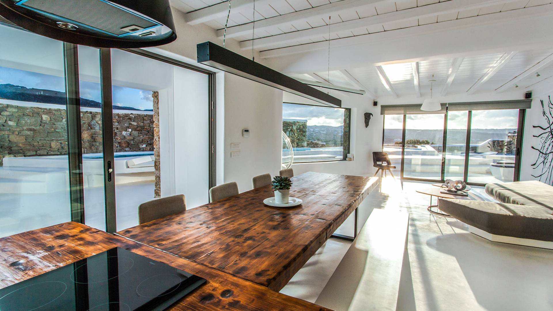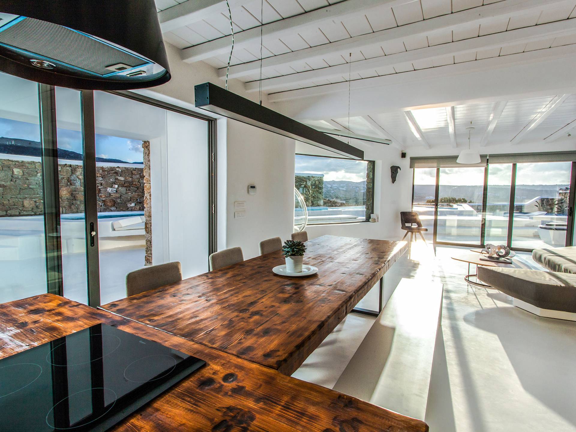 En el interior, la espaciosa y elegante sala de estar de planta abierta está adornada con muebles hechos a medida cuidadosamente seleccionados y una llamativa escultura en la pared. Las ventanas del piso al techo crean un ambiente luminoso mientras le recuerdan constantemente el impresionante entorno frente al mar. Relájese en la comodidad del sofá mientras la brisa fresca sopla desde la piscina o disfrute de una comida copiosa junto a la mesa de comedor de madera. La cocina gourmet con electrodomésticos integrados de alta gama, diseño ergonómico y encimeras lisas hacen que cocinar sea un verdadero placer.