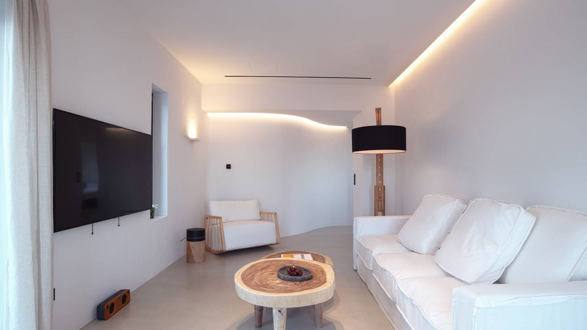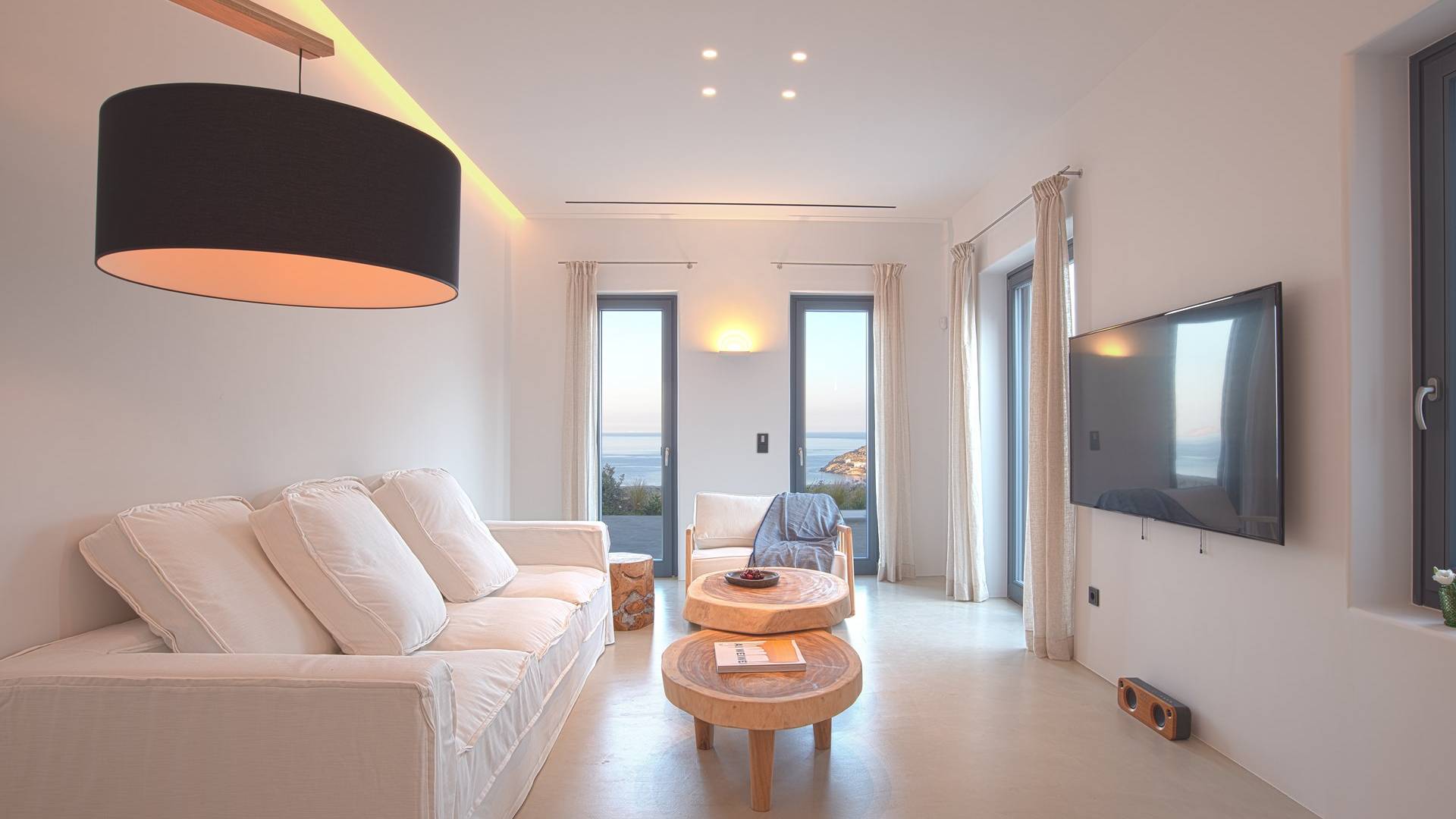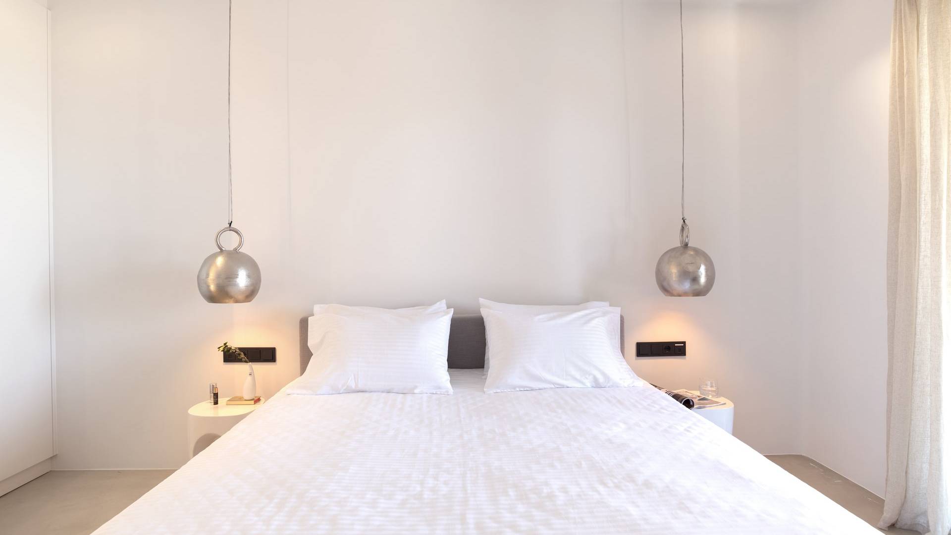 La ultrachic Villa Aqua Marine tiene una estética minimalista que requiere franjas de espacio vacío y una paleta de blanco sobre blanco, a veces interrumpida por tonos oscuros que resaltan aún más la ausencia de color. Se utilizan algunos detalles en madera y mimbre para añadir calidez a las estancias y transmitir una sensación natural. El resultado es un paquete de espacios maravillosamente libres de desorden que tienen un efecto calmante inmediato tanto en la vista como en el alma. En toda la casa, las ventanas altas y las puertas de vidrio capturan el paisaje e invitan a la luz del sol.