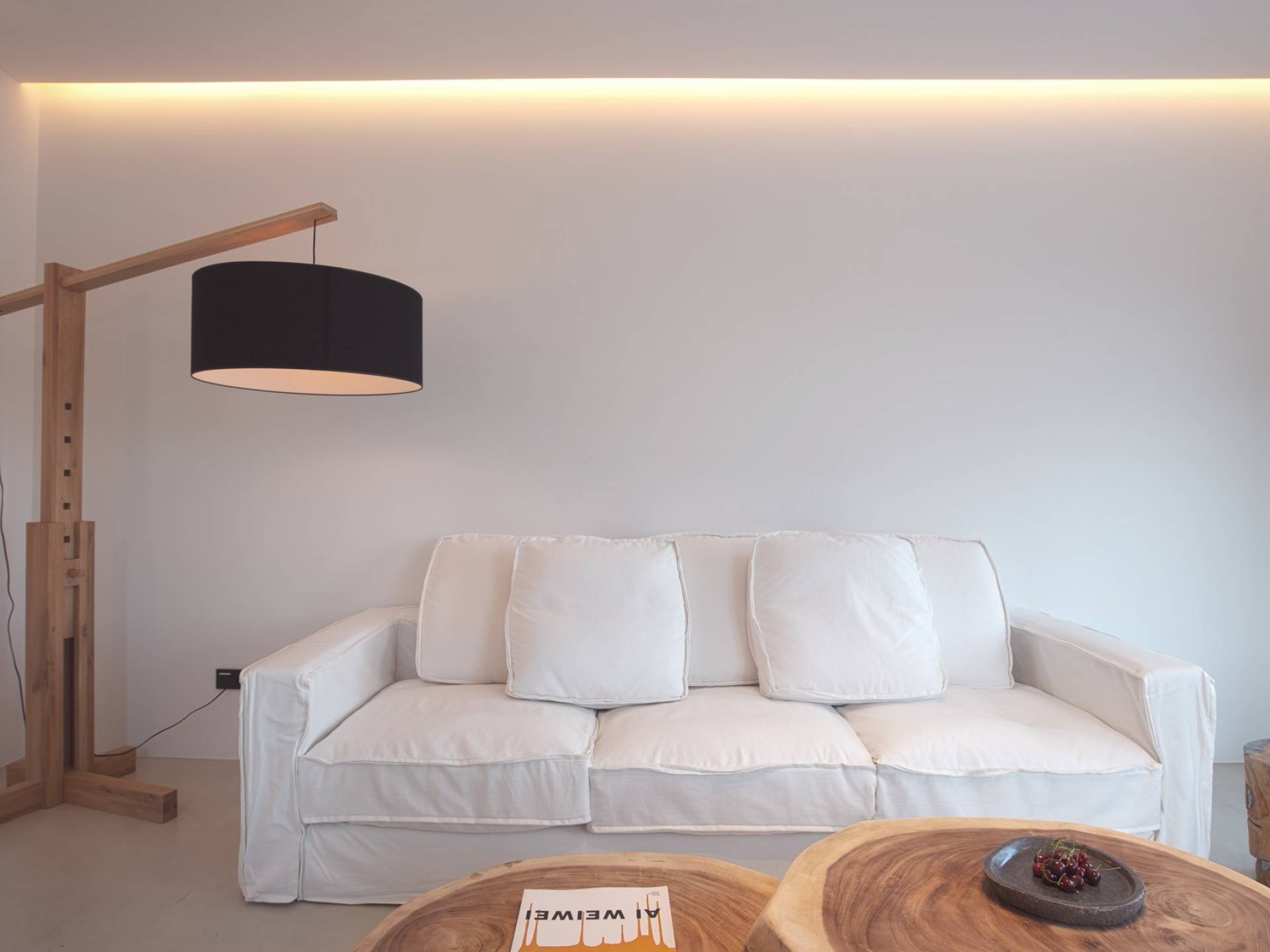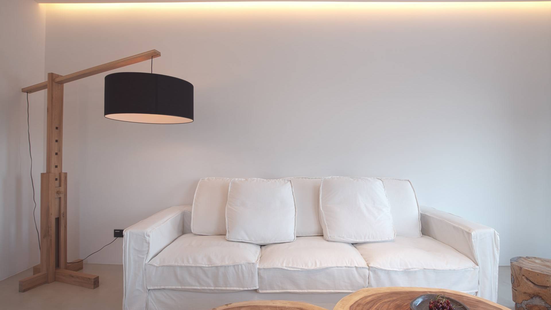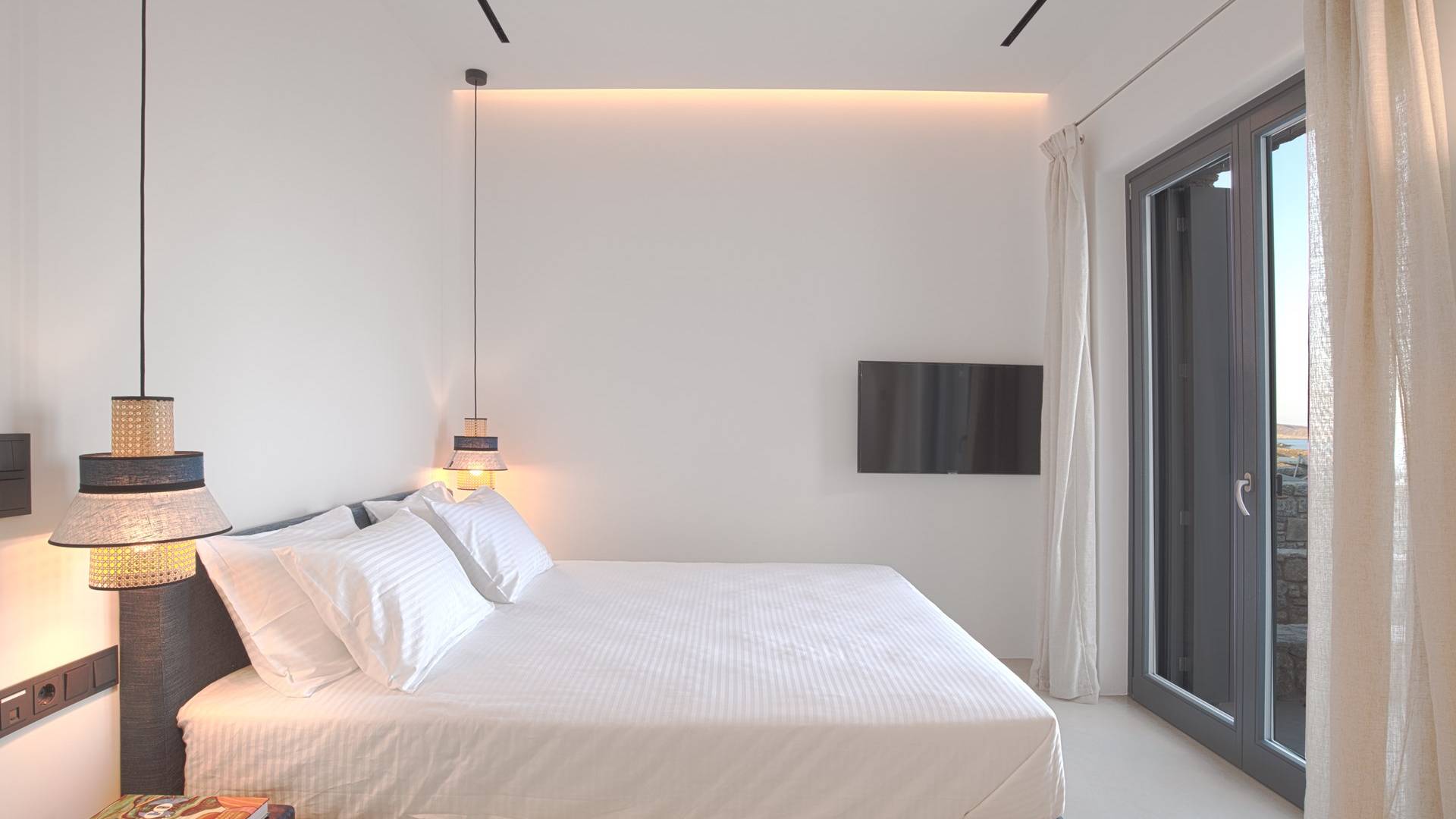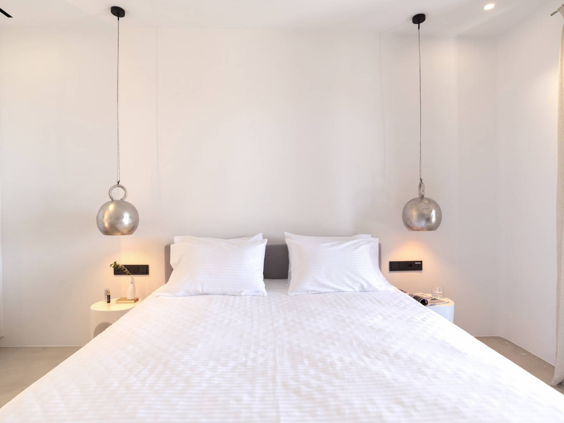 La ultrachic Villa Aqua Marine tiene una estética minimalista que requiere franjas de espacio vacío y una paleta de blanco sobre blanco, a veces interrumpida por tonos oscuros que resaltan aún más la ausencia de color. Se utilizan algunos detalles en madera y mimbre para añadir calidez a las estancias y transmitir una sensación natural. El resultado es un paquete de espacios maravillosamente libres de desorden que tienen un efecto calmante inmediato tanto en la vista como en el alma. En toda la casa, las ventanas altas y las puertas de vidrio capturan el paisaje e invitan a la luz del sol.