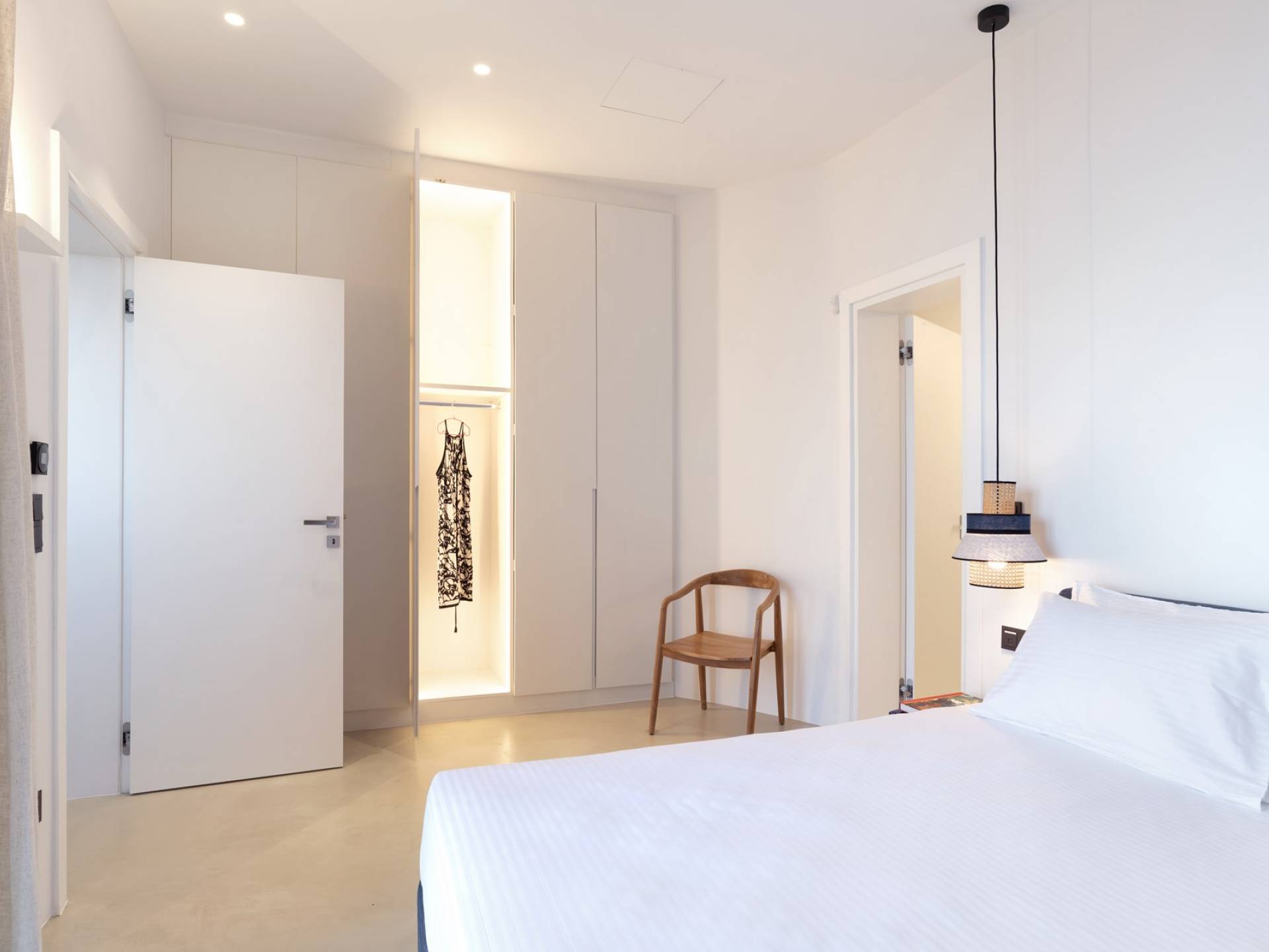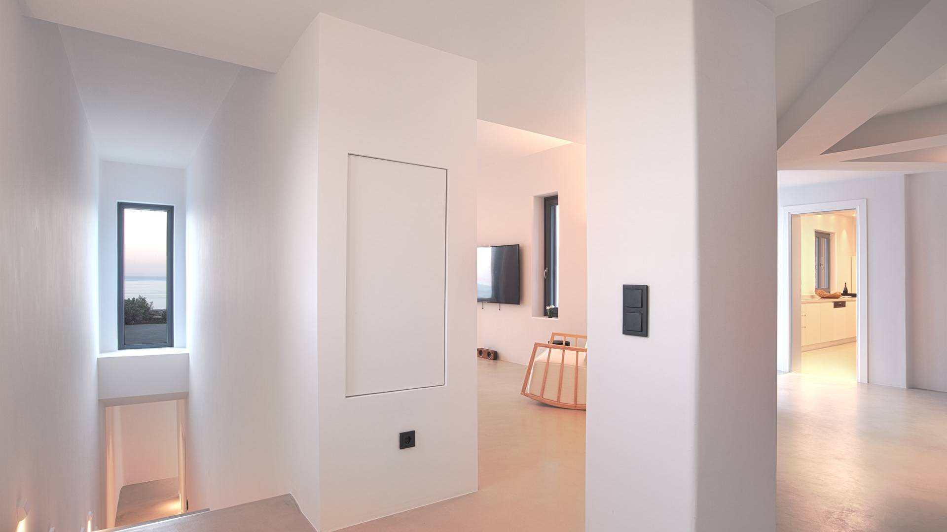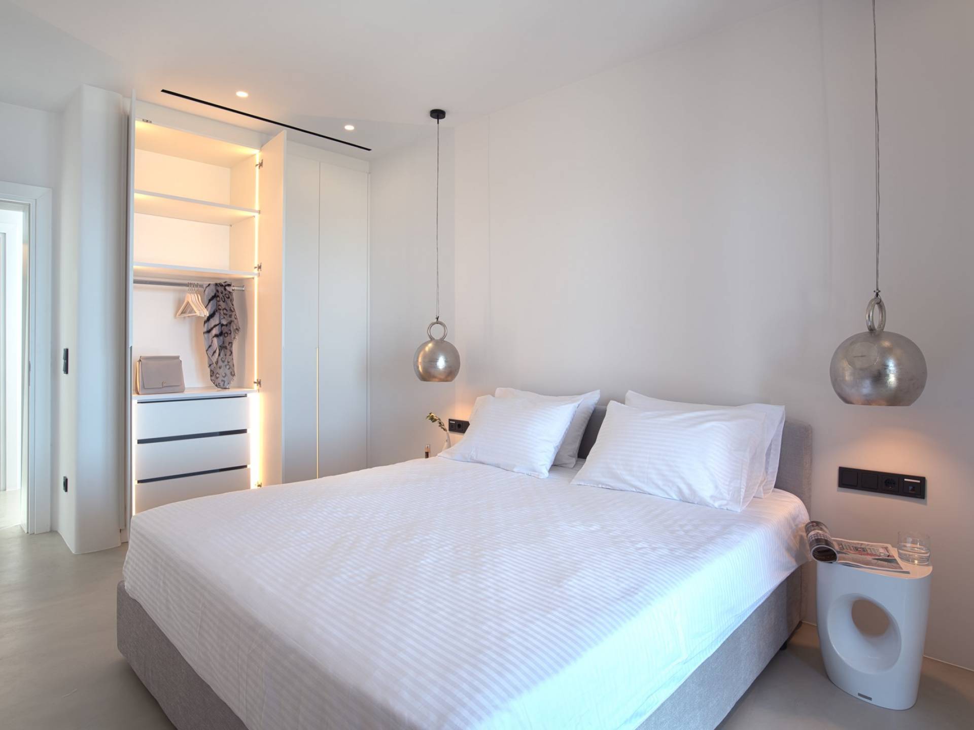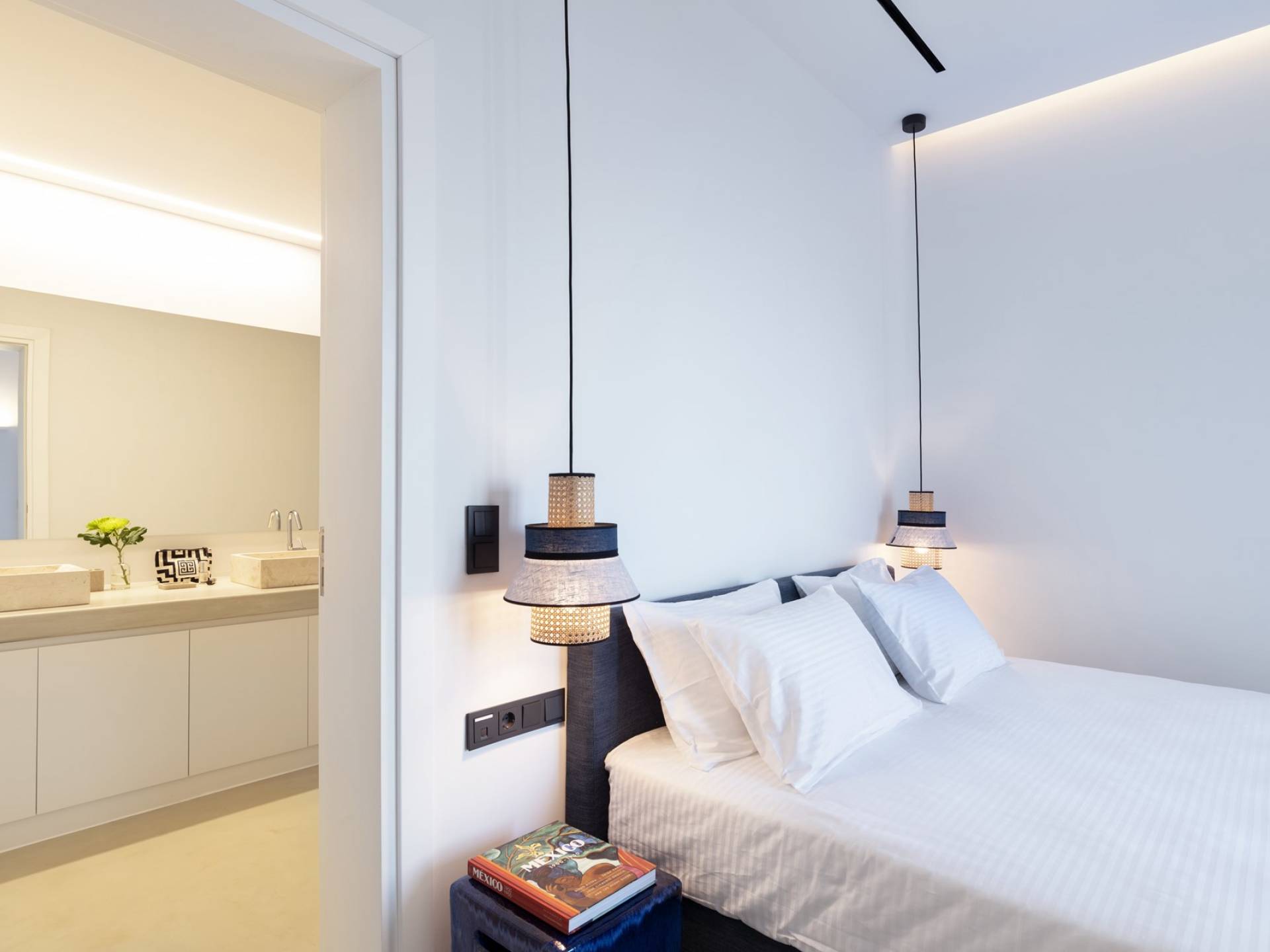 La iluminación oculta se usa para establecer el ambiente después de que se pone el sol. La sala de estar está equipada con piezas exclusivas cuidadosamente seleccionadas que tienen un propósito tanto funcional como decorativo. En el mismo concepto, las habitaciones están mínimamente decoradas con accesorios de iluminación llamativos y una pieza de diseñador aquí y allá para transmitir una habilidad especial para el diseño sin crear una distracción del ambiente tranquilo de la casa. Hay un dormitorio en suite en la planta baja y tres más en la planta baja, cada uno con su propio baño.