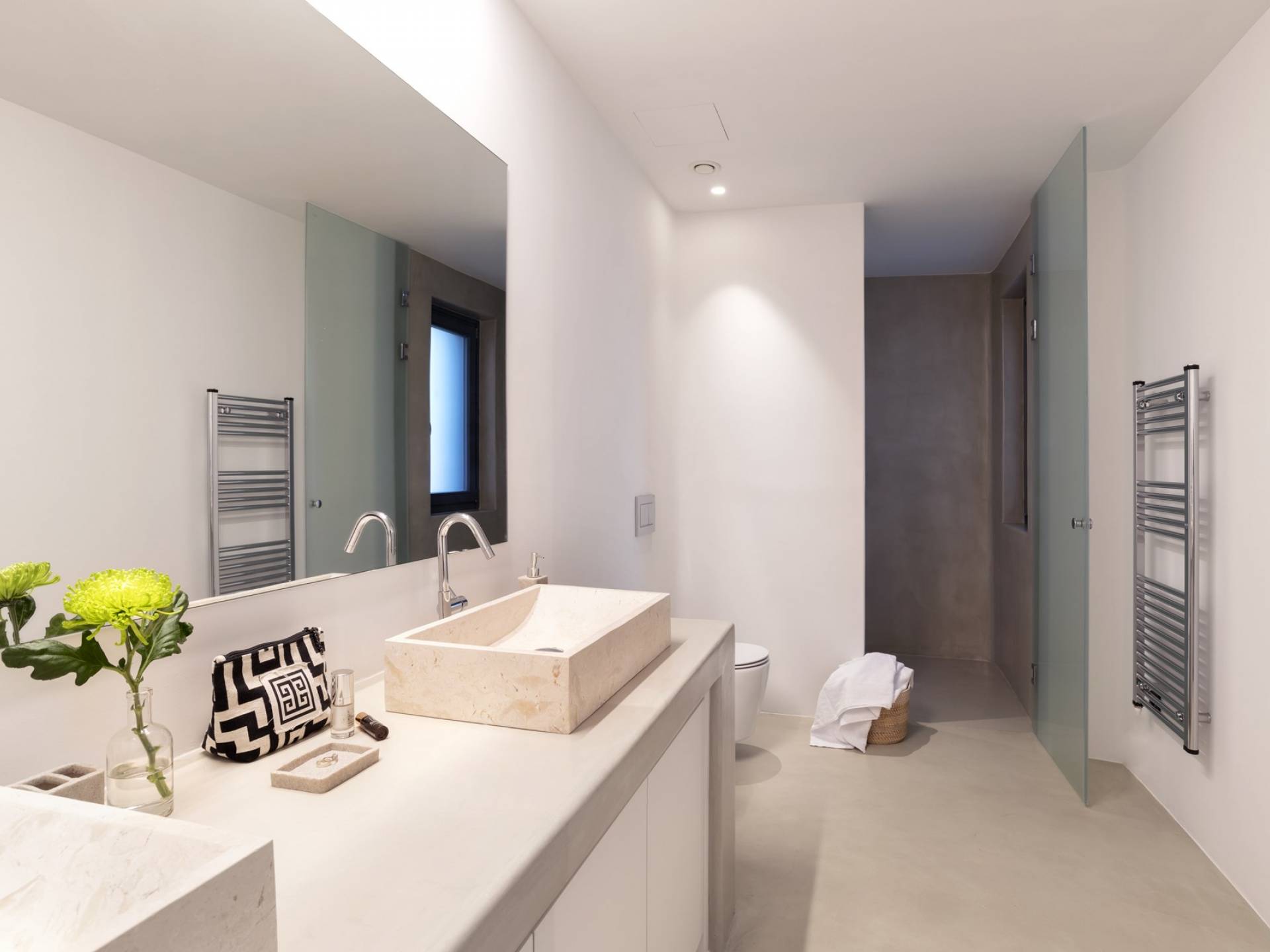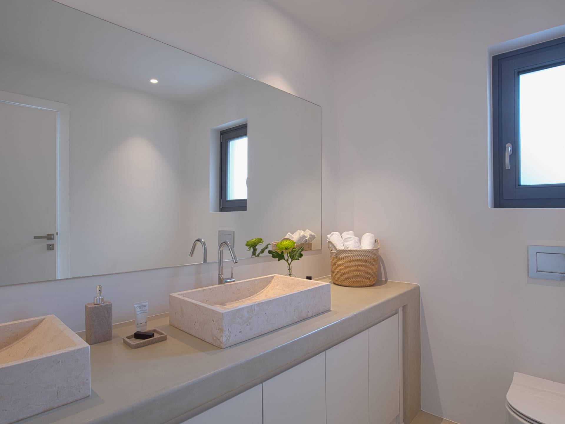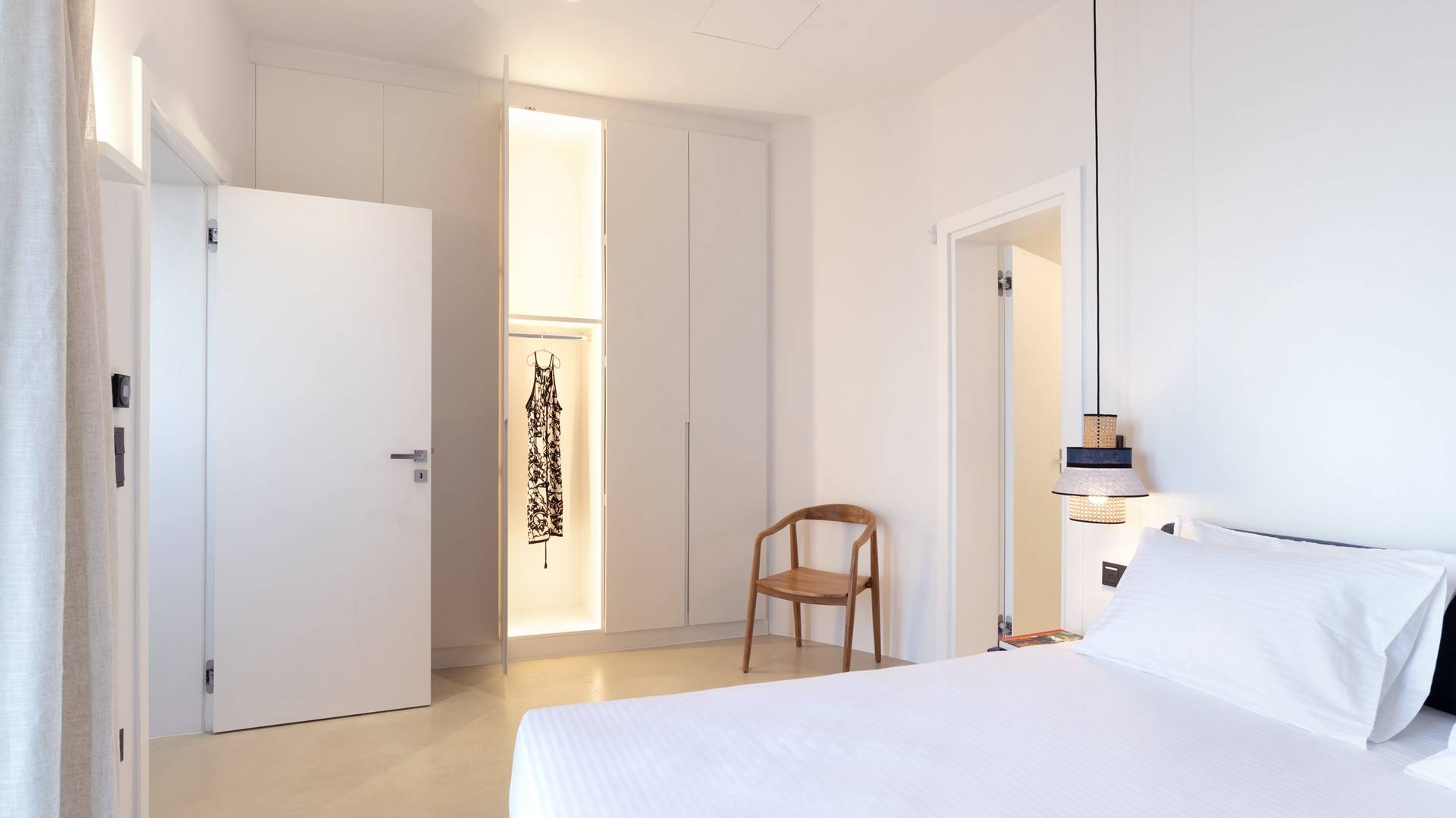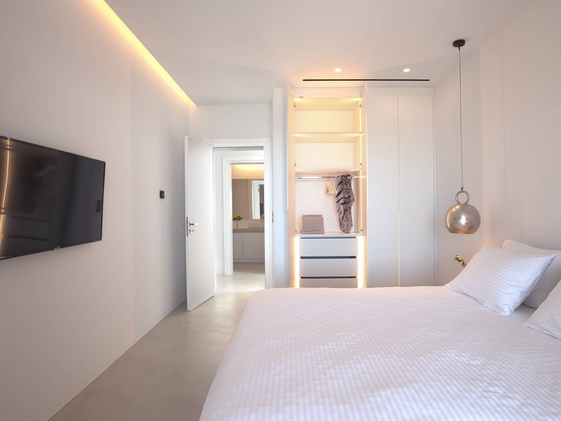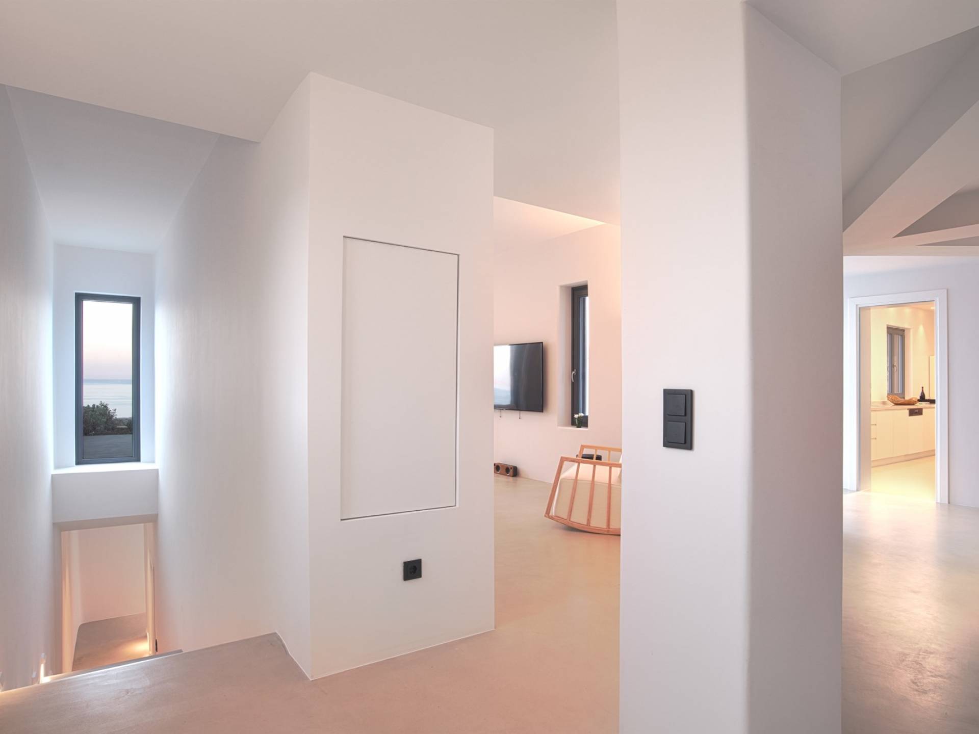 La iluminación oculta se usa para establecer el ambiente después de que se pone el sol. La sala de estar está equipada con piezas exclusivas cuidadosamente seleccionadas que tienen un propósito tanto funcional como decorativo. En el mismo concepto, las habitaciones están mínimamente decoradas con accesorios de iluminación llamativos y una pieza de diseñador aquí y allá para transmitir una habilidad especial para el diseño sin crear una distracción del ambiente tranquilo de la casa. Hay un dormitorio en suite en la planta baja y tres más en la planta baja, cada uno con su propio baño.