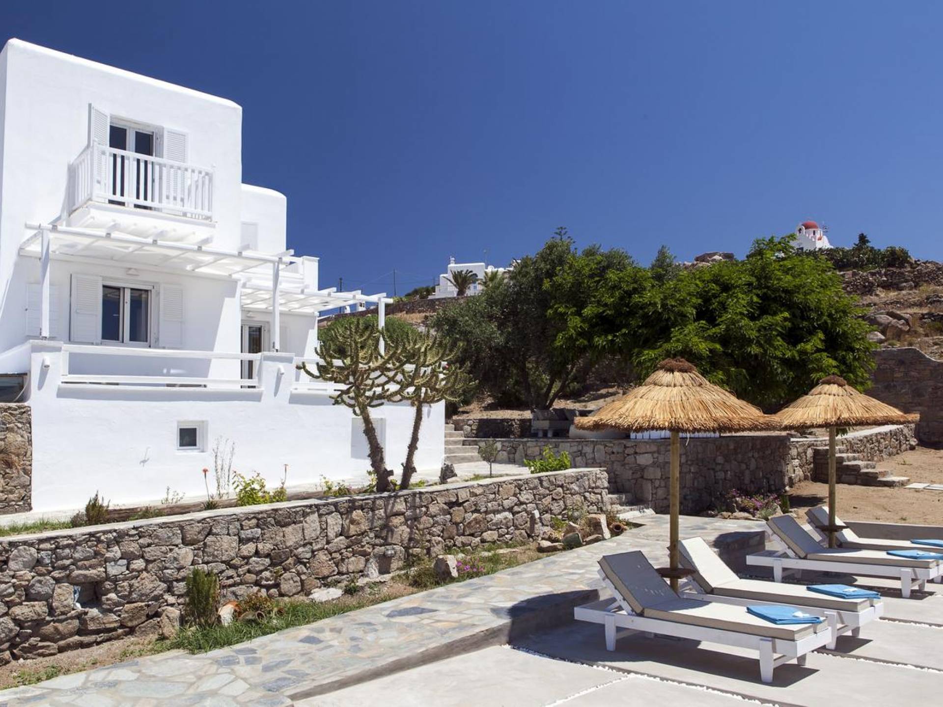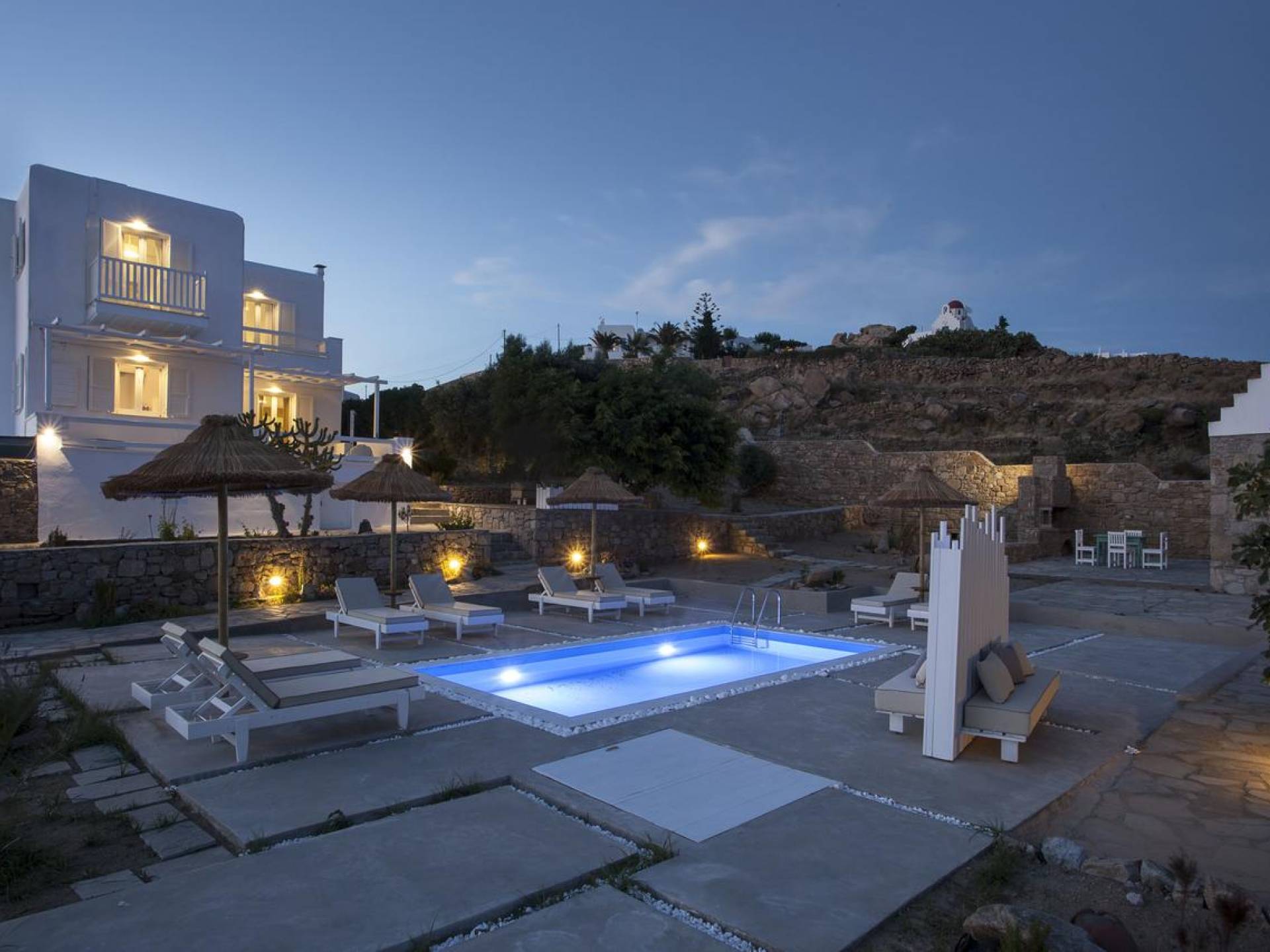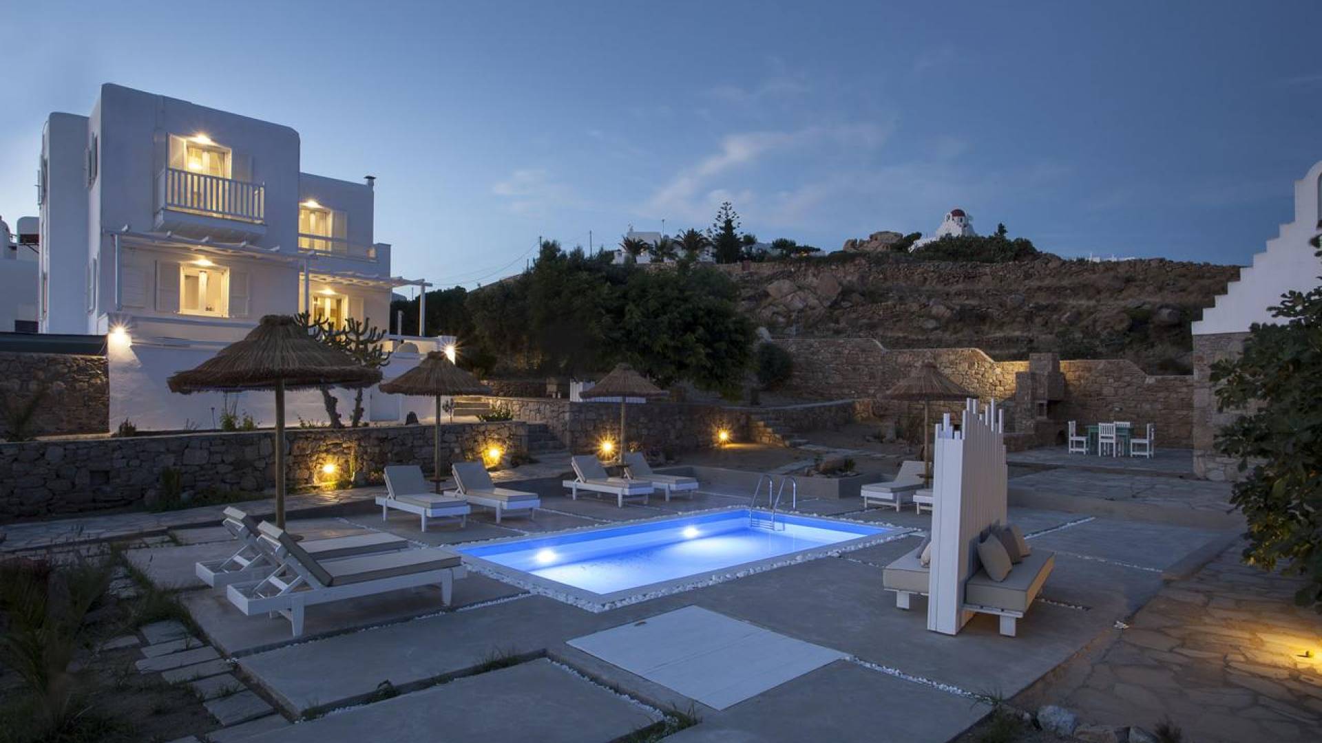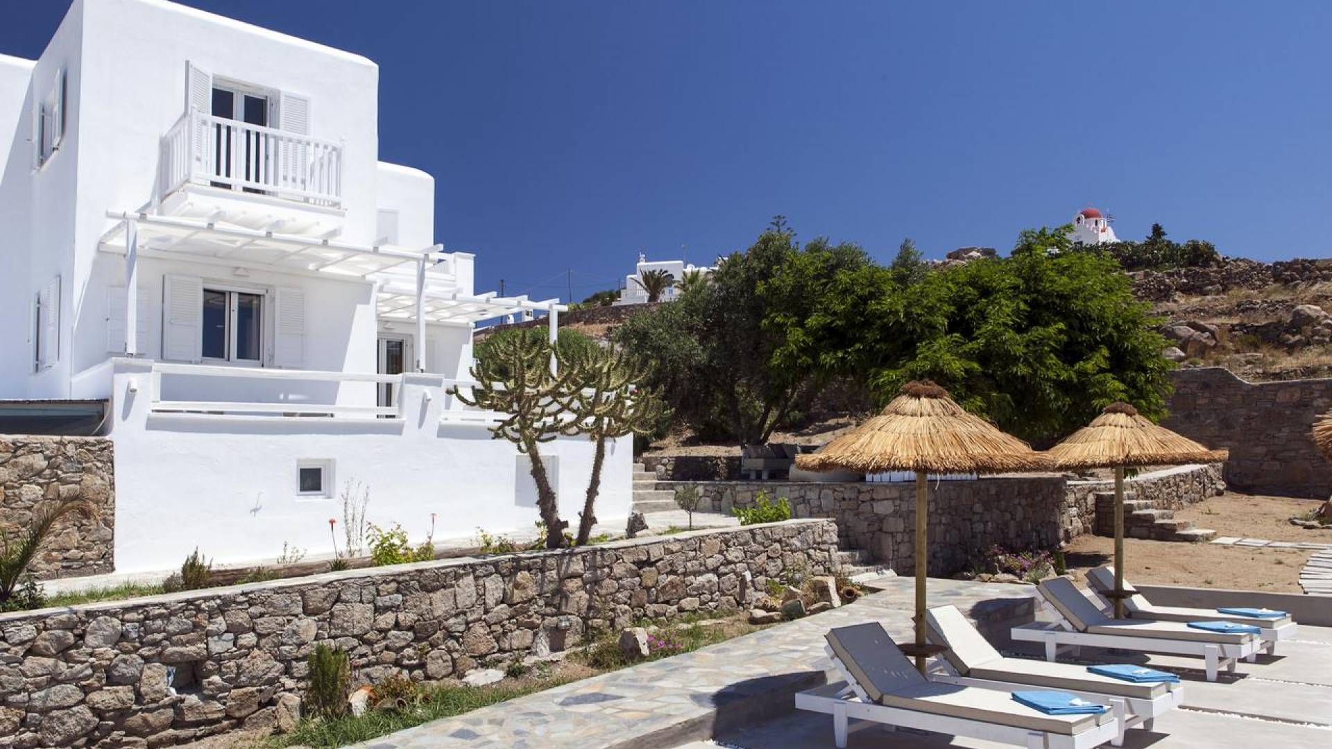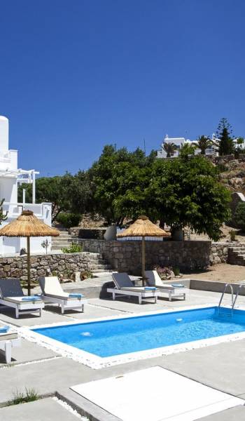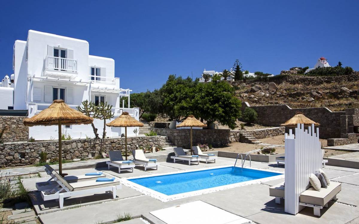 Thalassa Prive Villa Mykonos ofrece alojamiento de lujo de primer nivel en Mykonos, ideal para grupos de amigos o parejas, hasta 8 personas o 10, ya que el sofá cama del salón se convierte en una cama doble. Este alquiler de lujo es una villa privada de 2 plantas en Mykonos dividida en 4 dormitorios, 1 dormitorio en la planta baja y 3 dormitorios en el piso superior. La planta baja también ofrece una amplia cocina moderna y una sala de TV. La zona exterior incluye una piscina privada con tumbonas, una gran terraza, un jardín de rocas con zona de salón y una capilla. Se han utilizado materiales de primera calidad para construir y decorar Thalassa Prive Villa Mykonos, ha creado un ambiente de alta estética, ideal para recibir a los huéspedes más exigentes en Mykonos.