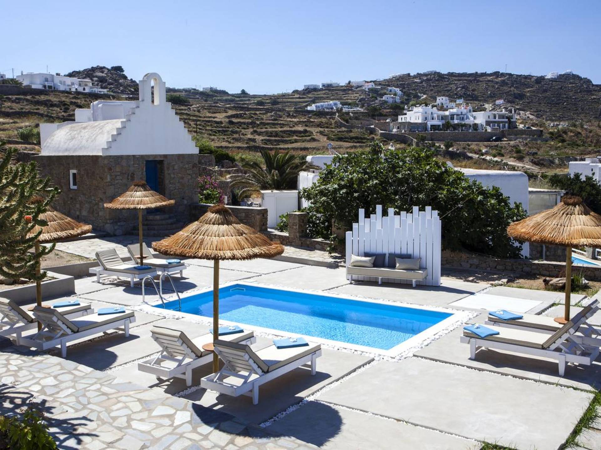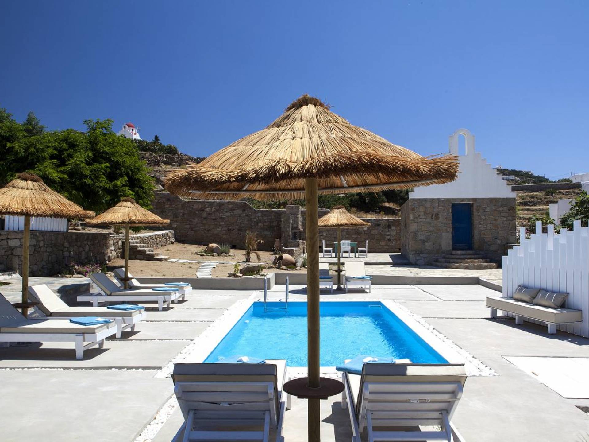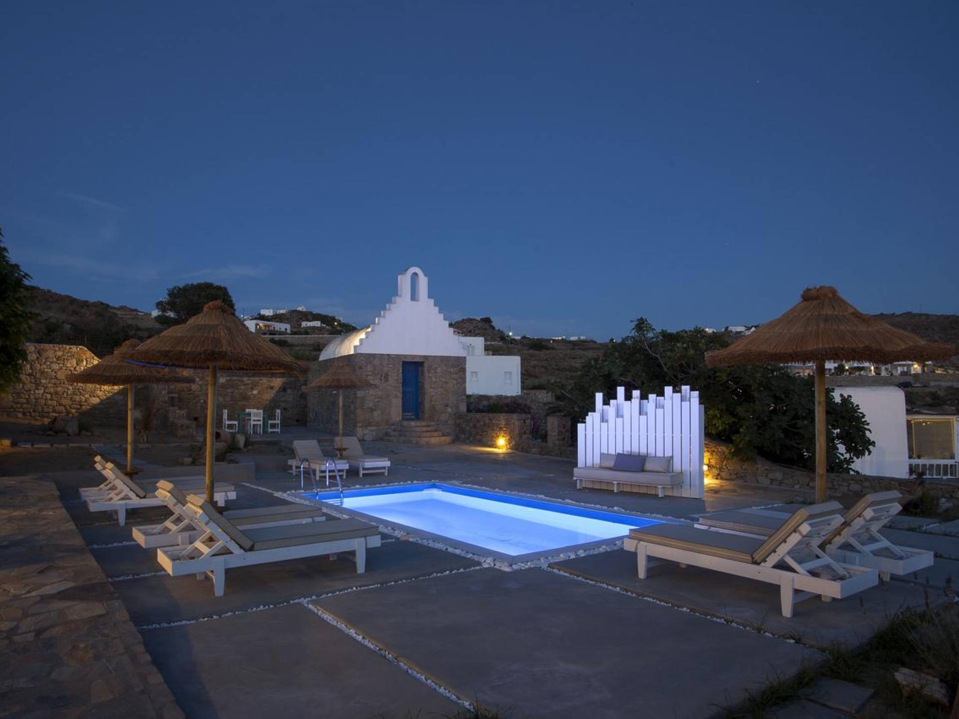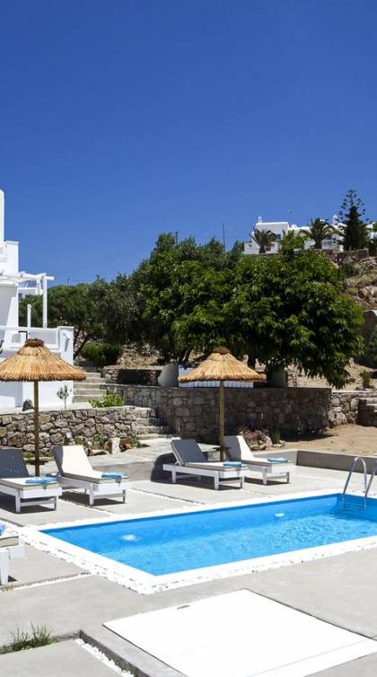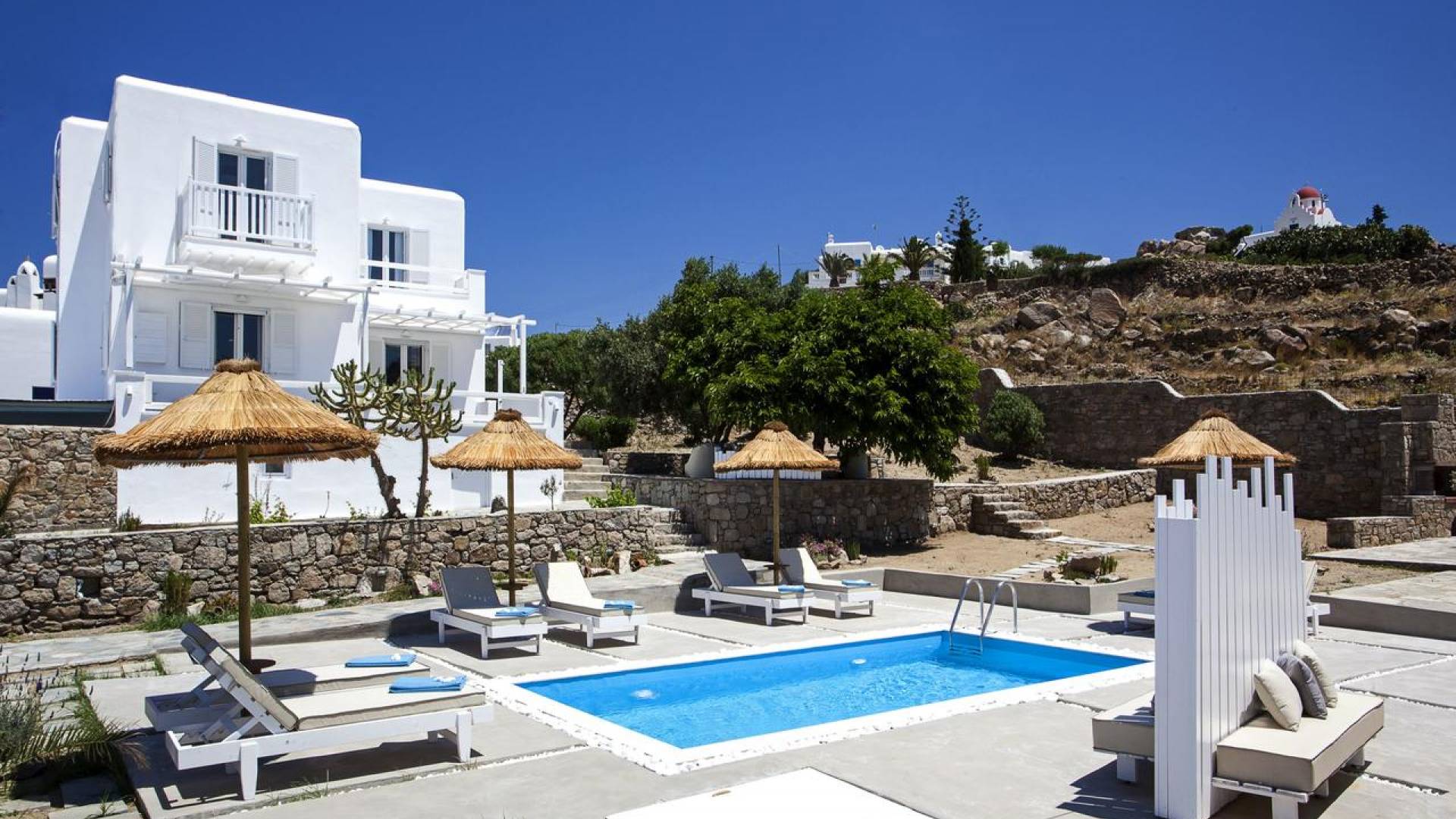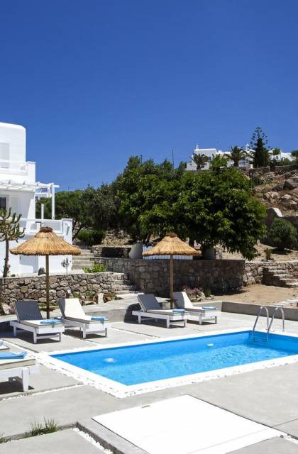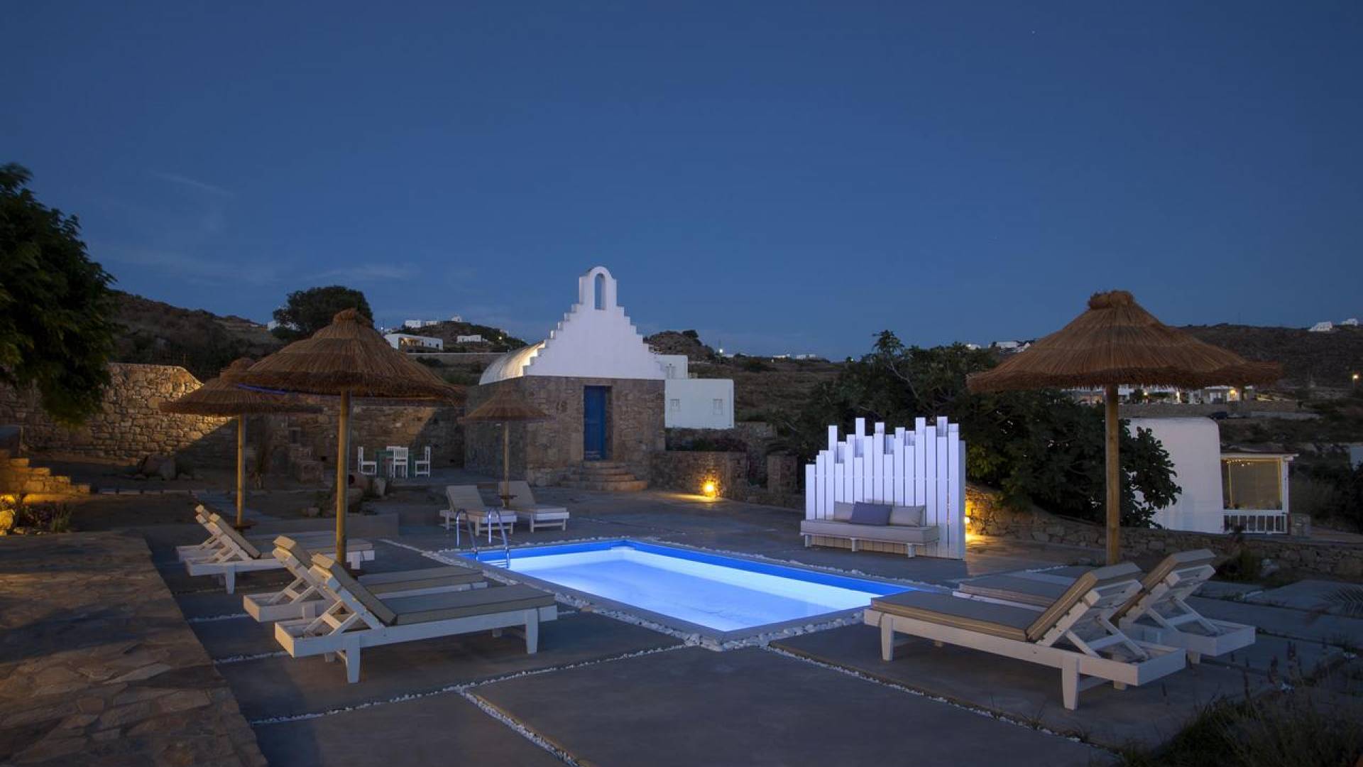 Thalassa Prive Villa Mykonos ofrece alojamiento de lujo de primer nivel en Mykonos, ideal para grupos de amigos o parejas, hasta 8 personas o 10, ya que el sofá cama del salón se convierte en una cama doble. Este alquiler de lujo es una villa privada de 2 plantas en Mykonos dividida en 4 dormitorios, 1 dormitorio en la planta baja y 3 dormitorios en el piso superior. La planta baja también ofrece una amplia cocina moderna y una sala de TV. La zona exterior incluye una piscina privada con tumbonas, una gran terraza, un jardín de rocas con zona de salón y una capilla. Se han utilizado materiales de primera calidad para construir y decorar Thalassa Prive Villa Mykonos, ha creado un ambiente de alta estética, ideal para recibir a los huéspedes más exigentes en Mykonos.