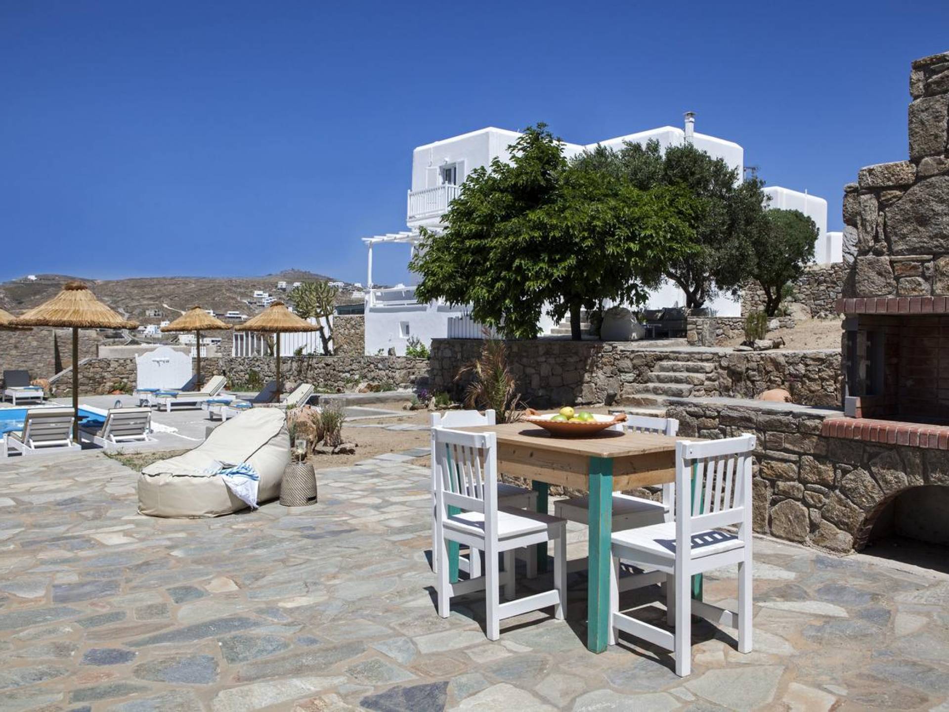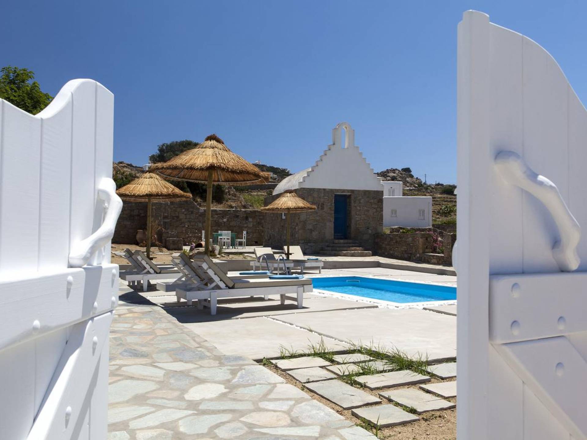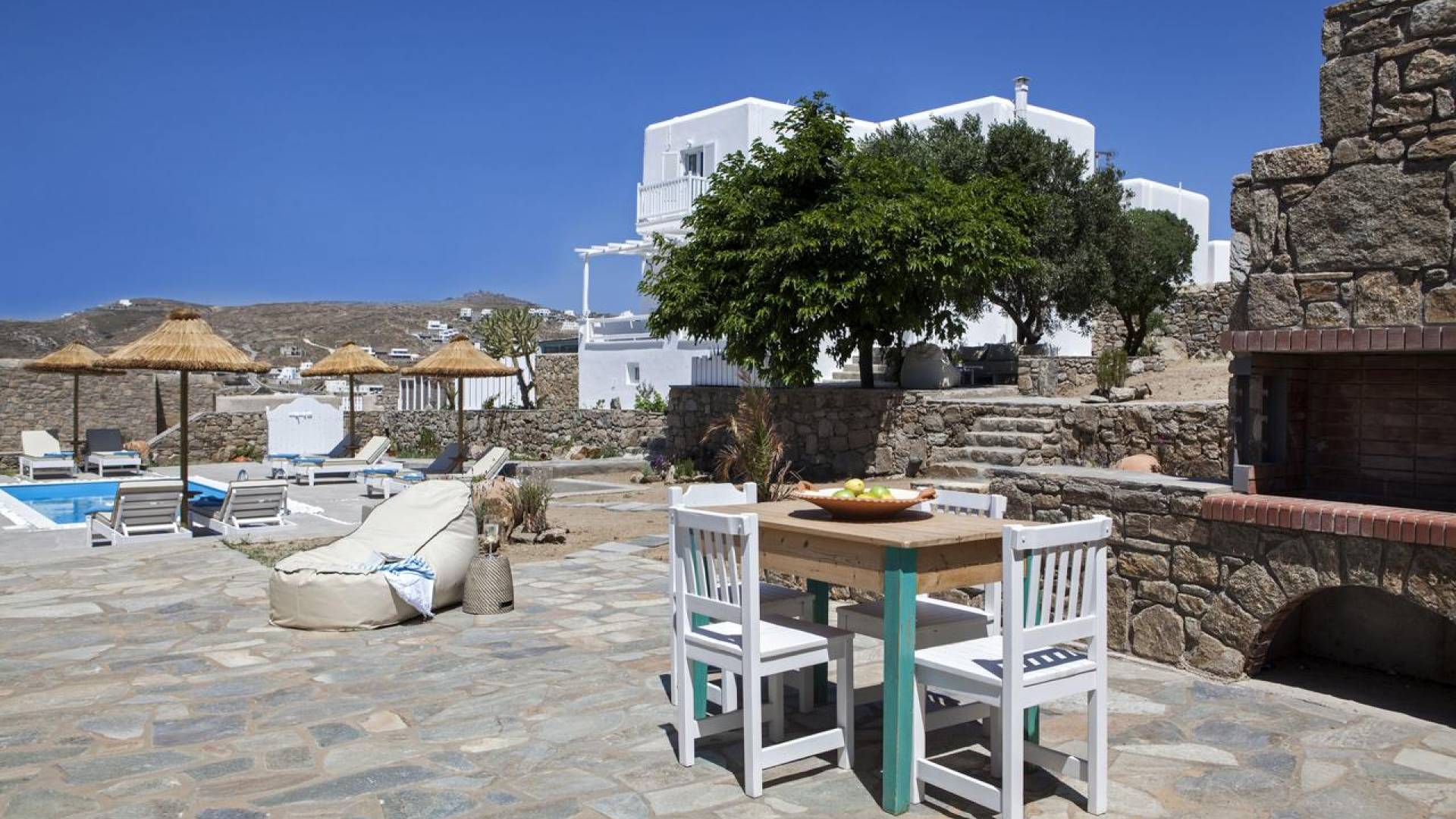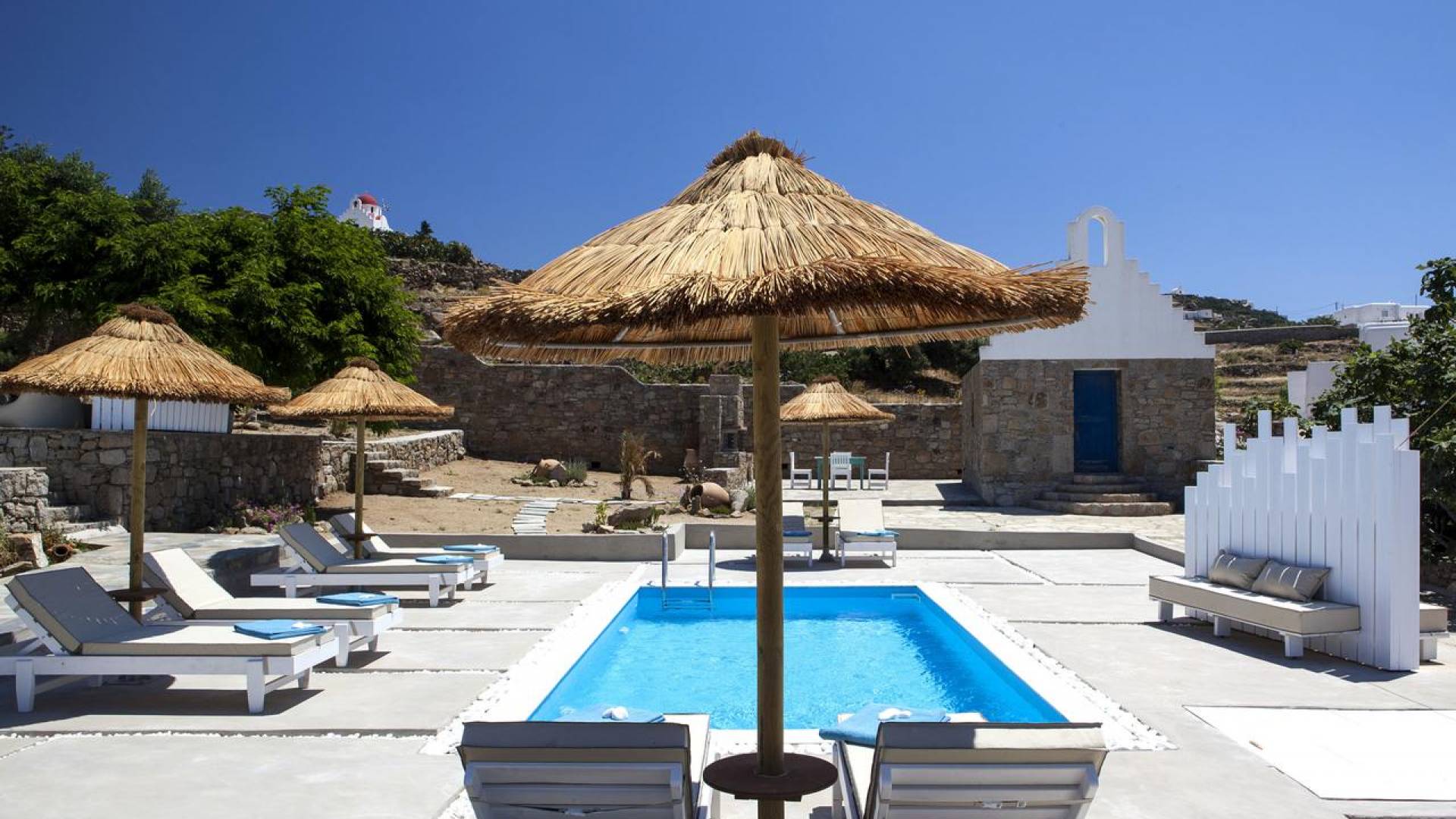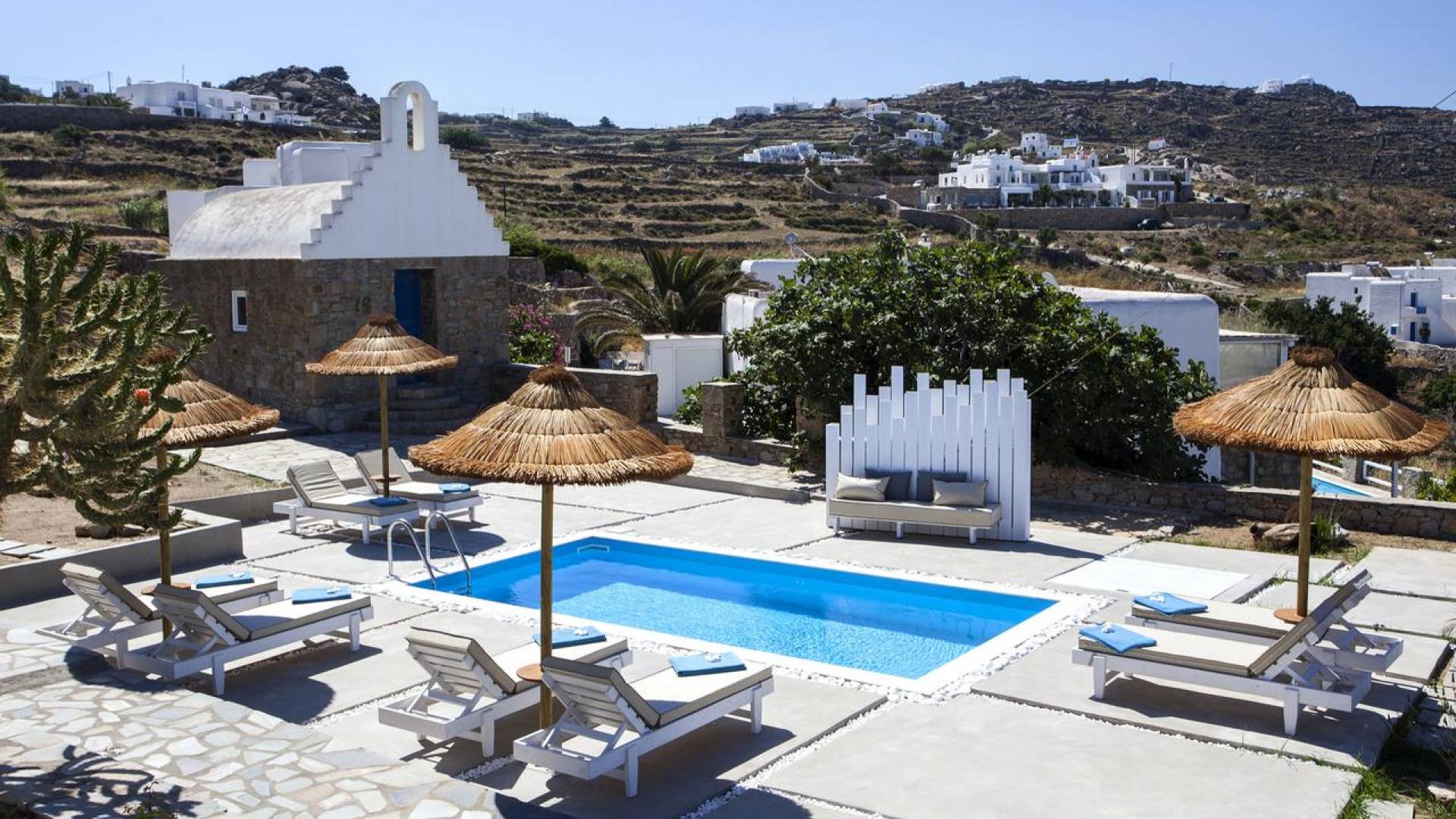 Thalassa Prive Villa Mykonos ofrece alojamiento de lujo de primer nivel en Mykonos, ideal para grupos de amigos o parejas, hasta 8 personas o 10, ya que el sofá cama del salón se convierte en una cama doble. Este alquiler de lujo es una villa privada de 2 plantas en Mykonos dividida en 4 dormitorios, 1 dormitorio en la planta baja y 3 dormitorios en el piso superior. La planta baja también ofrece una amplia cocina moderna y una sala de TV. La zona exterior incluye una piscina privada con tumbonas, una gran terraza, un jardín de rocas con zona de salón y una capilla. Se han utilizado materiales de primera calidad para construir y decorar Thalassa Prive Villa Mykonos, ha creado un ambiente de alta estética, ideal para recibir a los huéspedes más exigentes en Mykonos.