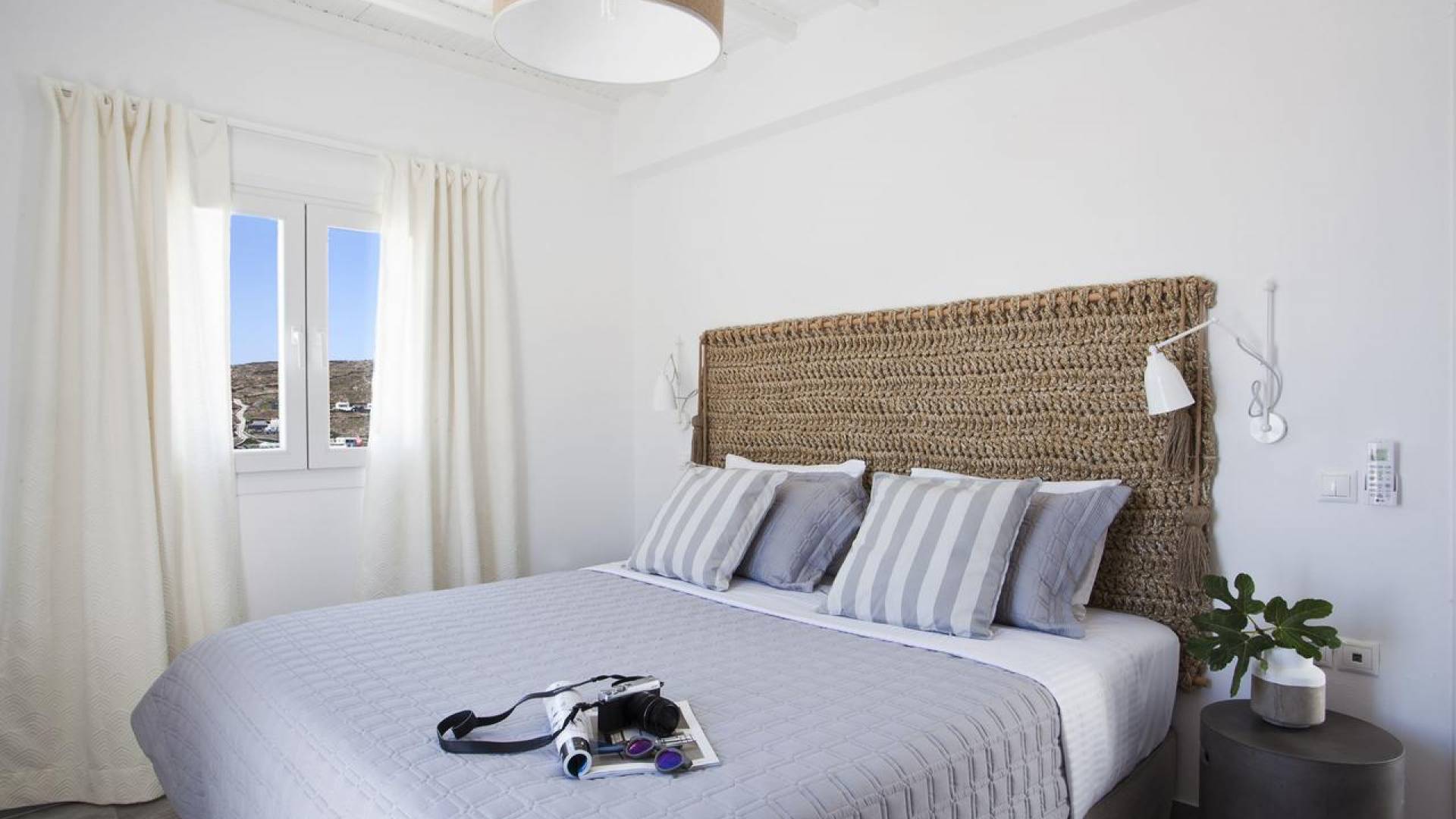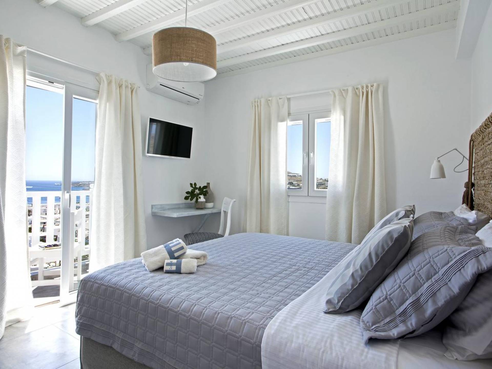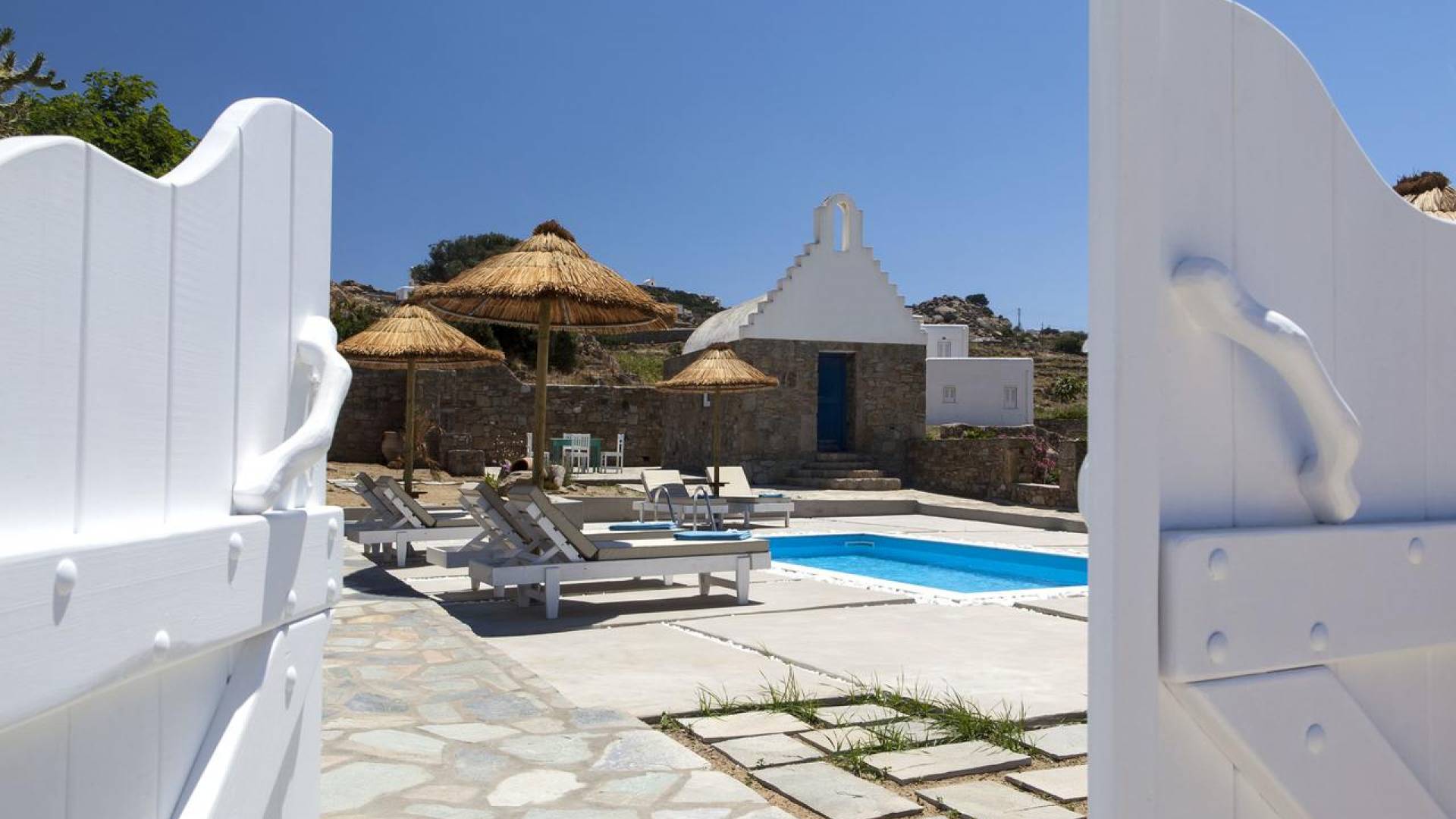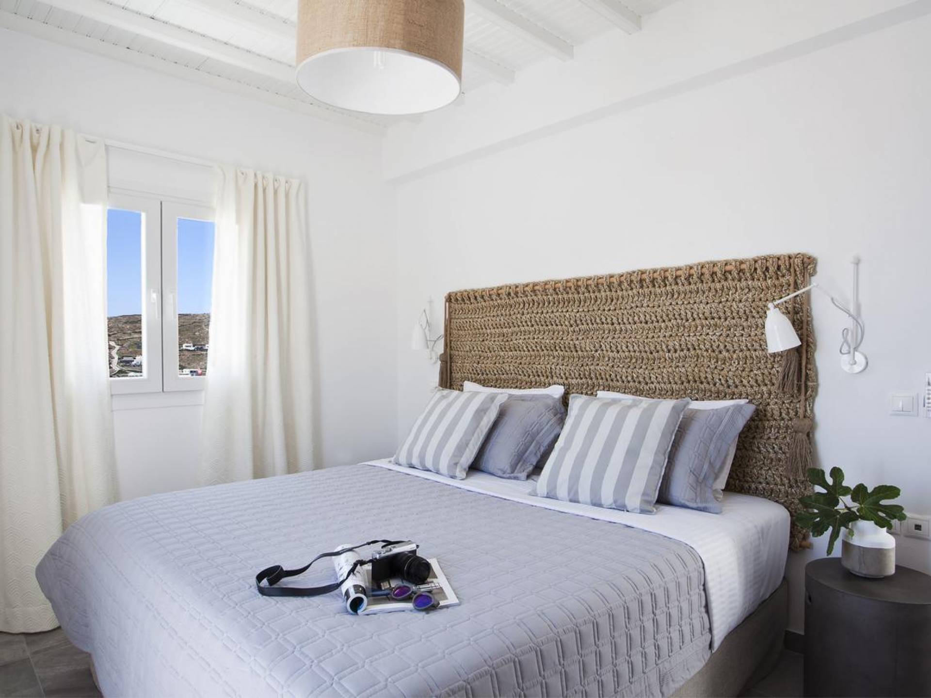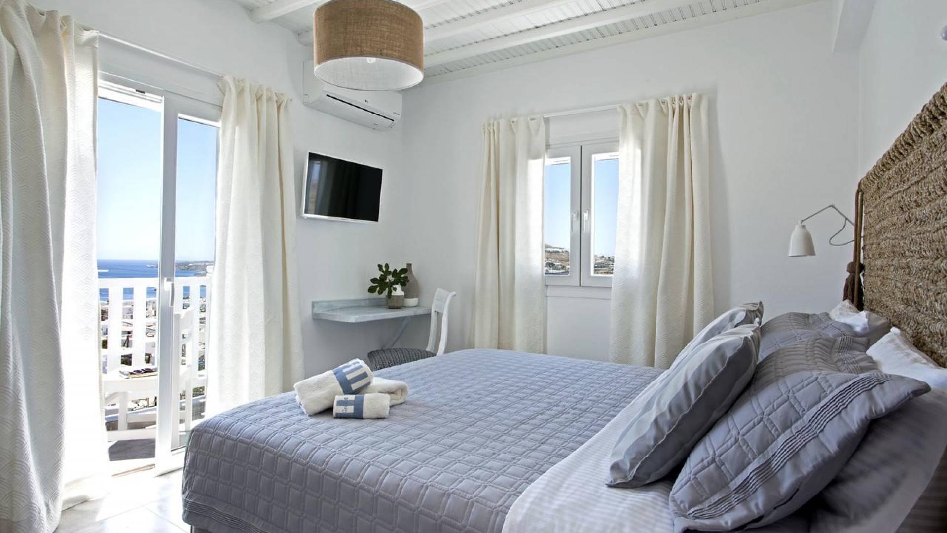 Thalassa Prive Villa Mykonos ofrece alojamiento de lujo de primer nivel en Mykonos, ideal para grupos de amigos o parejas, hasta 8 personas o 10, ya que el sofá cama del salón se convierte en una cama doble. Este alquiler de lujo es una villa privada de 2 plantas en Mykonos dividida en 4 dormitorios, 1 dormitorio en la planta baja y 3 dormitorios en el piso superior. La planta baja también ofrece una amplia cocina moderna y una sala de TV. La zona exterior incluye una piscina privada con tumbonas, una gran terraza, un jardín de rocas con zona de salón y una capilla. Se han utilizado materiales de primera calidad para construir y decorar Thalassa Prive Villa Mykonos, ha creado un ambiente de alta estética, ideal para recibir a los huéspedes más exigentes en Mykonos.