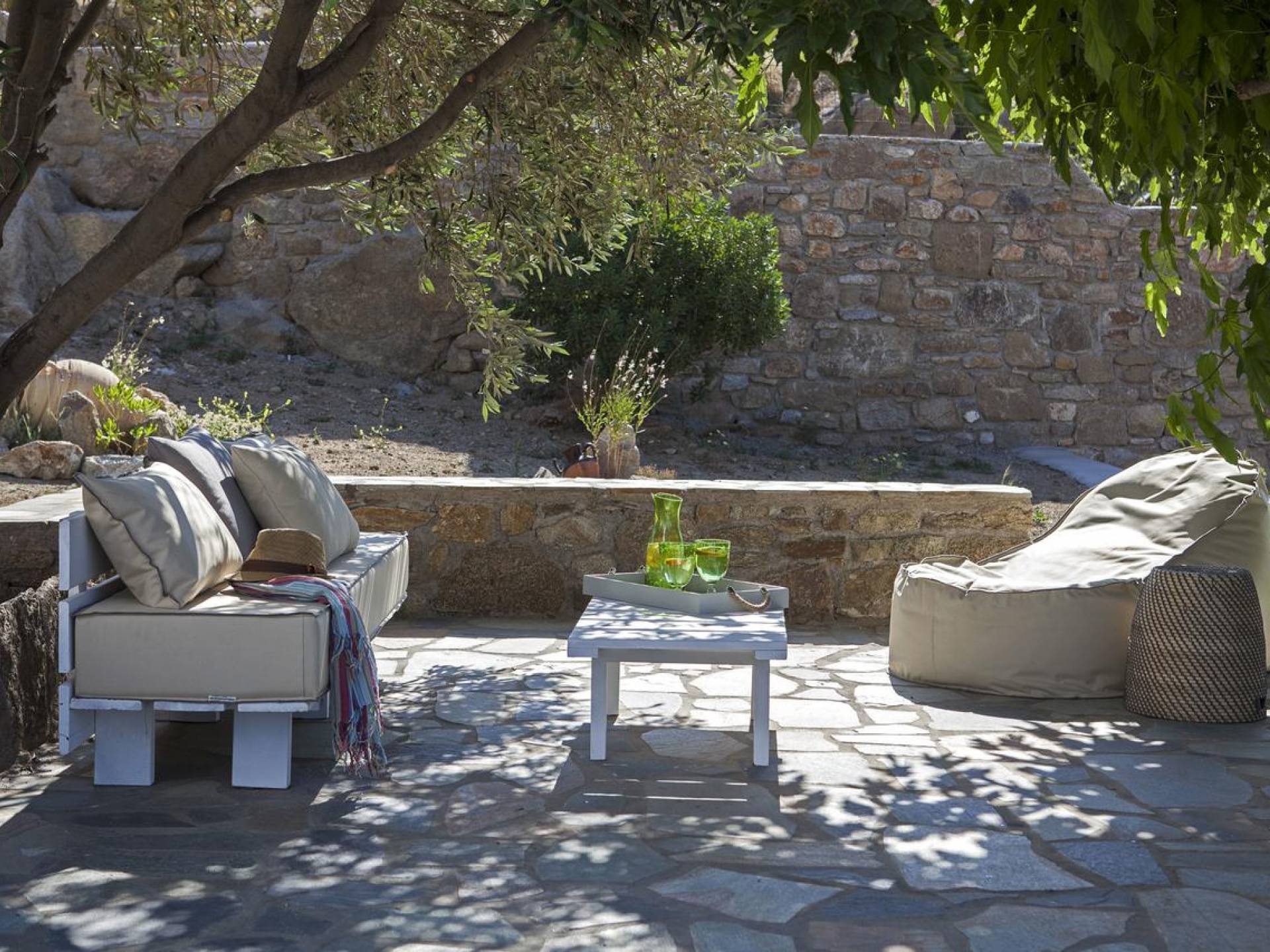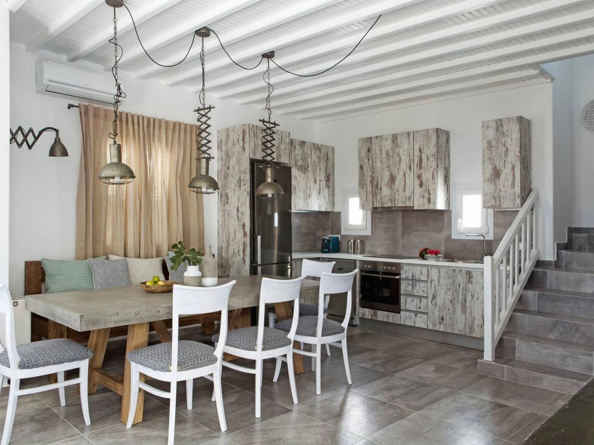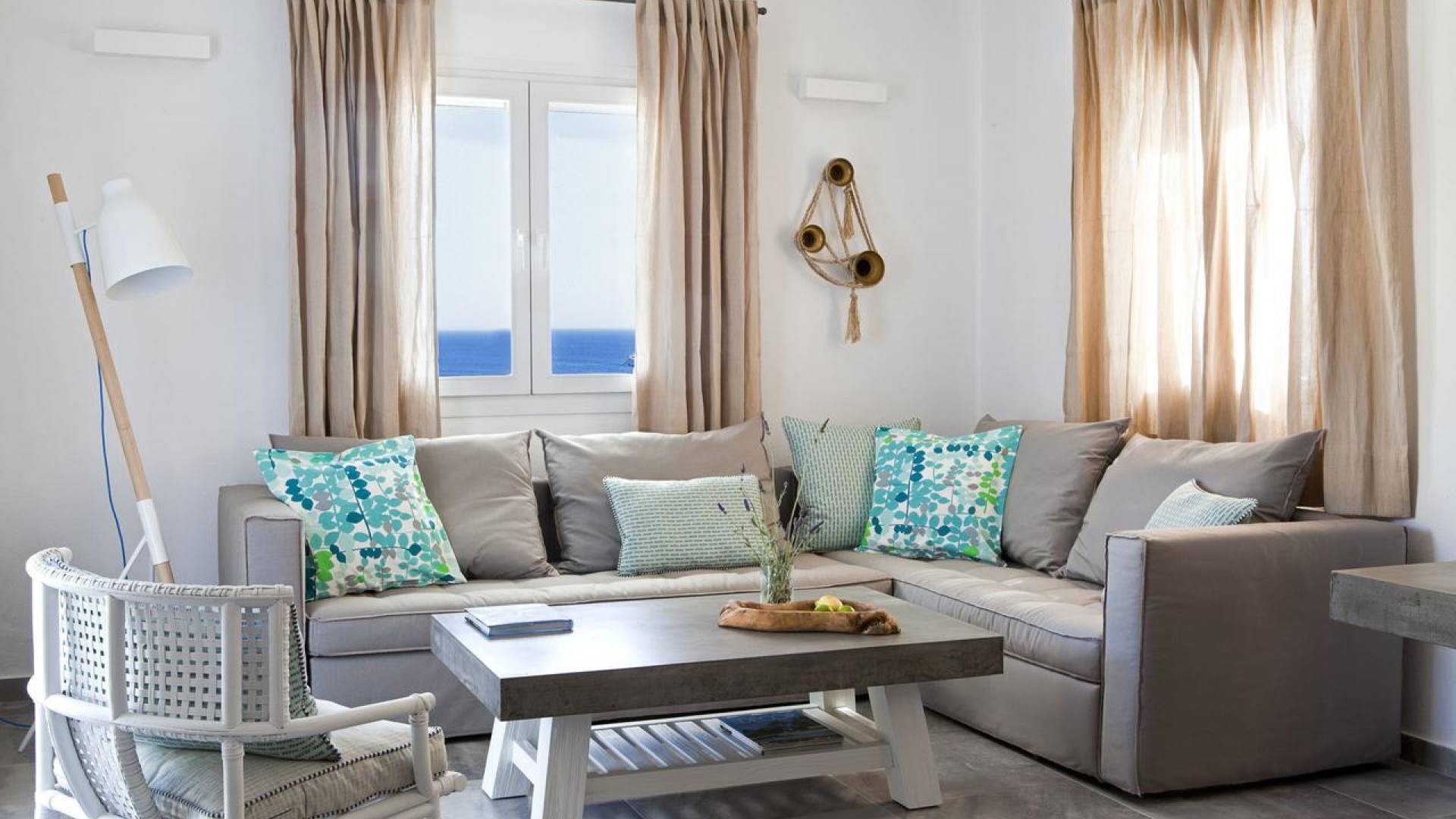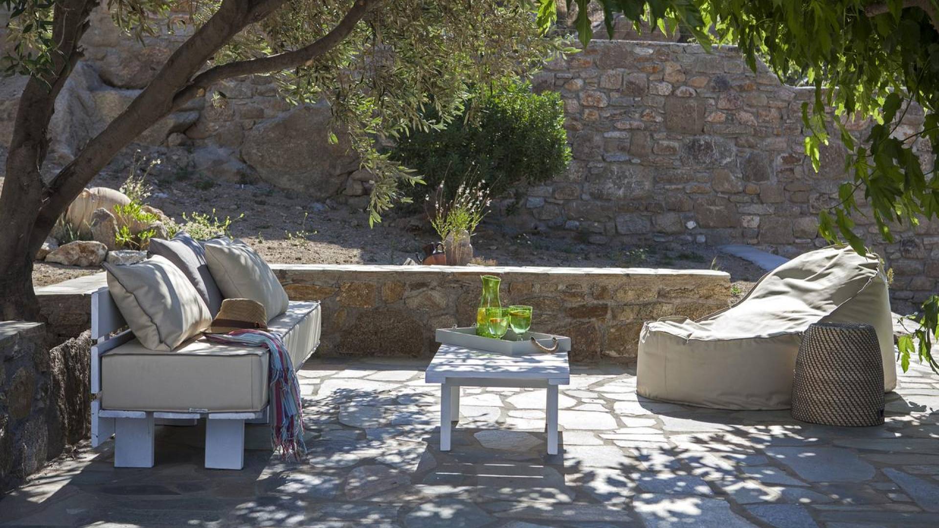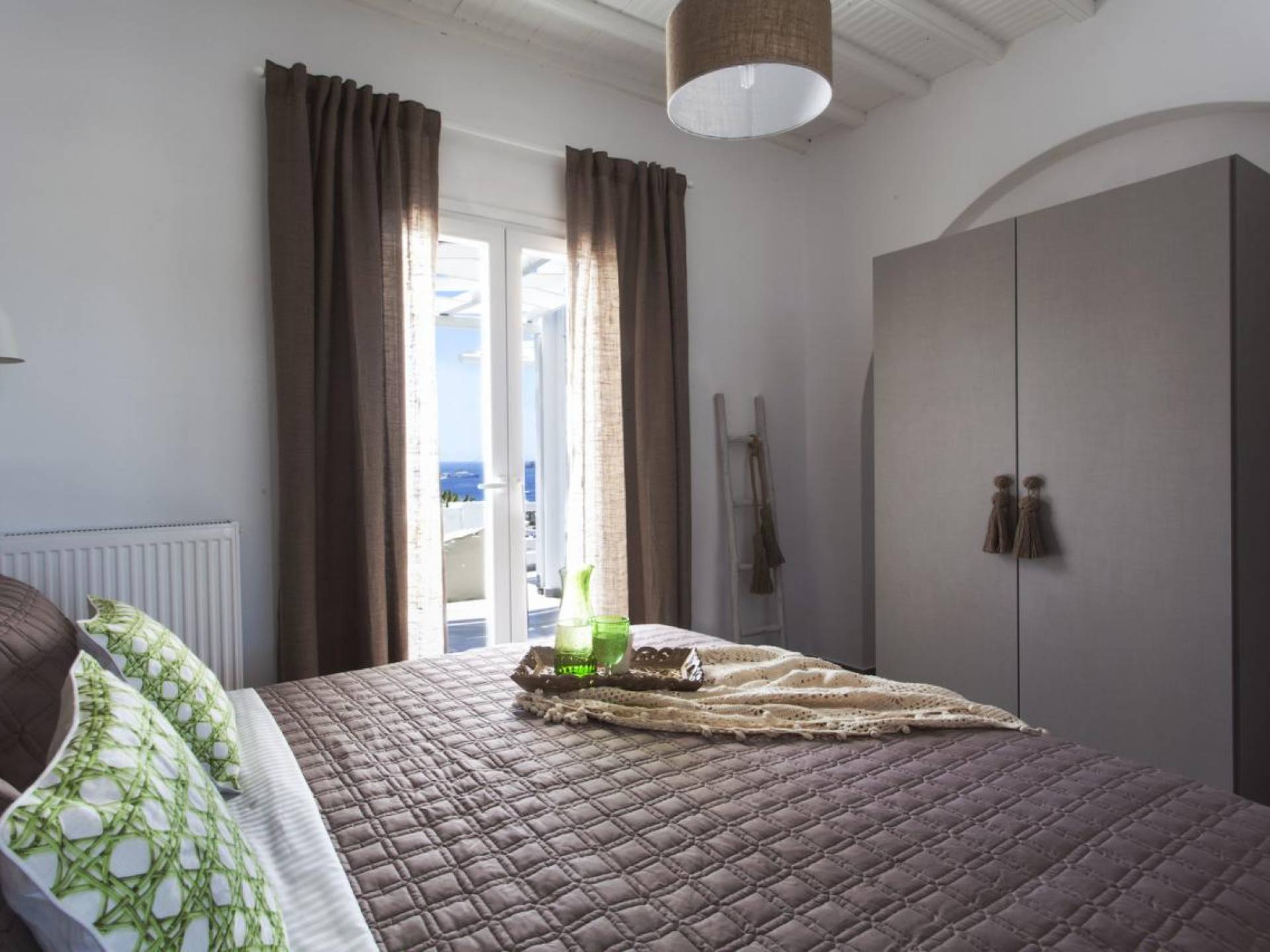Thalassa Prive Villa Mykonos ofrece alojamiento de lujo de primer nivel en Mykonos, ideal para grupos de amigos o parejas, hasta 8 personas o 10, ya que el sofá cama del salón se convierte en una cama doble. Este alquiler de lujo es una villa privada de 2 plantas en Mykonos dividida en 4 dormitorios, 1 dormitorio en la planta baja y 3 dormitorios en el piso superior. La planta baja también ofrece una amplia cocina moderna y una sala de TV. La zona exterior incluye una piscina privada con tumbonas, una gran terraza, un jardín de rocas con zona de salón y una capilla. Se han utilizado materiales de primera calidad para construir y decorar Thalassa Prive Villa Mykonos, ha creado un ambiente de alta estética, ideal para recibir a los huéspedes más exigentes en Mykonos.