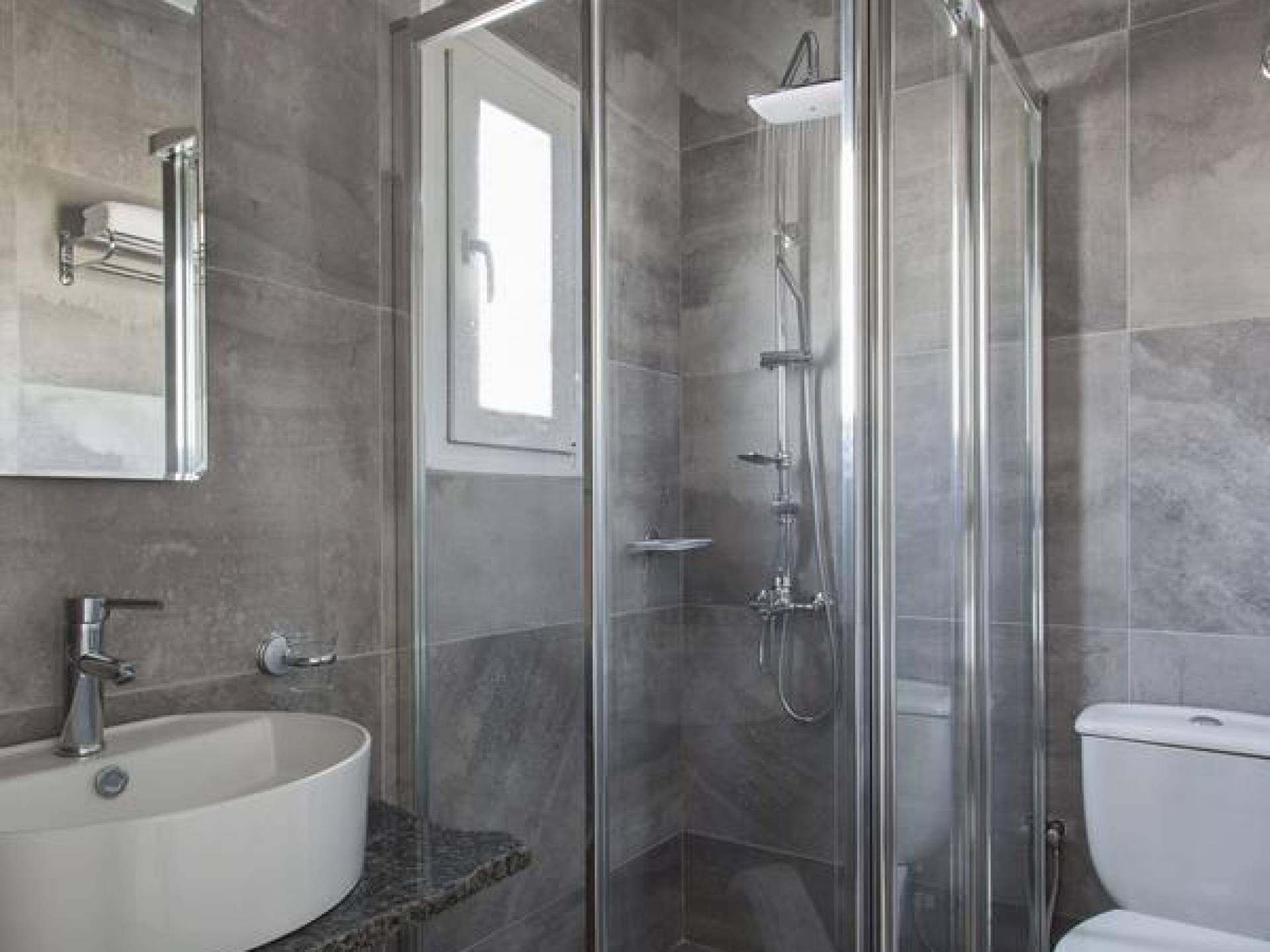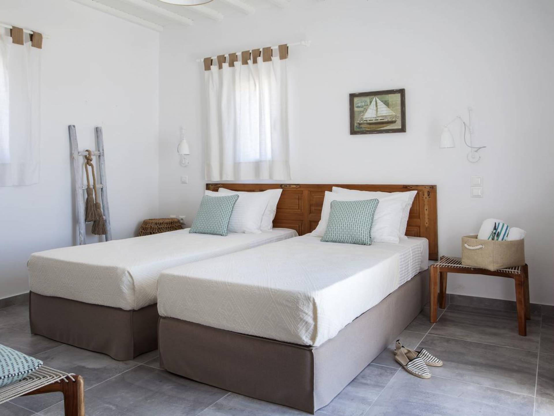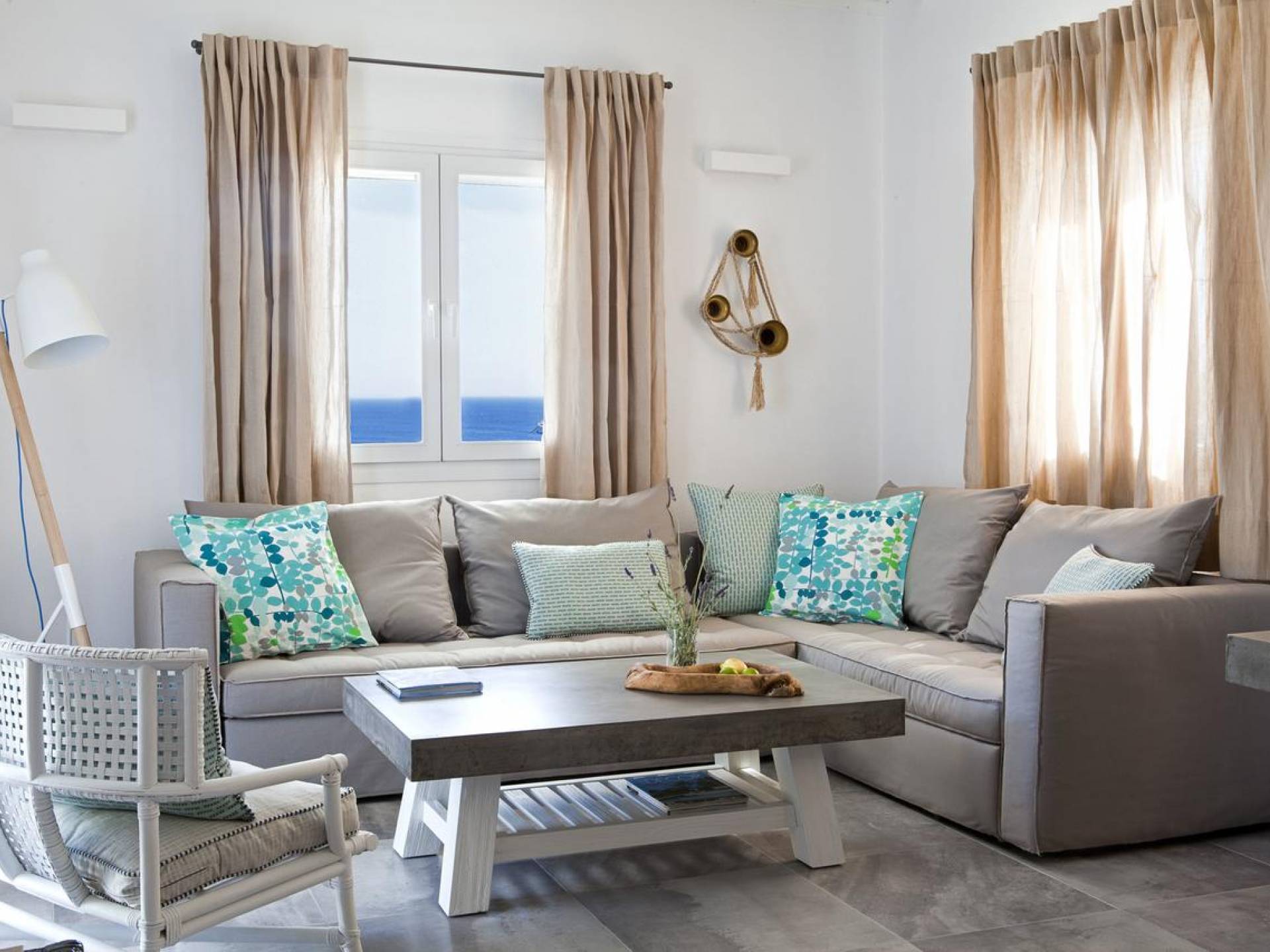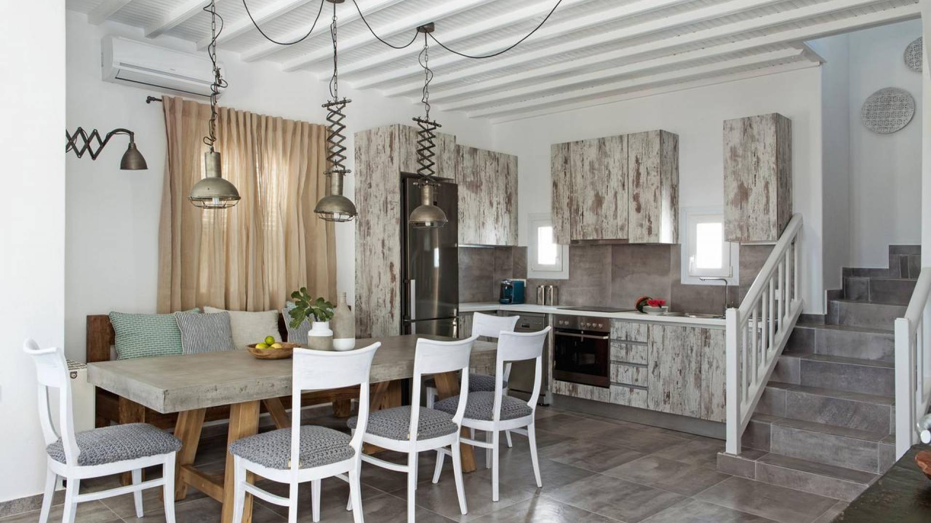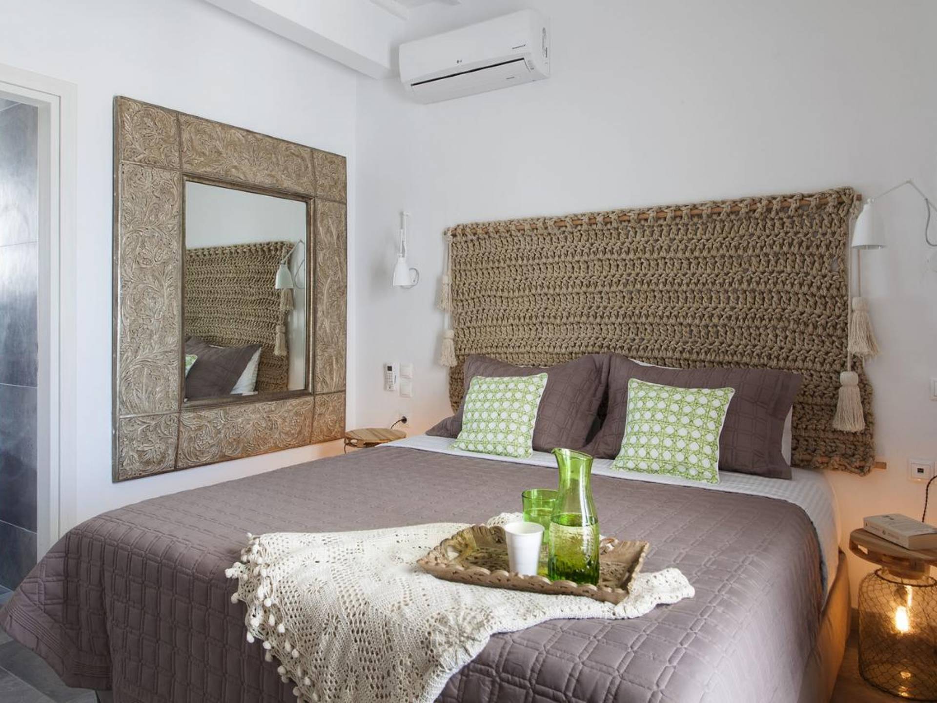 Thalassa Prive Villa Mykonos ofrece alojamiento de lujo de primer nivel en Mykonos, ideal para grupos de amigos o parejas, hasta 8 personas o 10, ya que el sofá cama del salón se convierte en una cama doble. Este alquiler de lujo es una villa privada de 2 plantas en Mykonos dividida en 4 dormitorios, 1 dormitorio en la planta baja y 3 dormitorios en el piso superior. La planta baja también ofrece una amplia cocina moderna y una sala de TV. La zona exterior incluye una piscina privada con tumbonas, una gran terraza, un jardín de rocas con zona de salón y una capilla. Se han utilizado materiales de primera calidad para construir y decorar Thalassa Prive Villa Mykonos, ha creado un ambiente de alta estética, ideal para recibir a los huéspedes más exigentes en Mykonos.