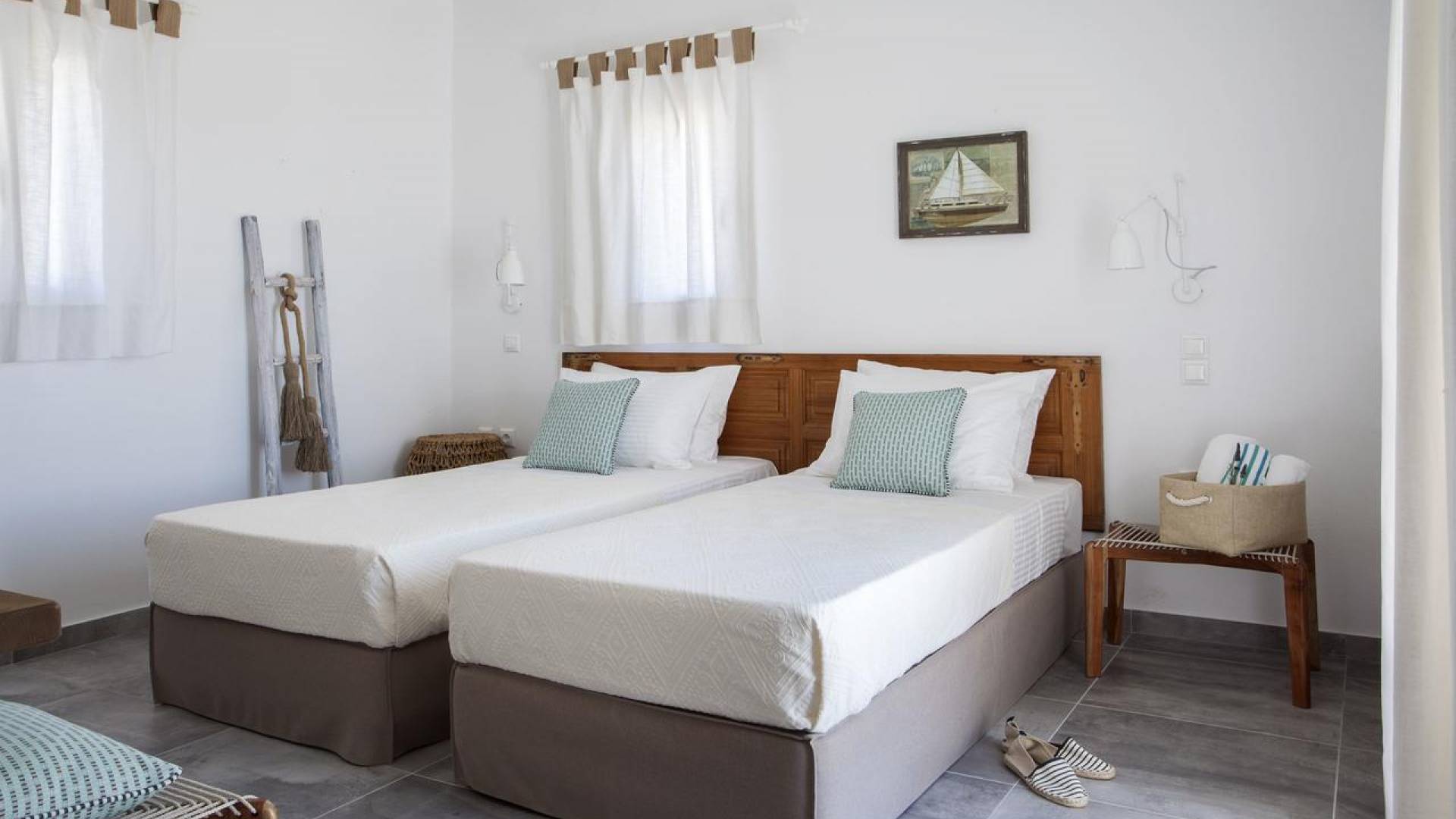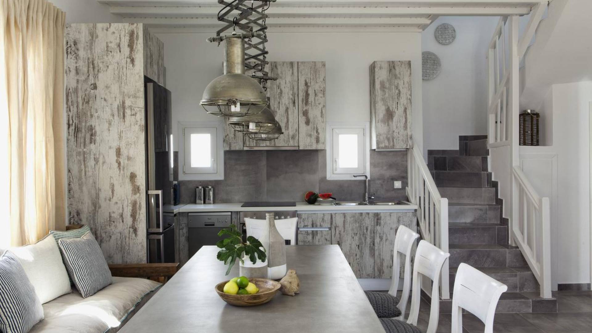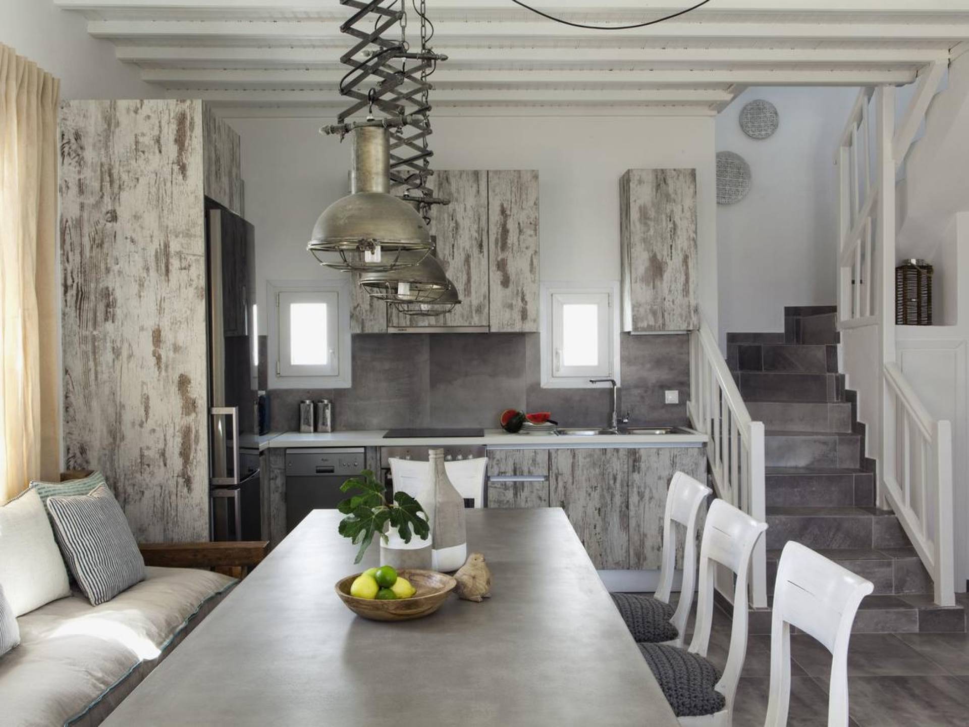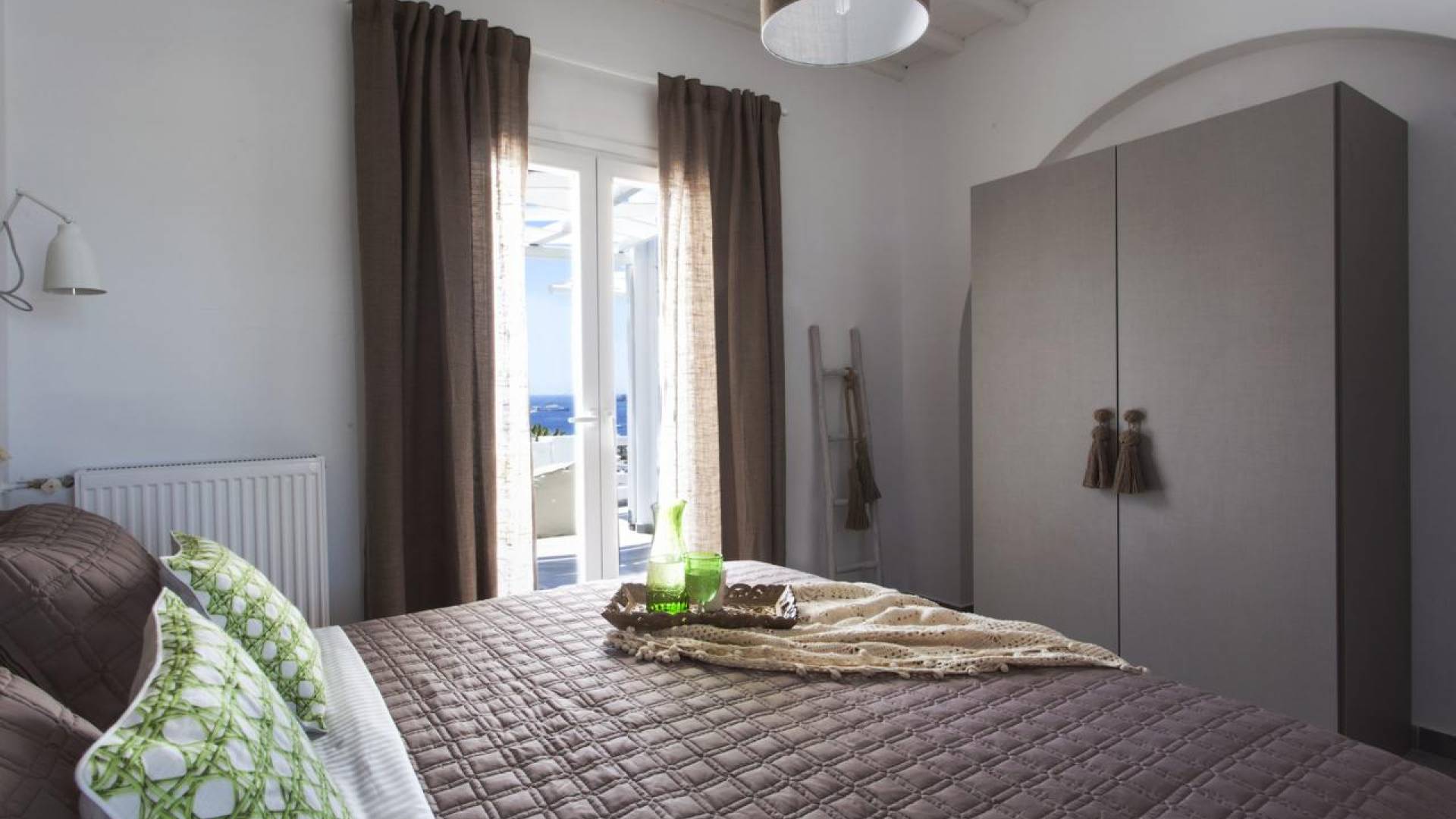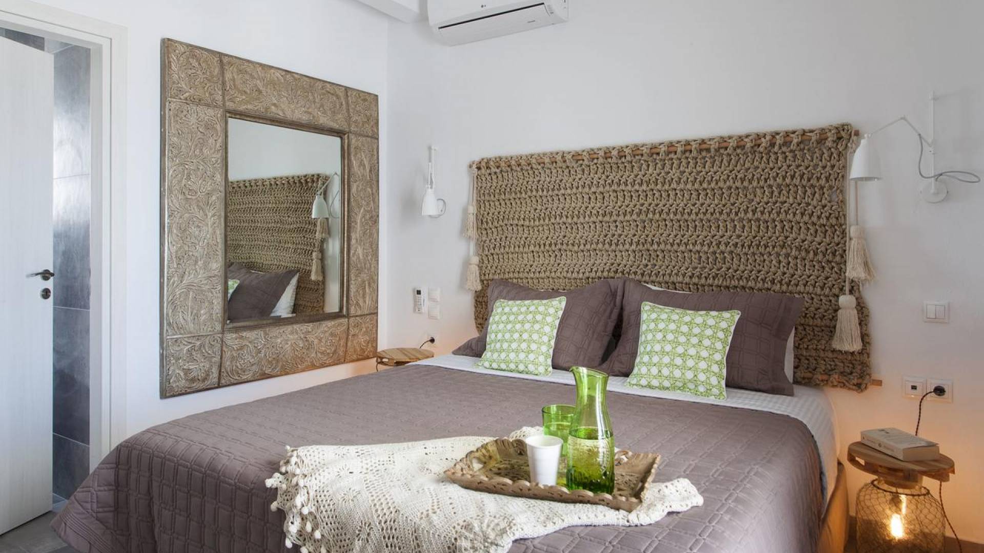 Thalassa Prive Villa Mykonos ofrece alojamiento de lujo de primer nivel en Mykonos, ideal para grupos de amigos o parejas, hasta 8 personas o 10, ya que el sofá cama del salón se convierte en una cama doble. Este alquiler de lujo es una villa privada de 2 plantas en Mykonos dividida en 4 dormitorios, 1 dormitorio en la planta baja y 3 dormitorios en el piso superior. La planta baja también ofrece una amplia cocina moderna y una sala de TV. La zona exterior incluye una piscina privada con tumbonas, una gran terraza, un jardín de rocas con zona de salón y una capilla. Se han utilizado materiales de primera calidad para construir y decorar Thalassa Prive Villa Mykonos, ha creado un ambiente de alta estética, ideal para recibir a los huéspedes más exigentes en Mykonos.