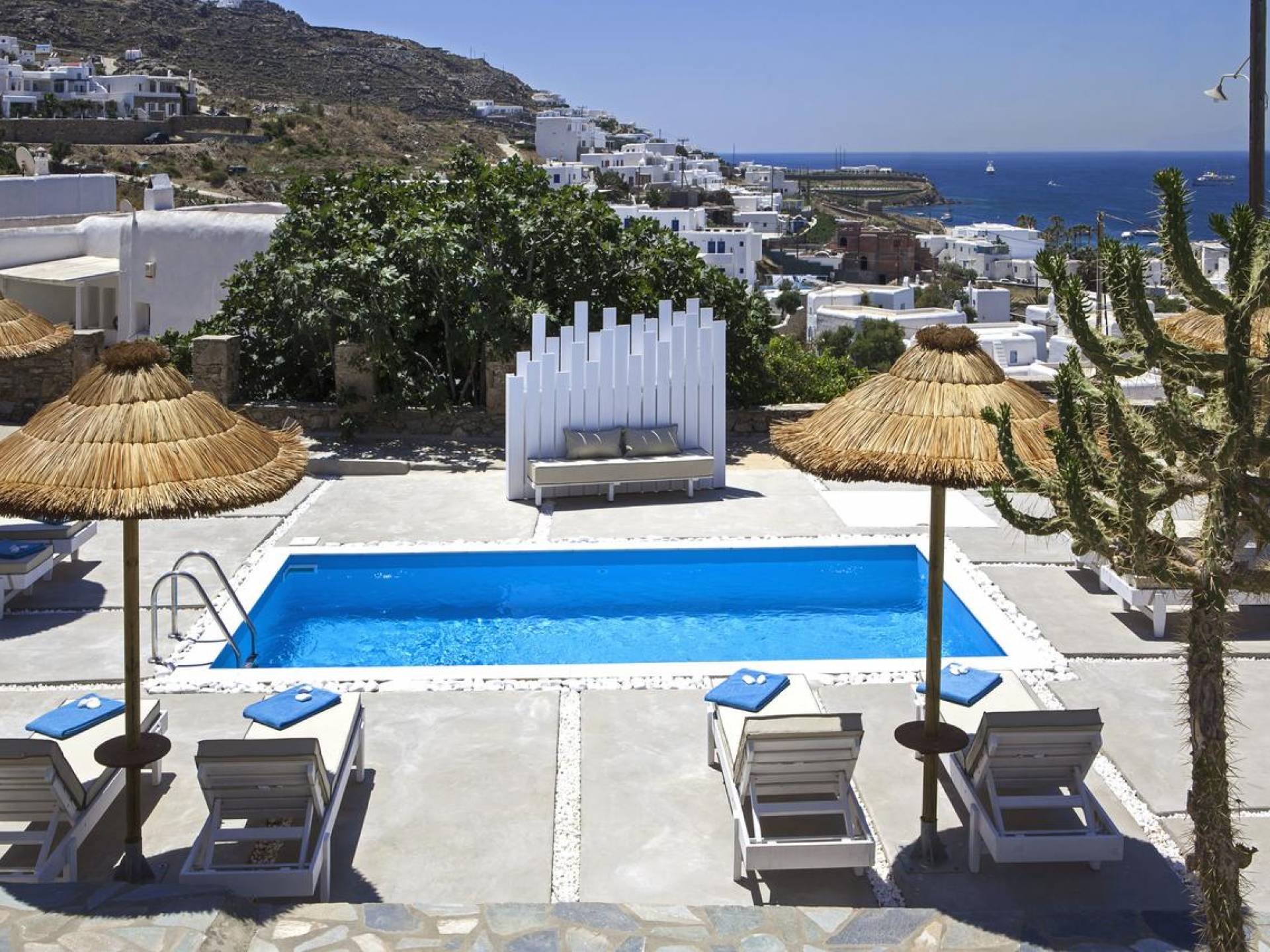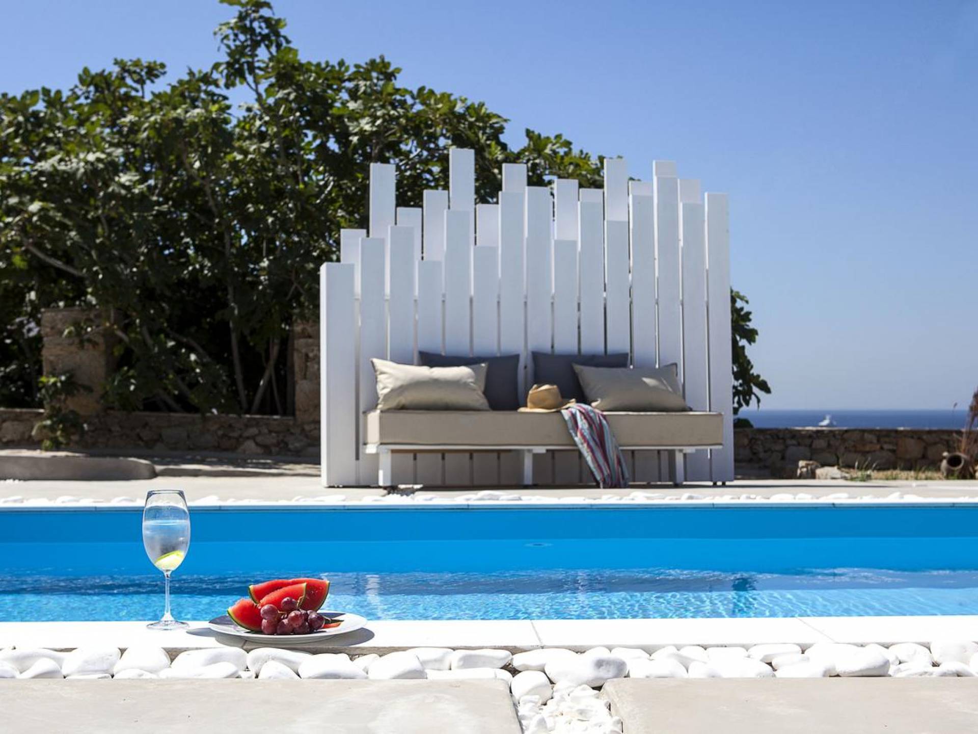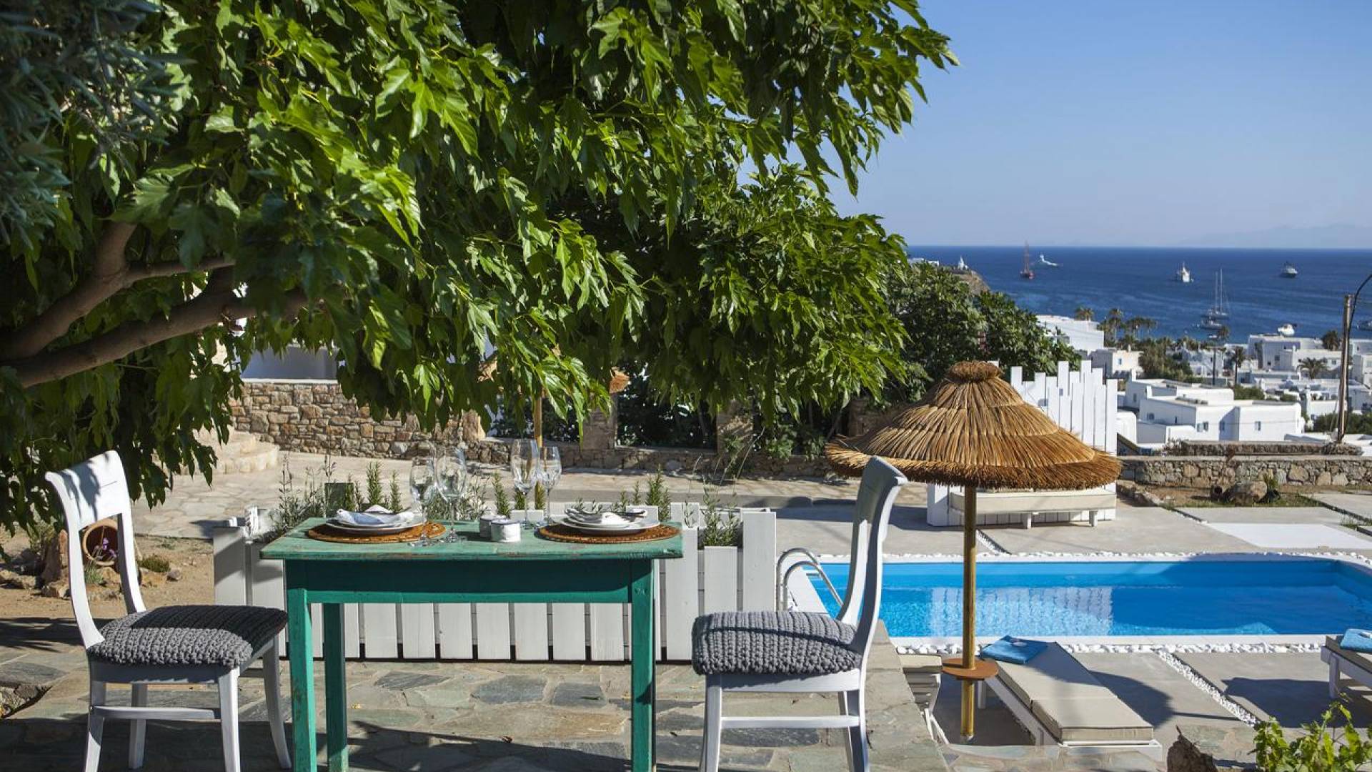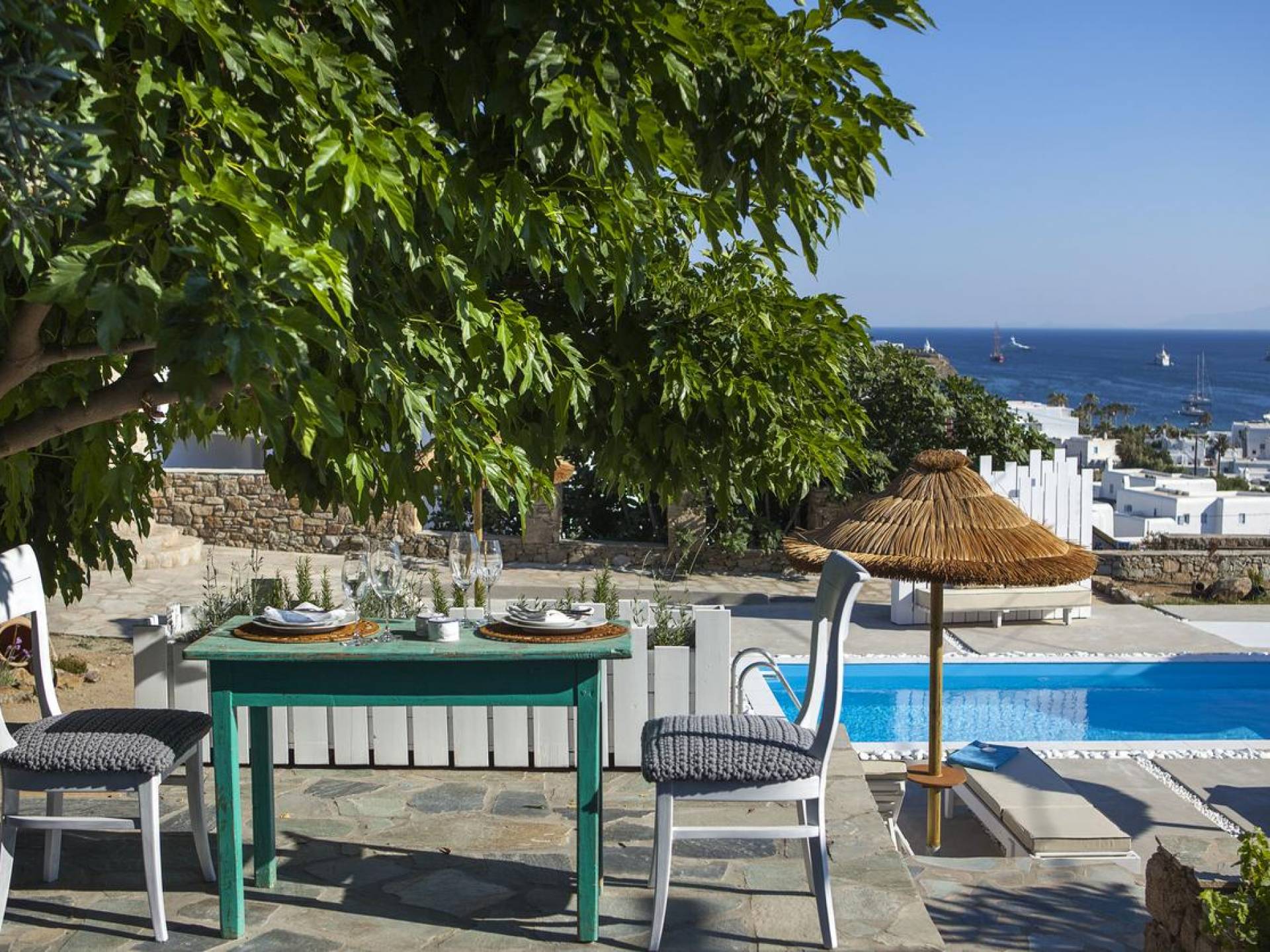 Thalassa Prive Villa Mykonos es una lujosa villa privada con vistas al mar en Mykonos con piscina privada, que brinda total privacidad para un alojamiento discreto en Mykonos, con comodidad y lujo. Esta finca de lujo ofrece un gran jardín con área de piscina, ideal para que los huéspedes se relajen, mientras disfrutan de las vistas panorámicas hacia las aguas cristalinas de la playa de Ornos y también al asentamiento tradicional de Ornos. El diseño de Thalassa Villa en Mykonos ha sido diseñado orgánicamente para optimizar la hermosa vista al mar y la vista a la piscina, conectando perfectamente los espacios interiores y exteriores, para un alojamiento de villa exclusivo y distintivo, entre villas de lujo en la isla de Mykonos, Grecia.