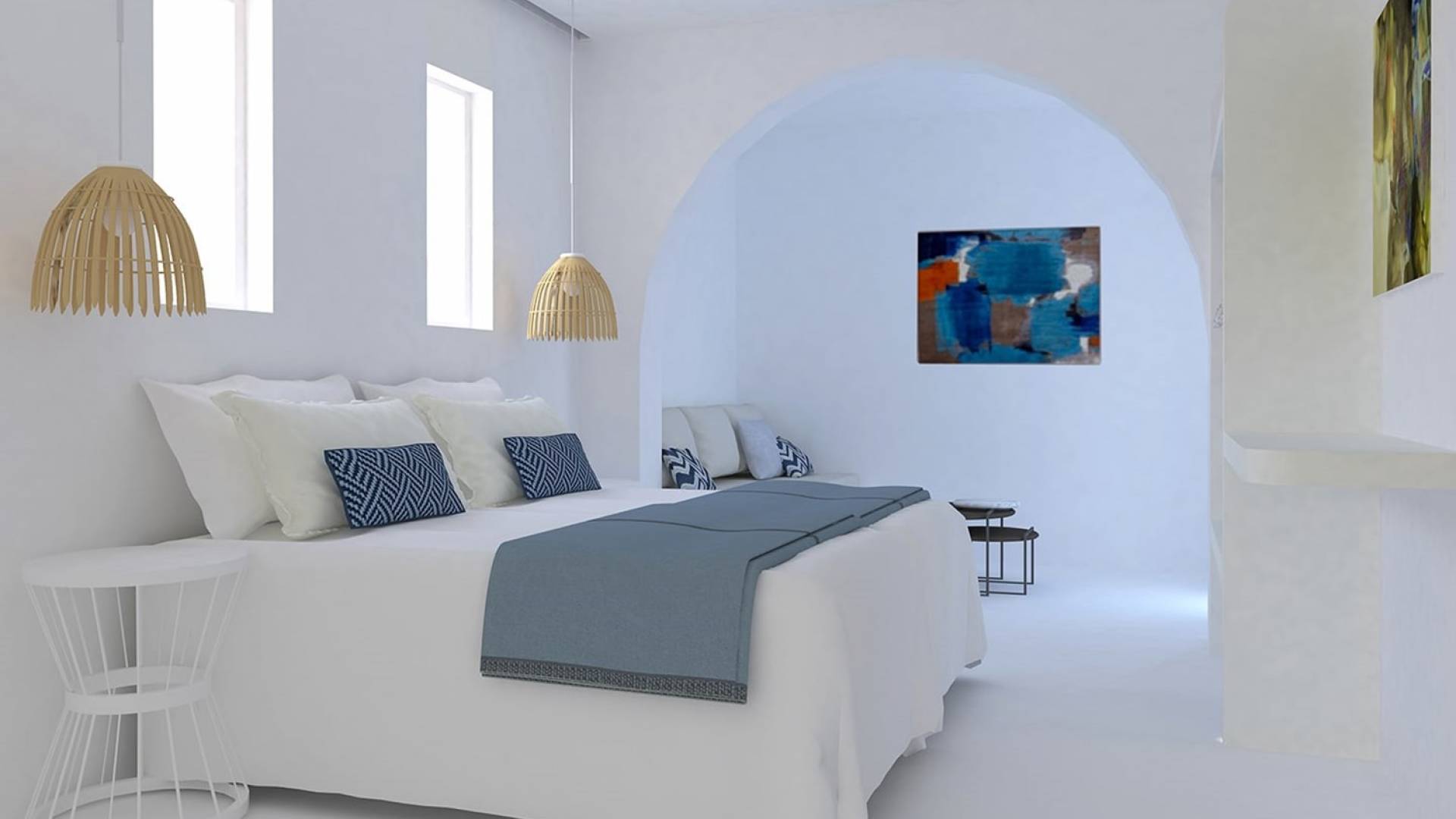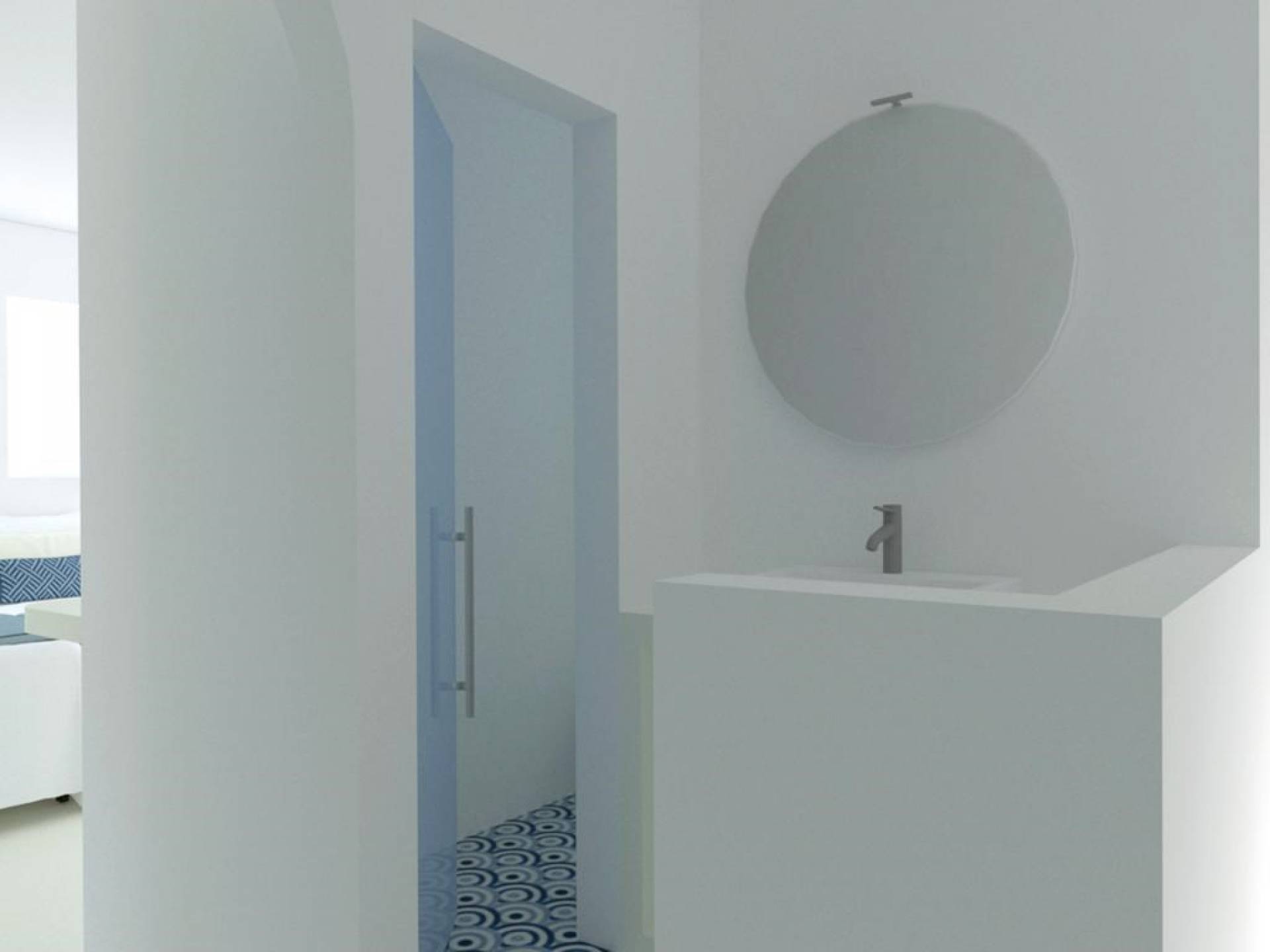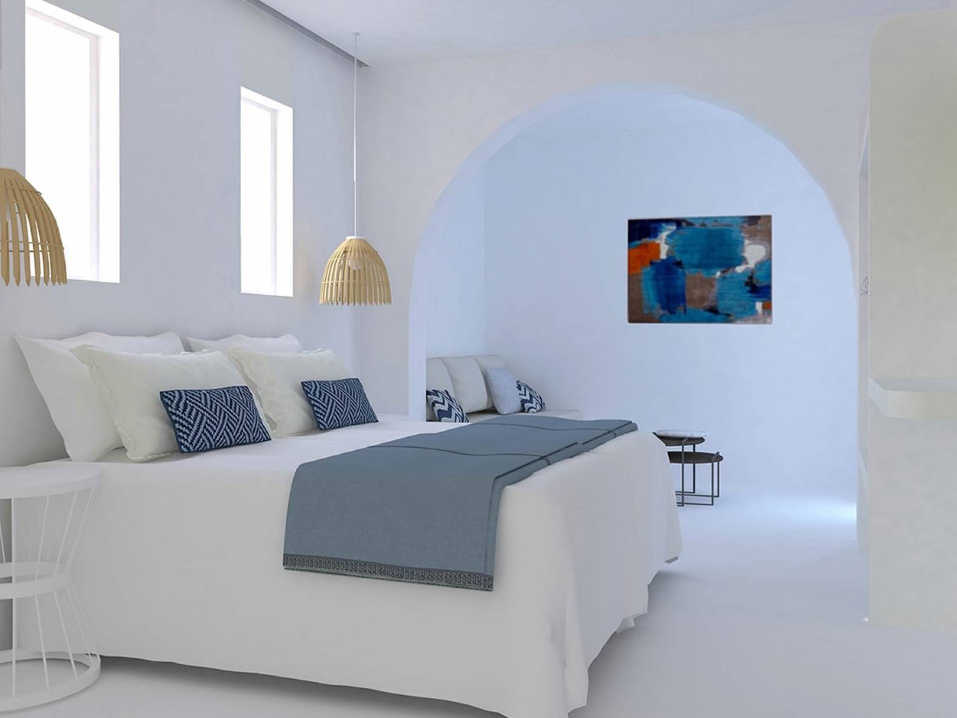 En la planta superior de Erato- Superior Sea View Villa with a outdoor Jacuzzi in Naxos, hay dos dormitorios: el dormitorio principal tiene una gran cama doble empotrada y un armario abierto. El segundo dormitorio de planta abierta tiene dos camas individuales que se pueden unir en una, así como un sofá empotrado y un armario abierto. Además, esta habitación cuenta con increíbles vistas a la ciudad de Naxos y la playa de Agios Georgios. En la planta superior, también hay un baño elegante y moderno con Beton cire, además de un balcón de 8 m2 con increíbles vistas del atardecer.