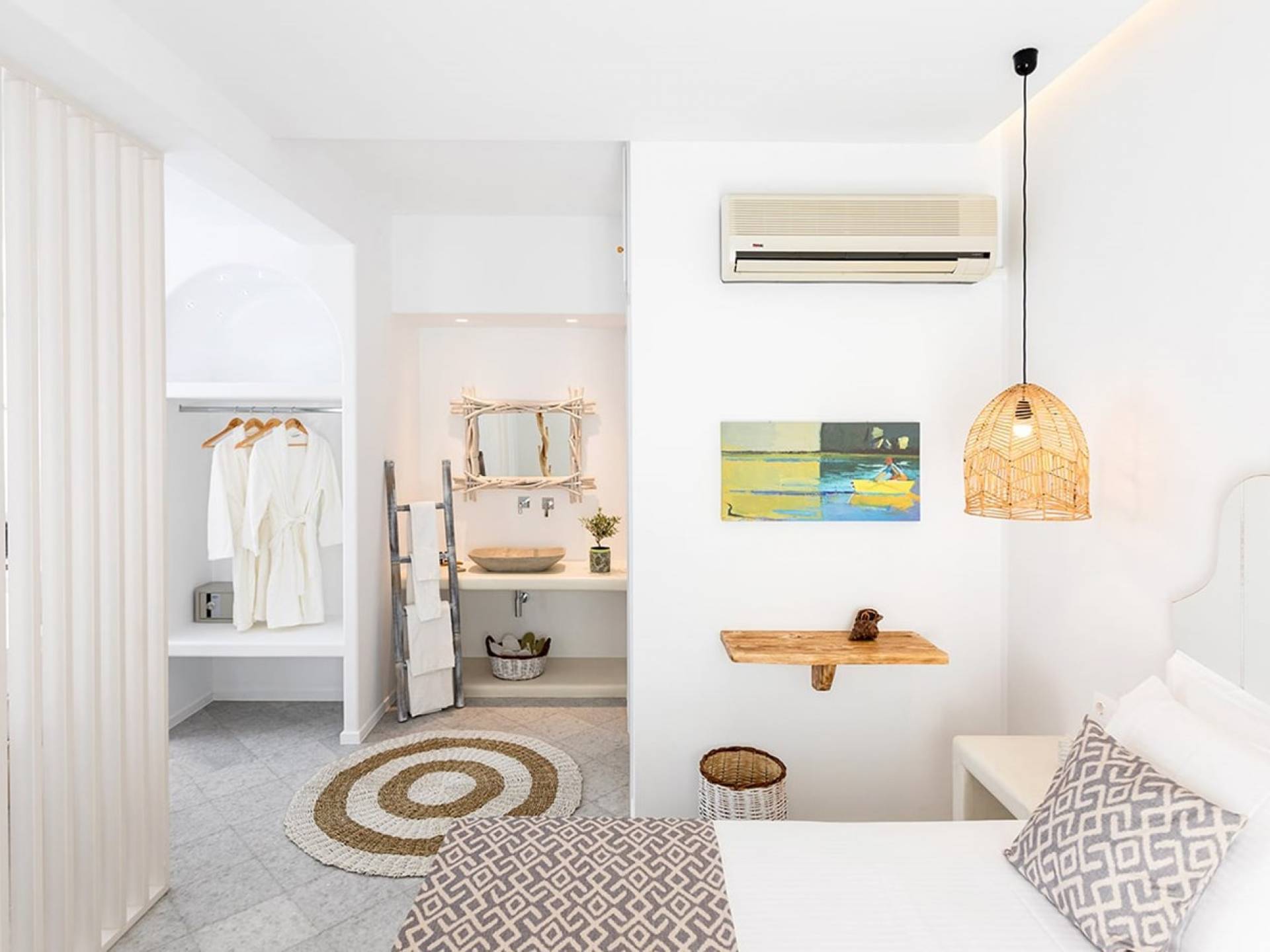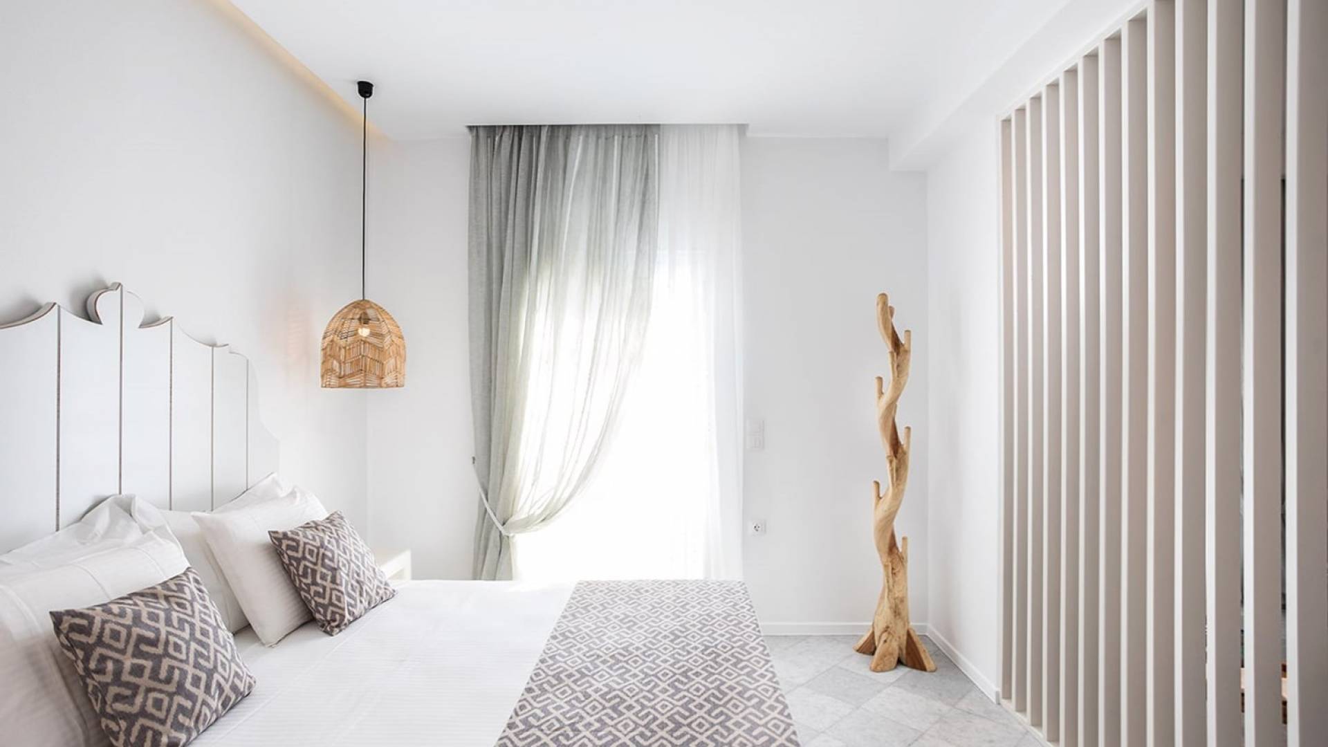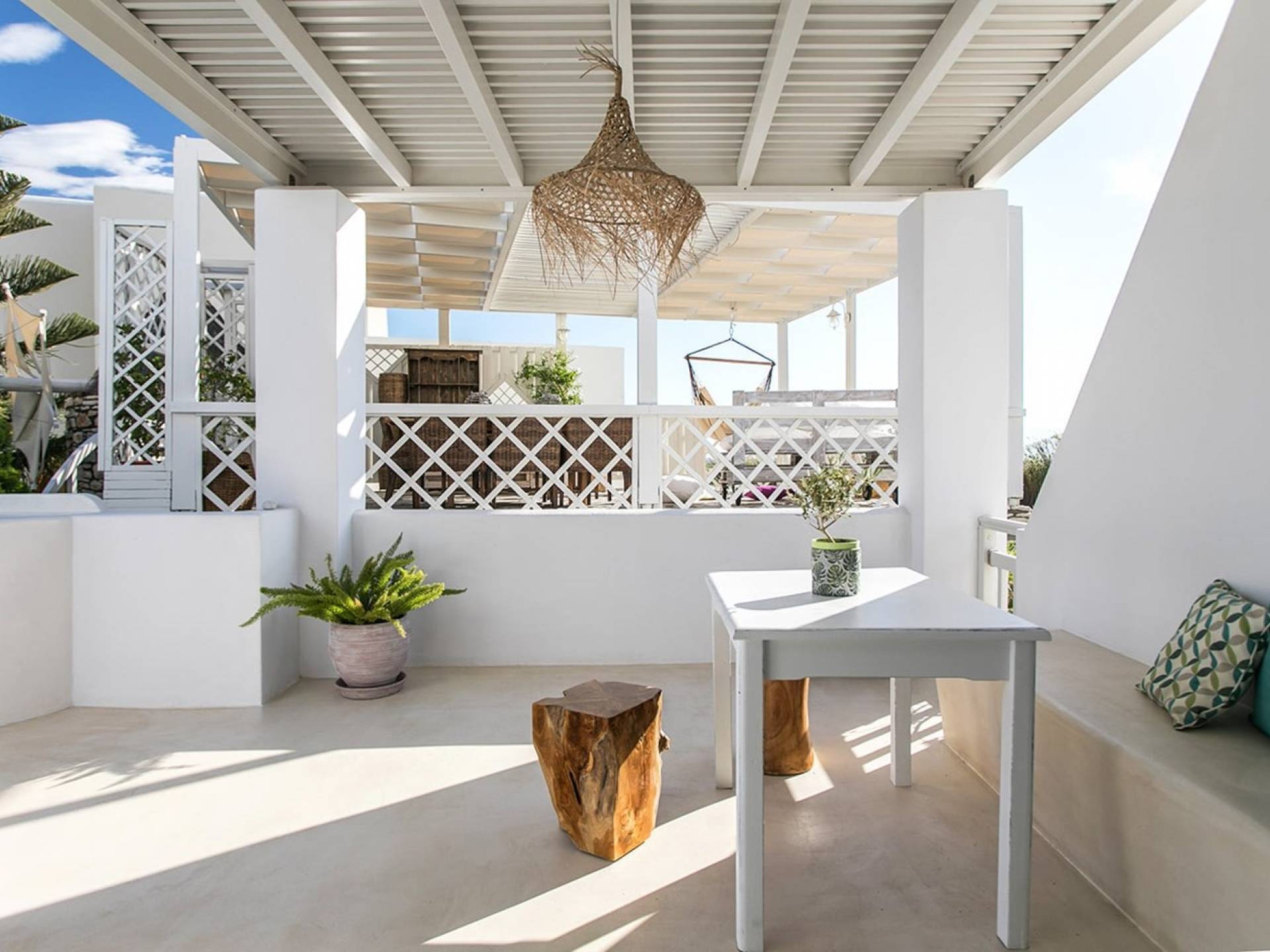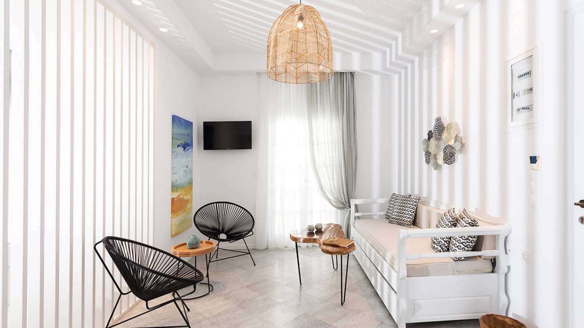 Además, en sintonía con la belleza de su entorno natural, Aeolos Luxury Villas & Suites ofrece ventajosas vistas panorámicas que se extienden desde los picos de las montañas de la isla y el campo llano hasta las casas encaladas de cubos de azúcar de la ciudad principal, el resplandeciente mar Egeo, y la impresionante puesta de sol.