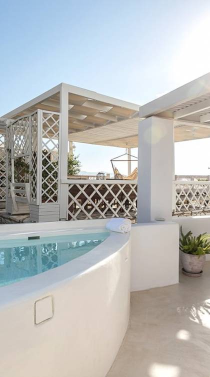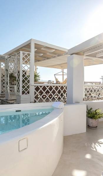 Muse Thalia, cuyo nombre deriva de la palabra griega para prolífica, era la protectora de la alegría y la alegría; el que descubrió la comedia, la geometría, la arquitectura y la agricultura. Además, fue una campeona de simposios y se la representó sin vacilaciones sosteniendo una máscara teatral. En la Thalia- Grand Deluxe Suite homónima de 45 m2, sofisticada y elegante, de planta abierta con jacuzzi al aire libre en Naxos, el diseño y la simetría, amalgamados con un elemento de pura alegría, roban el espectáculo; mientras que la imagen de una vida fácil se complementa con una bañera de hidromasaje al aire libre de última generación. Thalia- Grand Deluxe Suite con jacuzzi exterior con capacidad para 4 personas.