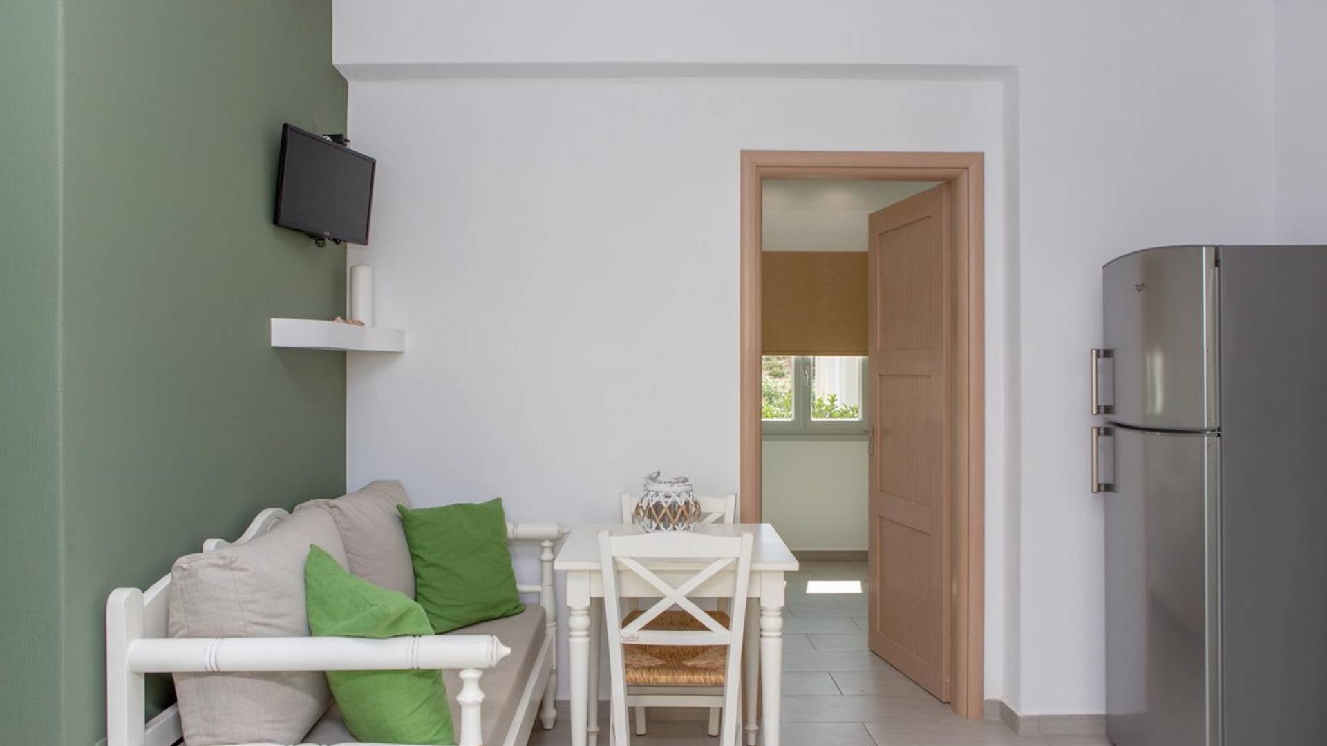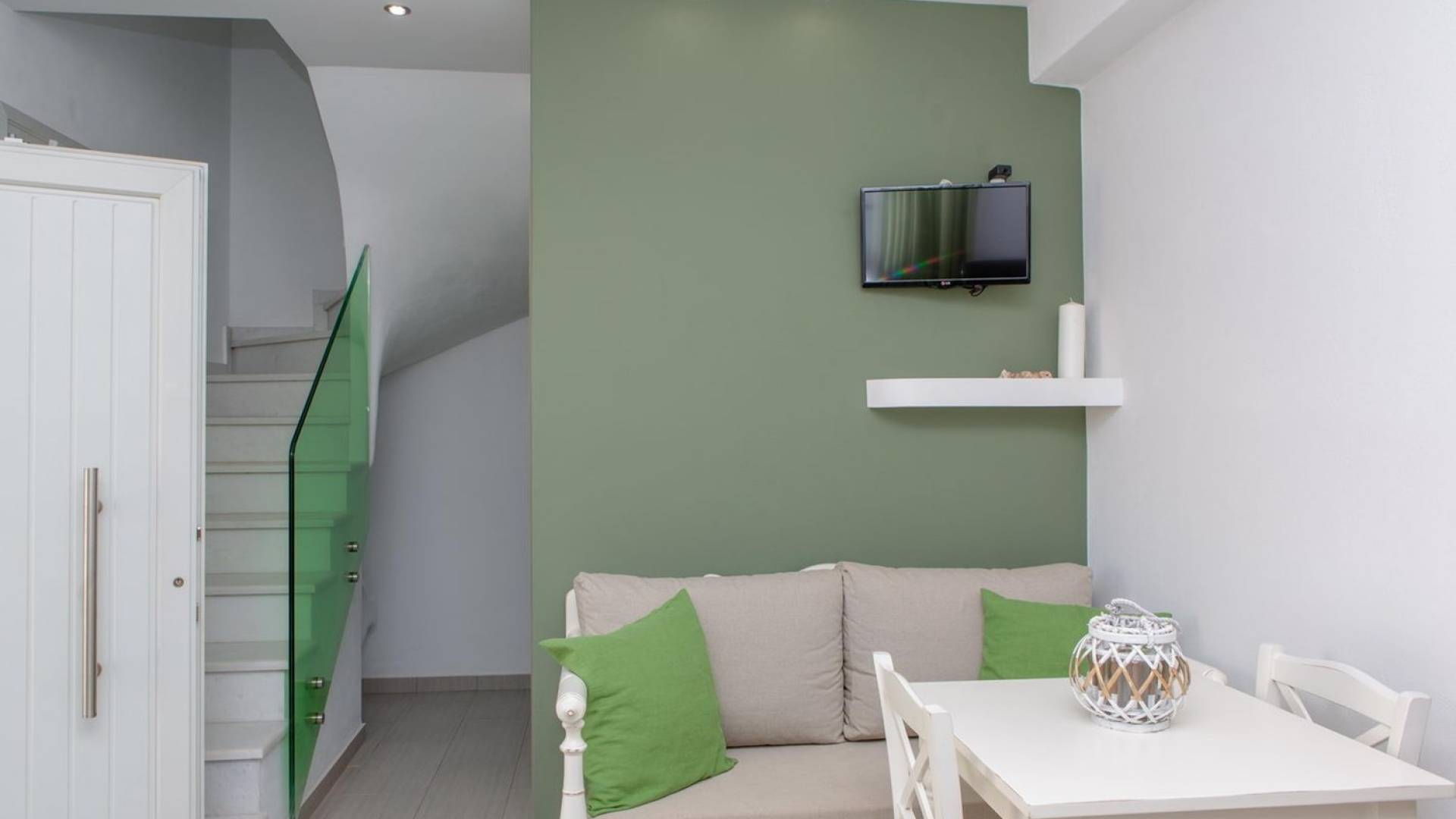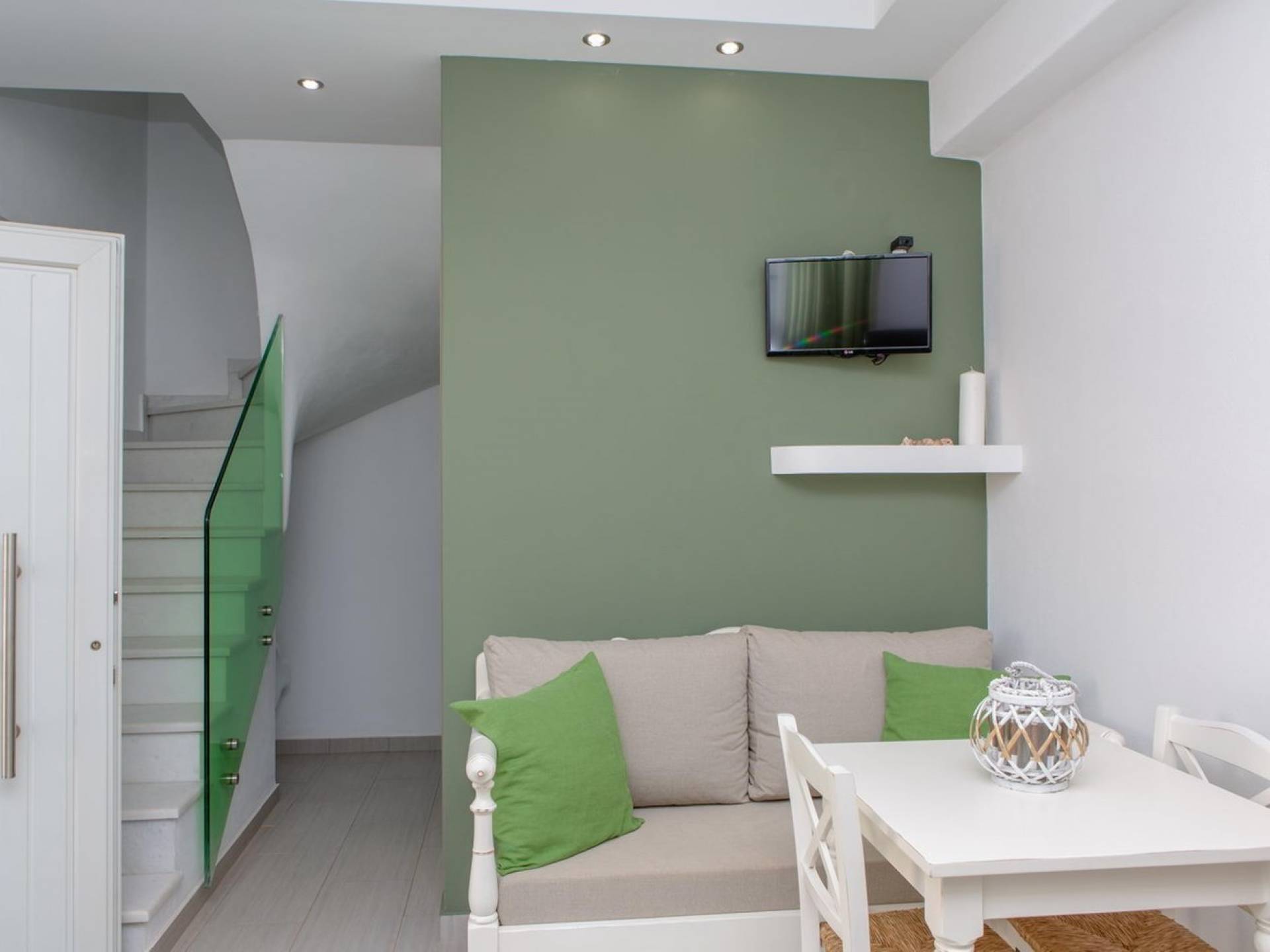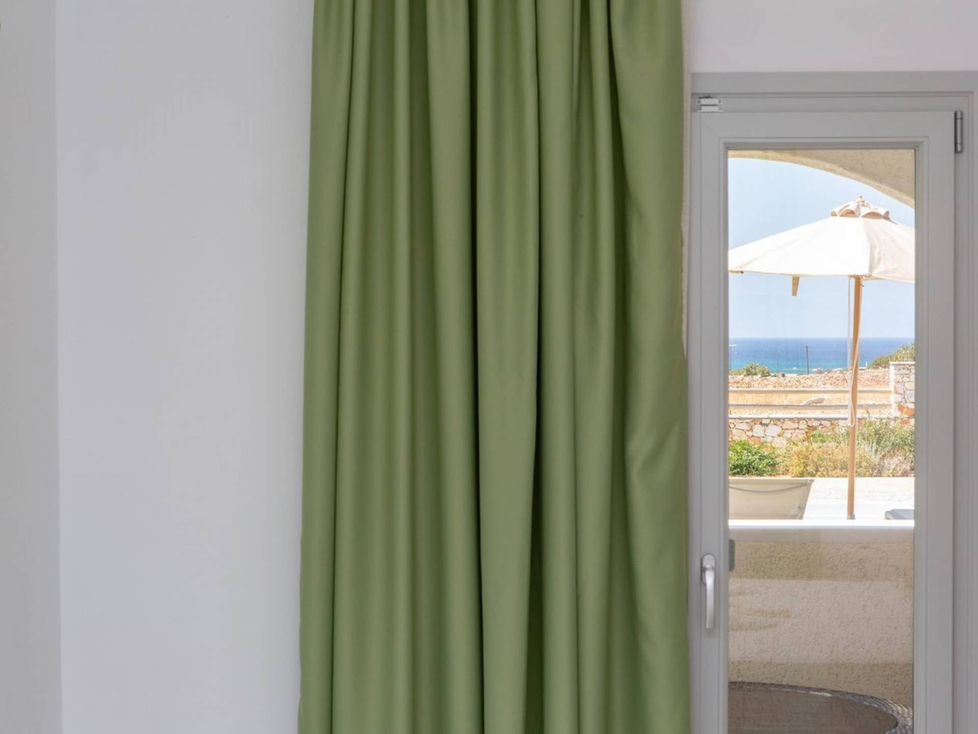Si hubiera una luna verde en el paisaje lunar, muy bien podría reflejar elementos del fértil paisaje de Naxos: los olivos, cedros y cipreses, las hierbas aromáticas autóctonas de la isla, como la salvia , romero, tomillo, orégano y otros, muchos de los cuales adornan los terrenos de Villas Sol y Luna. El verde es el acento elegido para la cuarta villa más grande, Green Moon Villa, diseñada para acomodar hasta 4 personas. También una unidad de dos pisos, con una escalera interior, cuenta con 2 dormitorios, 2 baños, una piscina privada, balcones, terraza, patio y área de descanso al aire libre.