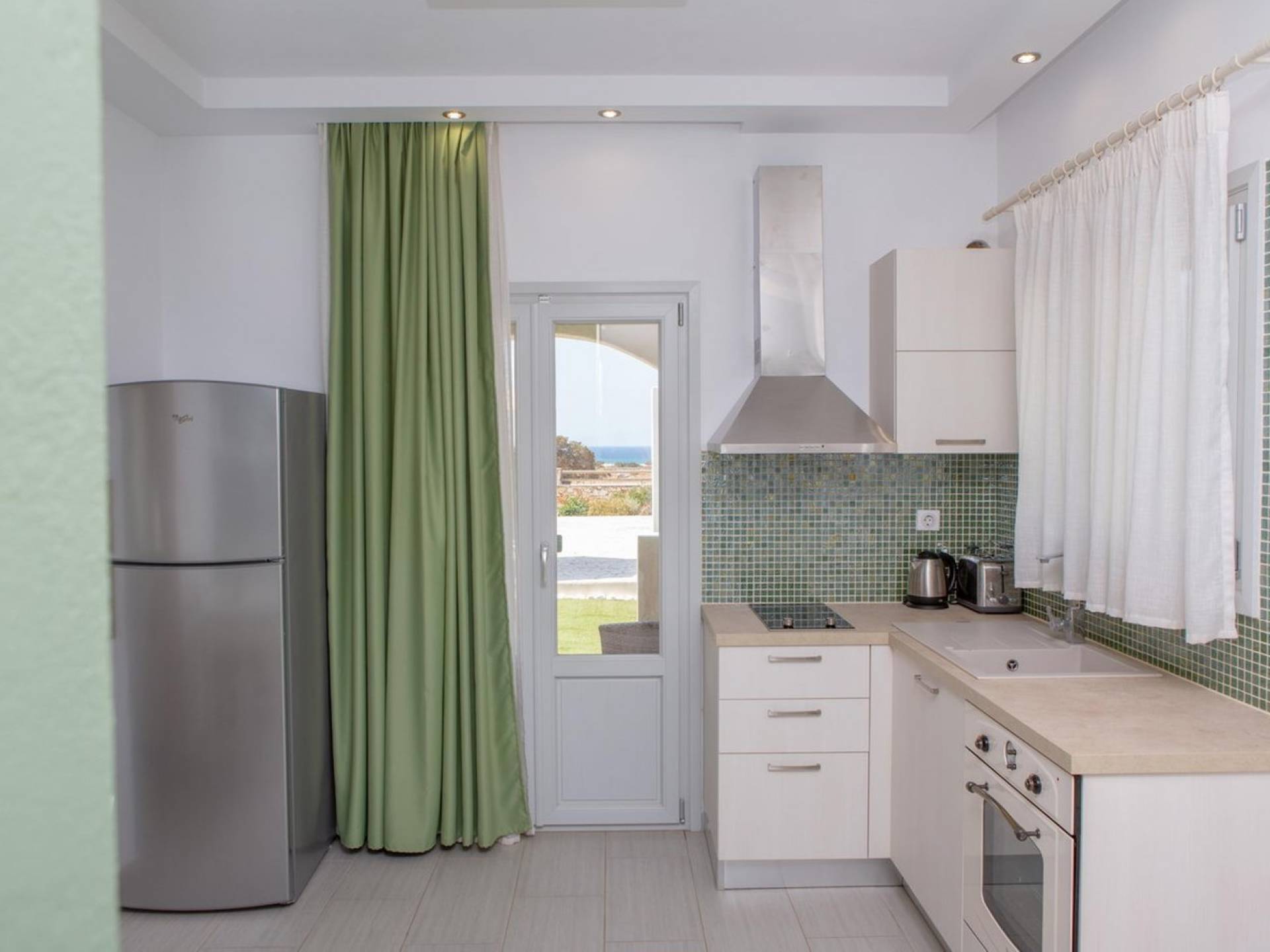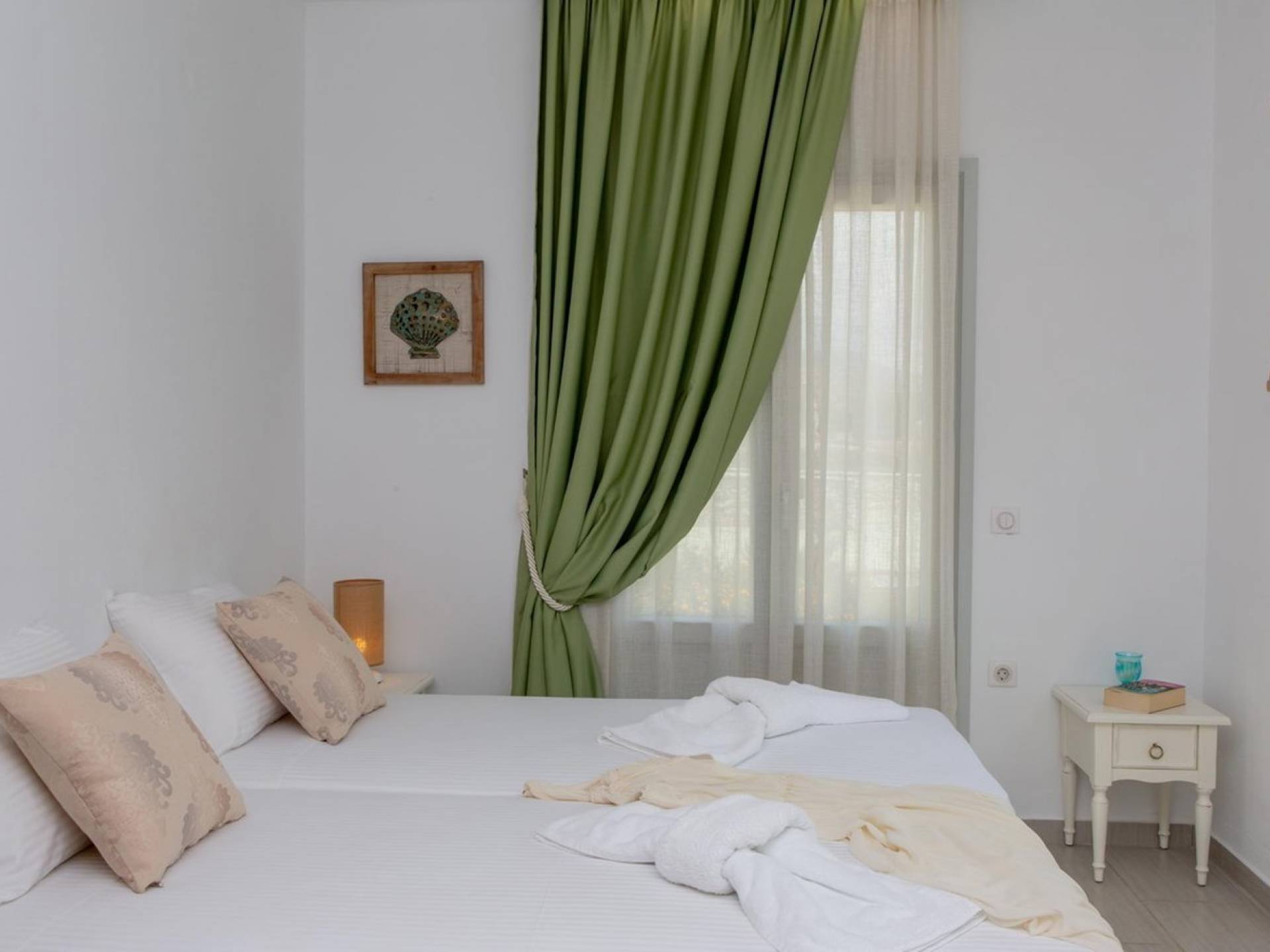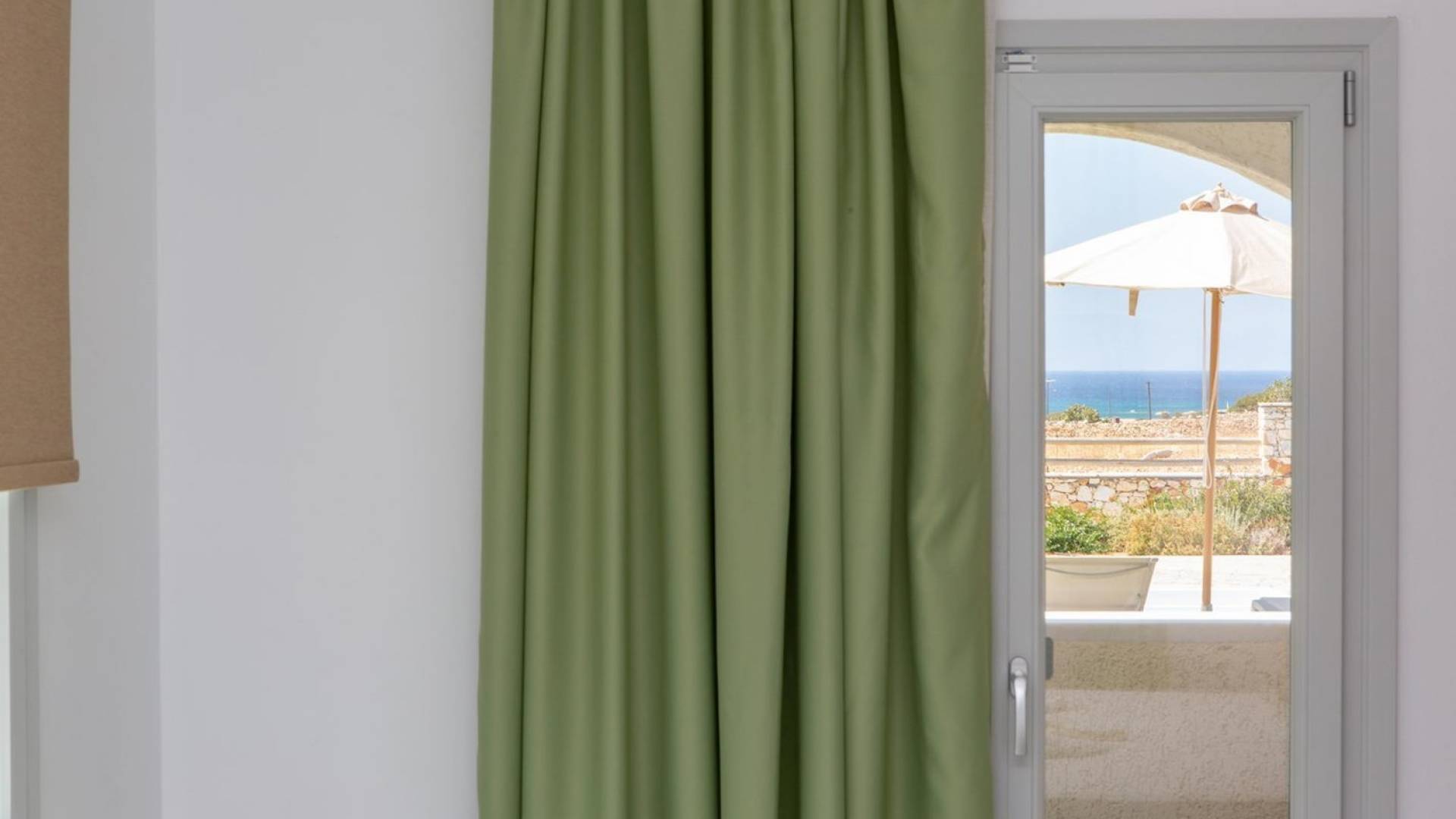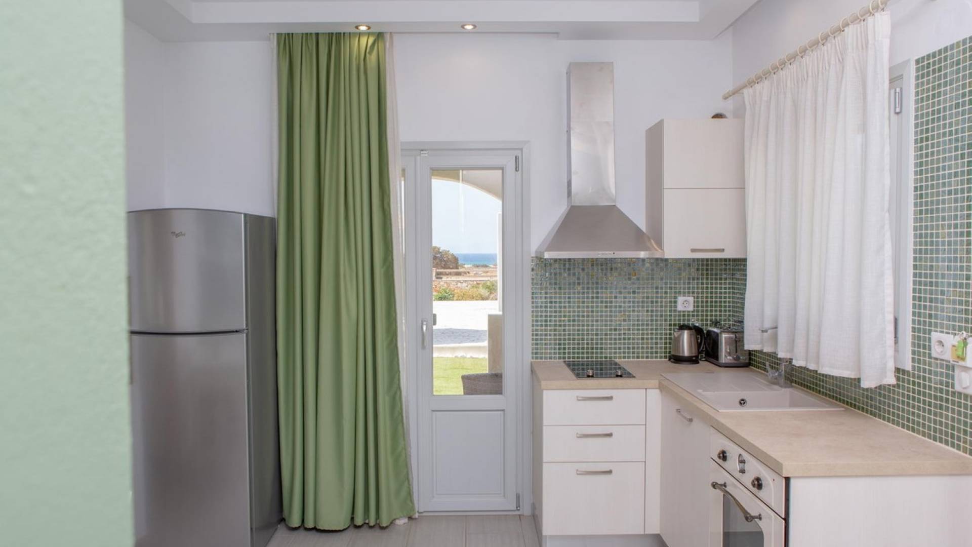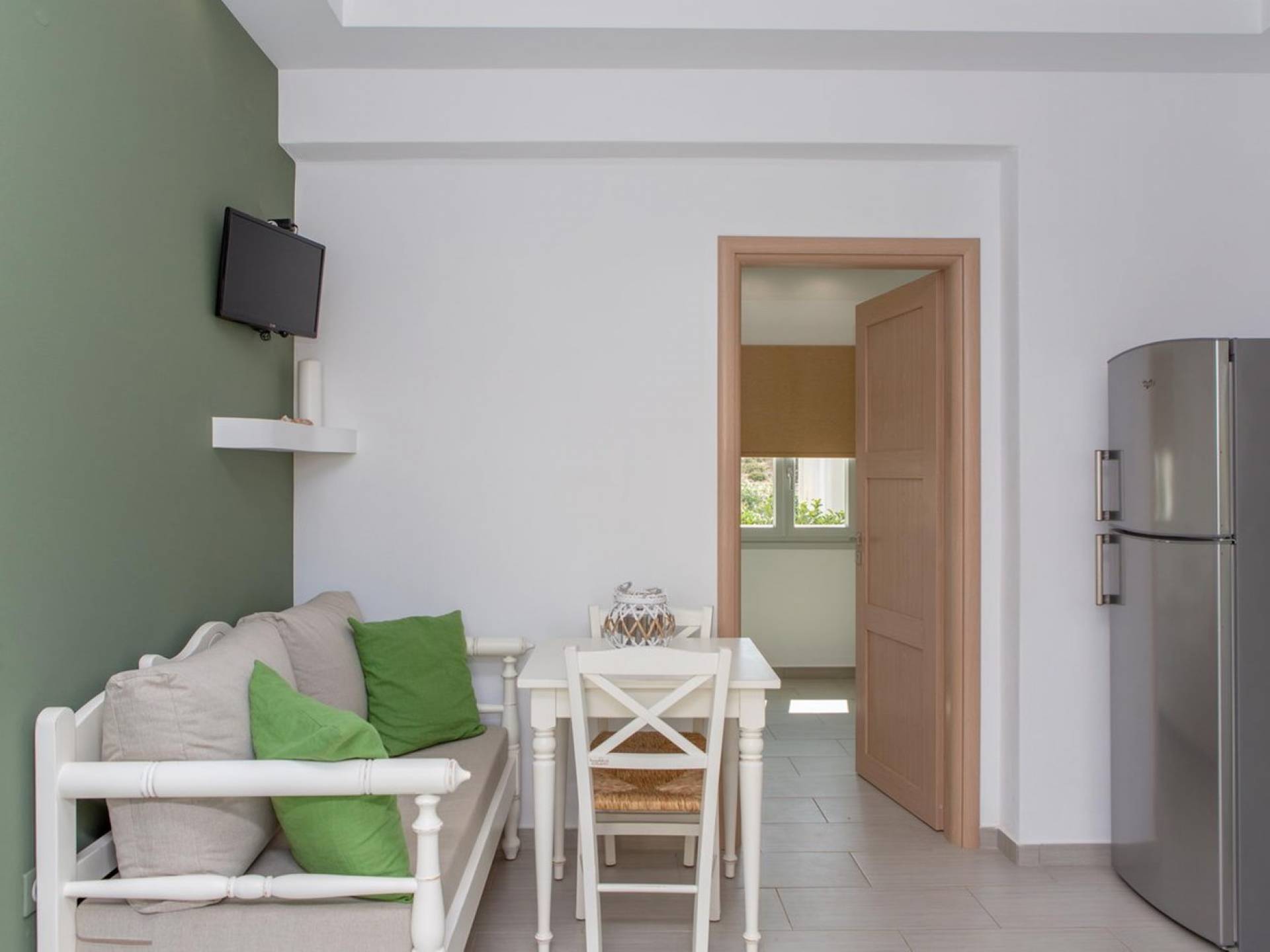 Si hubiera una luna verde en el paisaje lunar, muy bien podría reflejar elementos del fértil paisaje de Naxos: los olivos, cedros y cipreses, las hierbas aromáticas autóctonas de la isla, como la salvia , romero, tomillo, orégano y otros, muchos de los cuales adornan los terrenos de Villas Sol y Luna. El verde es el acento elegido para la cuarta villa más grande, Green Moon Villa, diseñada para acomodar hasta 4 personas. También una unidad de dos pisos, con una escalera interior, cuenta con 2 dormitorios, 2 baños, una piscina privada, balcones, terraza, patio y área de descanso al aire libre.