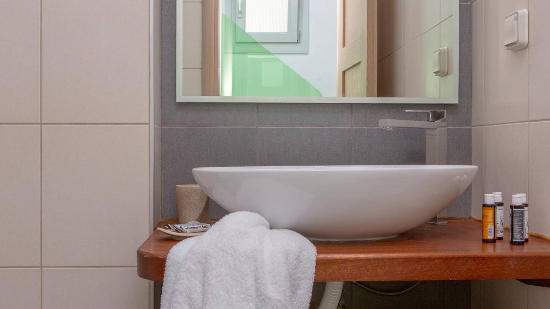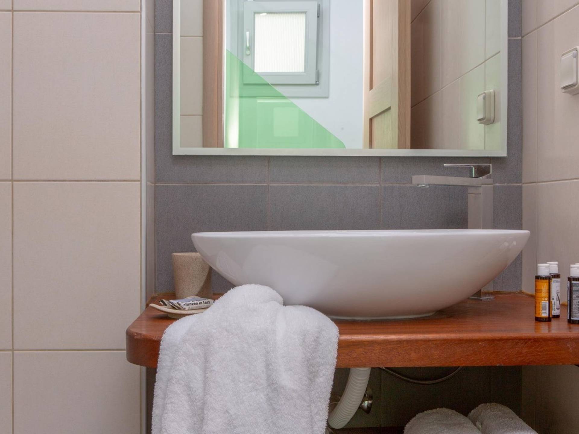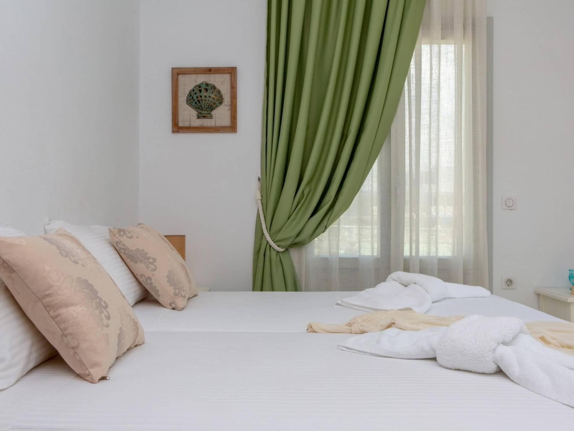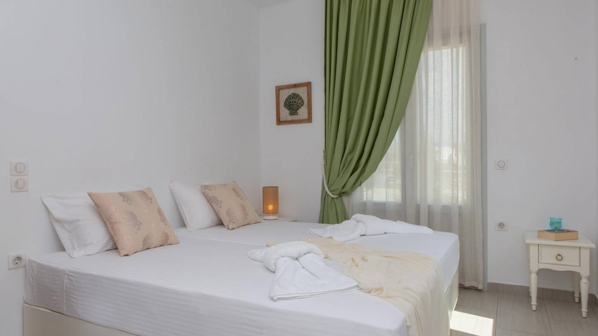 Si hubiera una luna verde en el paisaje lunar, muy bien podría reflejar elementos del fértil paisaje de Naxos: los olivos, cedros y cipreses, las hierbas aromáticas autóctonas de la isla, como la salvia , romero, tomillo, orégano y otros, muchos de los cuales adornan los terrenos de Villas Sol y Luna. El verde es el acento elegido para la cuarta villa más grande, Green Moon Villa, diseñada para acomodar hasta 4 personas. También una unidad de dos pisos, con una escalera interior, cuenta con 2 dormitorios, 2 baños, una piscina privada, balcones, terraza, patio y área de descanso al aire libre.