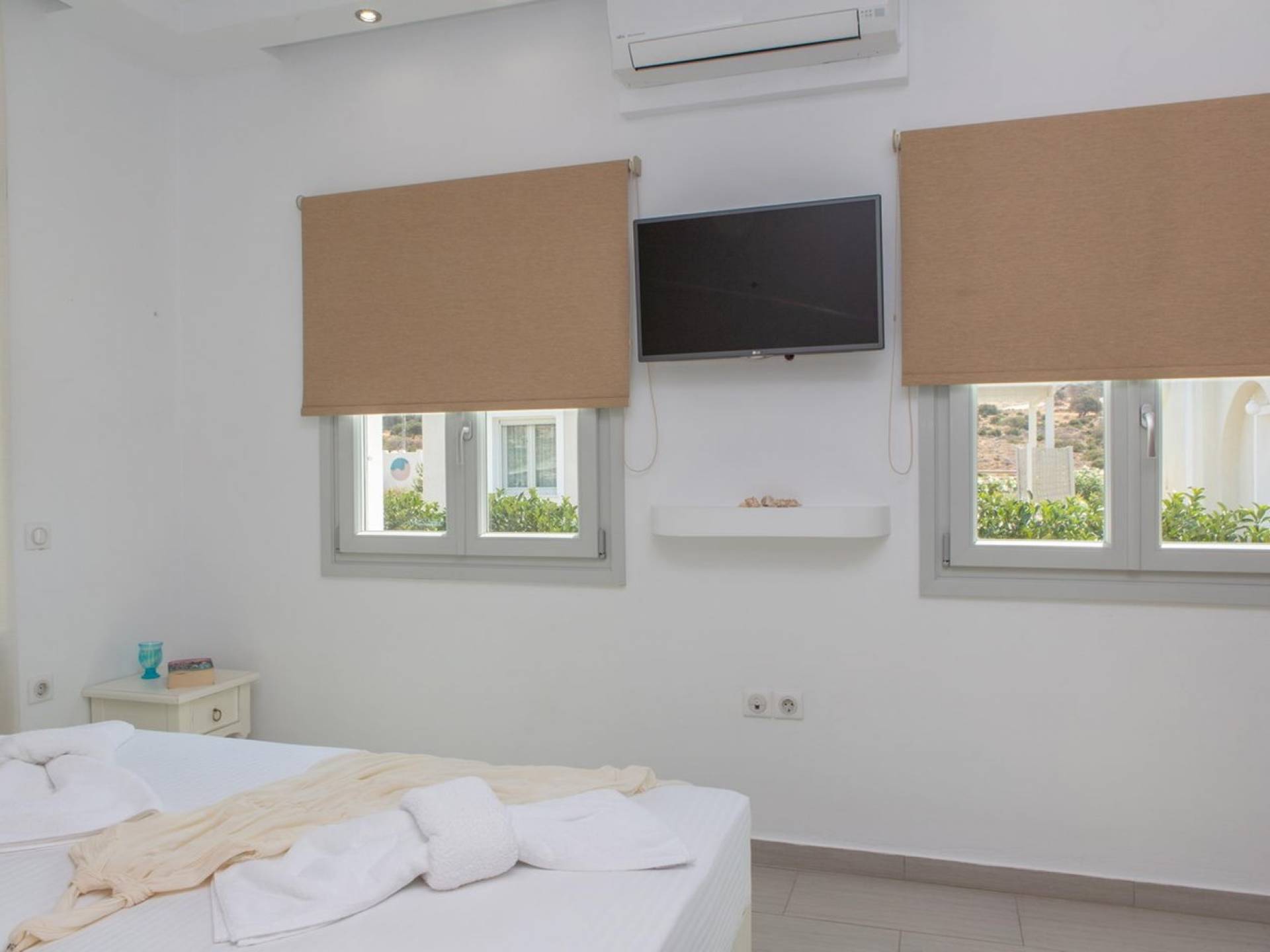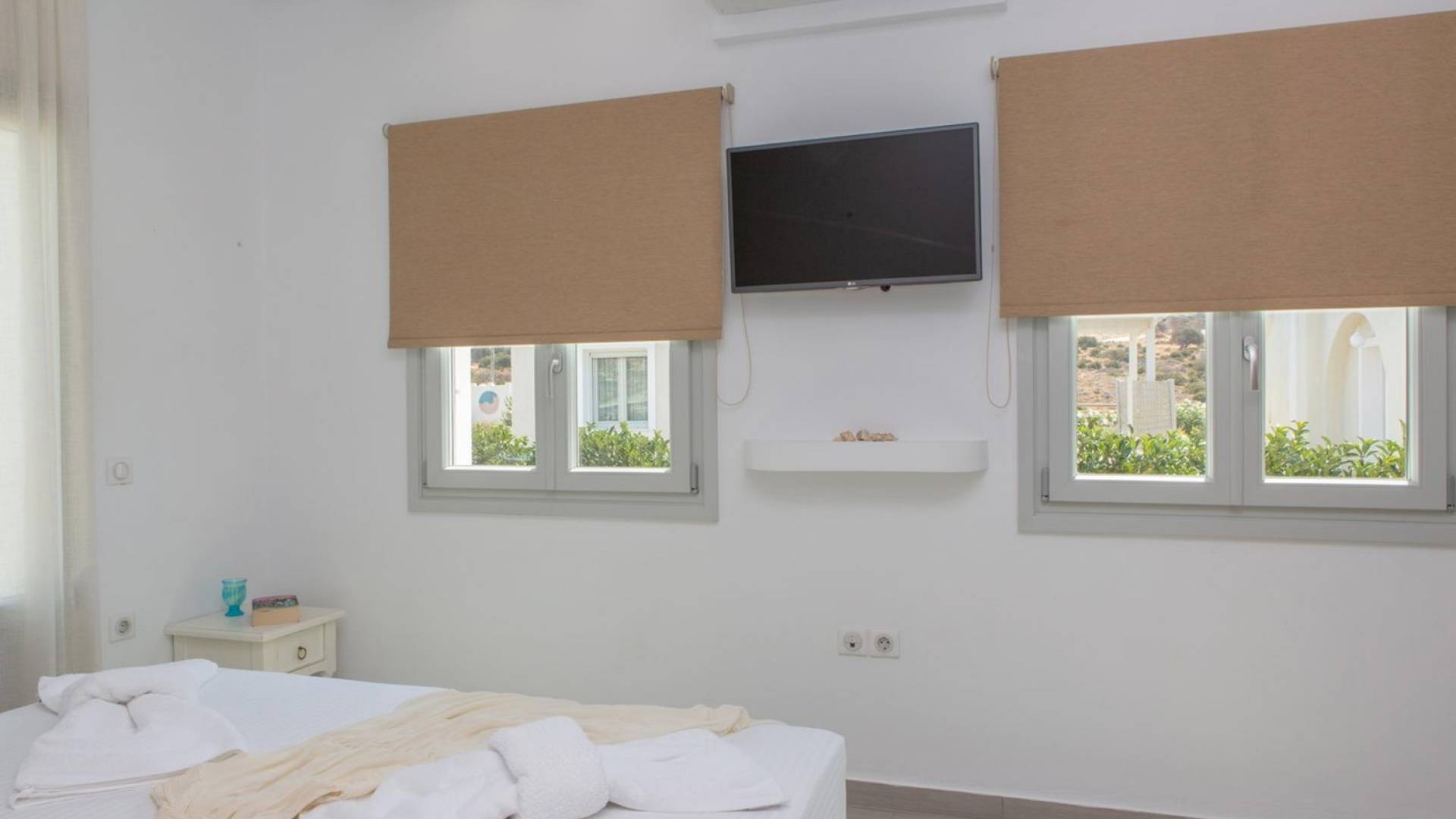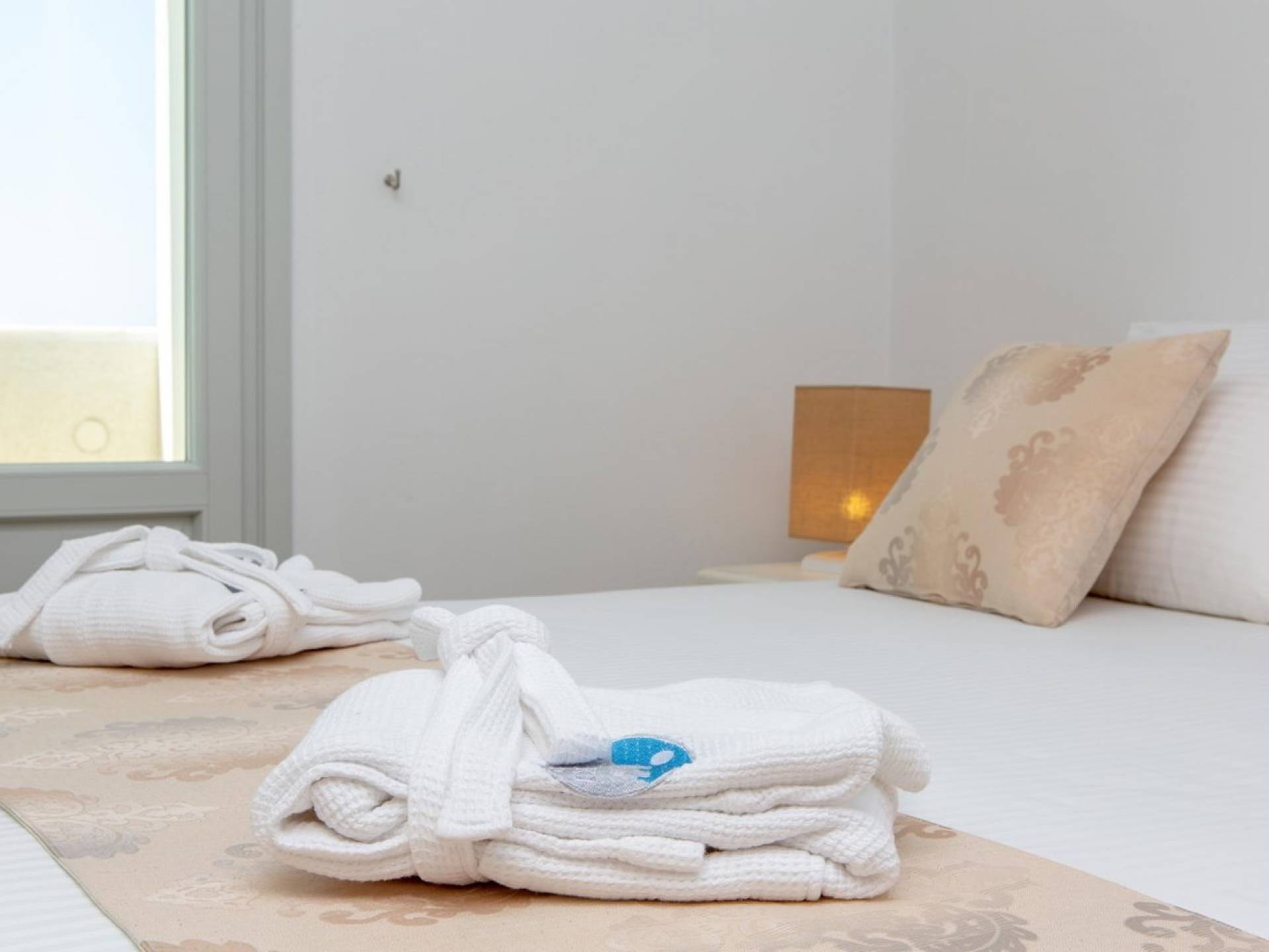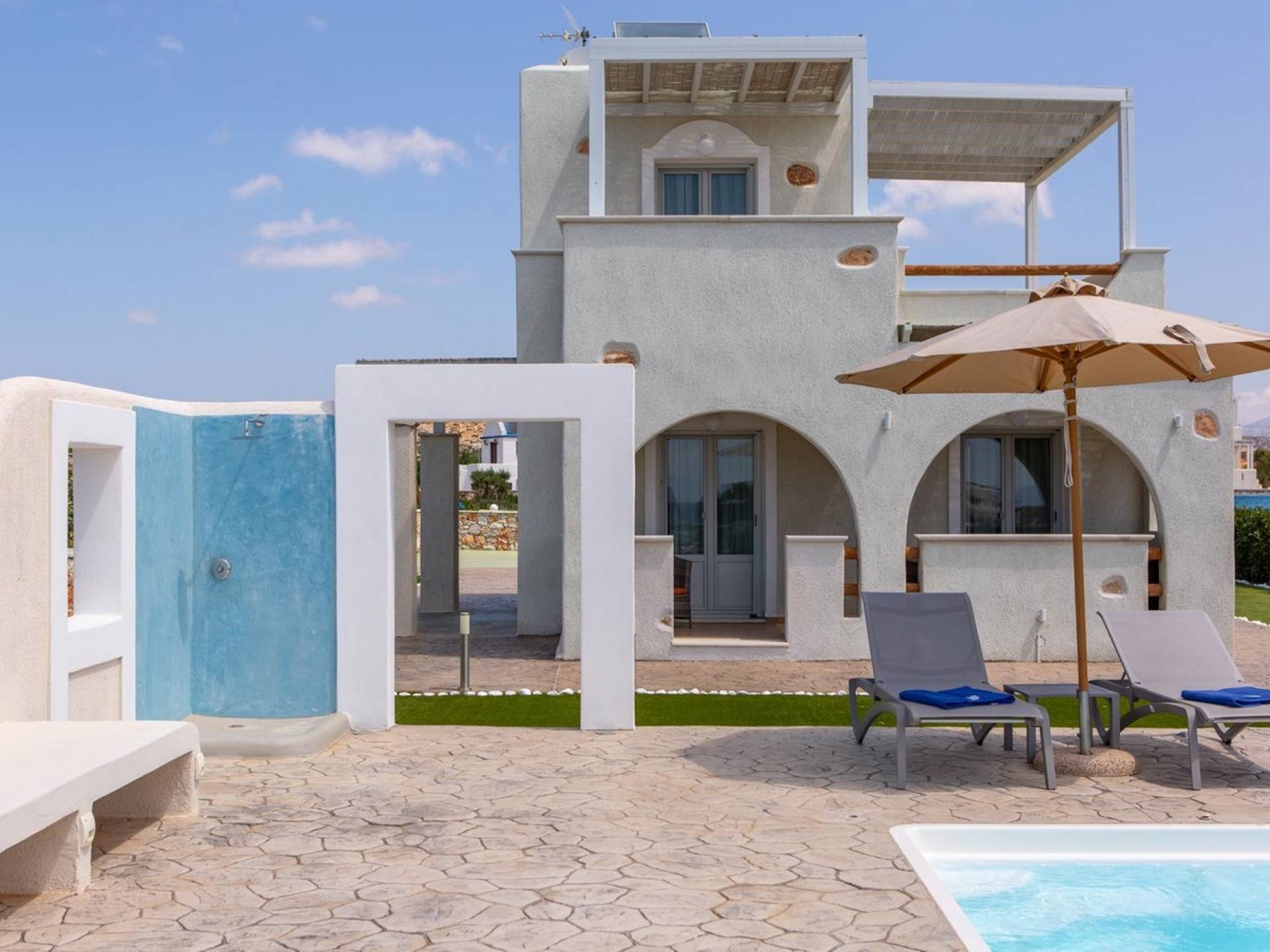 La planta baja se abre a una cocina completa y un acogedor comedor y sala de estar con un sofá. El dormitorio es doble con dos camas individuales. El baño de esta planta incluye lavadora. La escalera interior, hecha de fino mármol blanco de Naxos, conduce al dormitorio principal de arriba (con cama tamaño queen), baño y balcón a la sombra y terraza con vistas panorámicas.