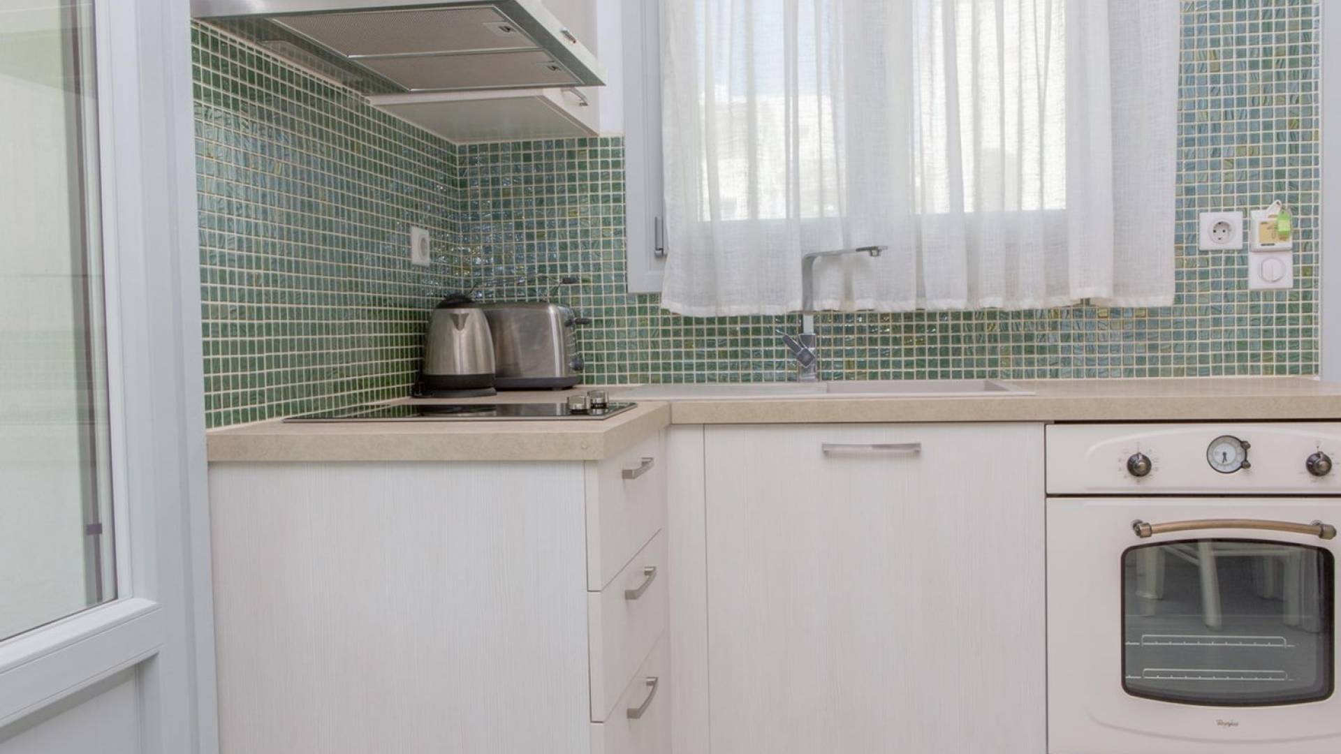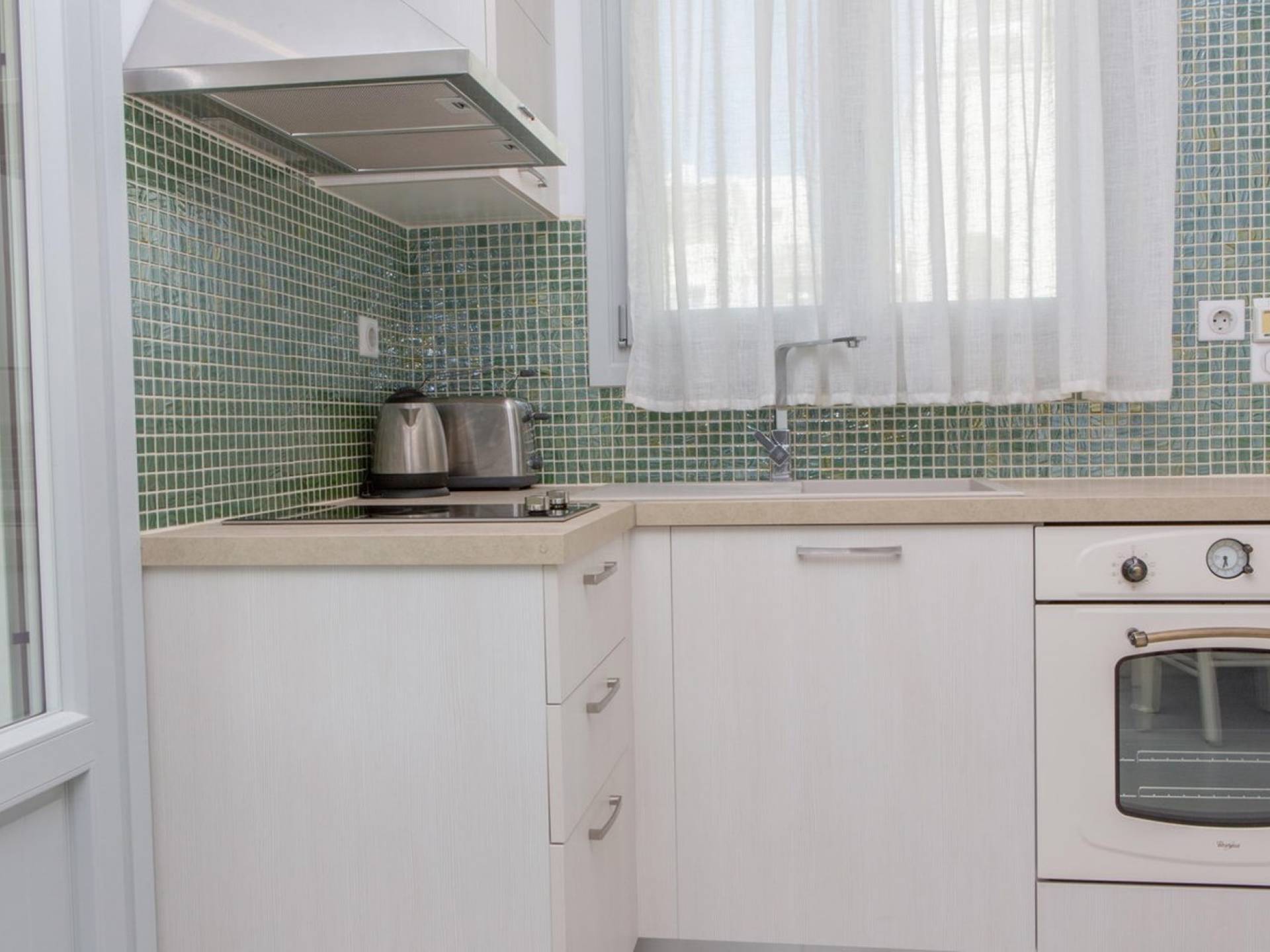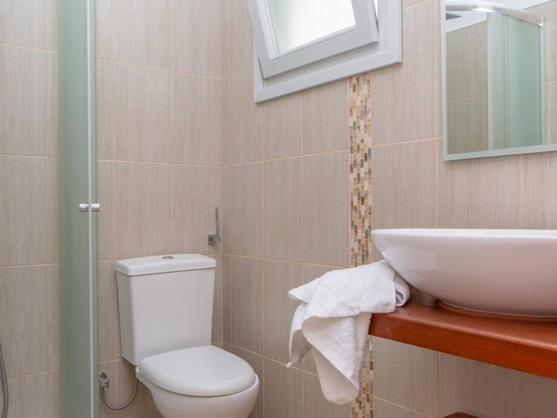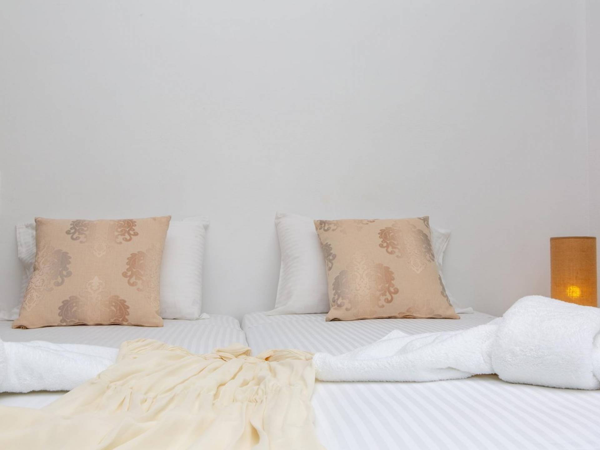 La planta baja se abre a una cocina completa y un acogedor comedor y sala de estar con un sofá. El dormitorio es doble con dos camas individuales. El baño de esta planta incluye lavadora. La escalera interior, hecha de fino mármol blanco de Naxos, conduce al dormitorio principal de arriba (con cama tamaño queen), baño y balcón a la sombra y terraza con vistas panorámicas.