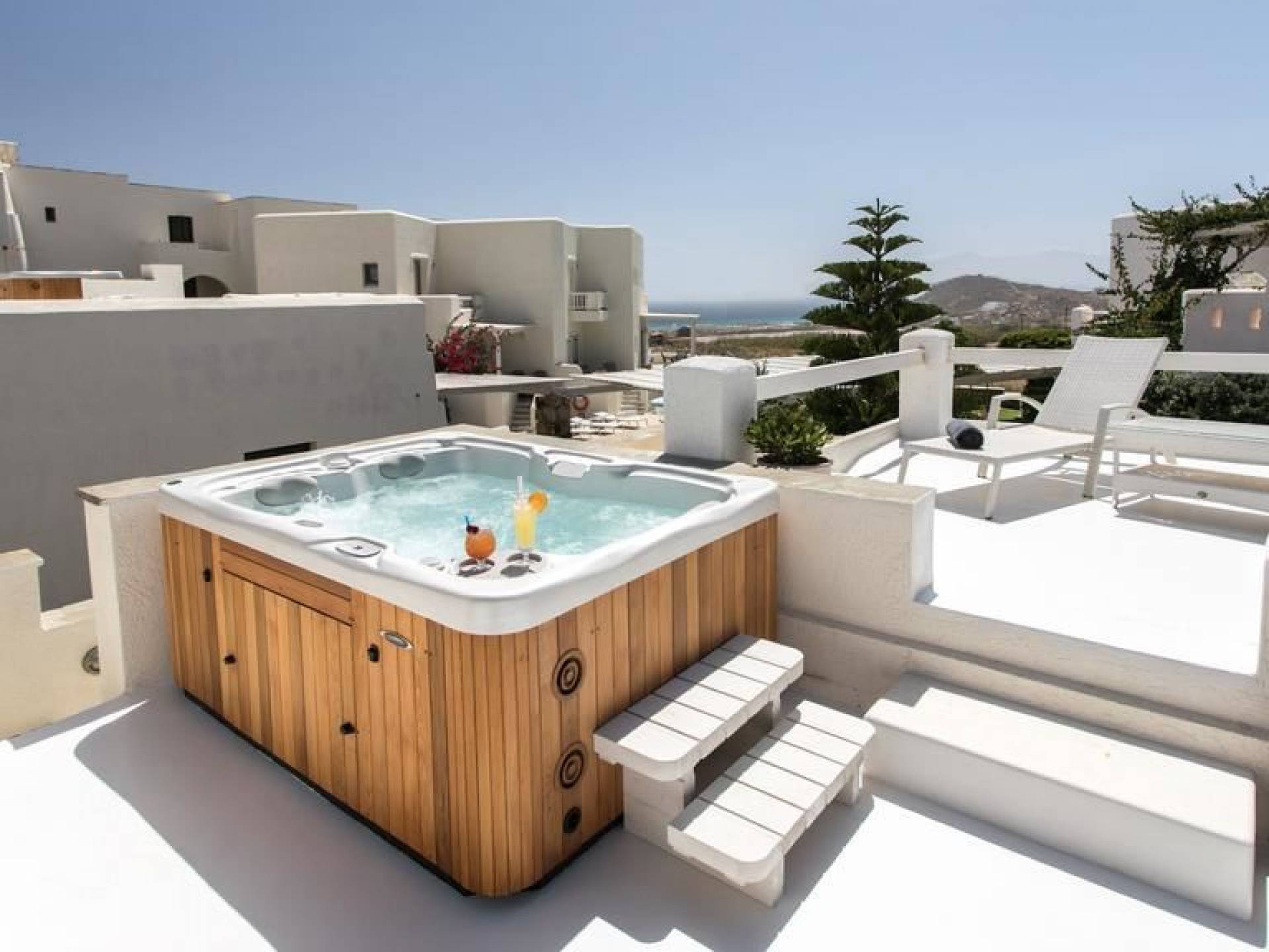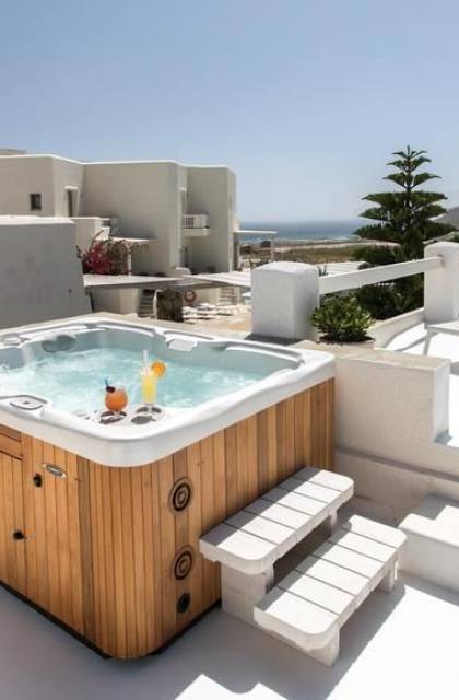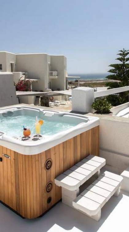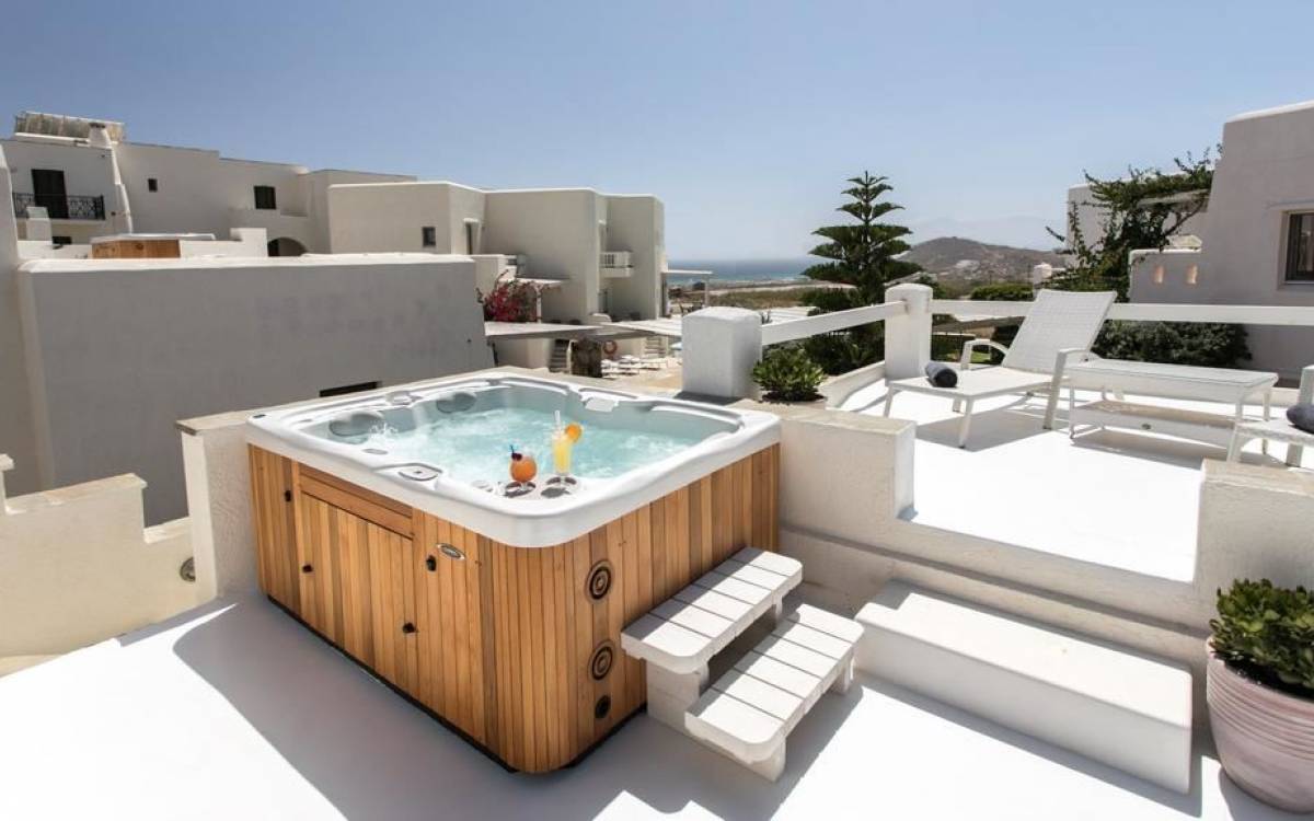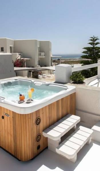 Cada una de estas 2 villas ejecutivas con vista al mar en Naxos cuenta con una impresionante área de 160 metros cuadrados y es ideal para familias extensas o grupos grandes de amigos. Además de su gran cantidad de comodidades y amplio espacio, las villas ejecutivas cuentan cada una con una fabulosa terraza en la azotea de 30 metros cuadrados, completa con un jacuzzi al aire libre con capacidad para 5 personas, tumbonas y una vista increíble, que prometen momentos memorables bajo el chisporroteo. los rayos del sol o el cielo estrellado.