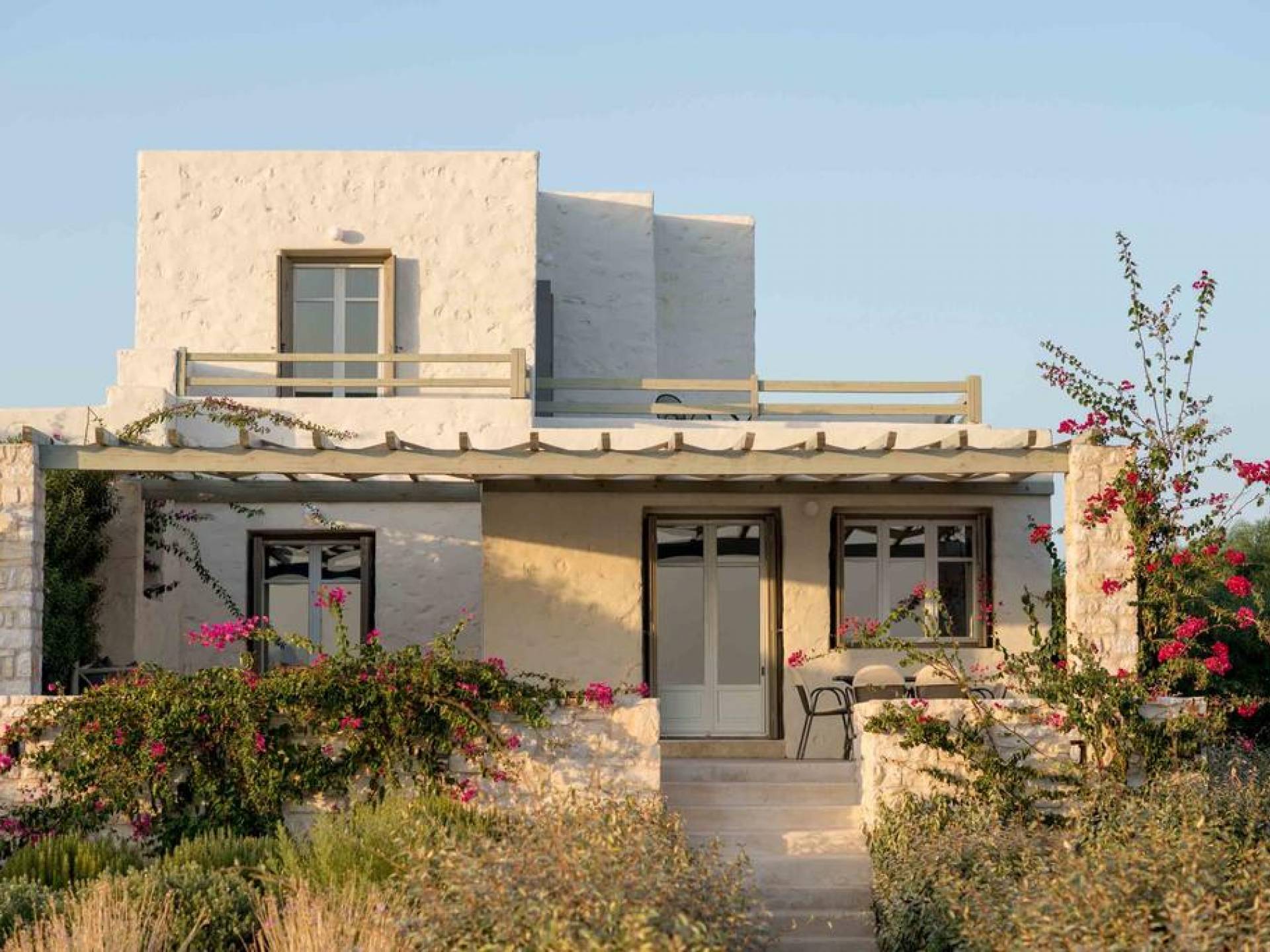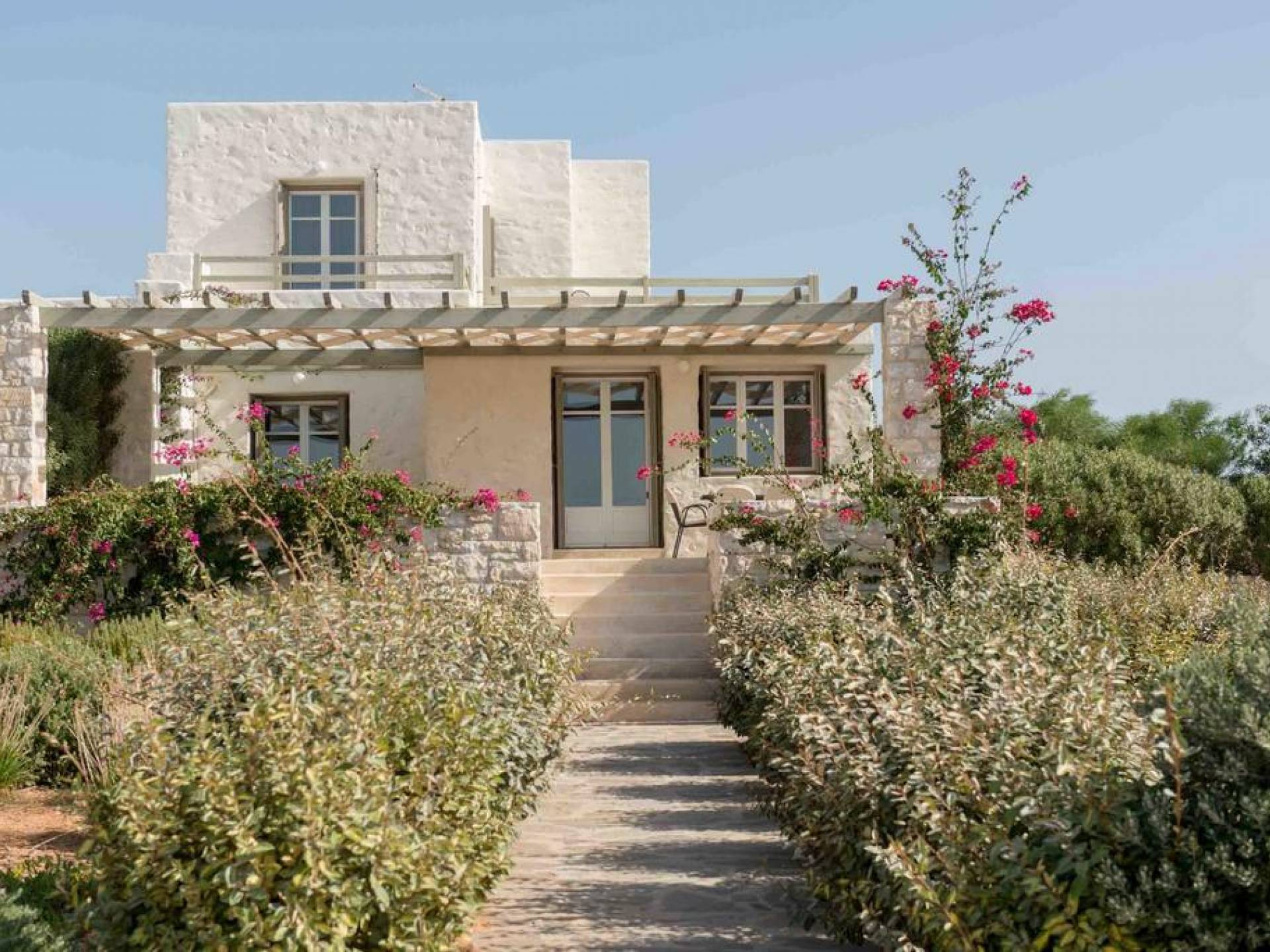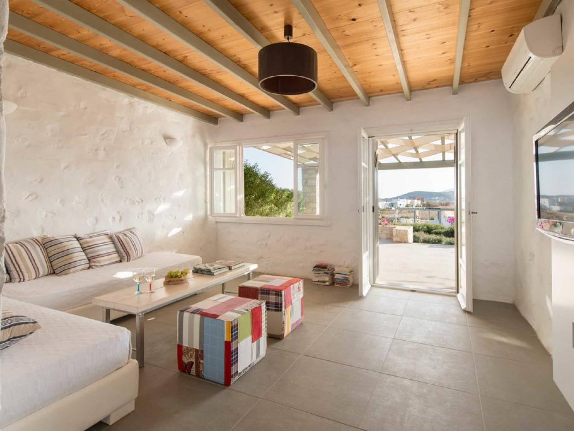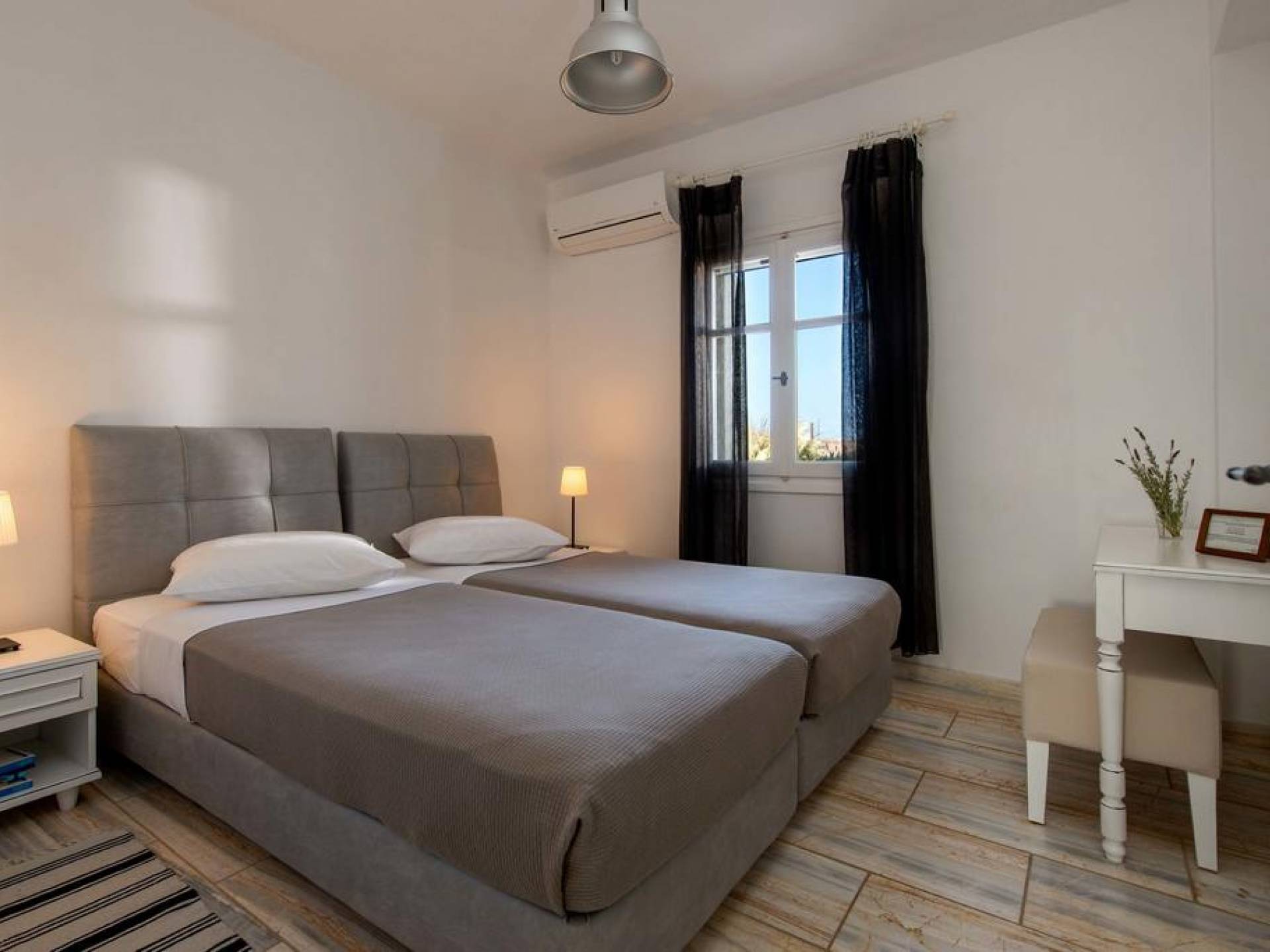 El gran dormitorio principal en el segundo piso tiene una cama tamaño king de silicona, un baño en suite de mármol blanco local completamente equipado y acceso a una terraza totalmente privada. La terraza pavimentada principal es el espacio de retiro especial de su familia, su hogar lejos del hogar en la isla de Paros. Todos los alquileres incluyen un sistema central de aire acondicionado y ventiladores.
