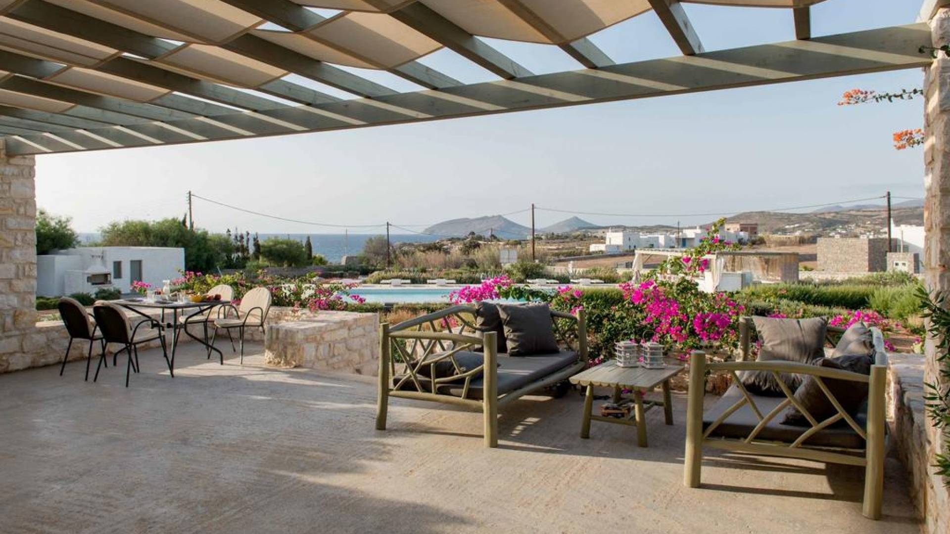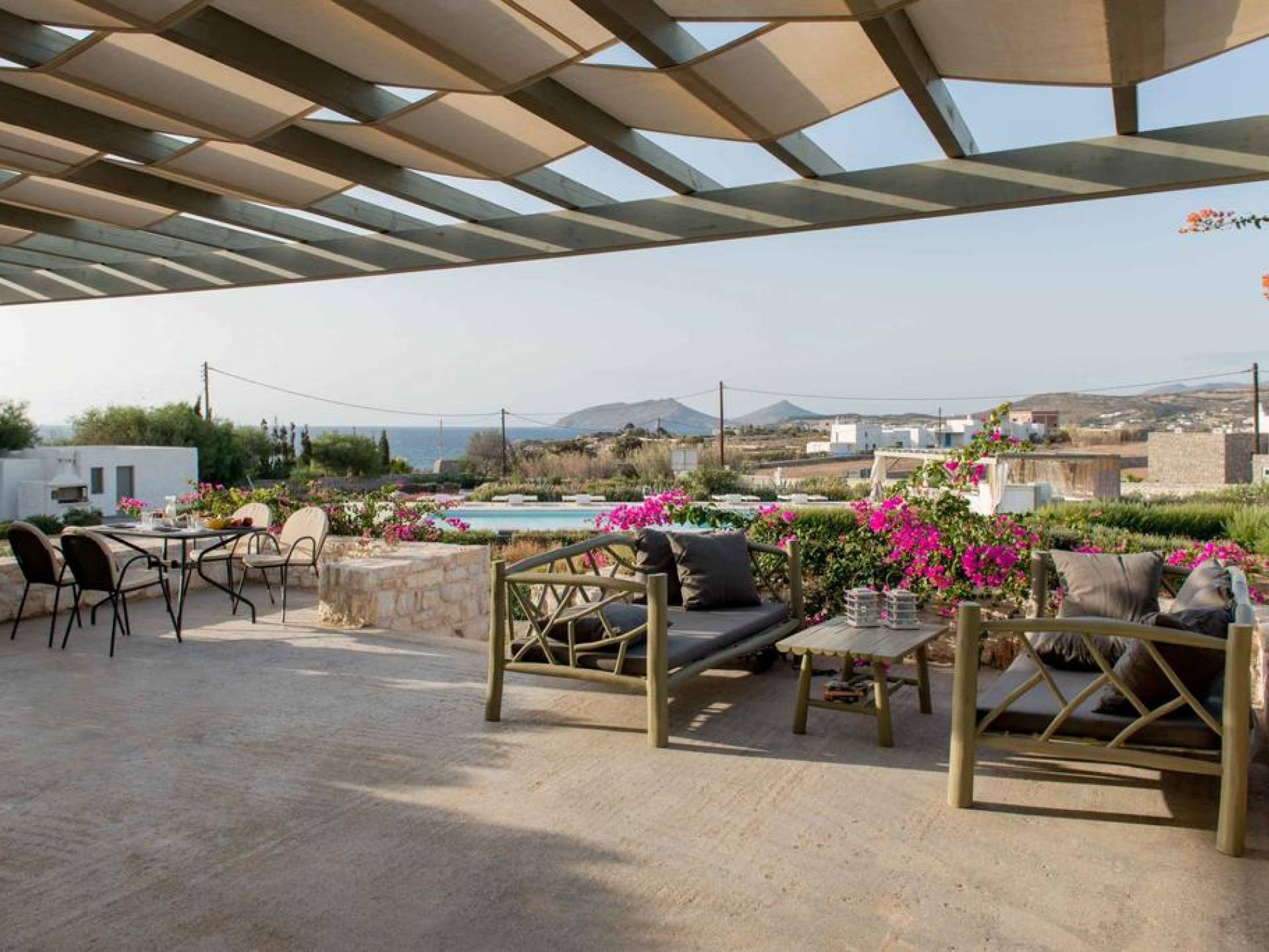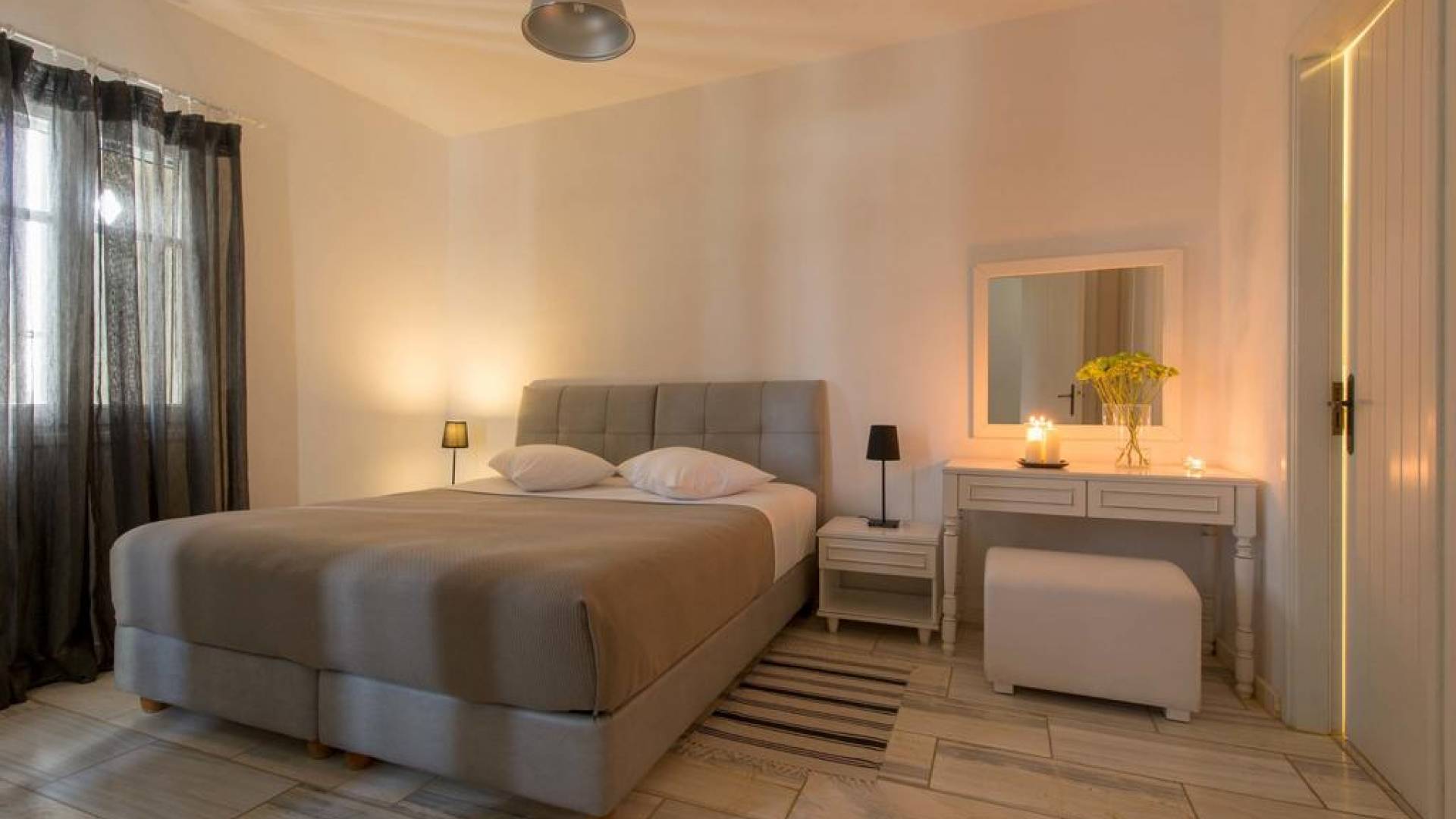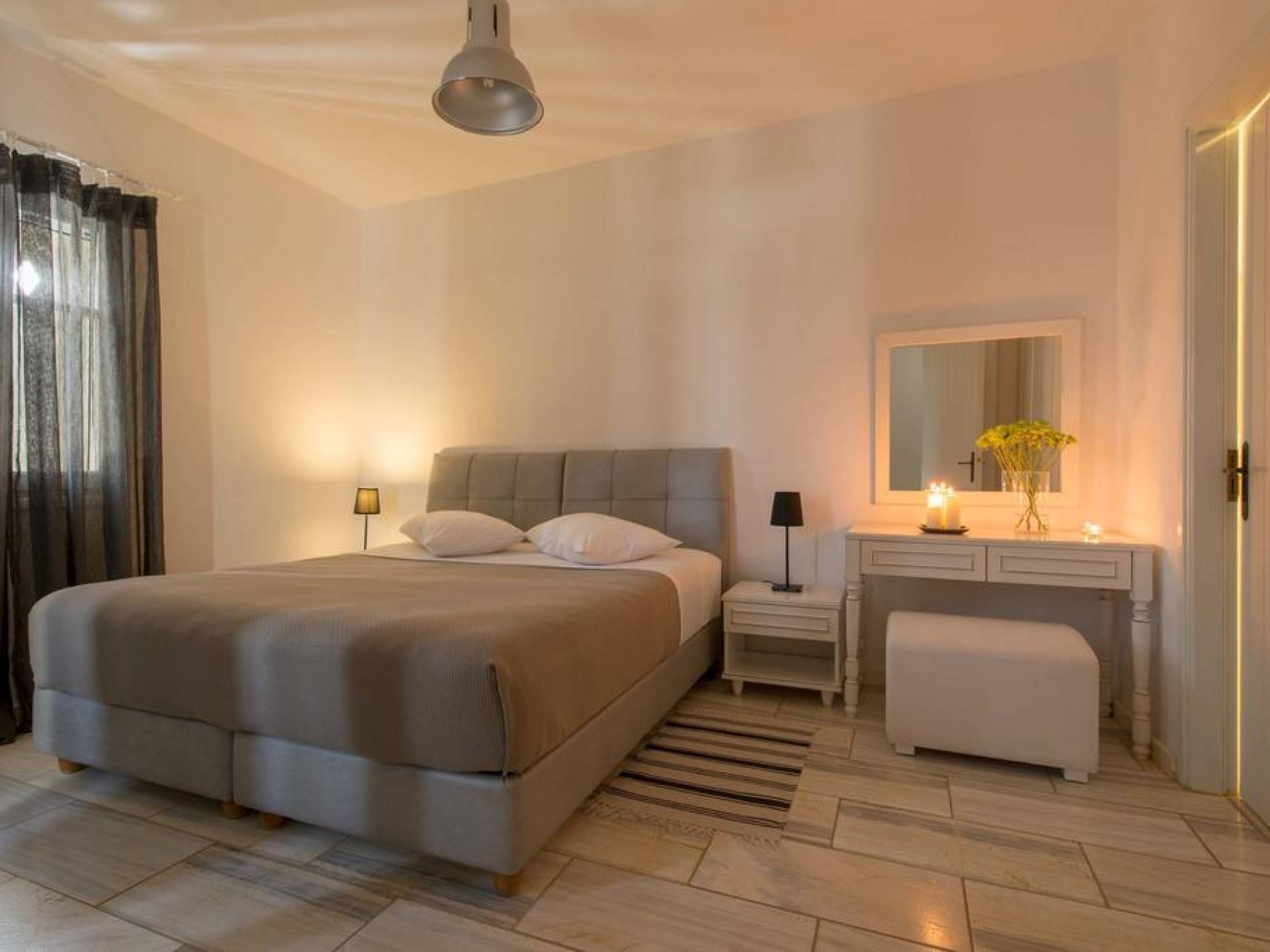 El gran dormitorio principal en el segundo piso tiene una cama tamaño king de silicona, un baño en suite de mármol blanco local completamente equipado y acceso a una terraza totalmente privada. La terraza pavimentada principal es el espacio de retiro especial de su familia, su hogar lejos del hogar en la isla de Paros. Todos los alquileres incluyen un sistema central de aire acondicionado y ventiladores.