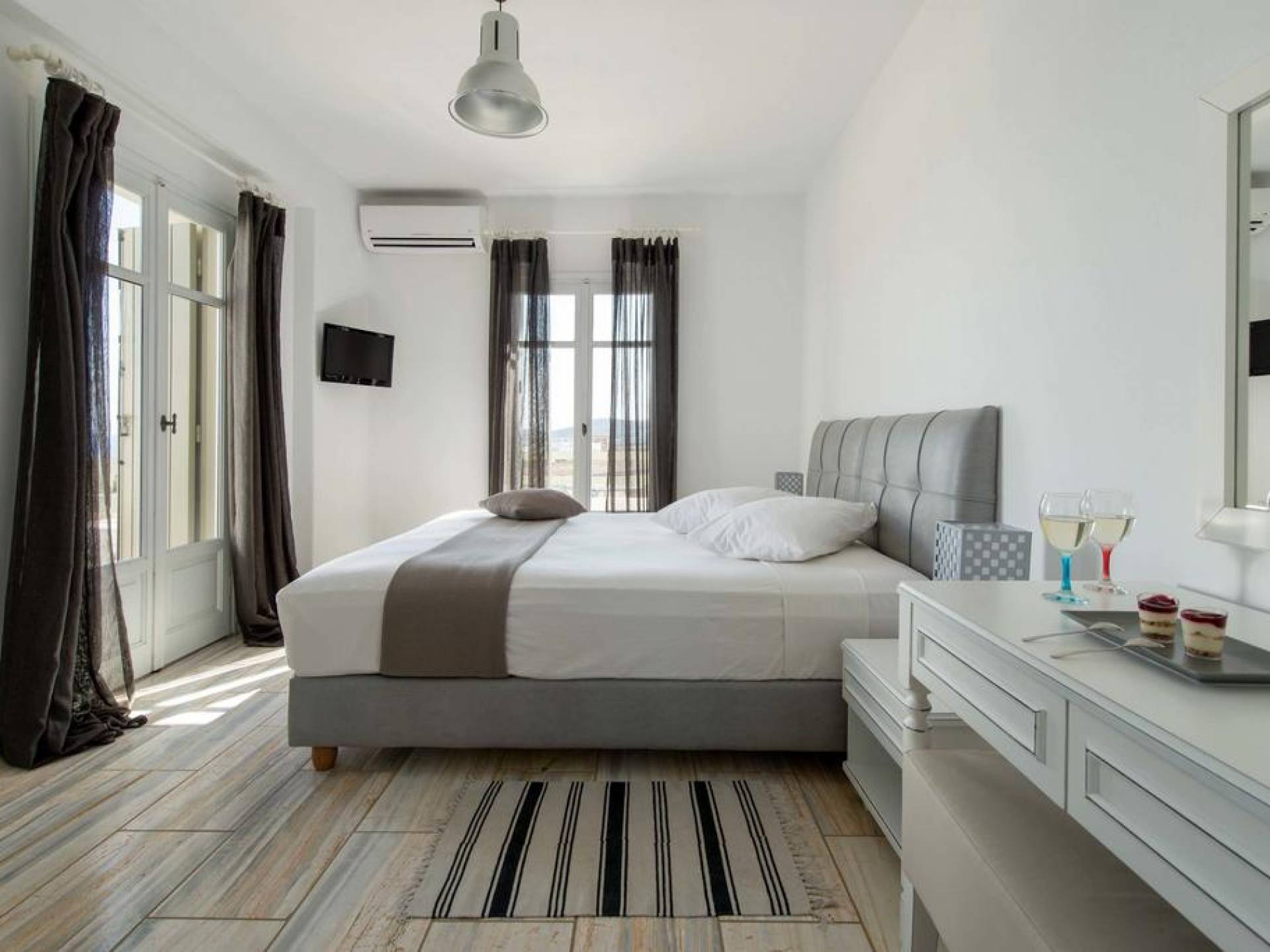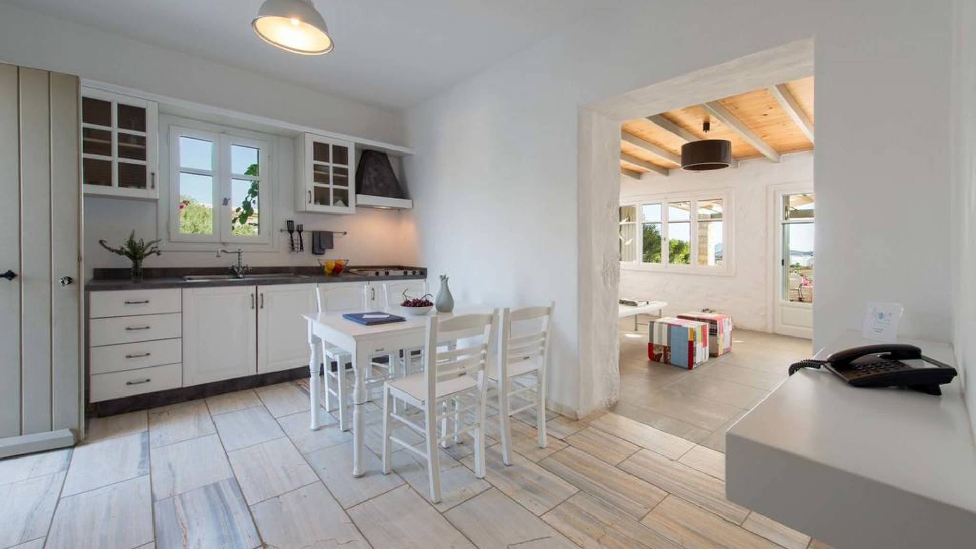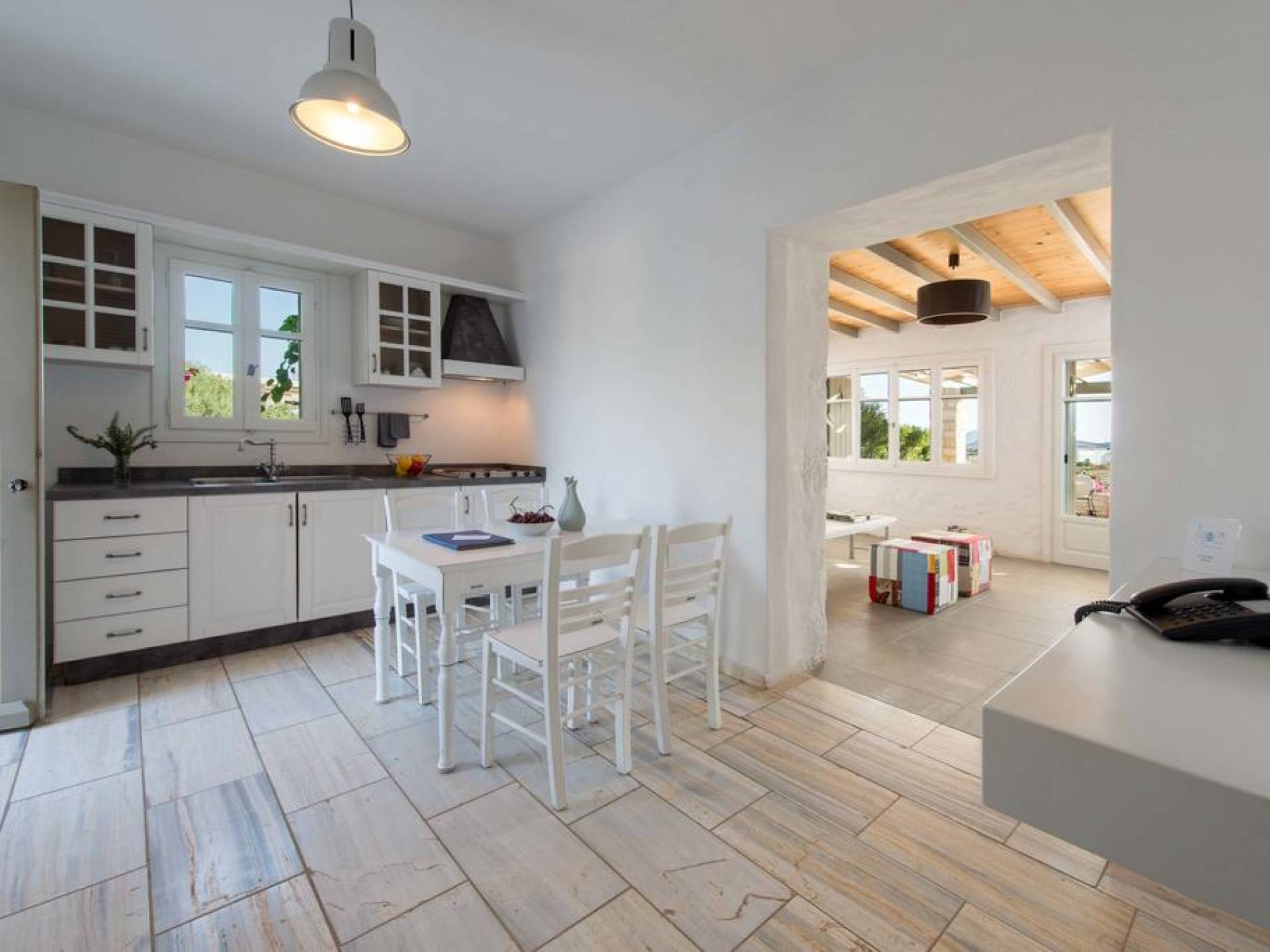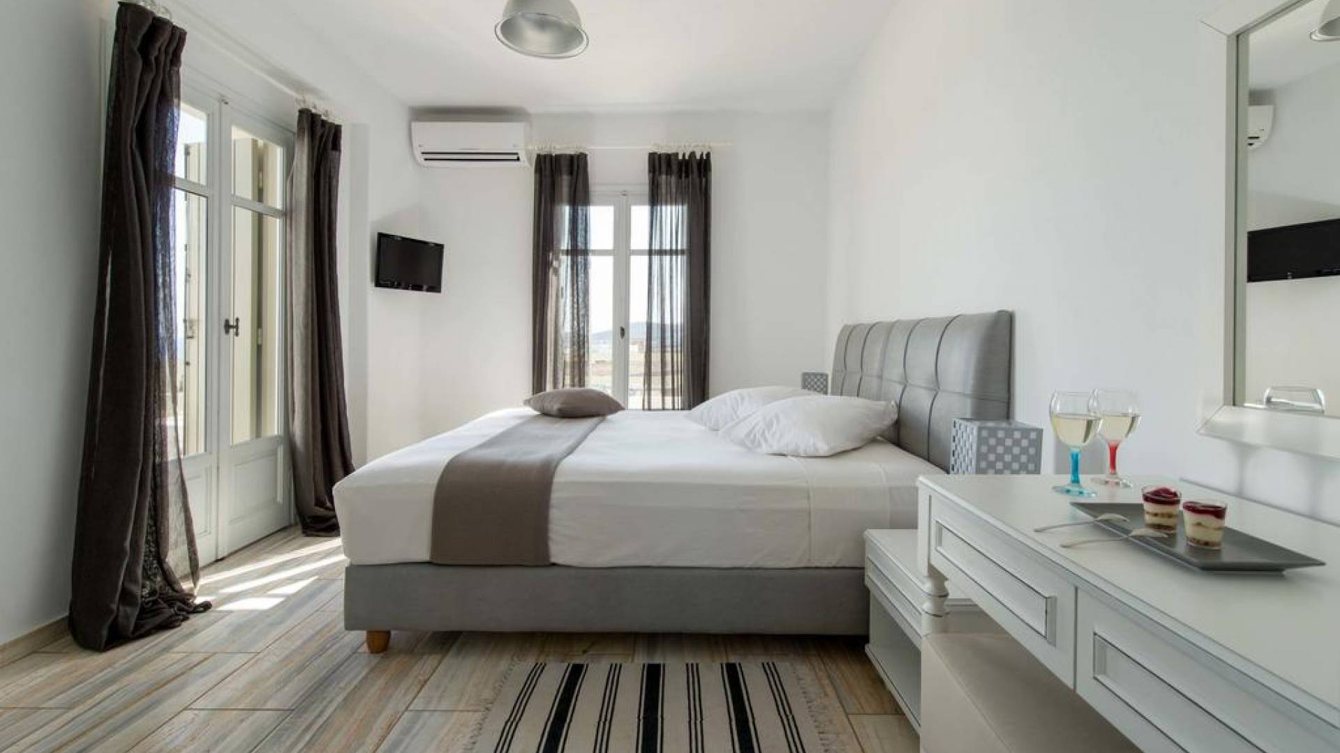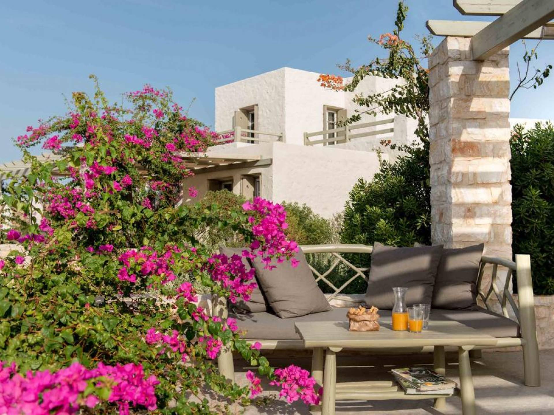 El gran dormitorio principal en el segundo piso tiene una cama tamaño king de silicona, un baño en suite de mármol blanco local completamente equipado y acceso a una terraza totalmente privada. La terraza pavimentada principal es el espacio de retiro especial de su familia, su hogar lejos del hogar en la isla de Paros. Todos los alquileres incluyen un sistema central de aire acondicionado y ventiladores.